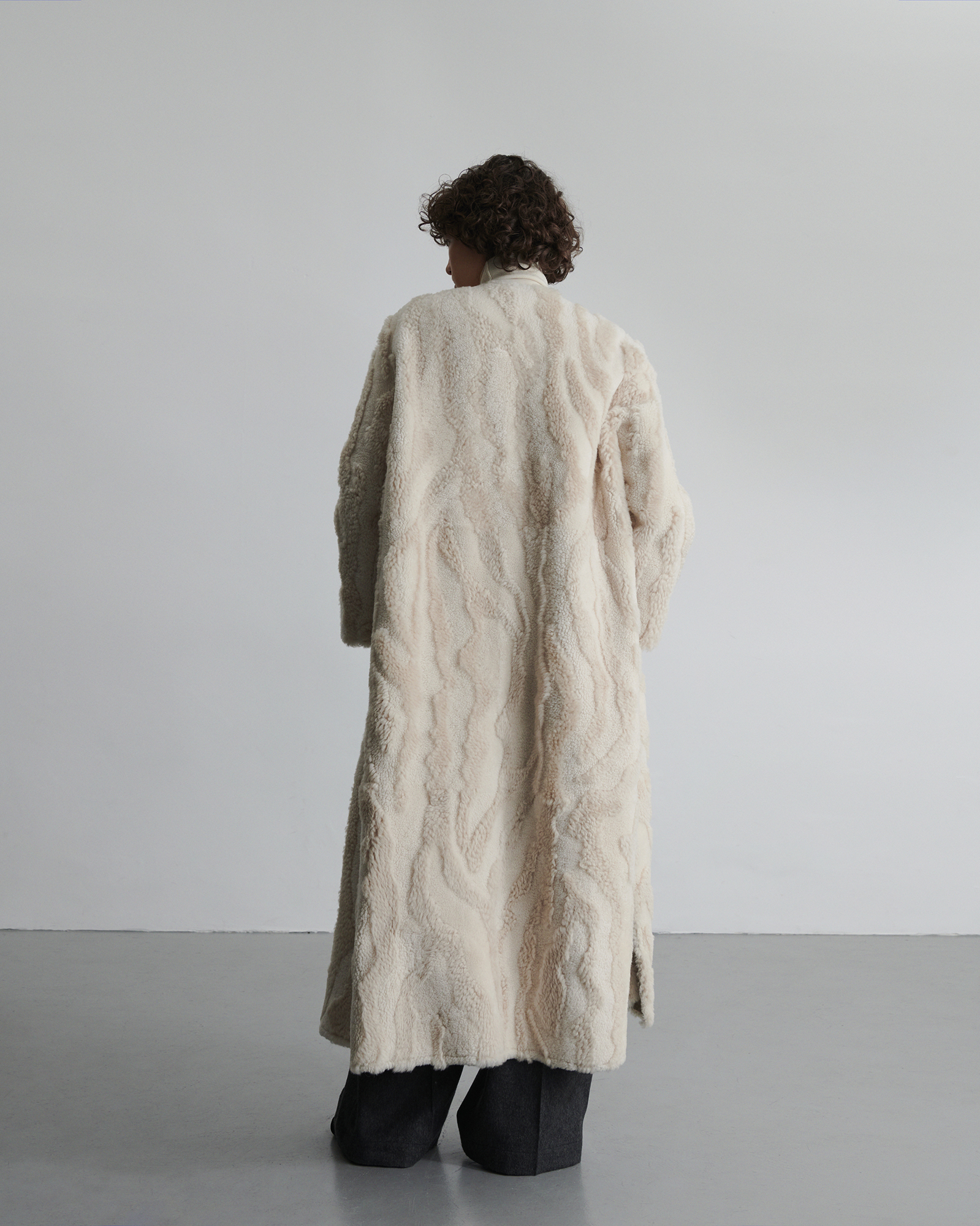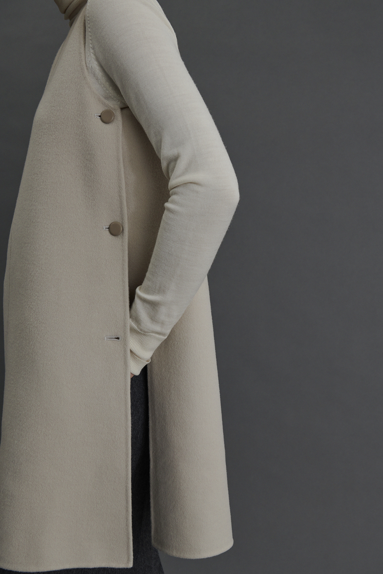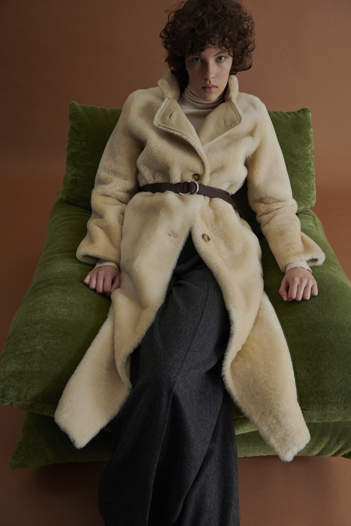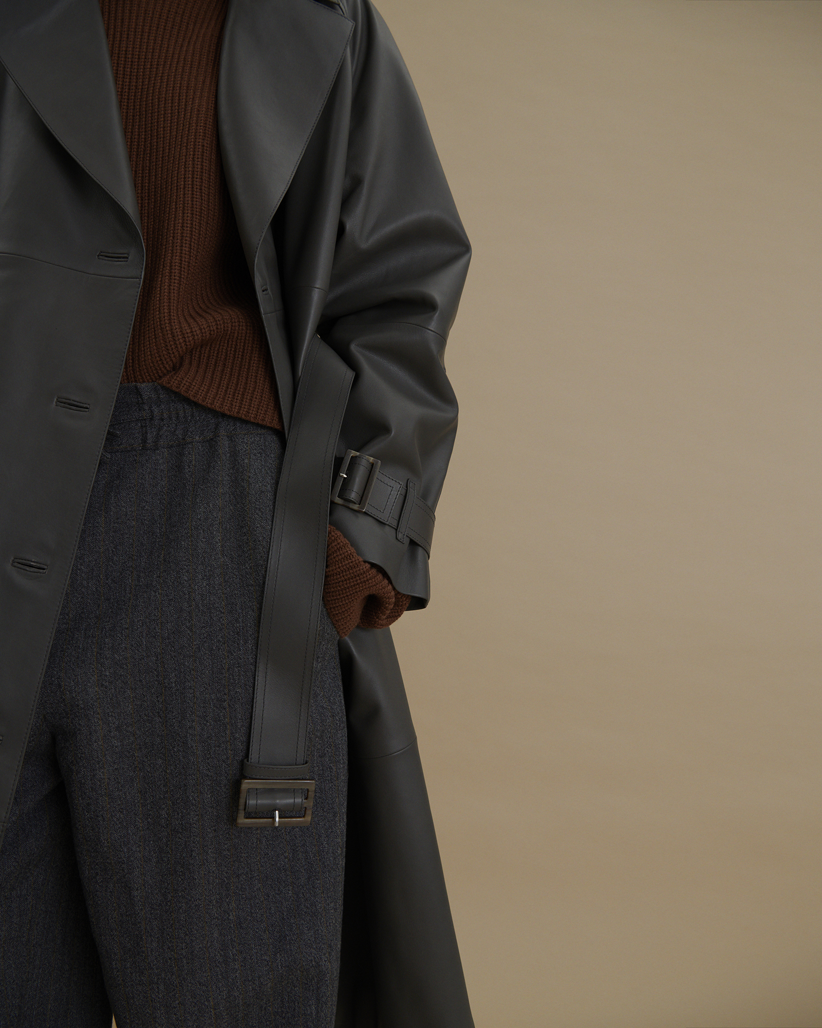 Le « luxe discret », signature de la maison Yves Salomon, se manifeste à travers chaque création. Les manteaux en cachemire, emblèmes de cette discrétion luxueuse, côtoient des vestes finement ajustées, sublimées par des surpiqûres de cuir discrètes. Cette collection témoigne de l’excellence du savoir-faire des ateliers Yves Salomon, mêlant avec brio art, design et technicité.