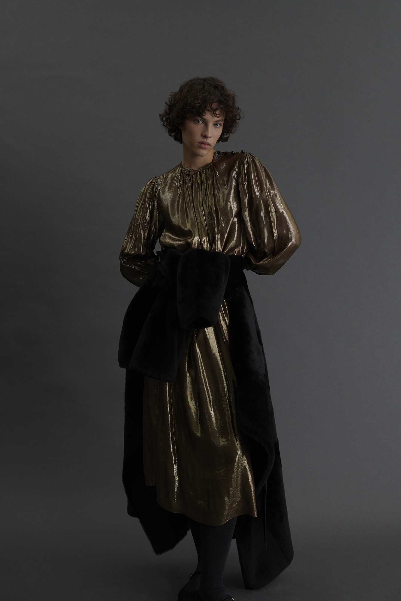 La collection Automne-Hiver d’Yves Salomon est une véritable ode à la sophistication et à l’innovation. Les tissus sont au cœur de cette alchimie créative, avec une préférence pour le chevron, le twill de laine, et le satin, méticuleusement choisis pour leur texture et leur capacité à incarner la richesse visuelle et tactile. L’esprit festif du Studio 54 est réincarné à travers des pièces en lamé scintillant, tandis que la palette de couleurs, inspirée des œuvres de Rothko et d’Albers, propose des rouges profonds et des beiges doux, rehaussés par des touches de vert sapin rappelant les forêts enneigées.