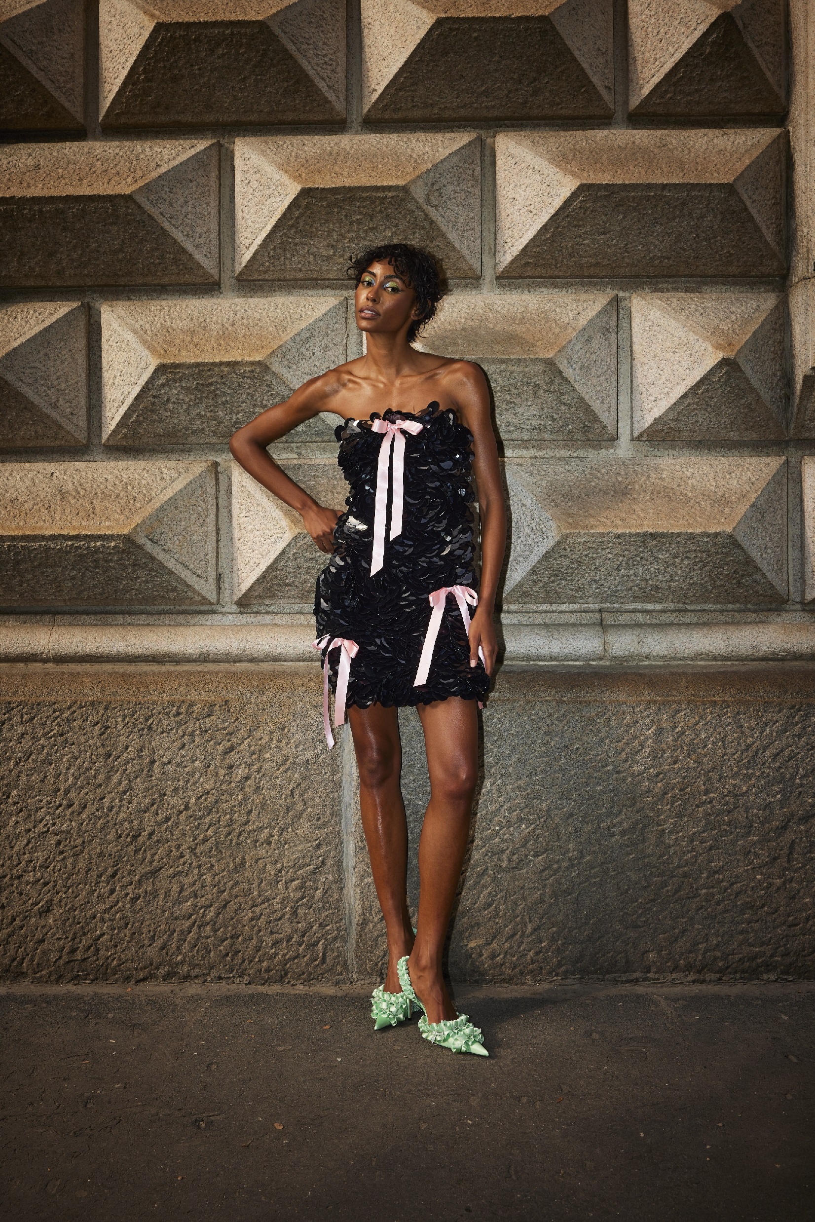 La capsule prêt-à-porter de Mach & Mach complète la collection avec des pièces idéales pour les fêtes, empreintes d’une élégance sirène. On y trouve une robe noire dramatique en filet de pêche ornée de cristaux, une tunique en maille métallique avec une traîne spectaculaire, ainsi qu’une mini-robe à sequins géants et un ensemble crop top et mini-jupe, tous ornés de nœuds roses signature de la marque.