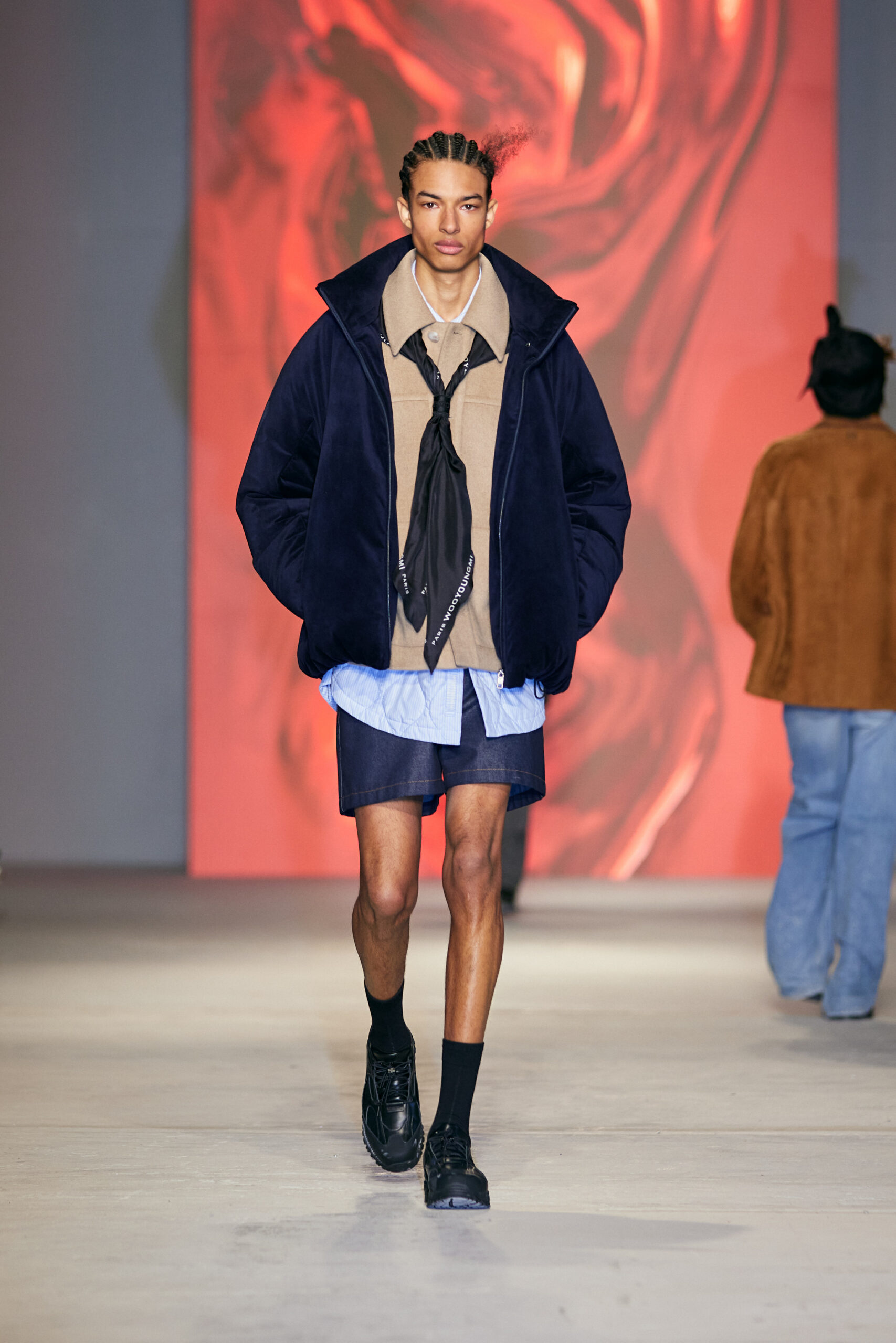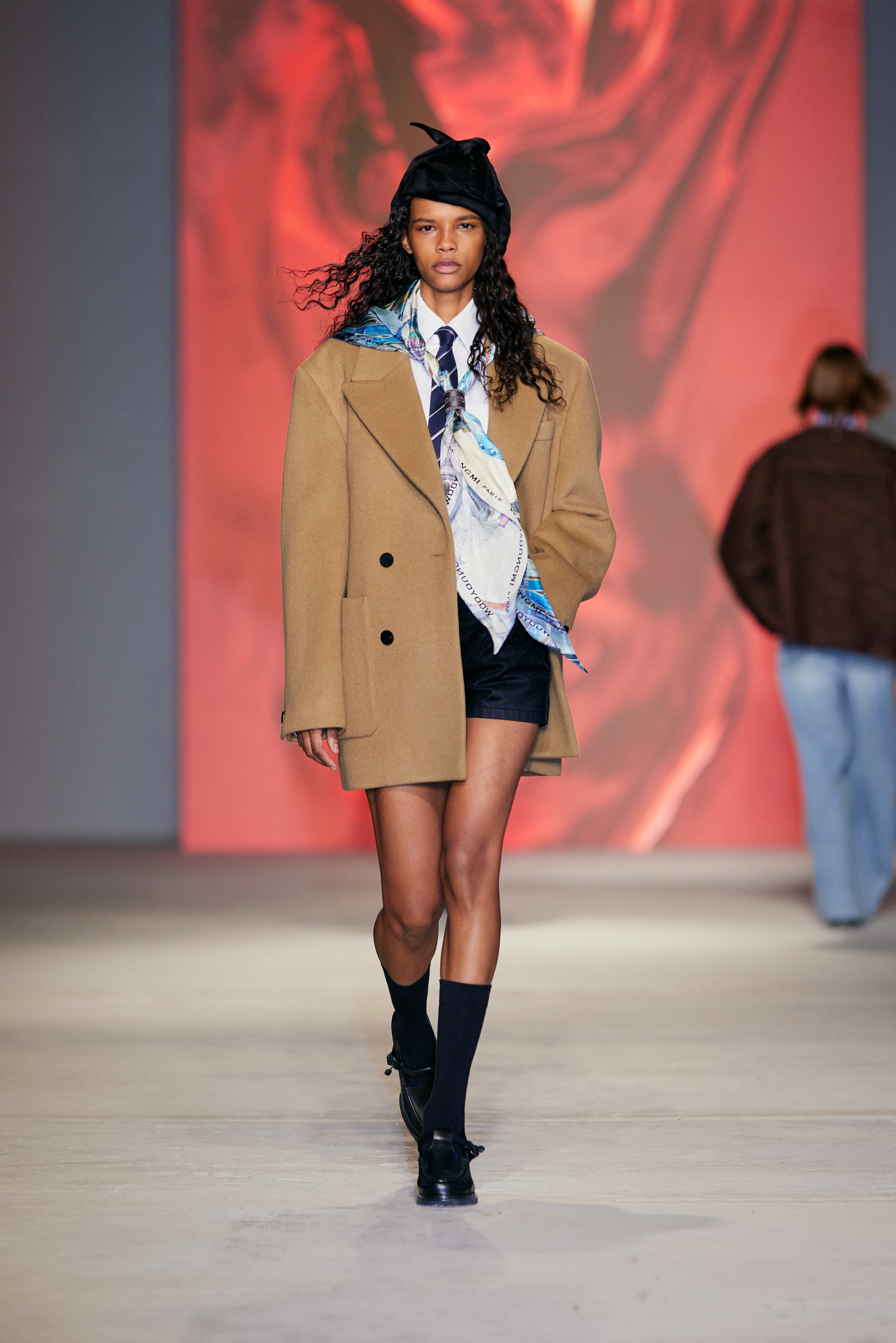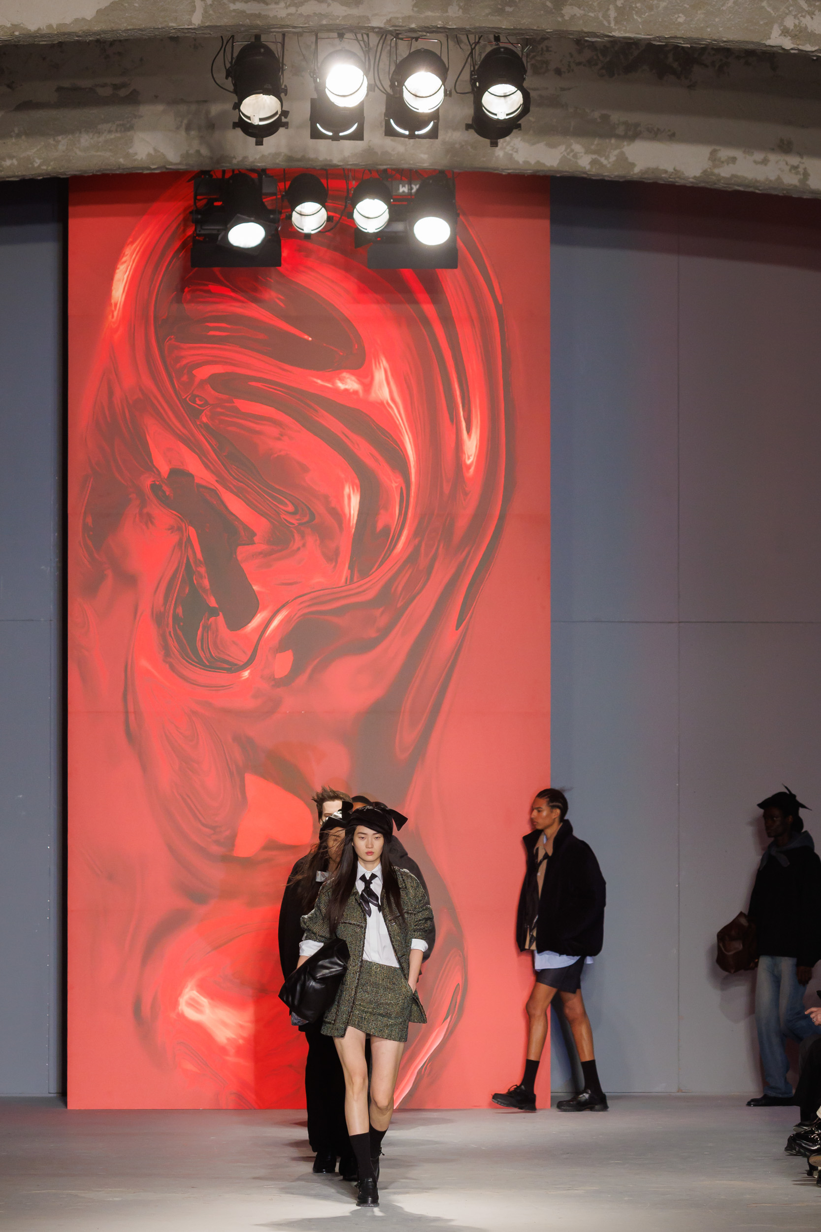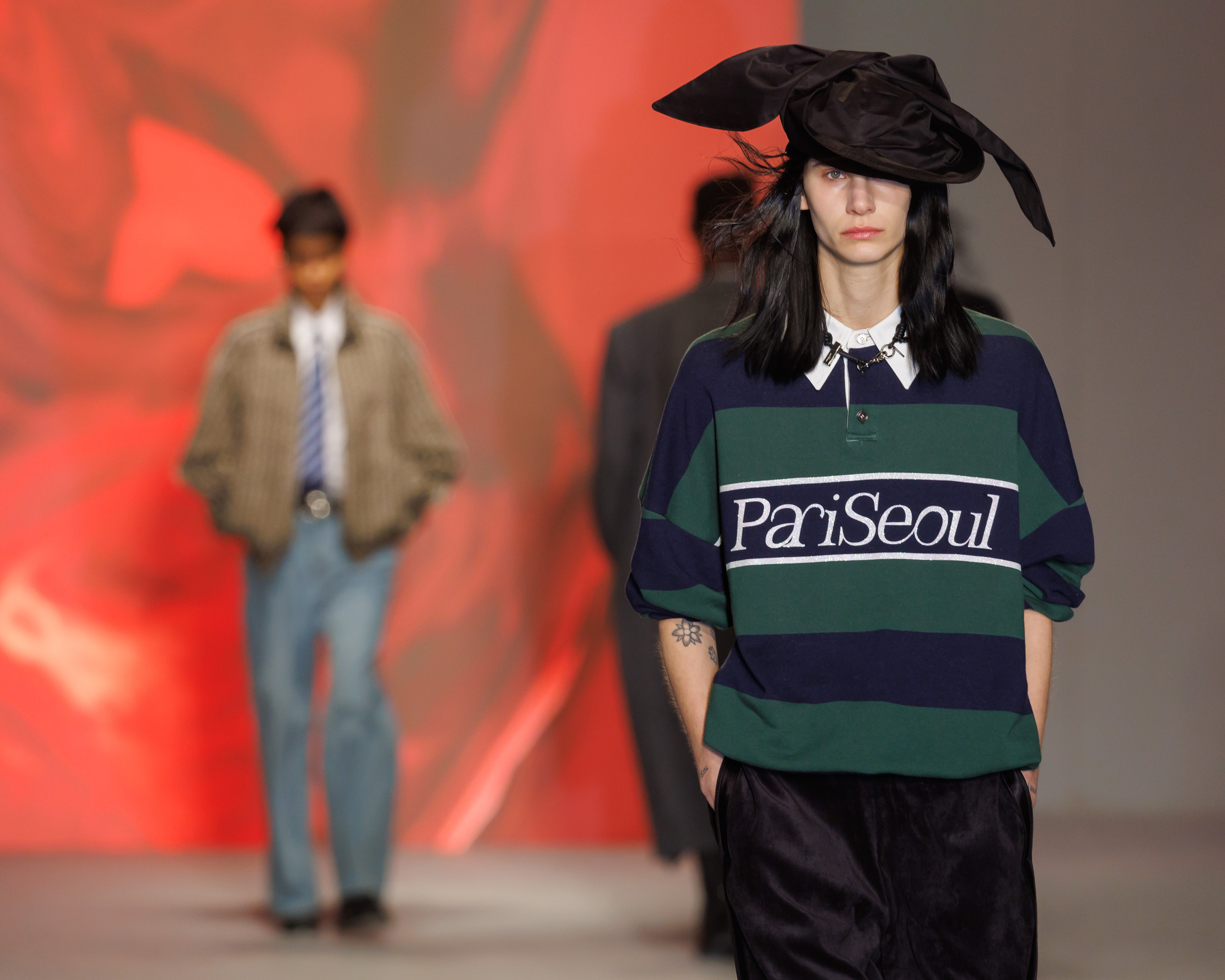 Le défilé est accompagné d’une bande-son mêlant le jazz à la traditionnelle percussion gugak sud-coréenne, reflétant la rencontre entre modernité et tradition qui caractérise Séoul, ainsi que la collection AW24 de Wooyoungmi.