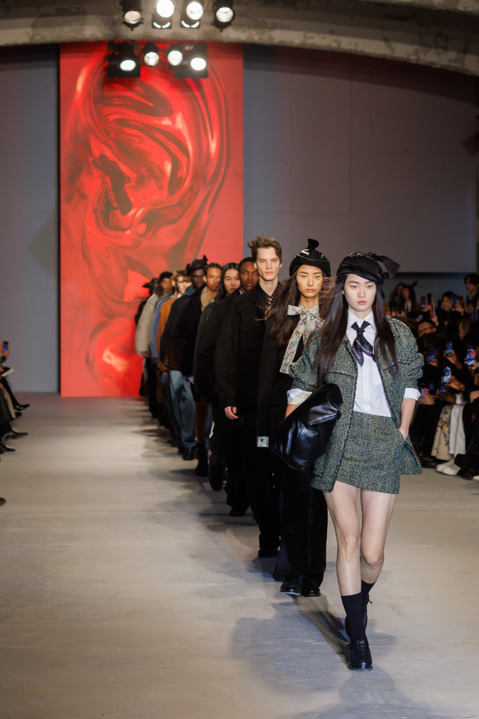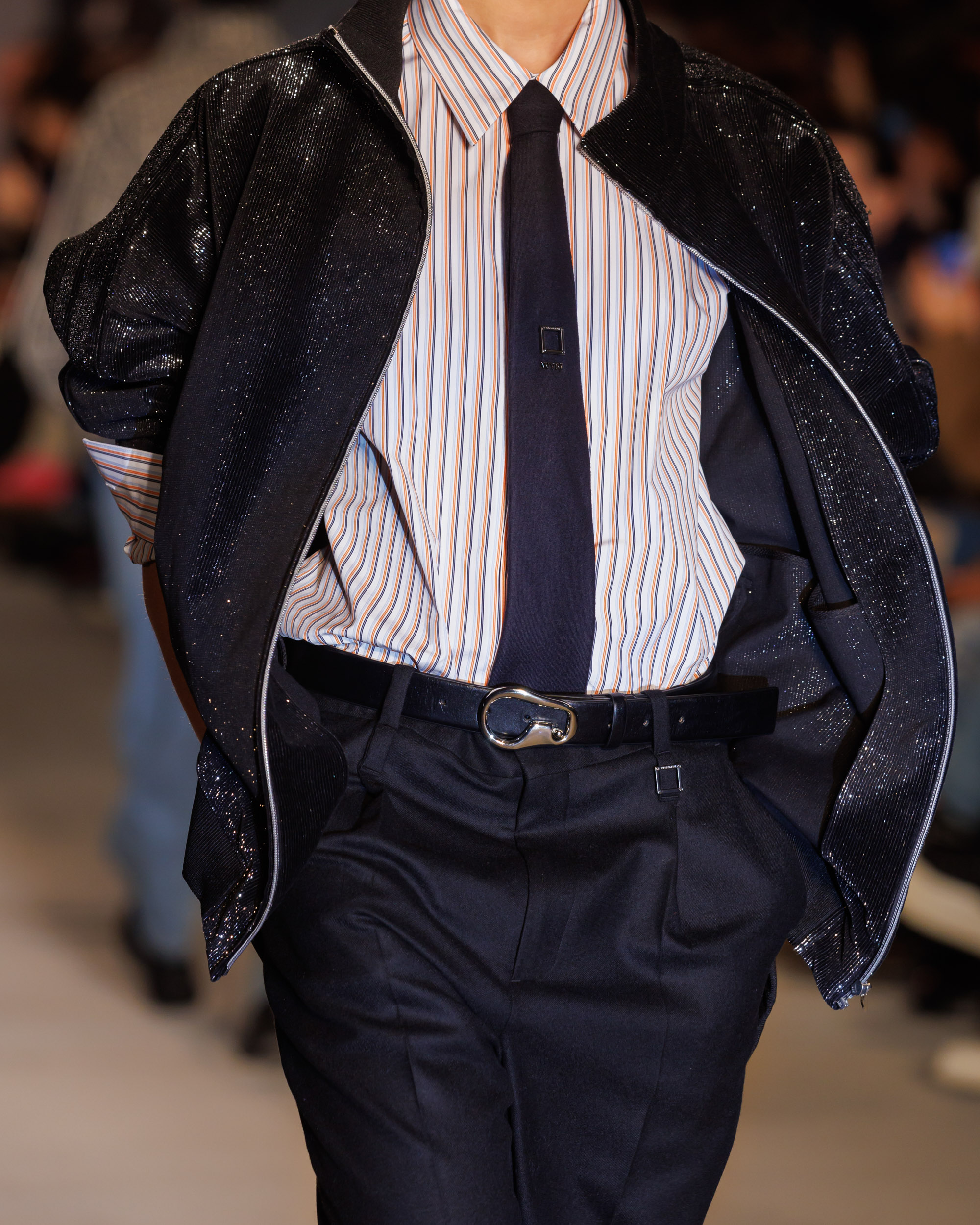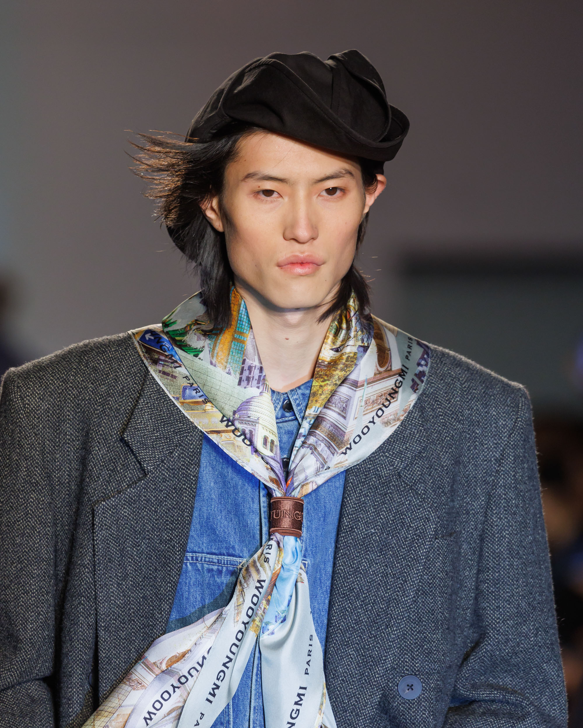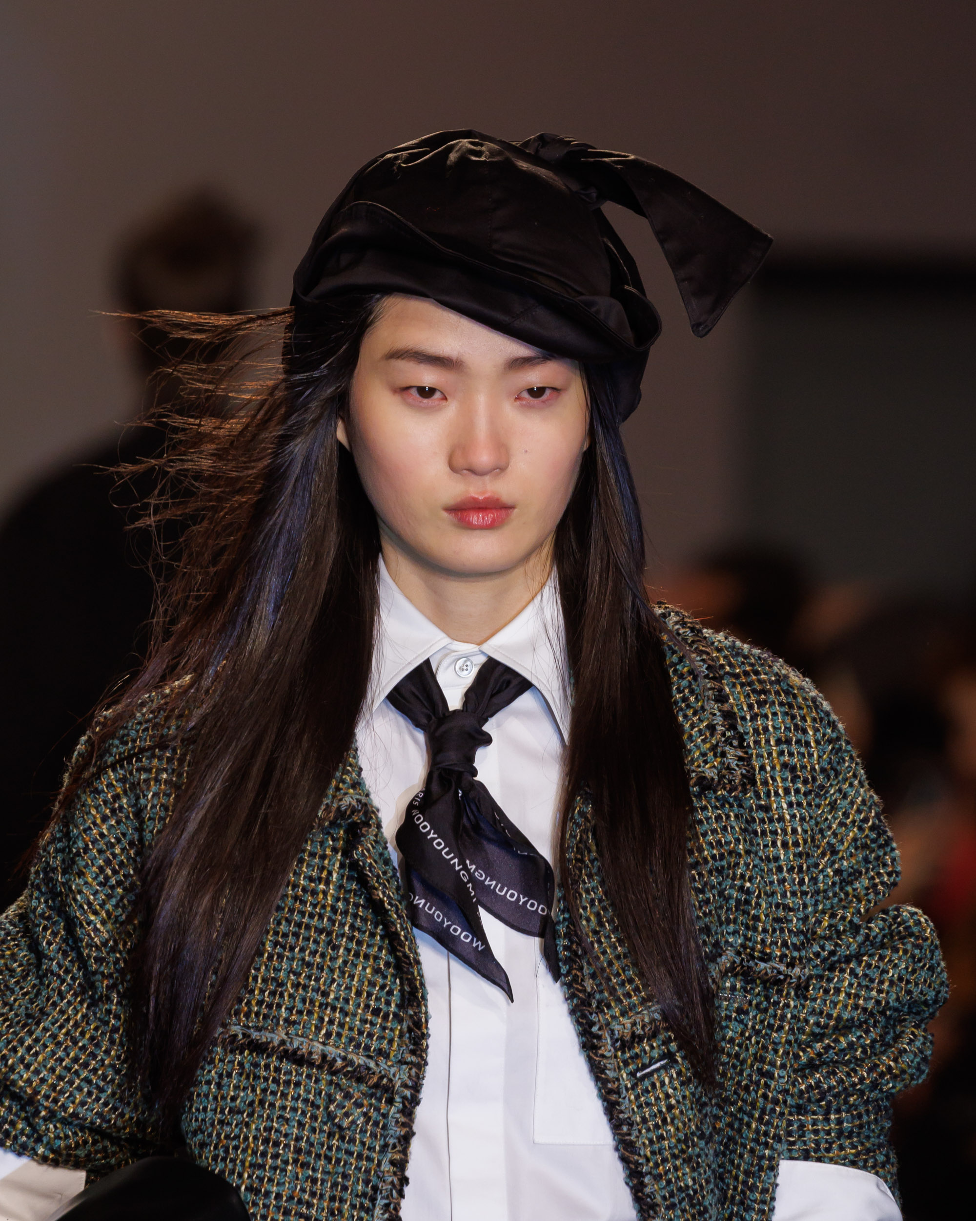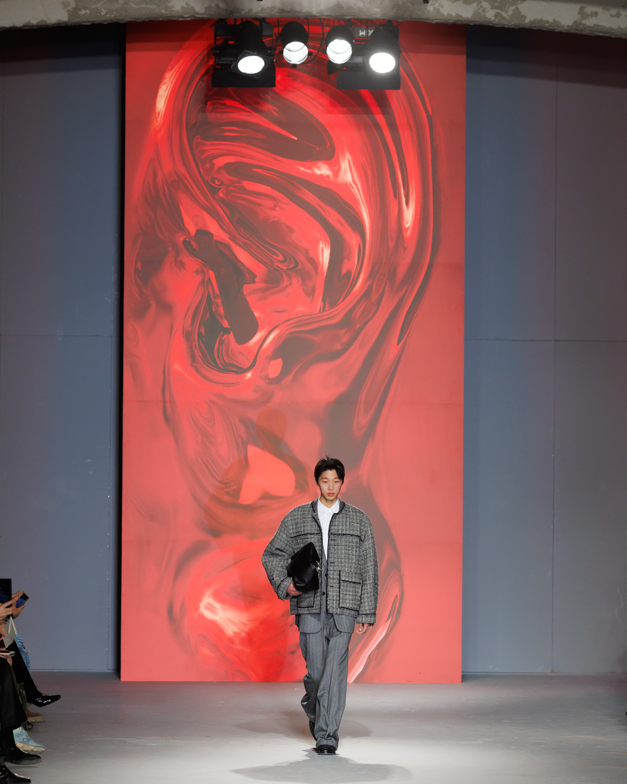 Le défilé est accompagné d’une bande-son mêlant le jazz à la traditionnelle percussion gugak sud-coréenne, reflétant la rencontre entre modernité et tradition qui caractérise Séoul, ainsi que la collection AW24 de Wooyoungmi.