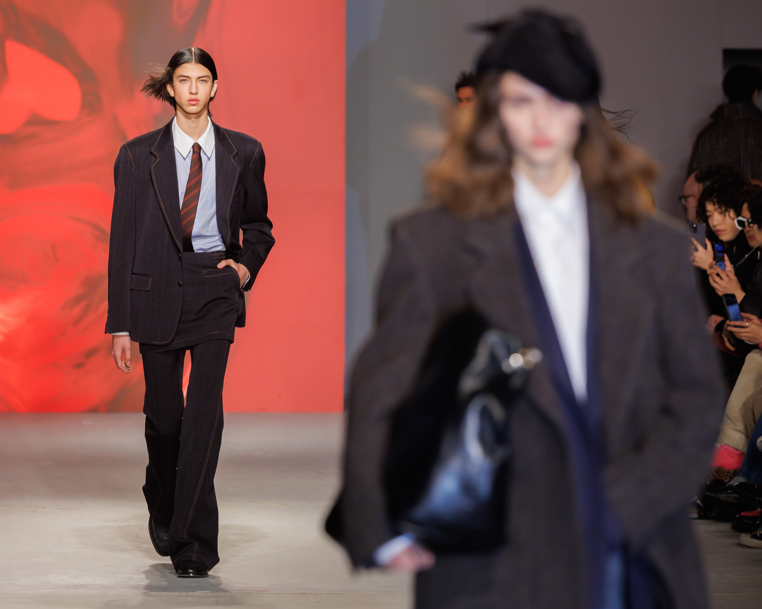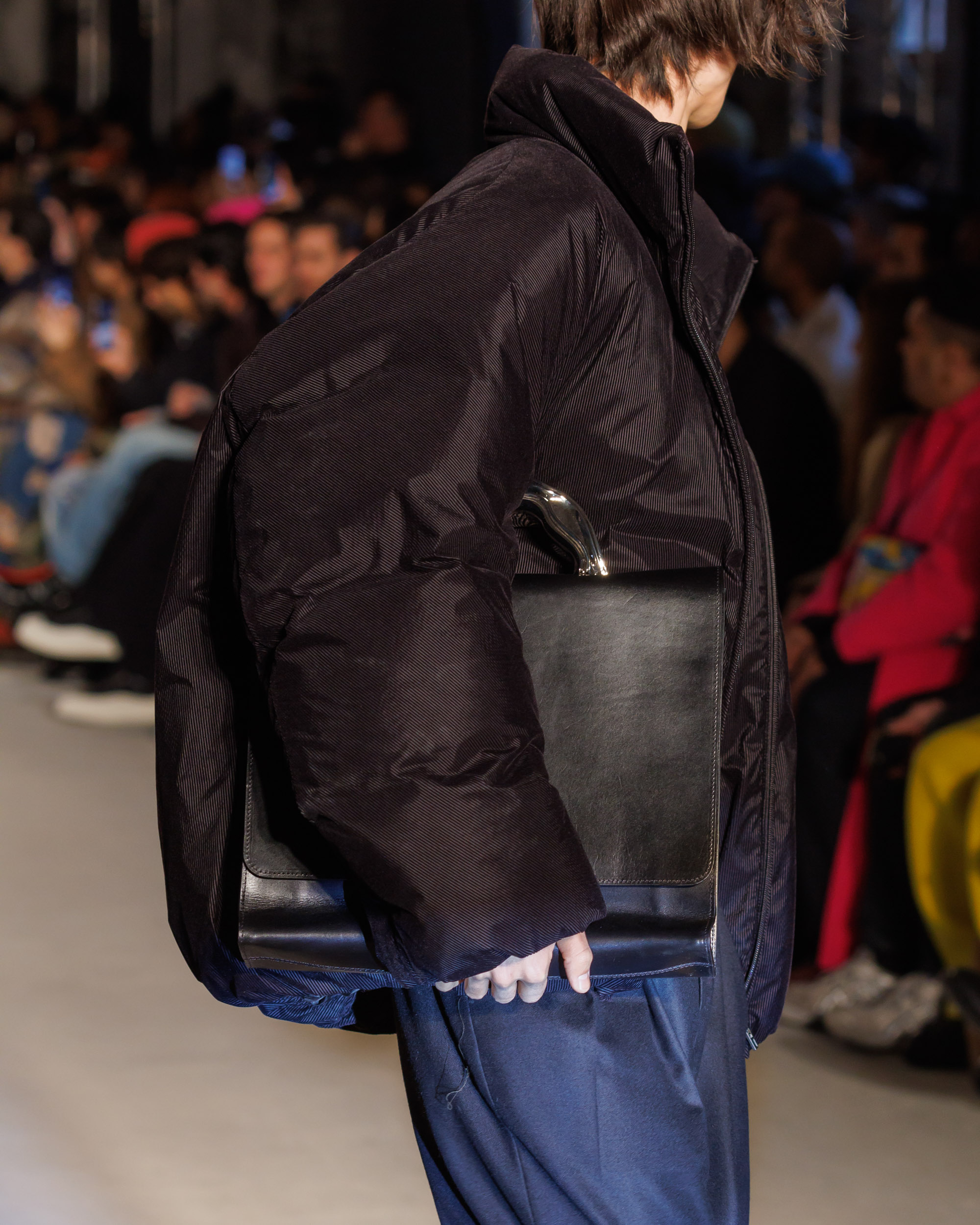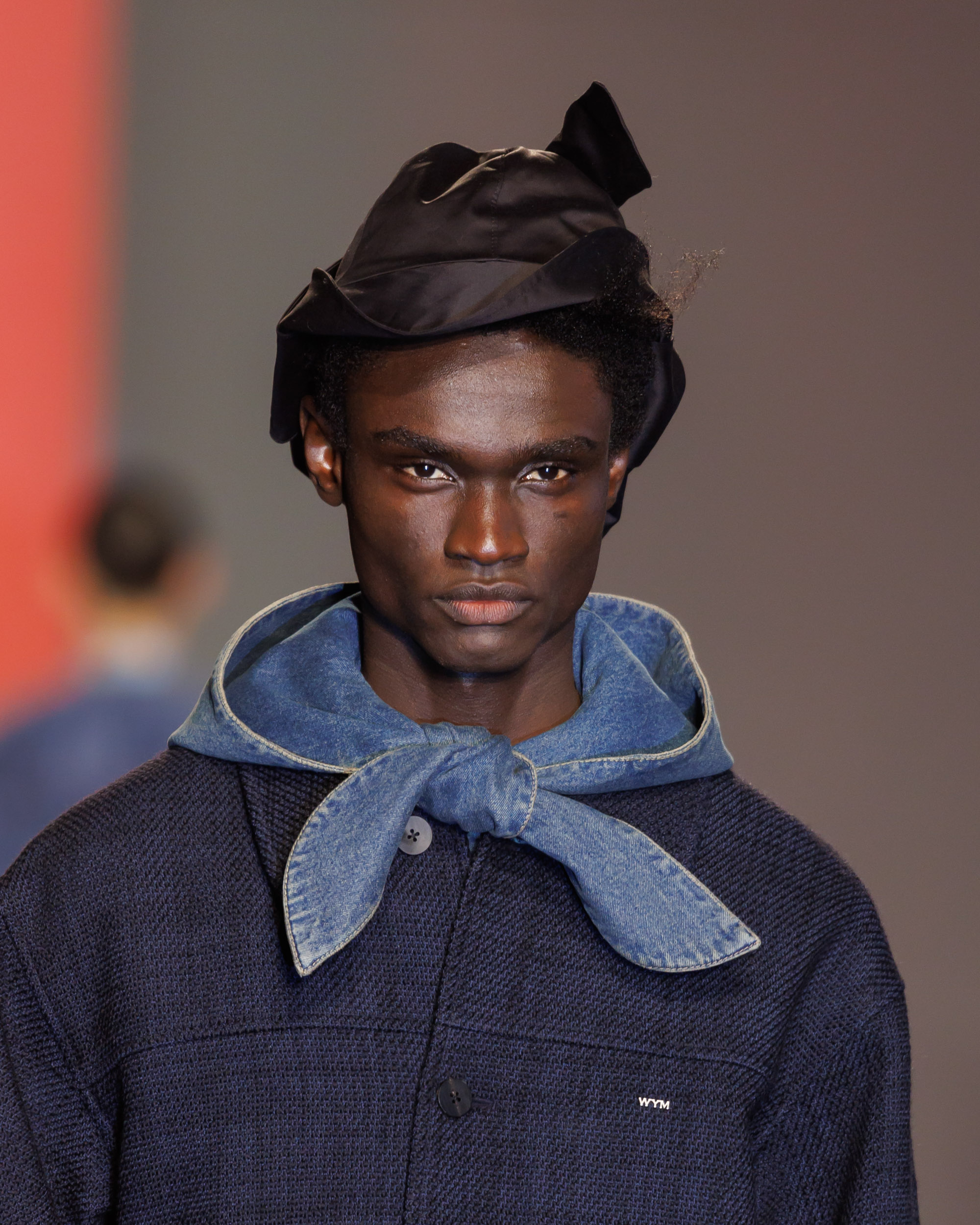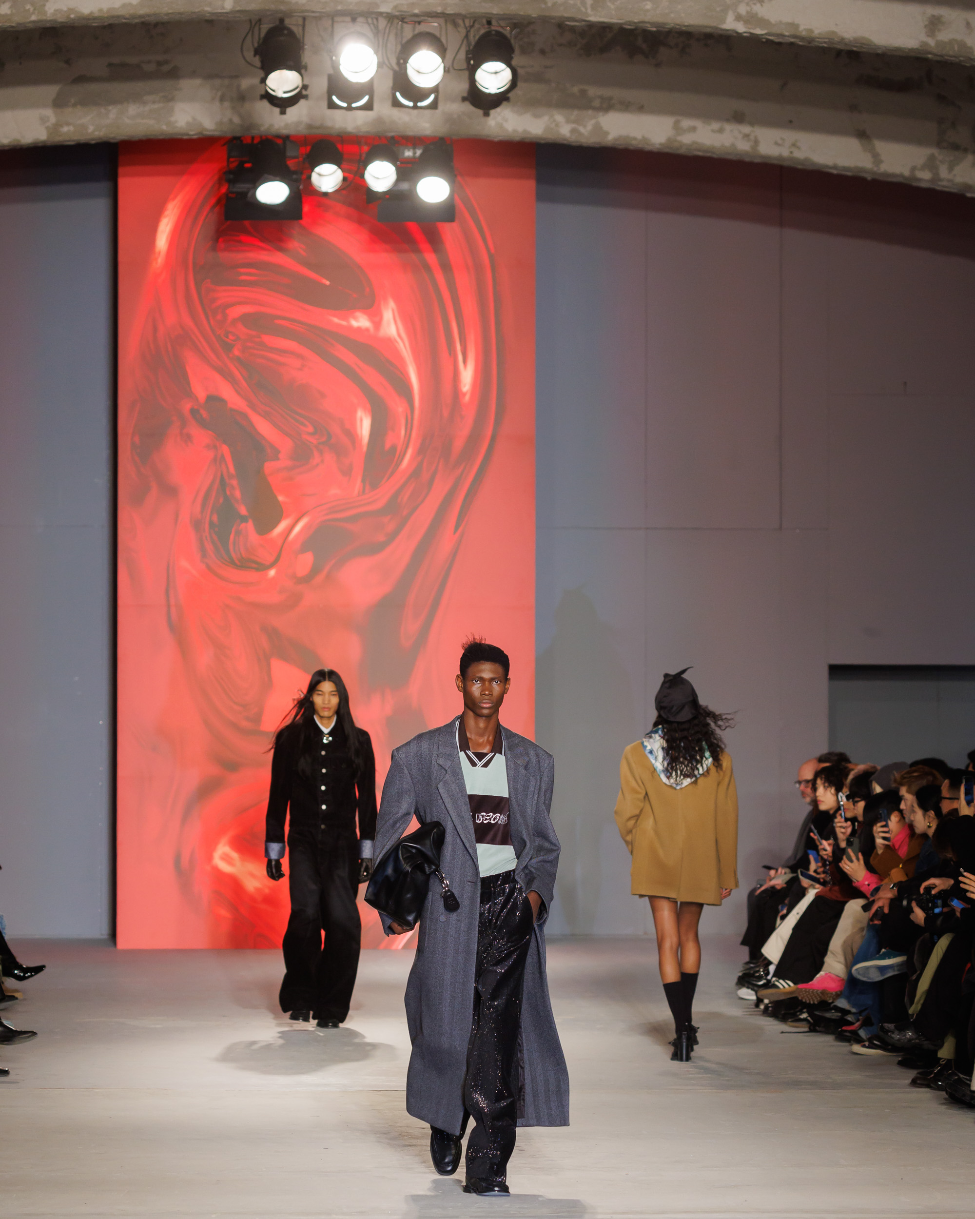 Le défilé est accompagné d’une bande-son mêlant le jazz à la traditionnelle percussion gugak sud-coréenne, reflétant la rencontre entre modernité et tradition qui caractérise Séoul, ainsi que la collection AW24 de Wooyoungmi.