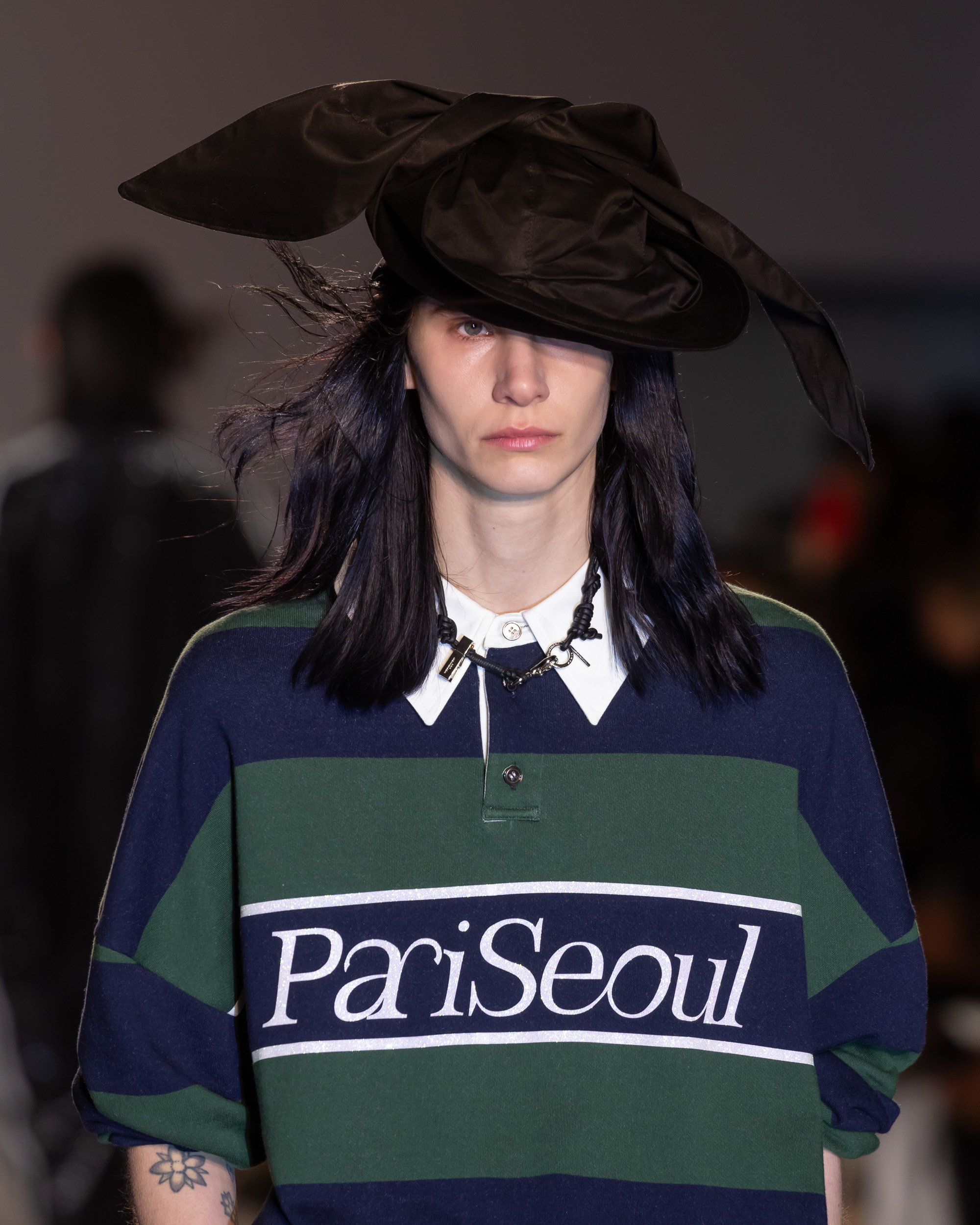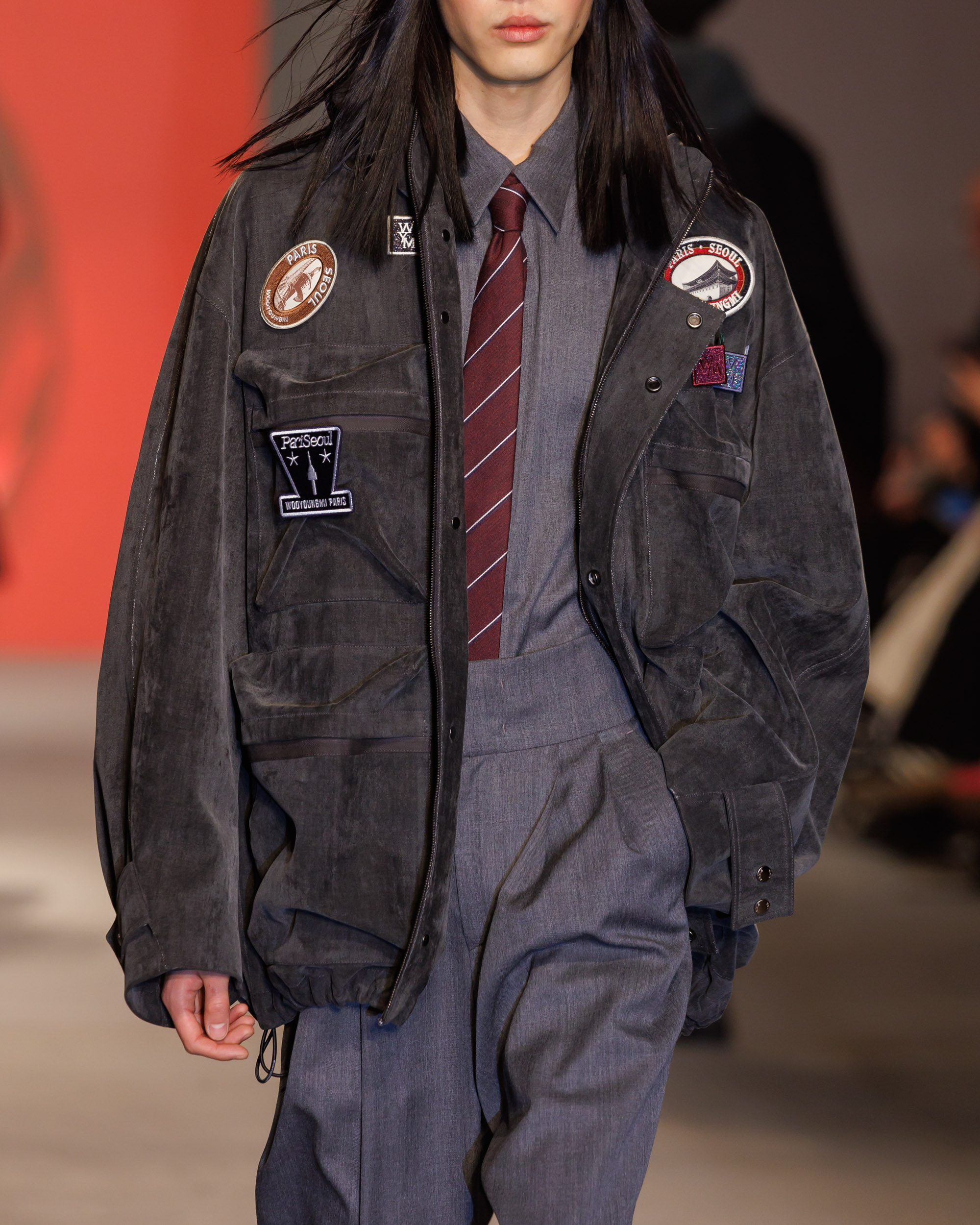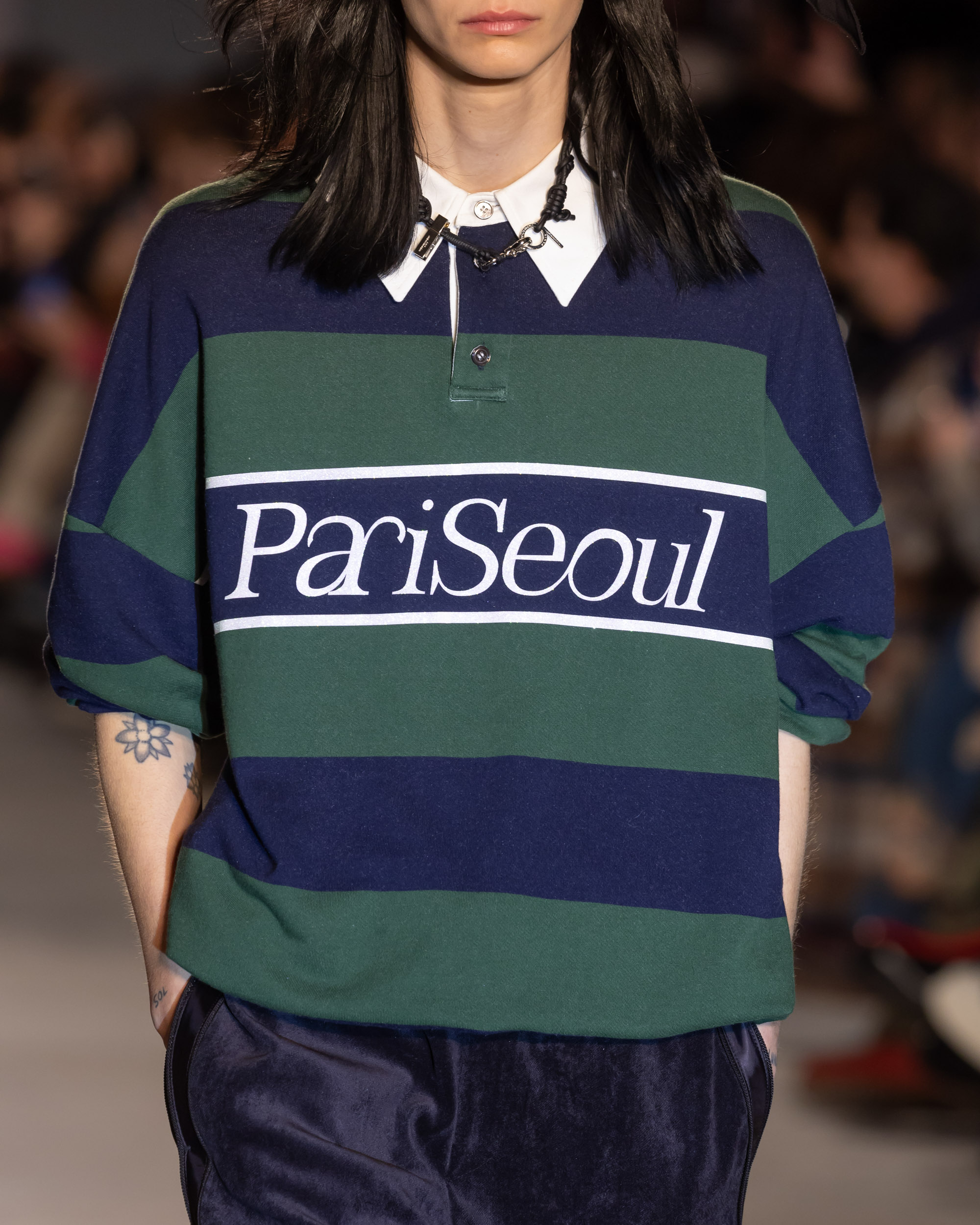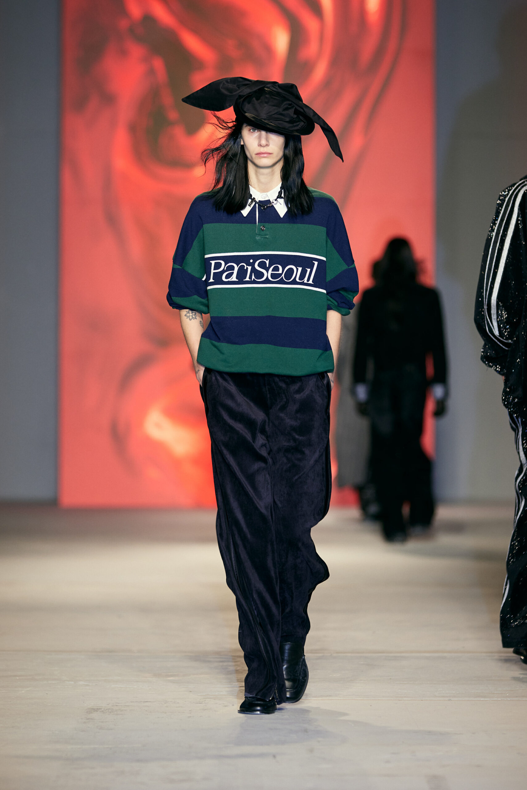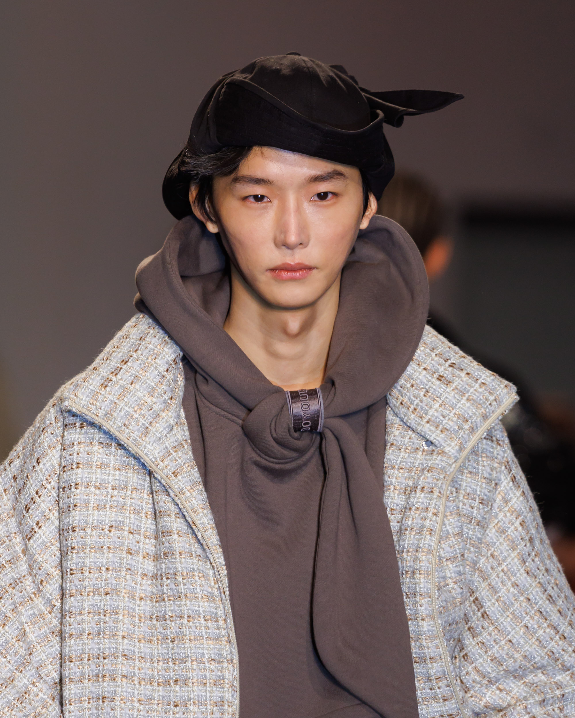 La collection rend hommage aux divers habitants de Séoul, des hommes d’affaires dans leurs manteaux allongés et costumes relax à la bourgeoisie en ensemble jupe-bouclé, sans oublier les écoliers et les scouts dans leur tenue préppy et sportswear. L’esthétique utilitaire des travailleurs de la route de Séoul se mêle aux codes de la culture jeune de la ville, créant un mélange unique qui reflète l’esprit de Séoul.