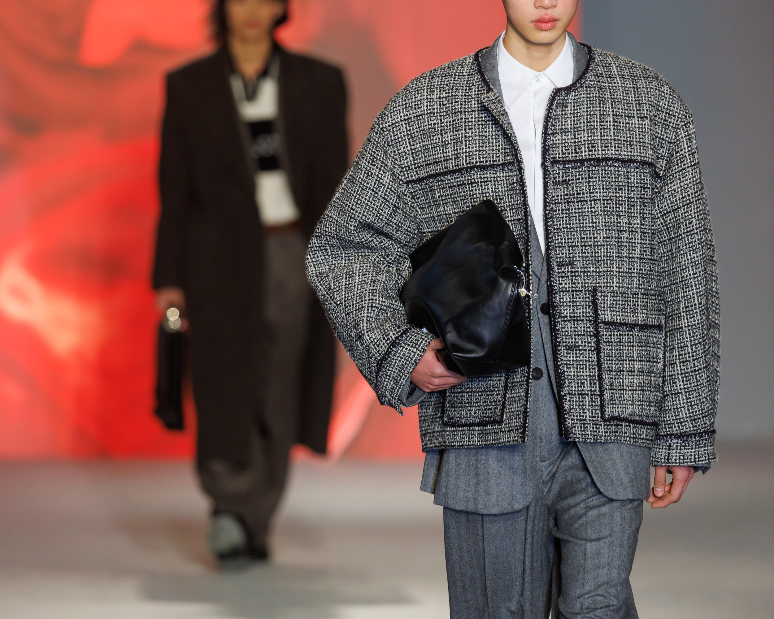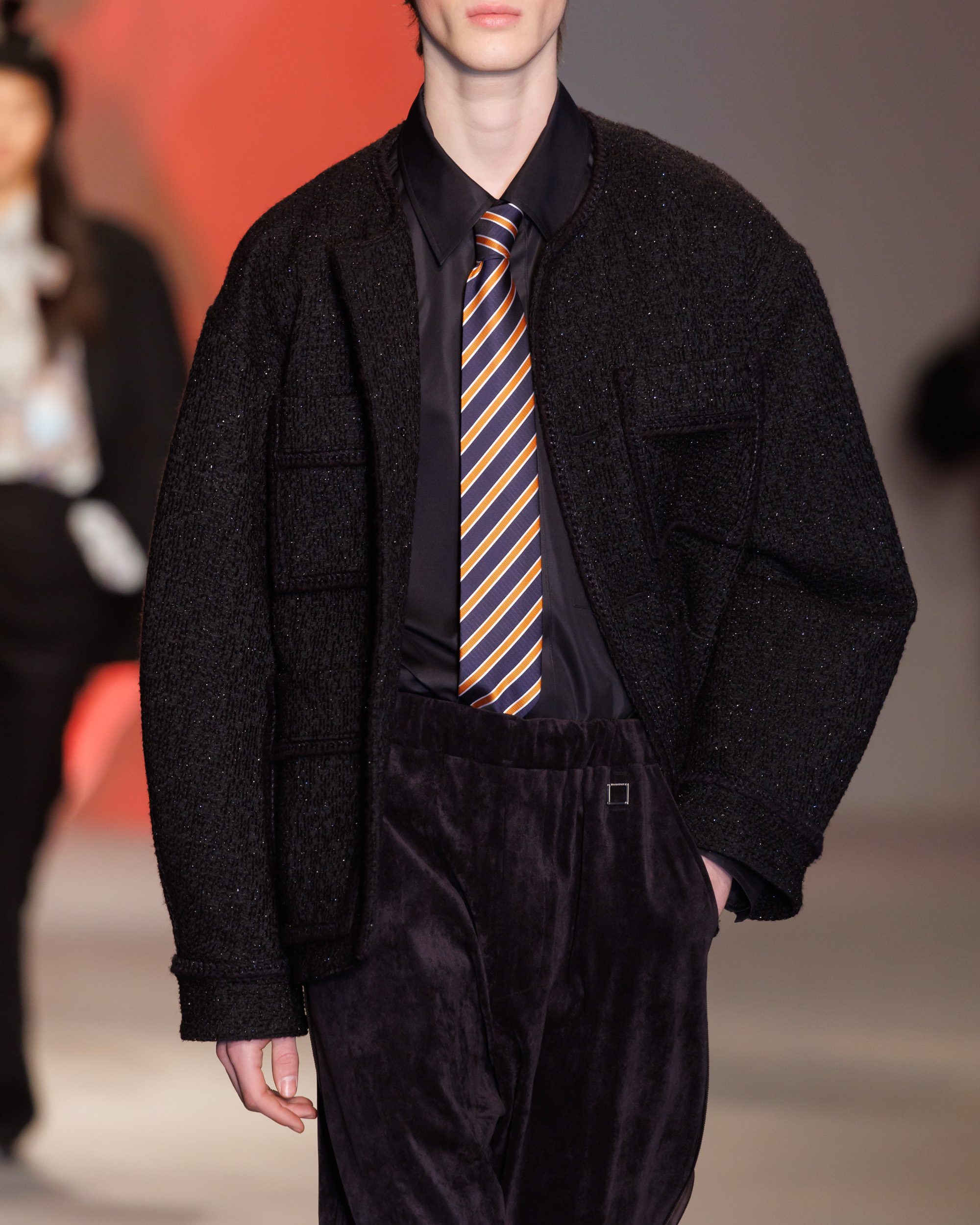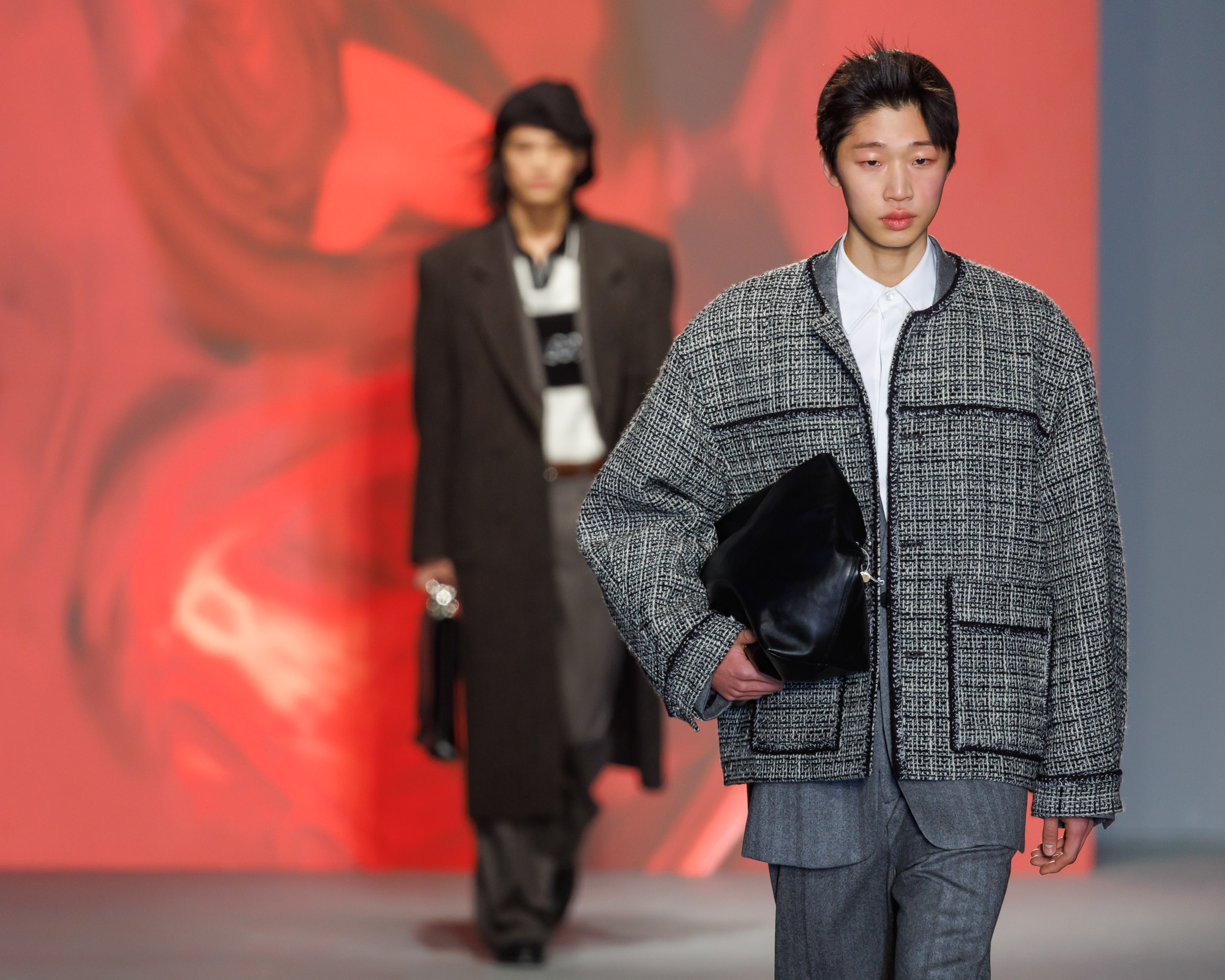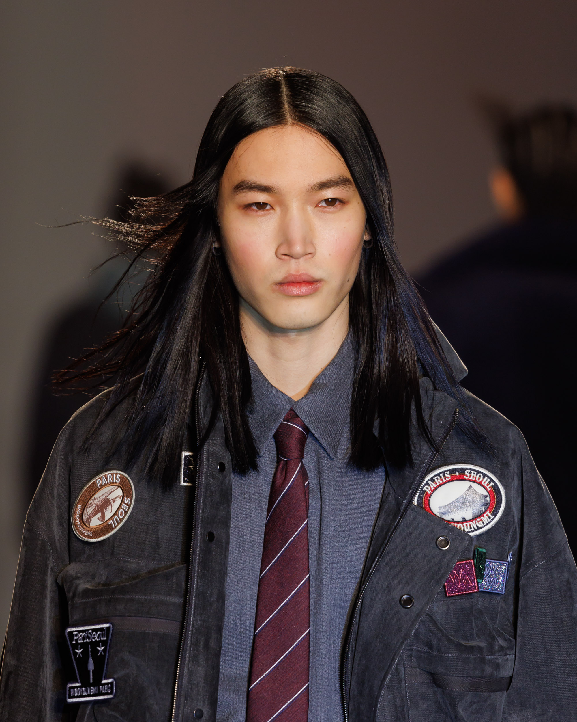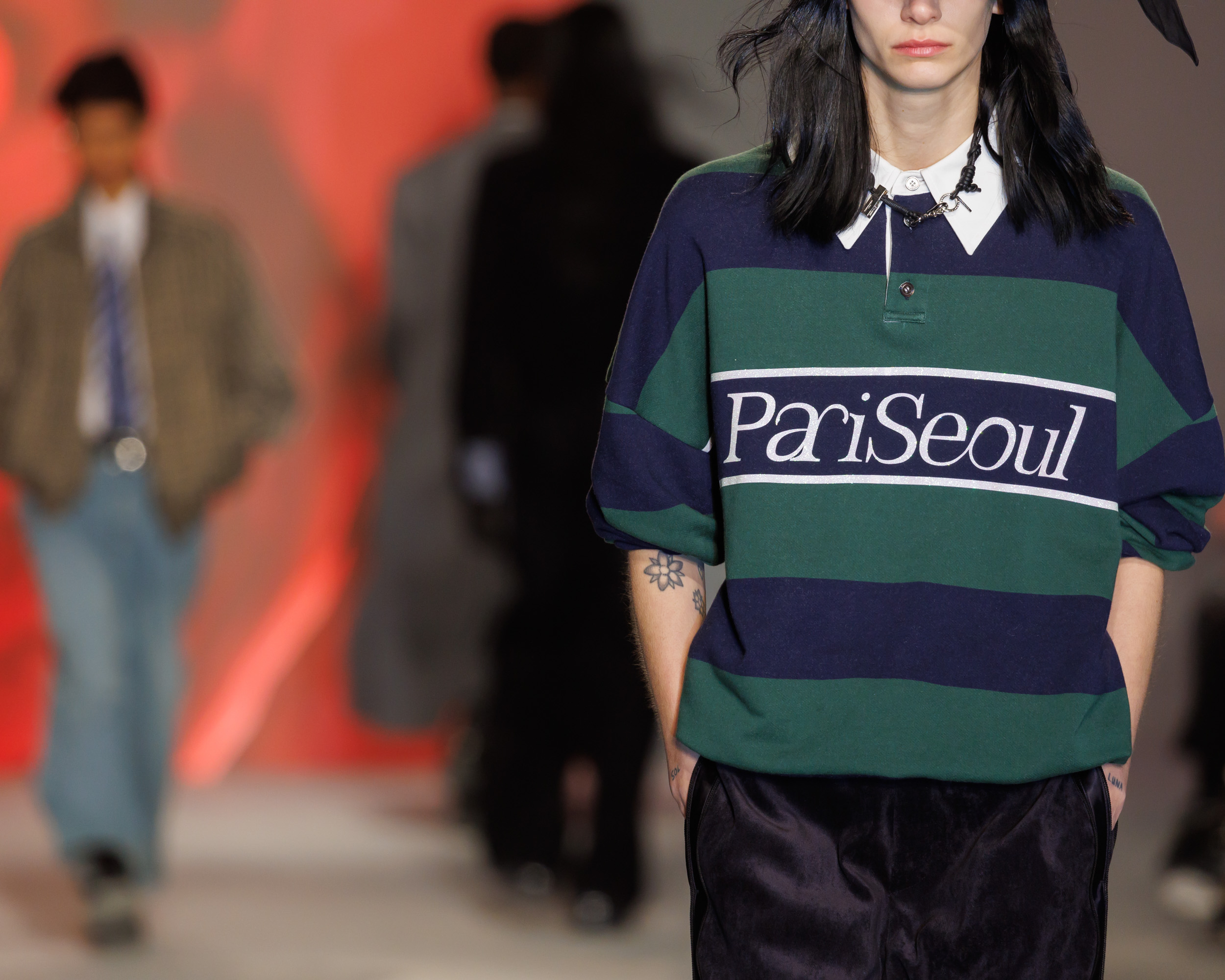 La collection rend hommage aux divers habitants de Séoul, des hommes d’affaires dans leurs manteaux allongés et costumes relax à la bourgeoisie en ensemble jupe-bouclé, sans oublier les écoliers et les scouts dans leur tenue préppy et sportswear. L’esthétique utilitaire des travailleurs de la route de Séoul se mêle aux codes de la culture jeune de la ville, créant un mélange unique qui reflète l’esprit de Séoul.