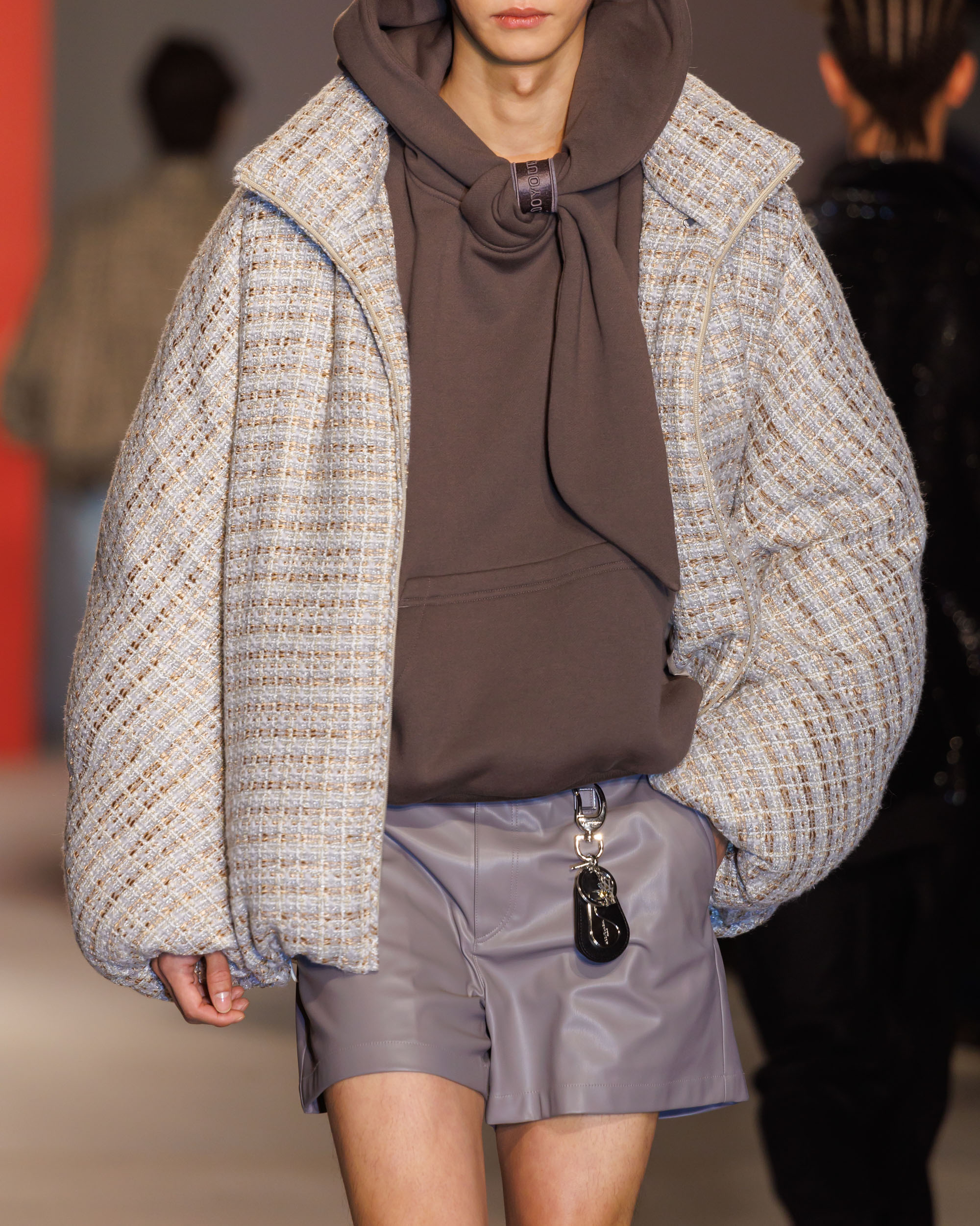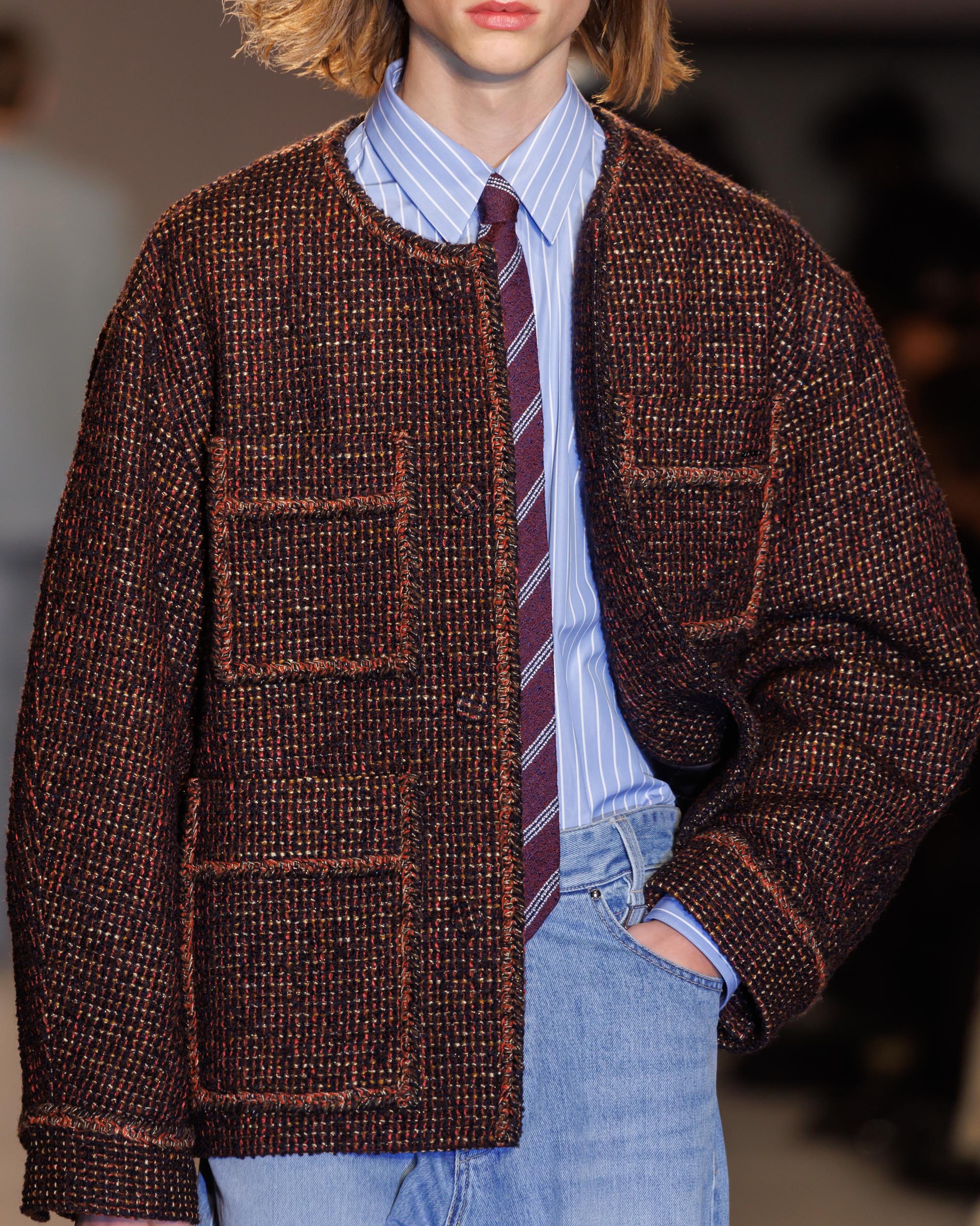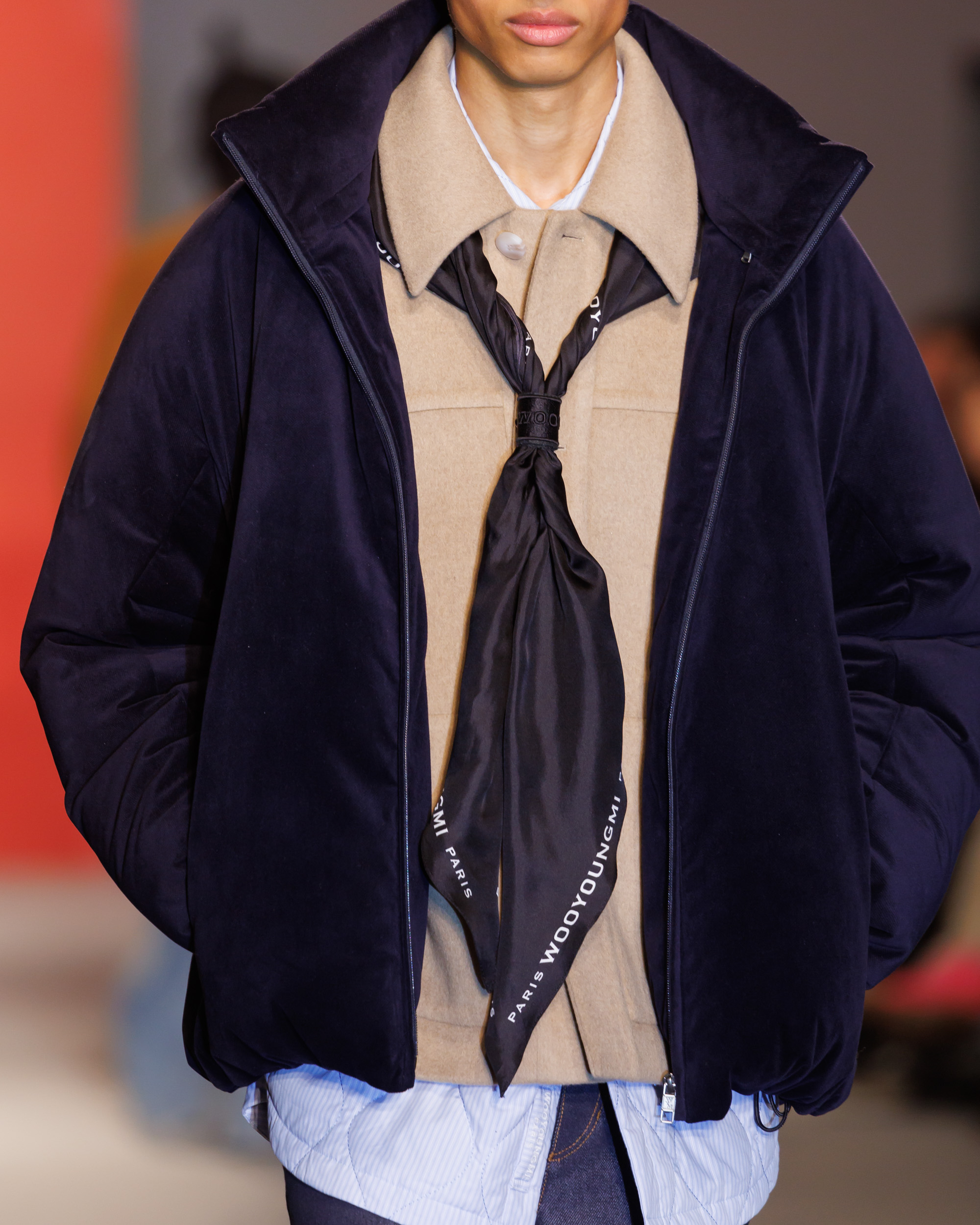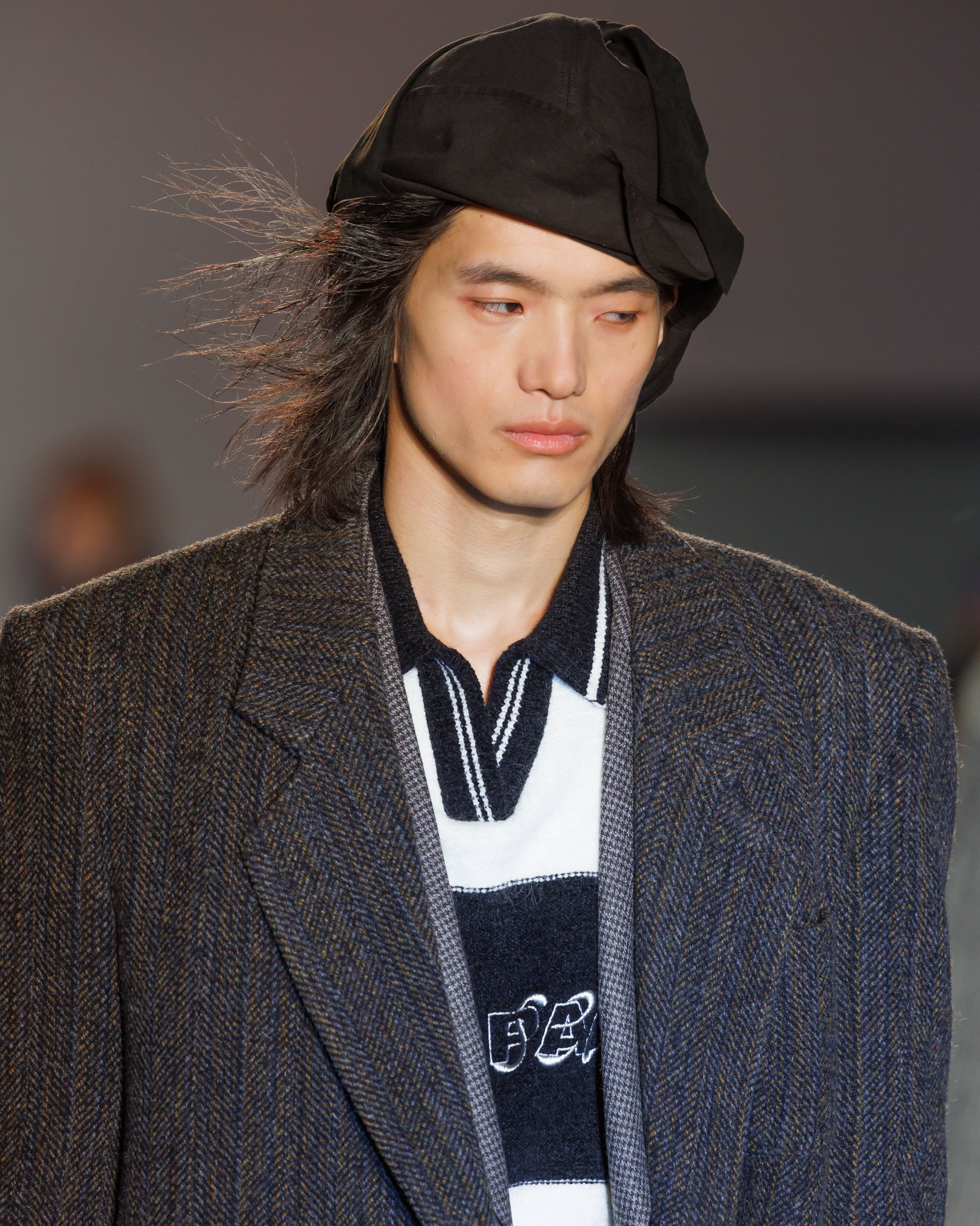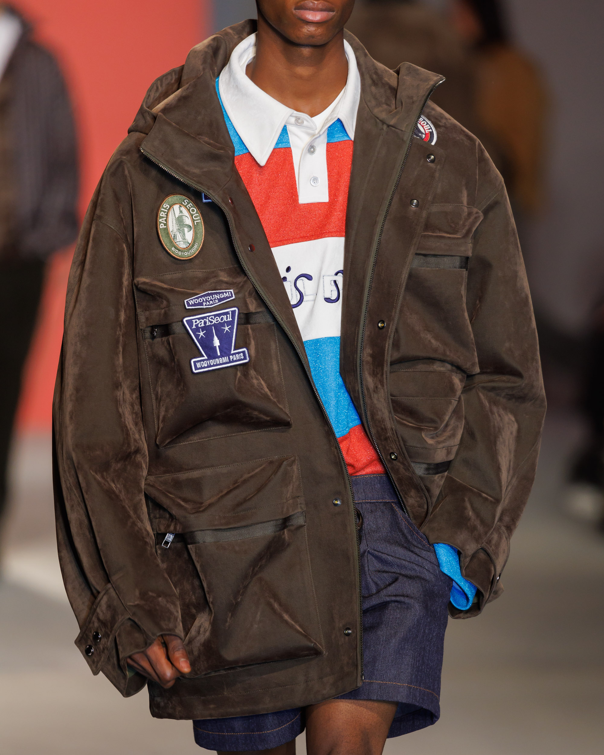 La collection rend hommage aux divers habitants de Séoul, des hommes d’affaires dans leurs manteaux allongés et costumes relax à la bourgeoisie en ensemble jupe-bouclé, sans oublier les écoliers et les scouts dans leur tenue préppy et sportswear. L’esthétique utilitaire des travailleurs de la route de Séoul se mêle aux codes de la culture jeune de la ville, créant un mélange unique qui reflète l’esprit de Séoul.