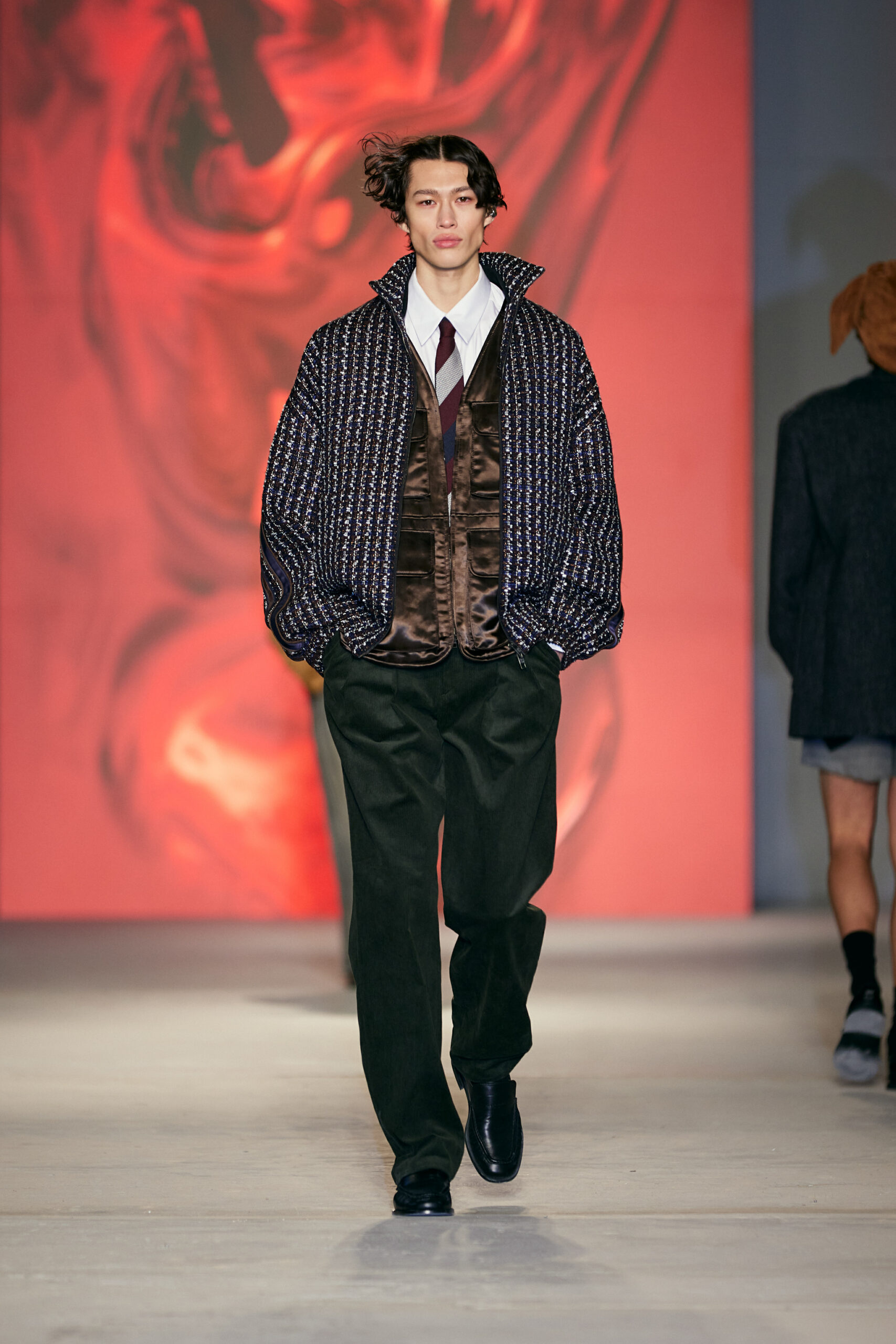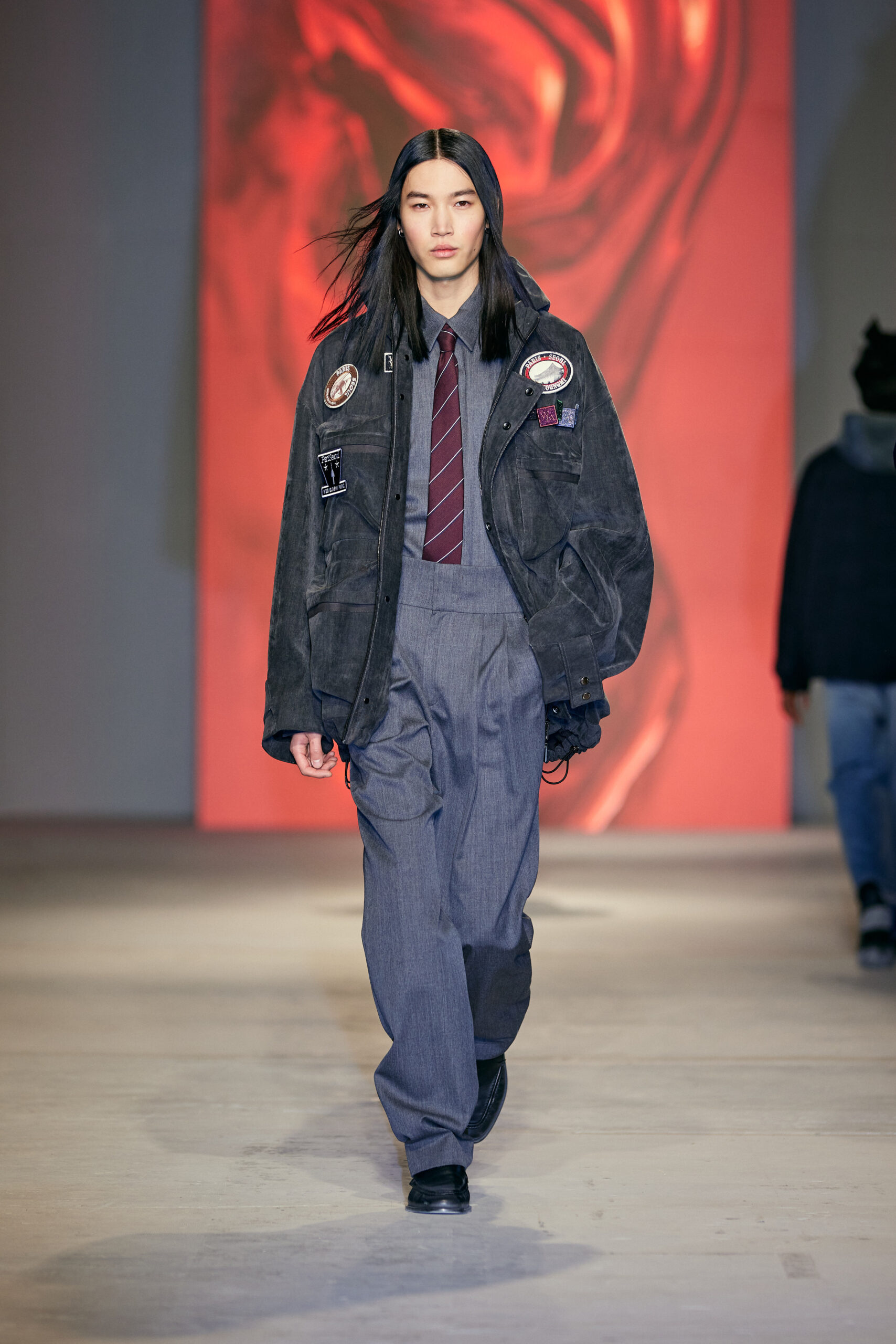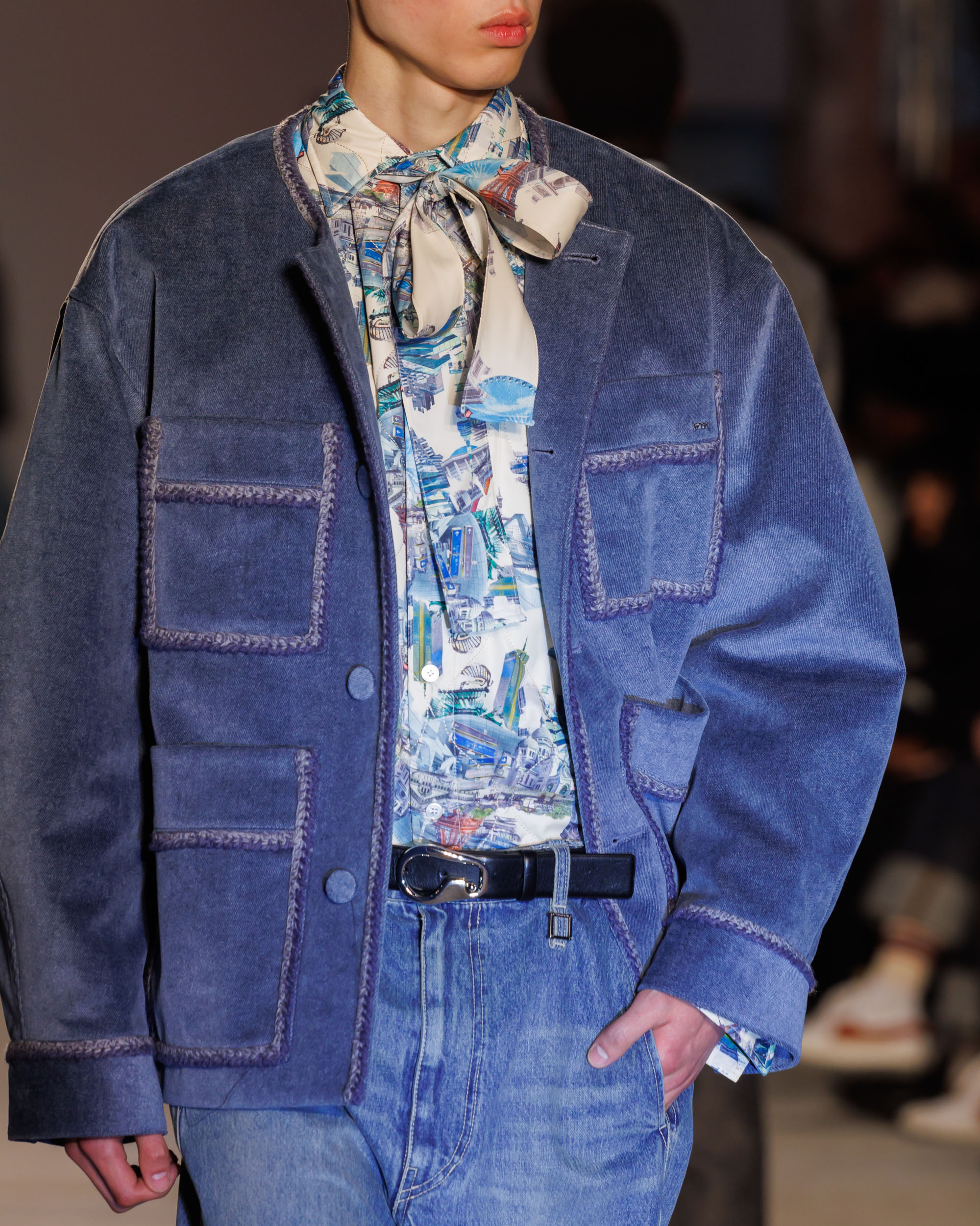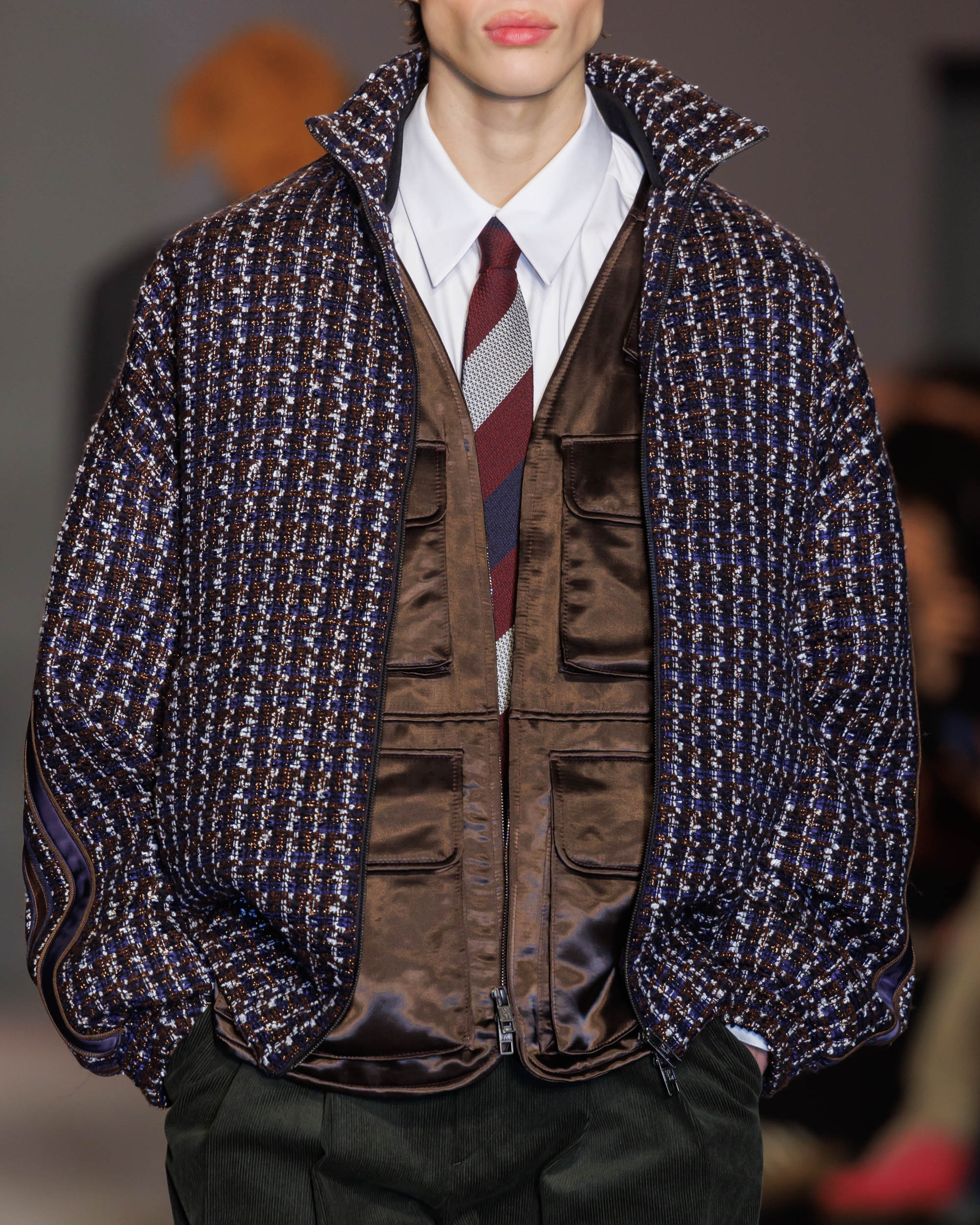 La collection rend hommage aux divers habitants de Séoul, des hommes d’affaires dans leurs manteaux allongés et costumes relax à la bourgeoisie en ensemble jupe-bouclé, sans oublier les écoliers et les scouts dans leur tenue préppy et sportswear. L’esthétique utilitaire des travailleurs de la route de Séoul se mêle aux codes de la culture jeune de la ville, créant un mélange unique qui reflète l’esprit de Séoul.