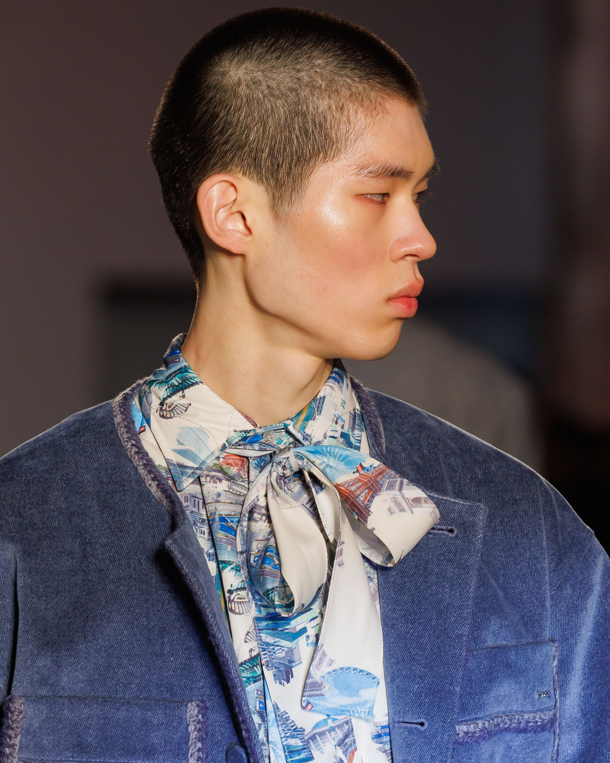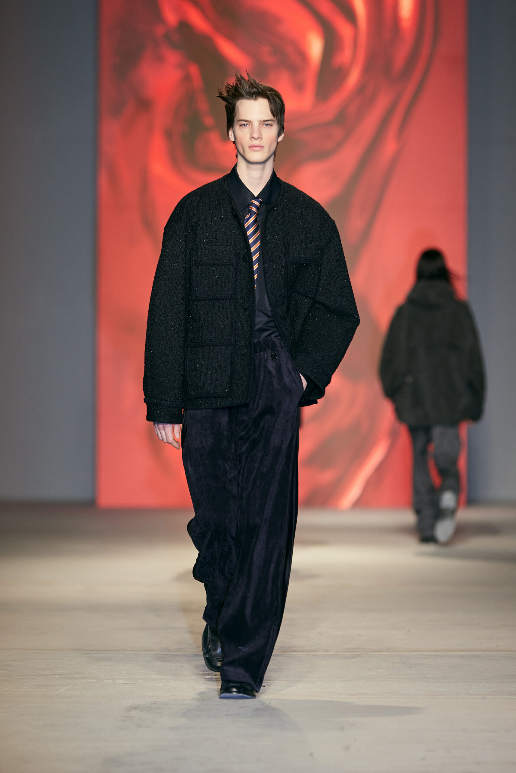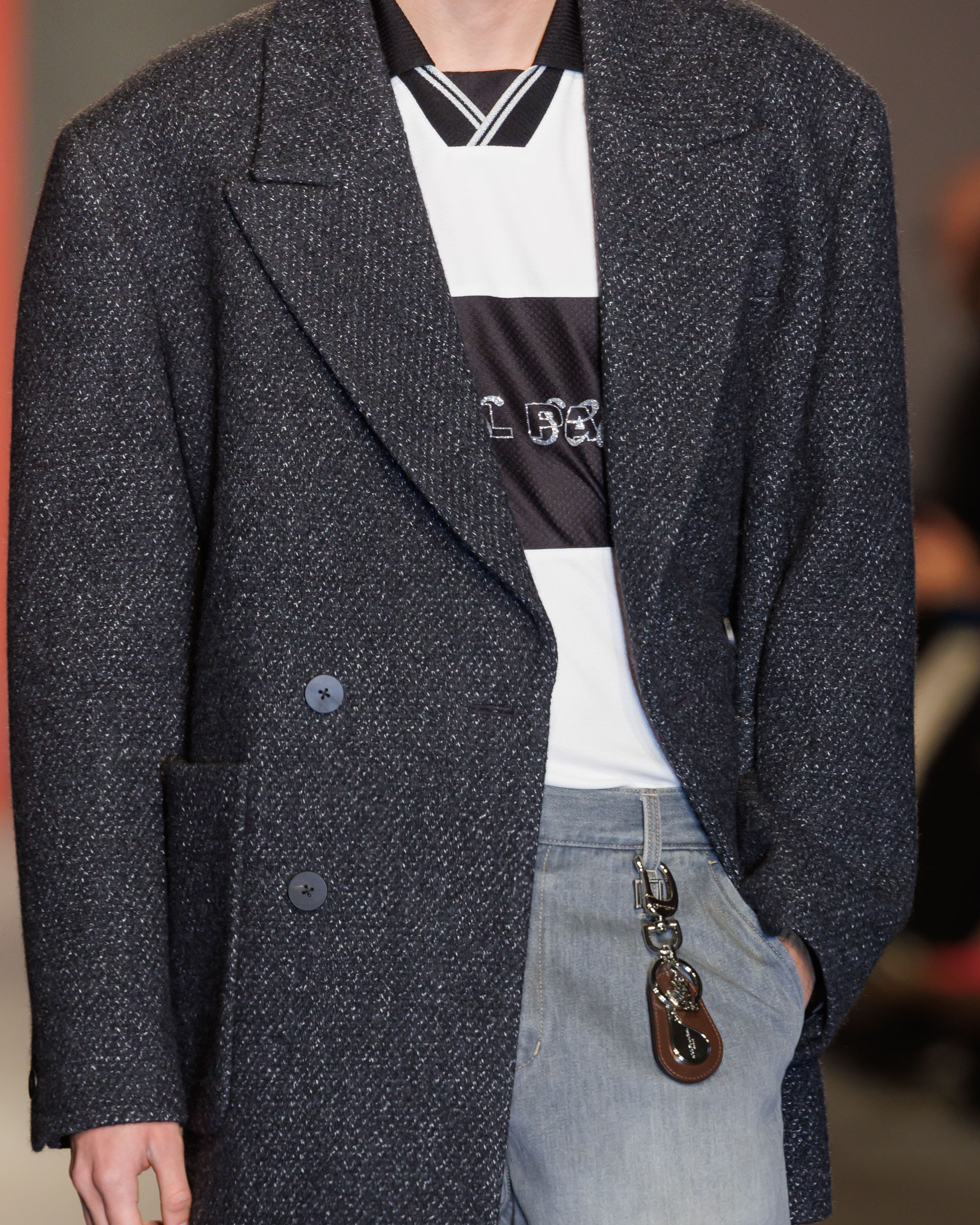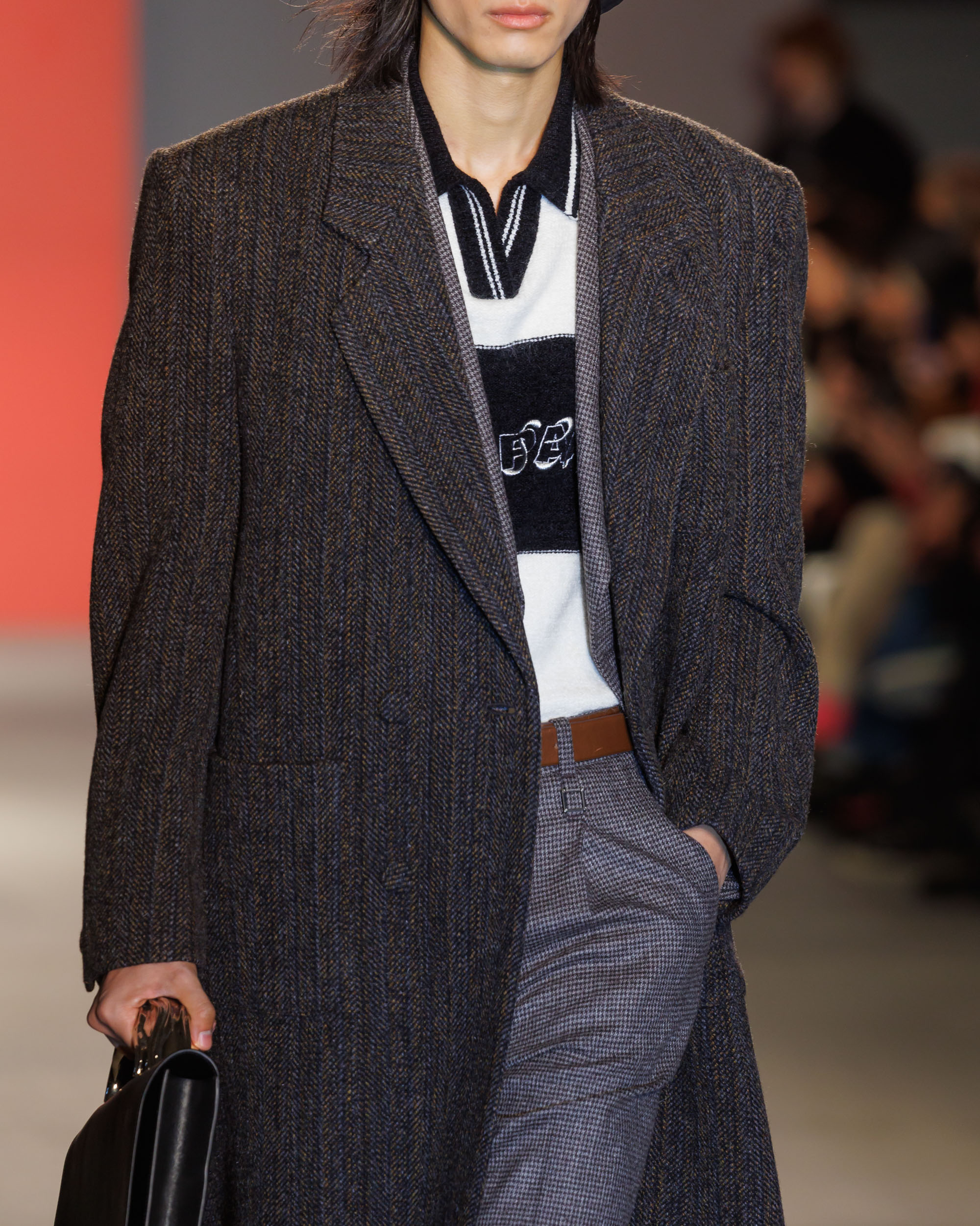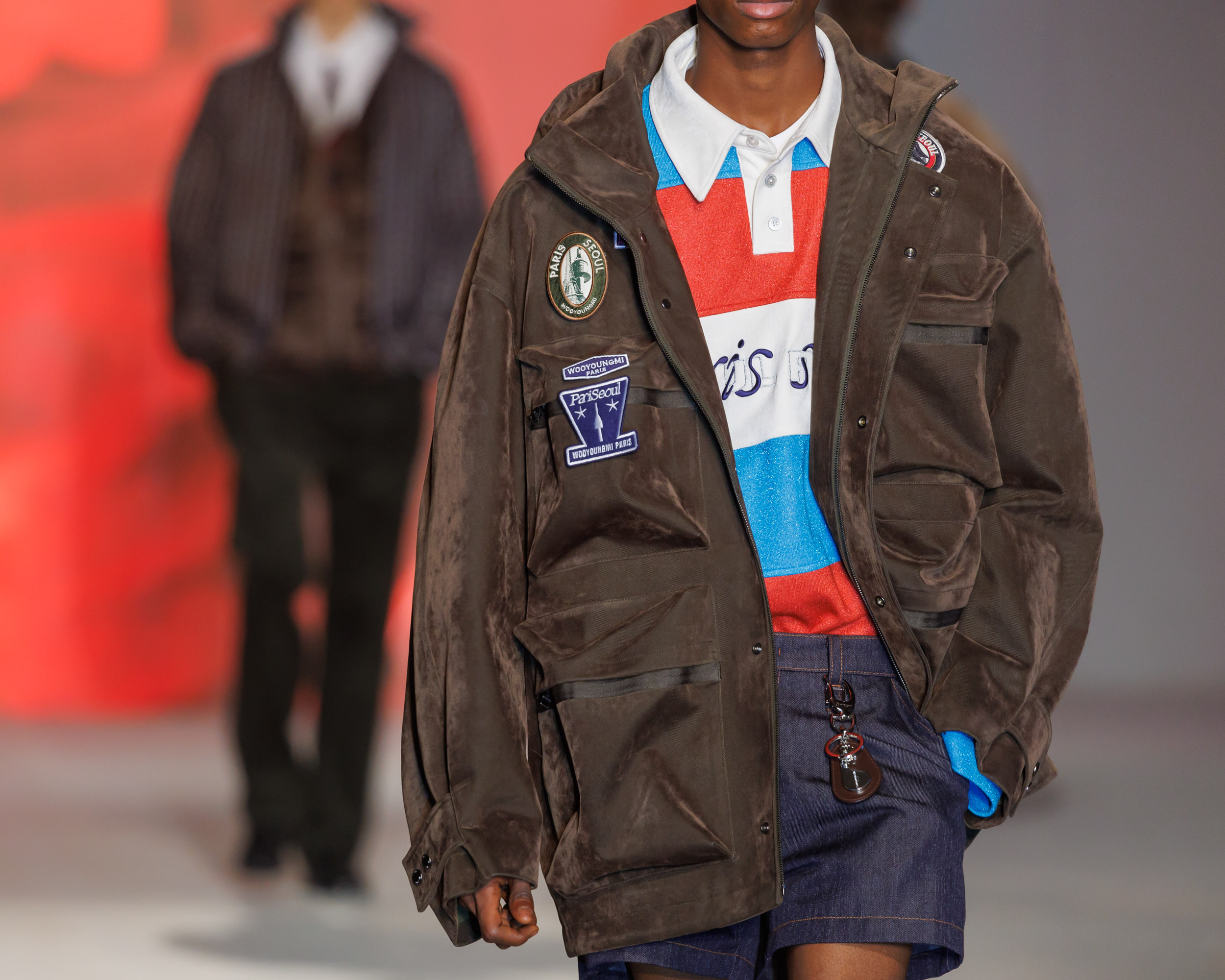 La collection rend hommage aux divers habitants de Séoul, des hommes d’affaires dans leurs manteaux allongés et costumes relax à la bourgeoisie en ensemble jupe-bouclé, sans oublier les écoliers et les scouts dans leur tenue préppy et sportswear. L’esthétique utilitaire des travailleurs de la route de Séoul se mêle aux codes de la culture jeune de la ville, créant un mélange unique qui reflète l’esprit de Séoul.