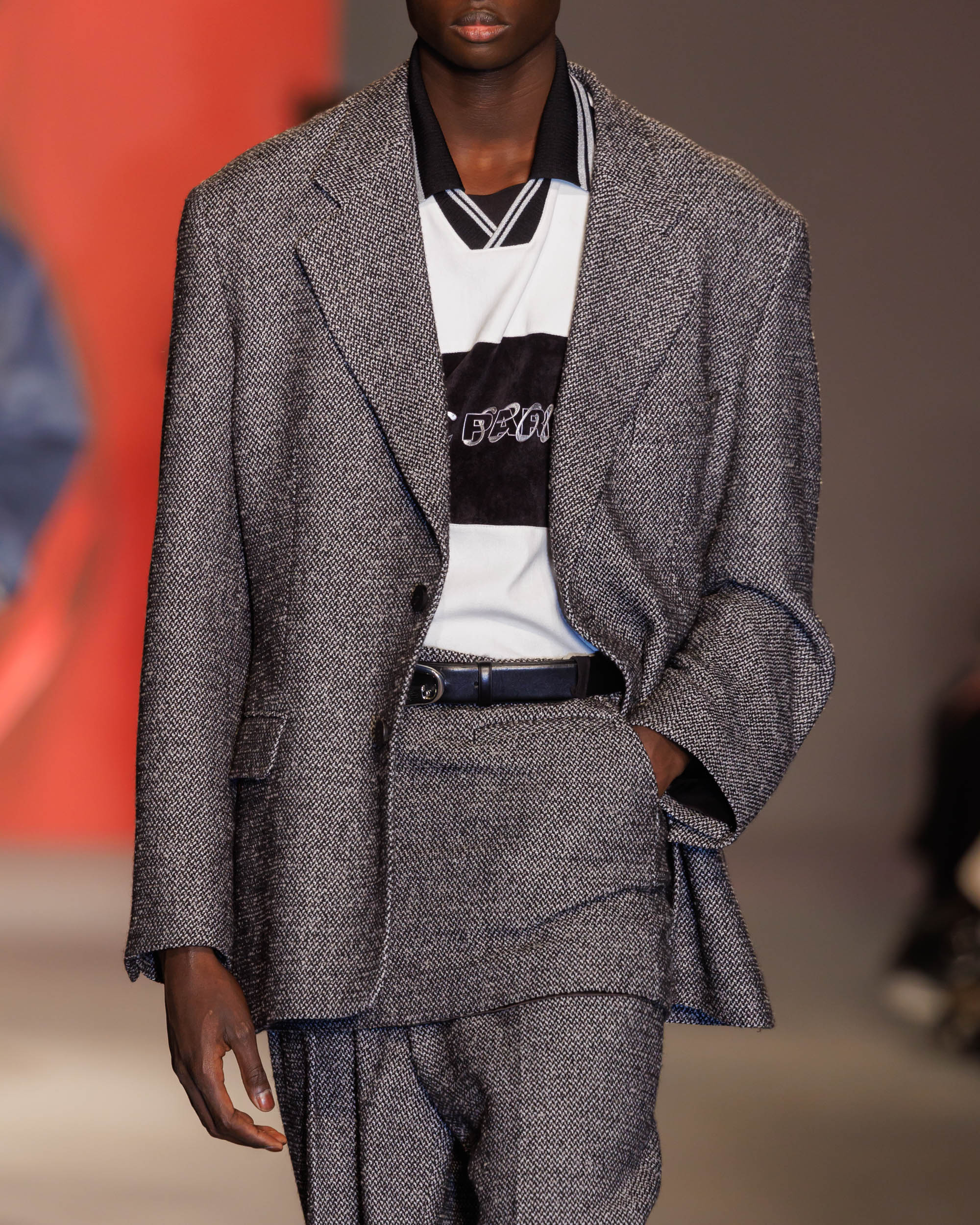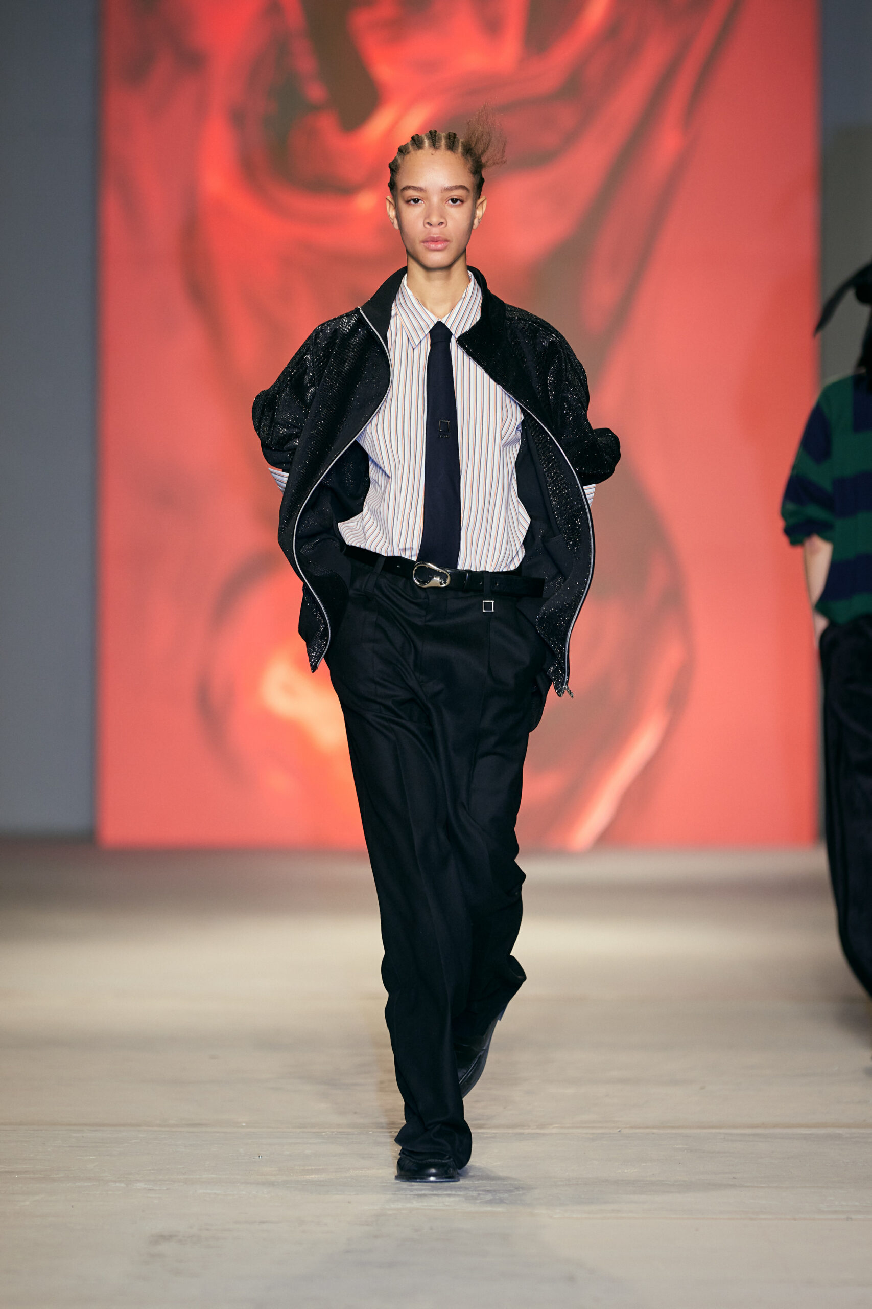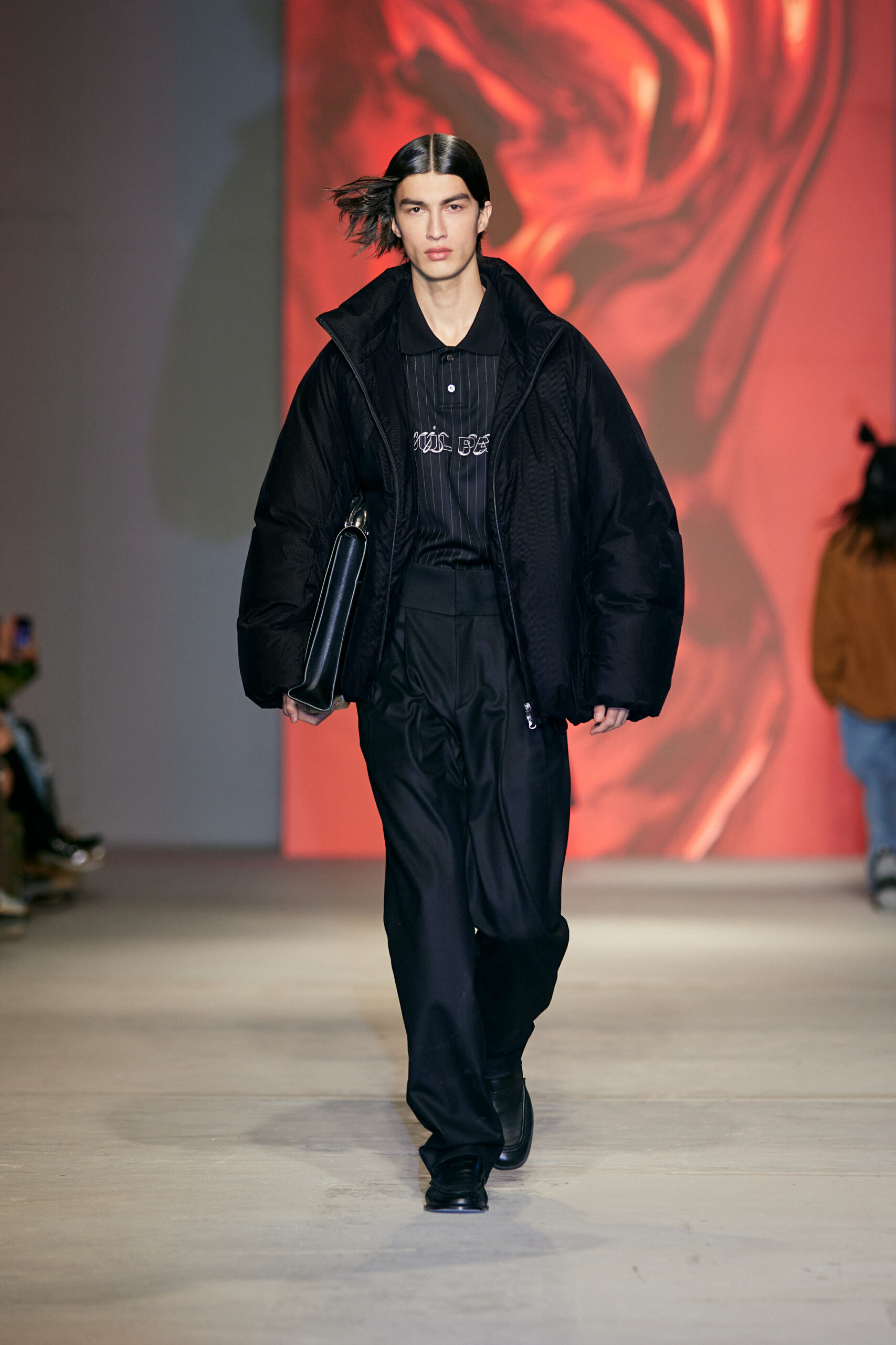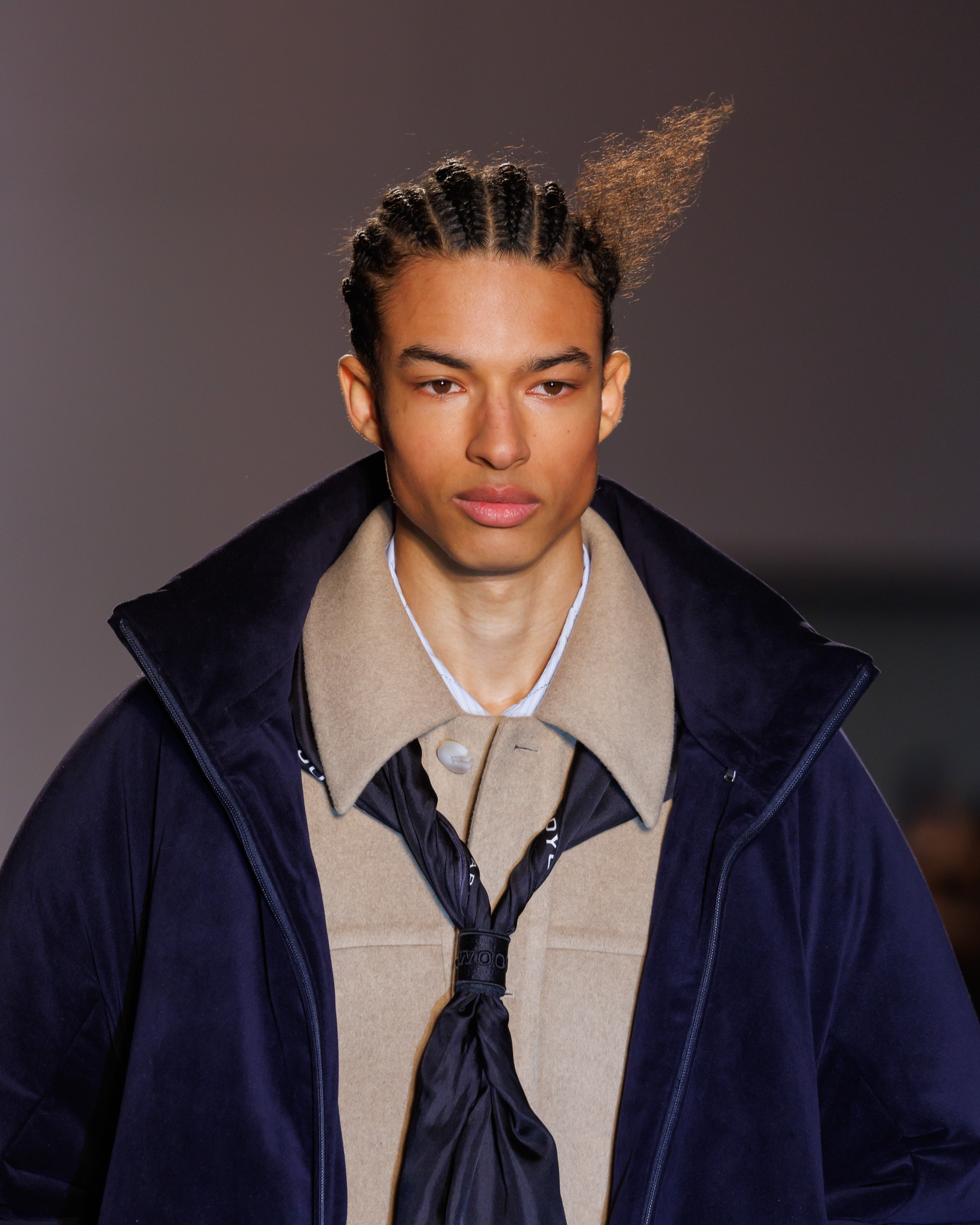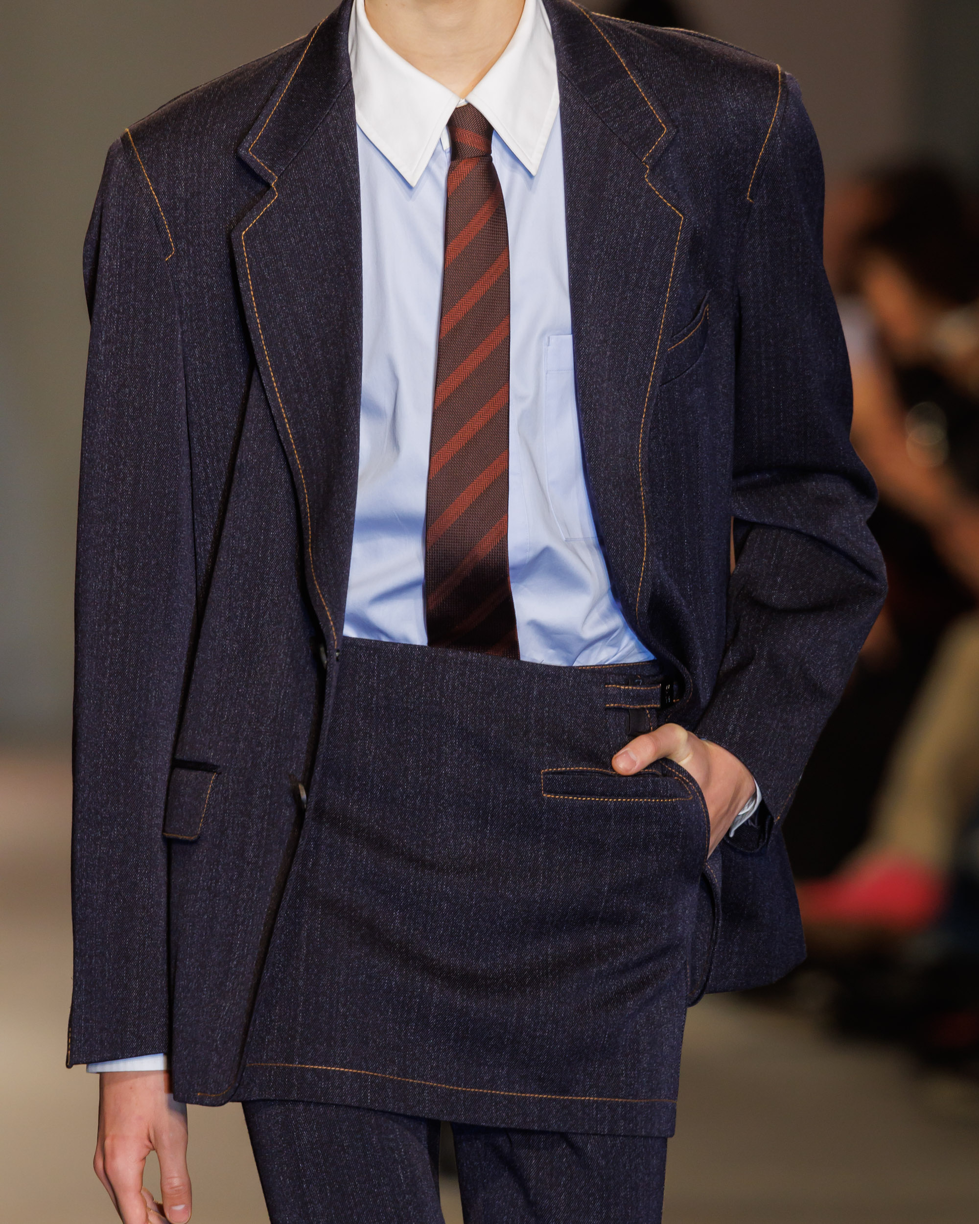 La collection rend hommage aux divers habitants de Séoul, des hommes d’affaires dans leurs manteaux allongés et costumes relax à la bourgeoisie en ensemble jupe-bouclé, sans oublier les écoliers et les scouts dans leur tenue préppy et sportswear. L’esthétique utilitaire des travailleurs de la route de Séoul se mêle aux codes de la culture jeune de la ville, créant un mélange unique qui reflète l’esprit de Séoul.