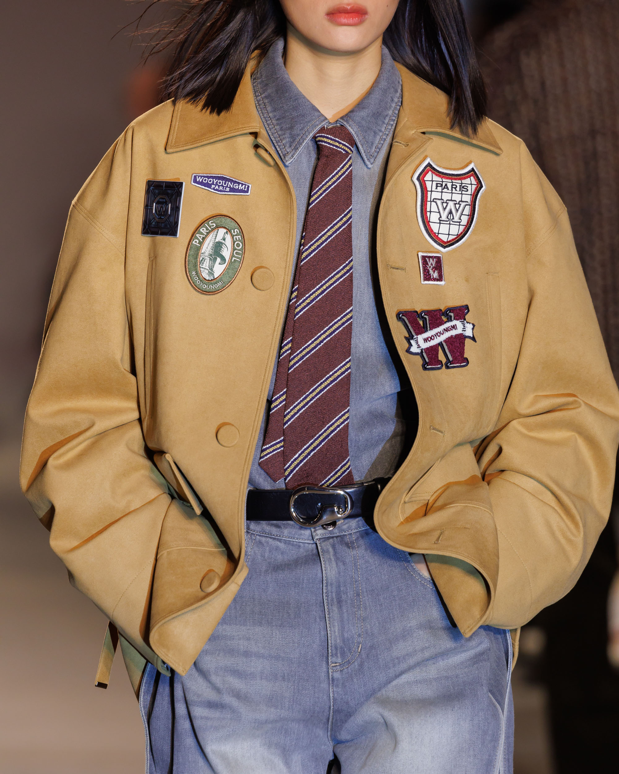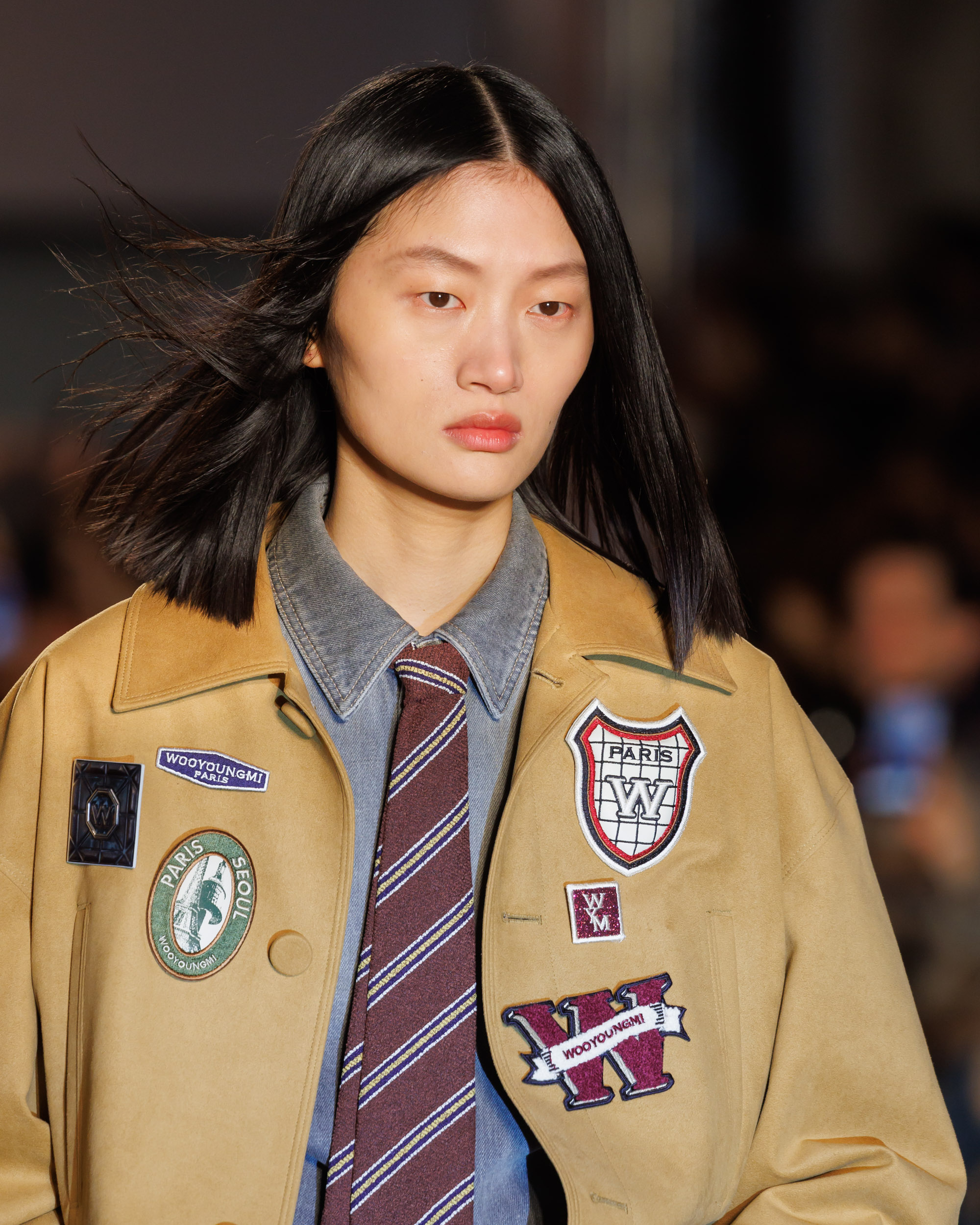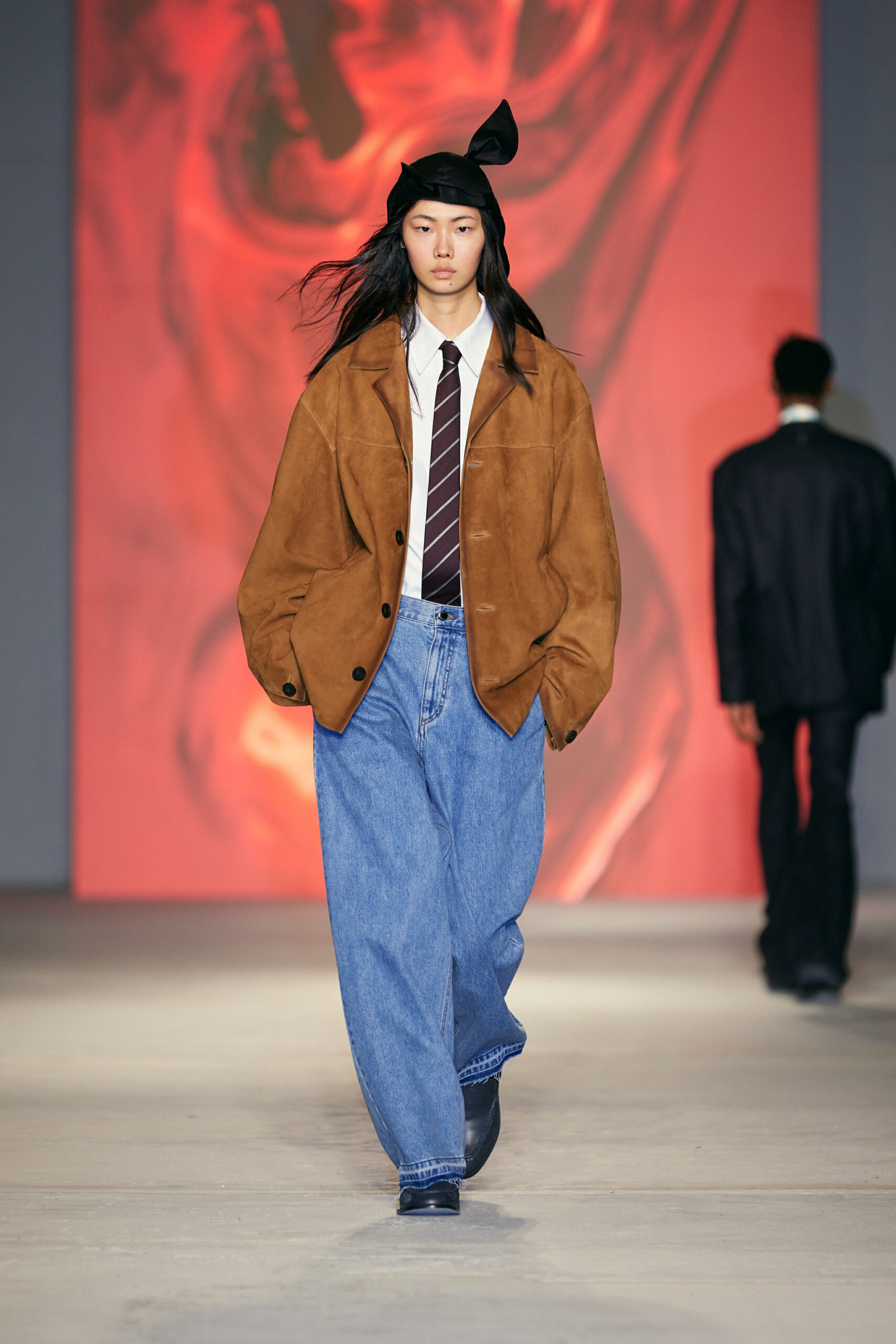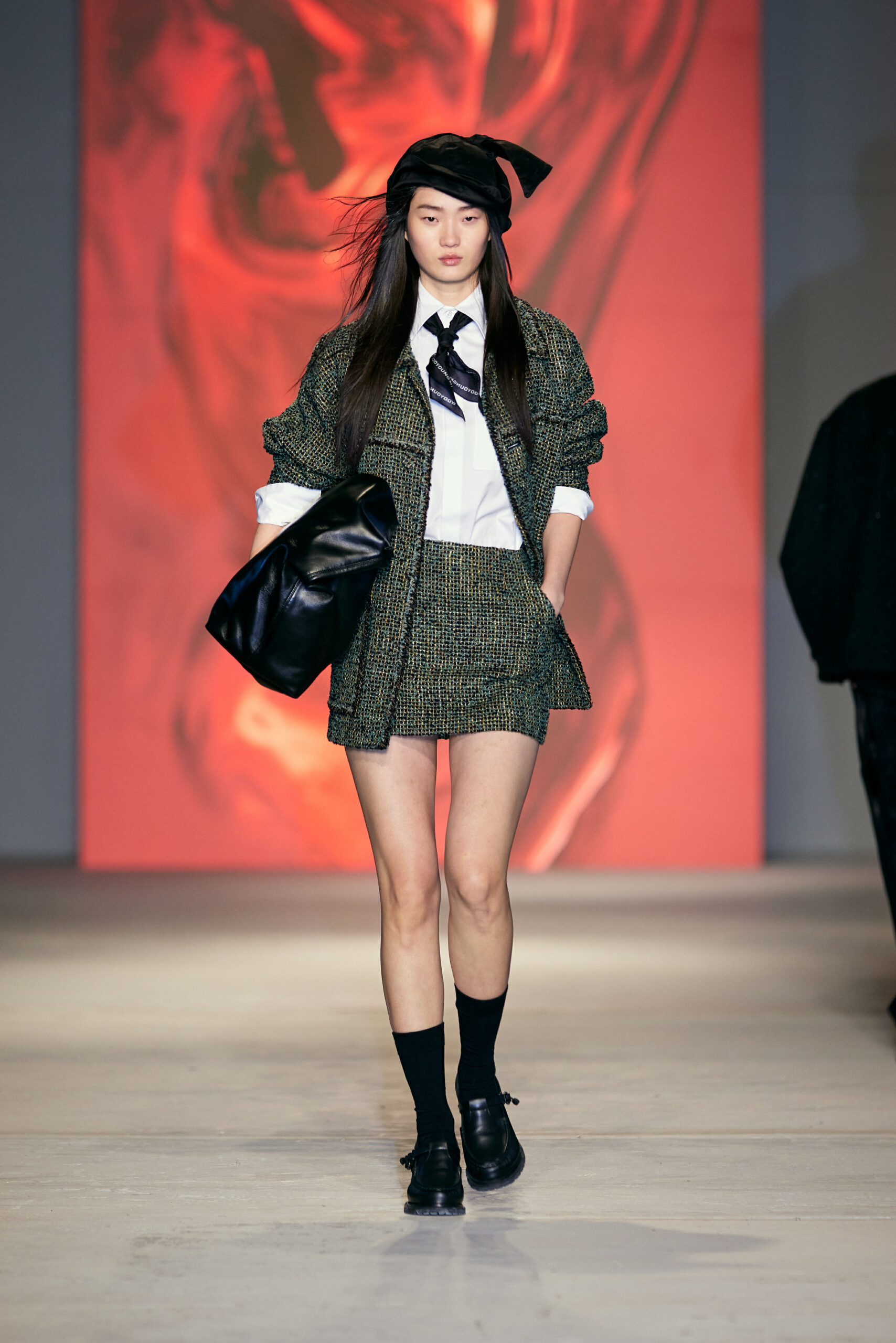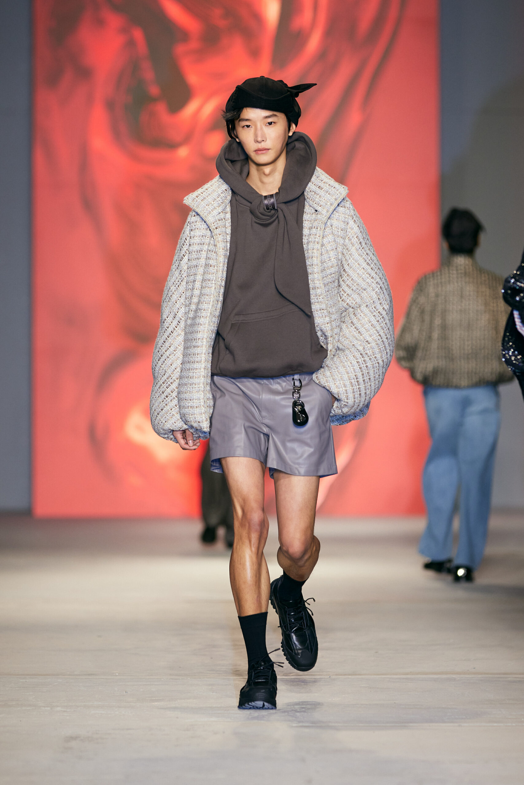 Les nuances automnales de la collection s’inspirent des couleurs naturelles de Séoul, éclairées par des imprimés chaotiques de la ville et des éclats de paillettes sur le sportswear et le denim. Les accessoires, comme les bijoux sculptés en forme d’oreilles, rendent hommage à la philosophie bouddhiste, symbolisant la sagesse et la compassion.