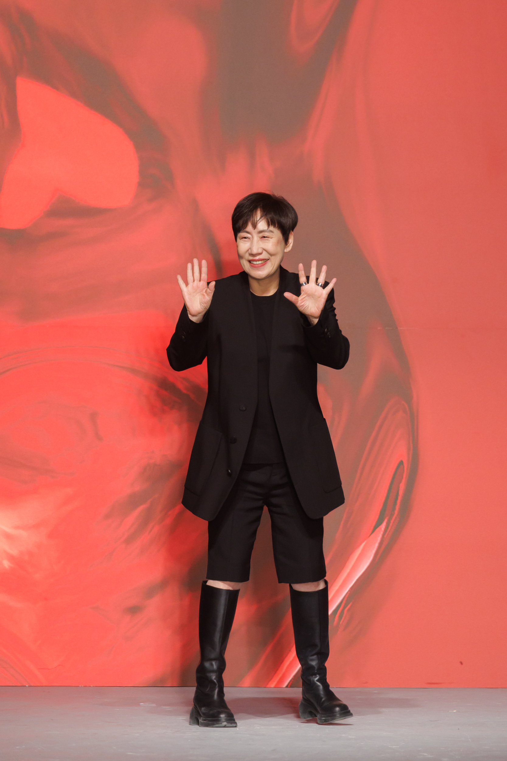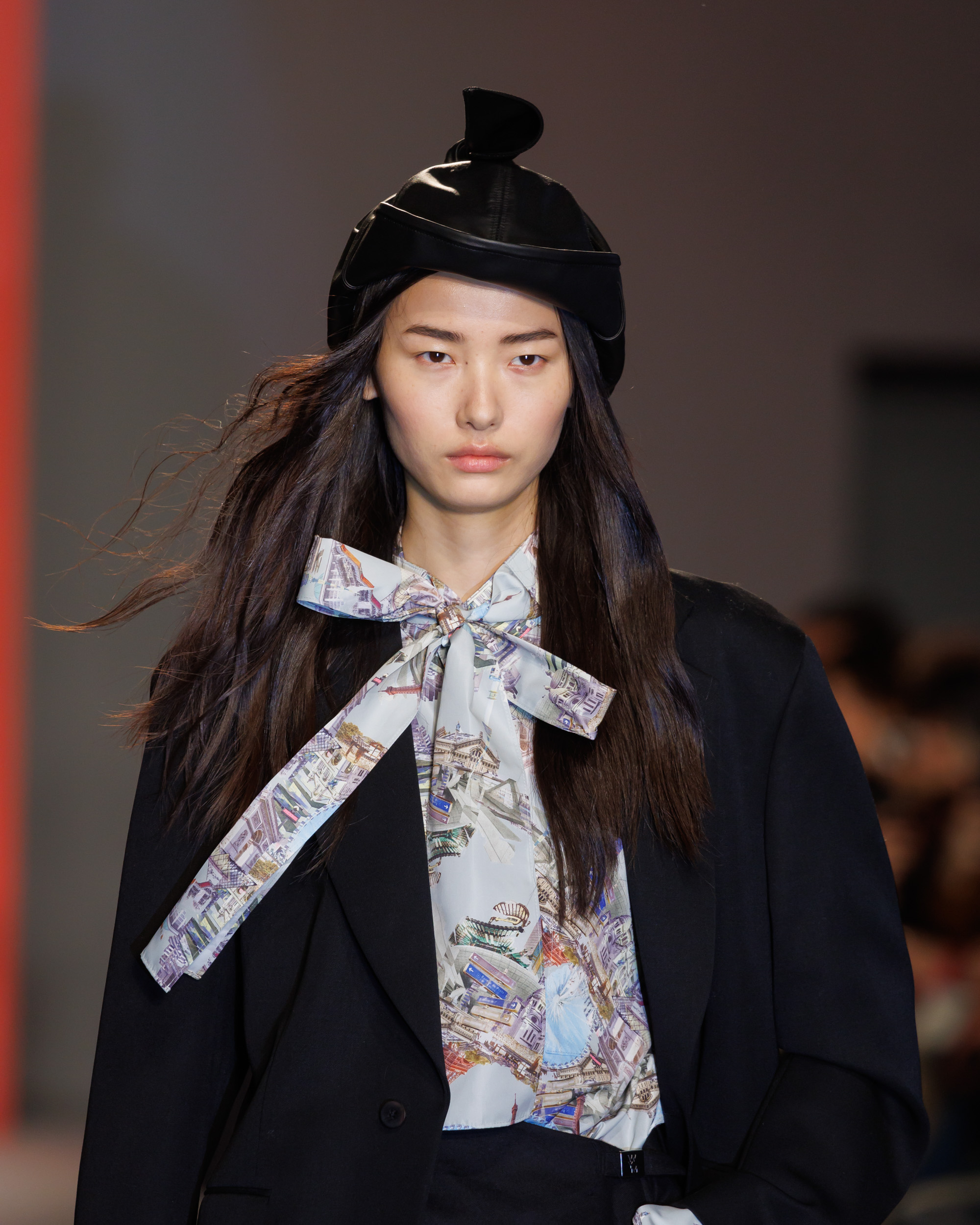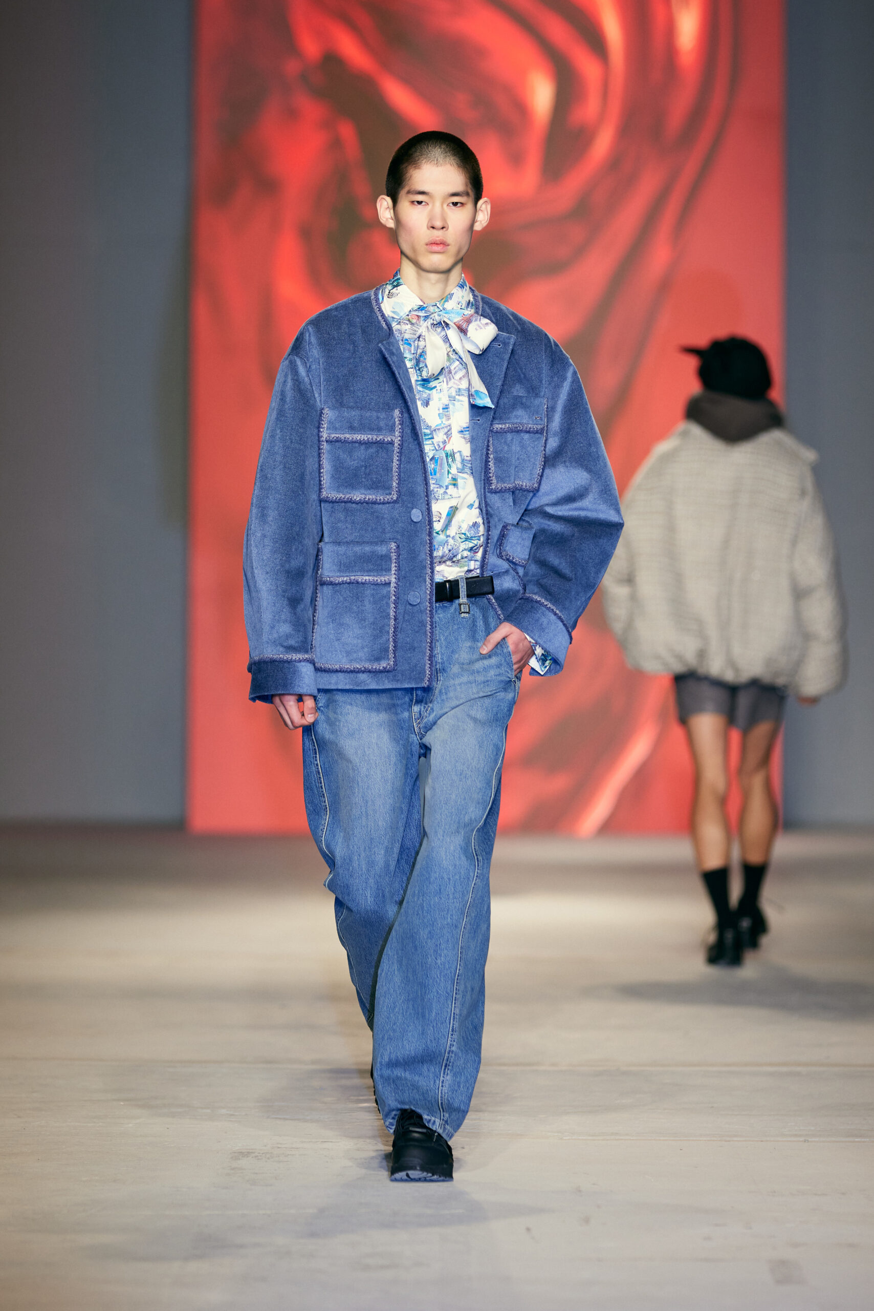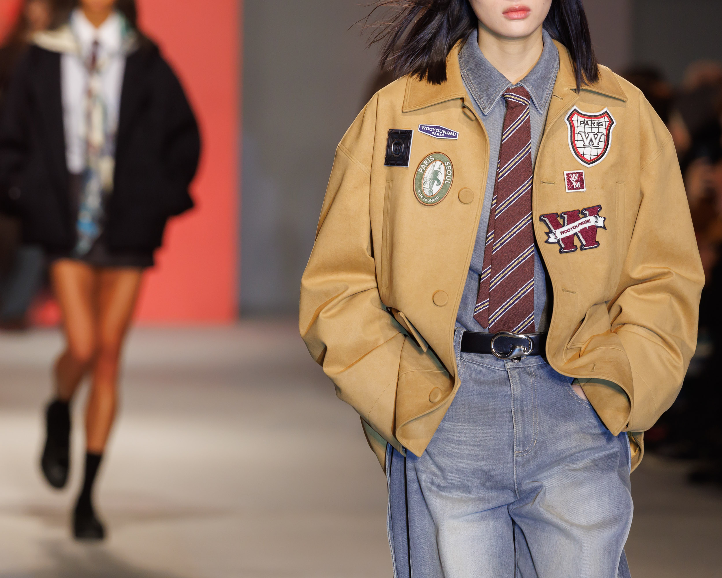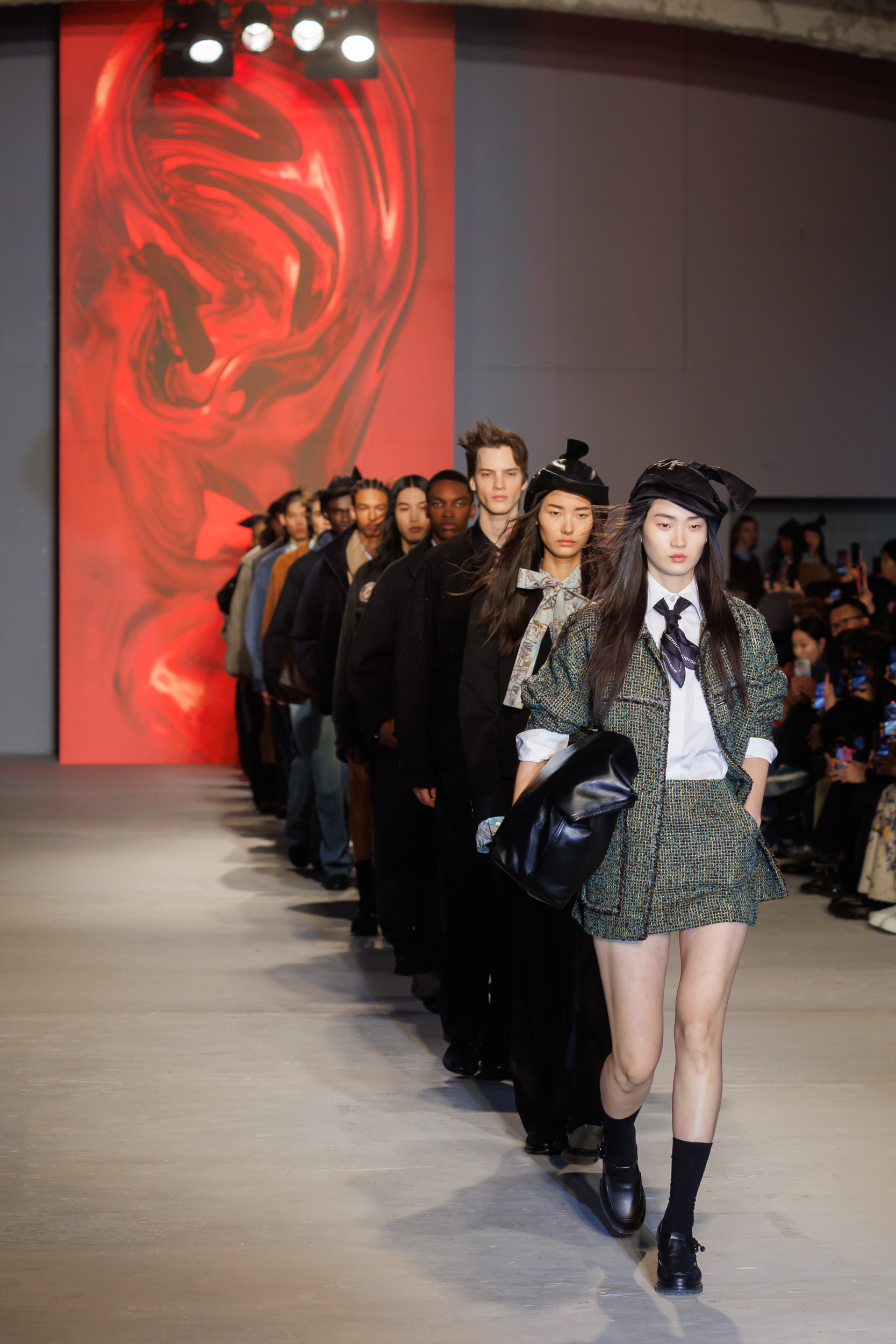 Les nuances automnales de la collection s’inspirent des couleurs naturelles de Séoul, éclairées par des imprimés chaotiques de la ville et des éclats de paillettes sur le sportswear et le denim. Les accessoires, comme les bijoux sculptés en forme d’oreilles, rendent hommage à la philosophie bouddhiste, symbolisant la sagesse et la compassion.