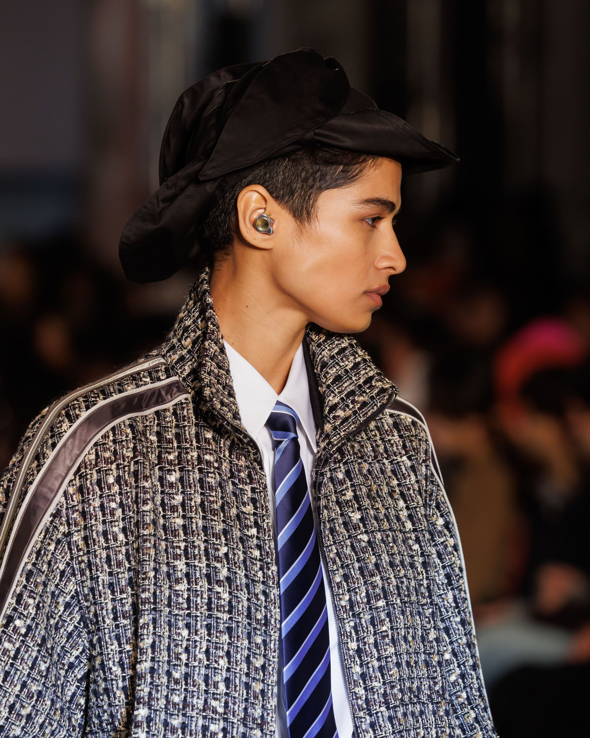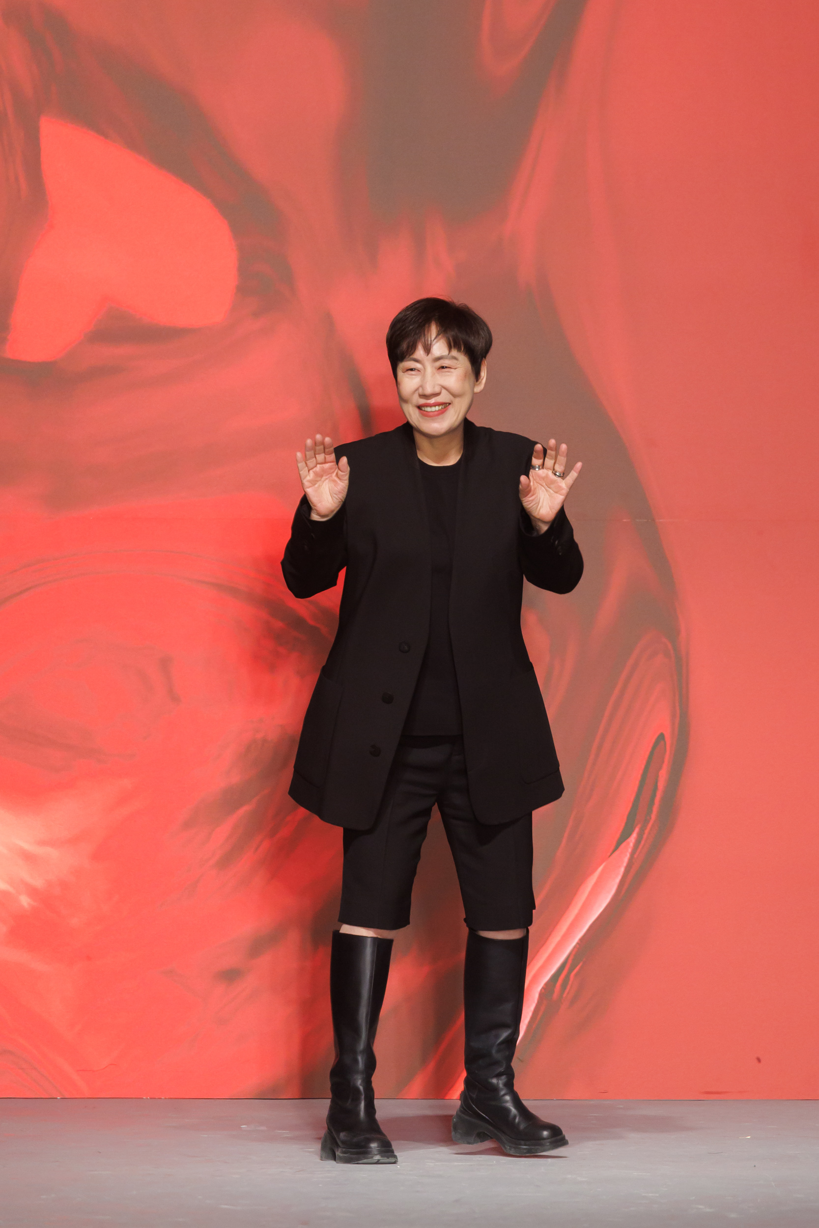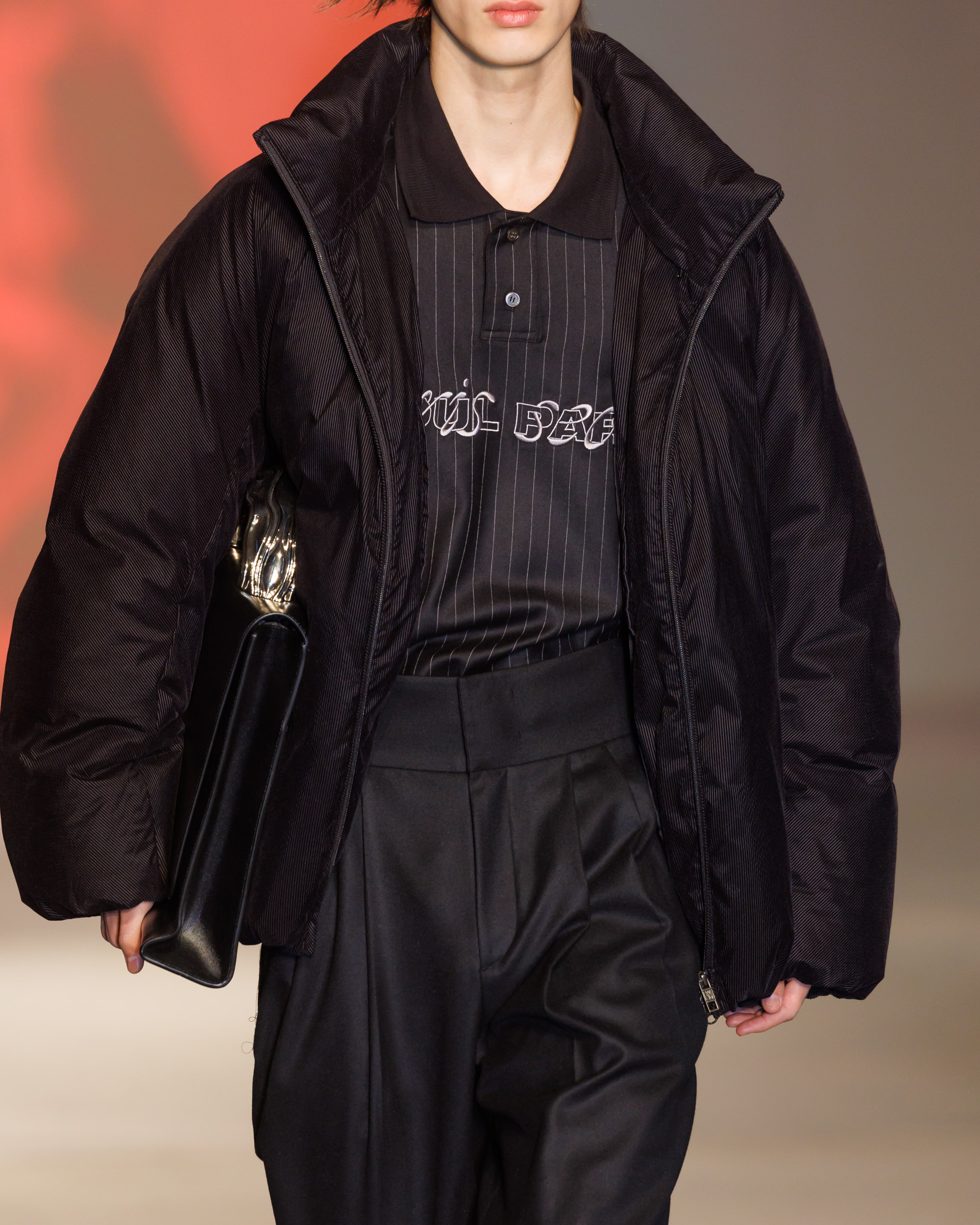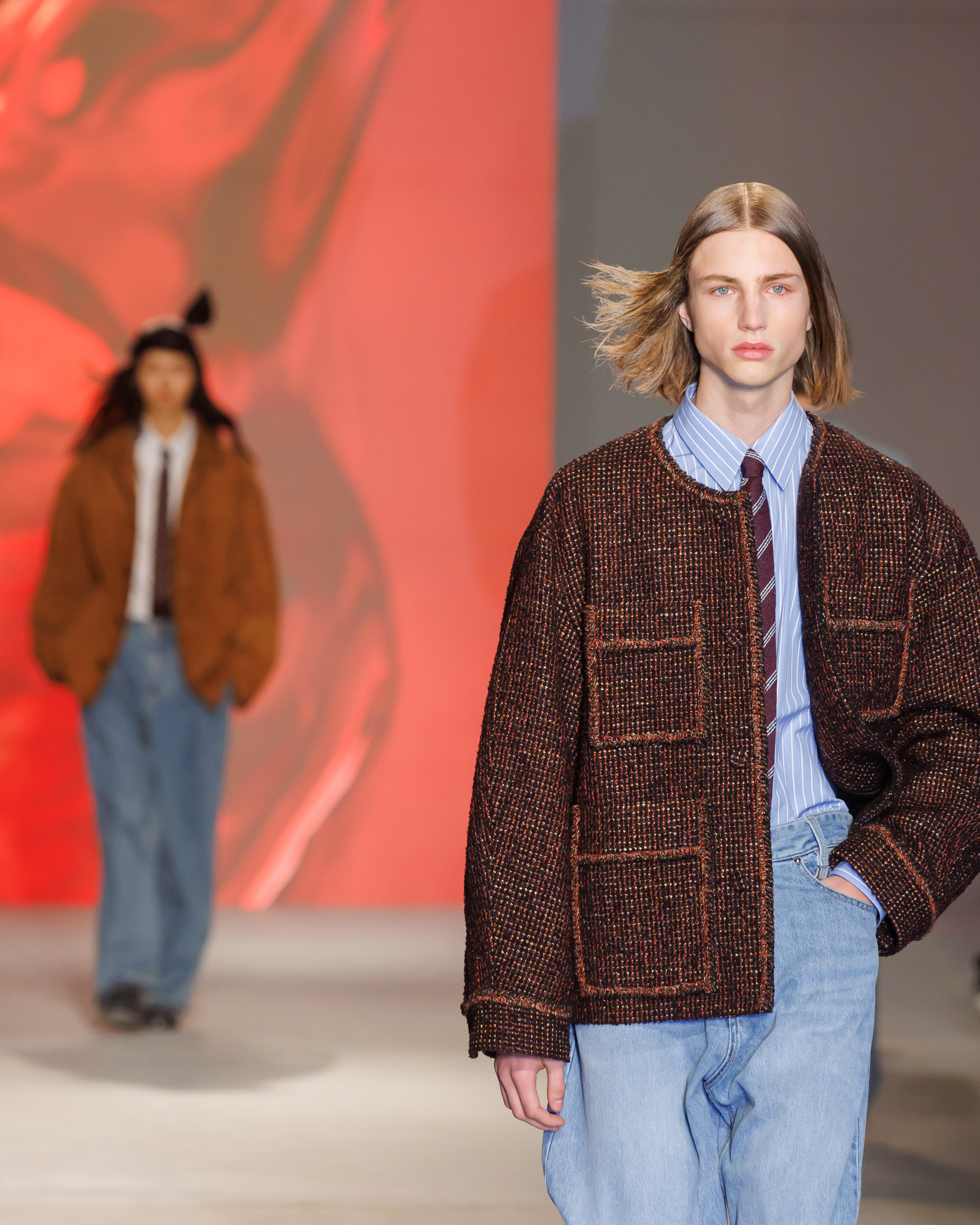 Les nuances automnales de la collection s’inspirent des couleurs naturelles de Séoul, éclairées par des imprimés chaotiques de la ville et des éclats de paillettes sur le sportswear et le denim. Les accessoires, comme les bijoux sculptés en forme d’oreilles, rendent hommage à la philosophie bouddhiste, symbolisant la sagesse et la compassion.