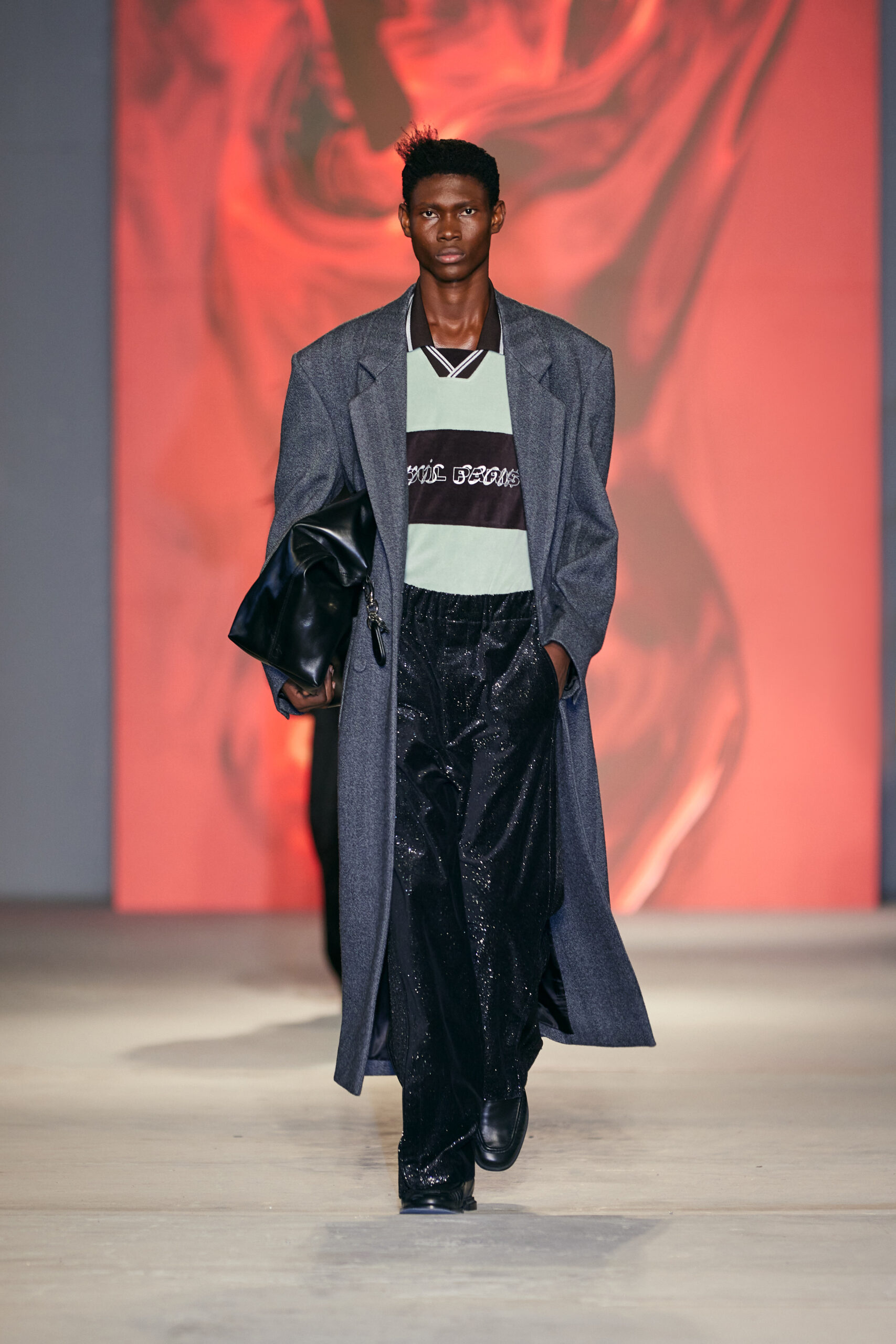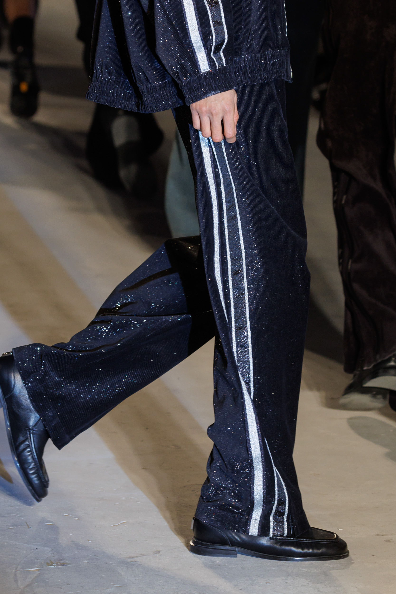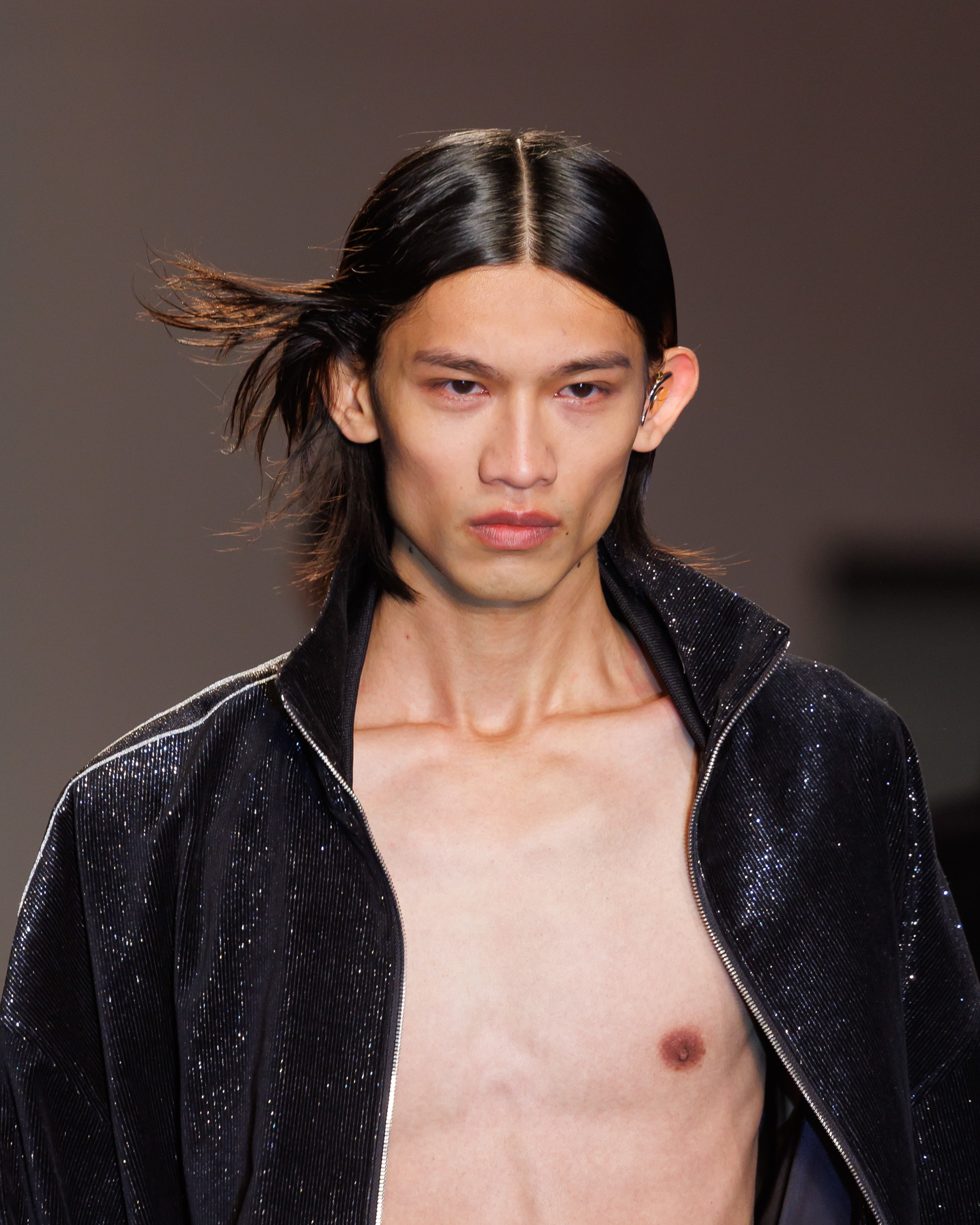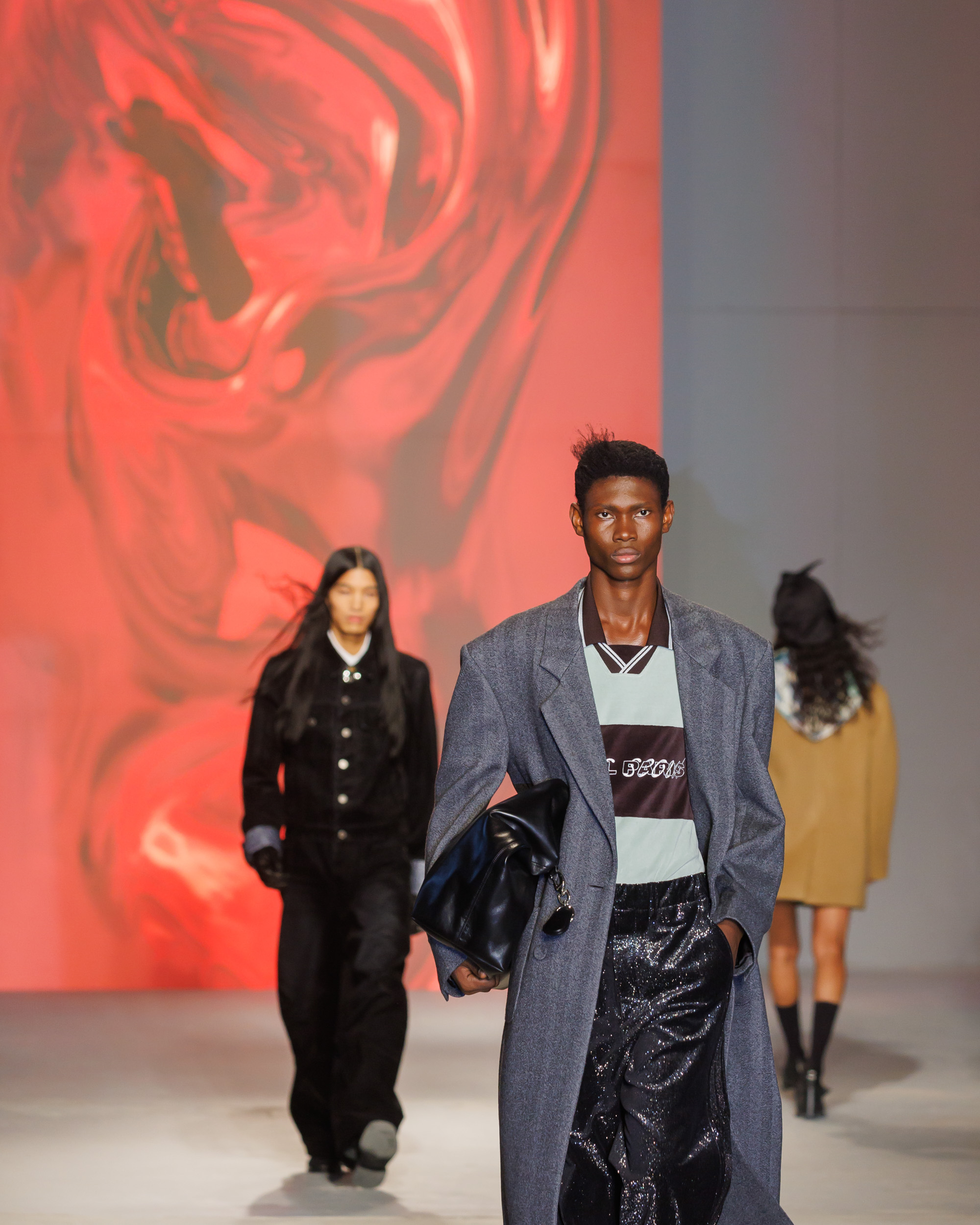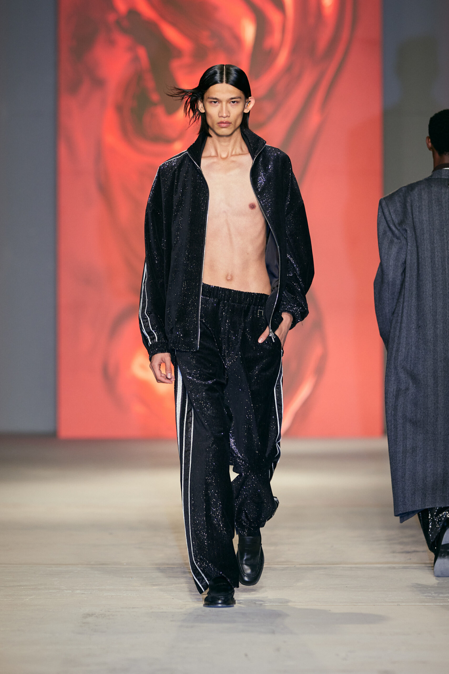 Les nuances automnales de la collection s’inspirent des couleurs naturelles de Séoul, éclairées par des imprimés chaotiques de la ville et des éclats de paillettes sur le sportswear et le denim. Les accessoires, comme les bijoux sculptés en forme d’oreilles, rendent hommage à la philosophie bouddhiste, symbolisant la sagesse et la compassion.