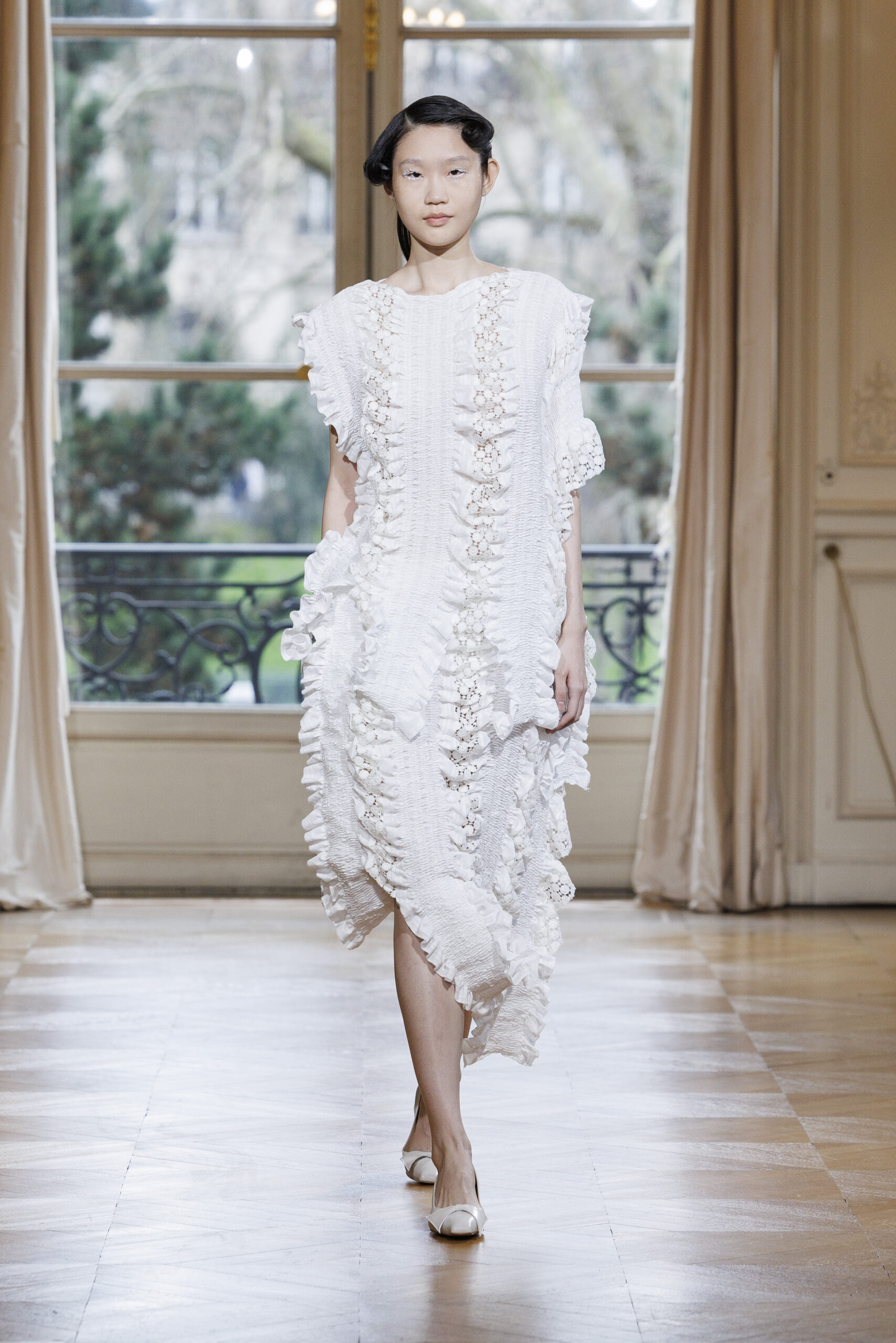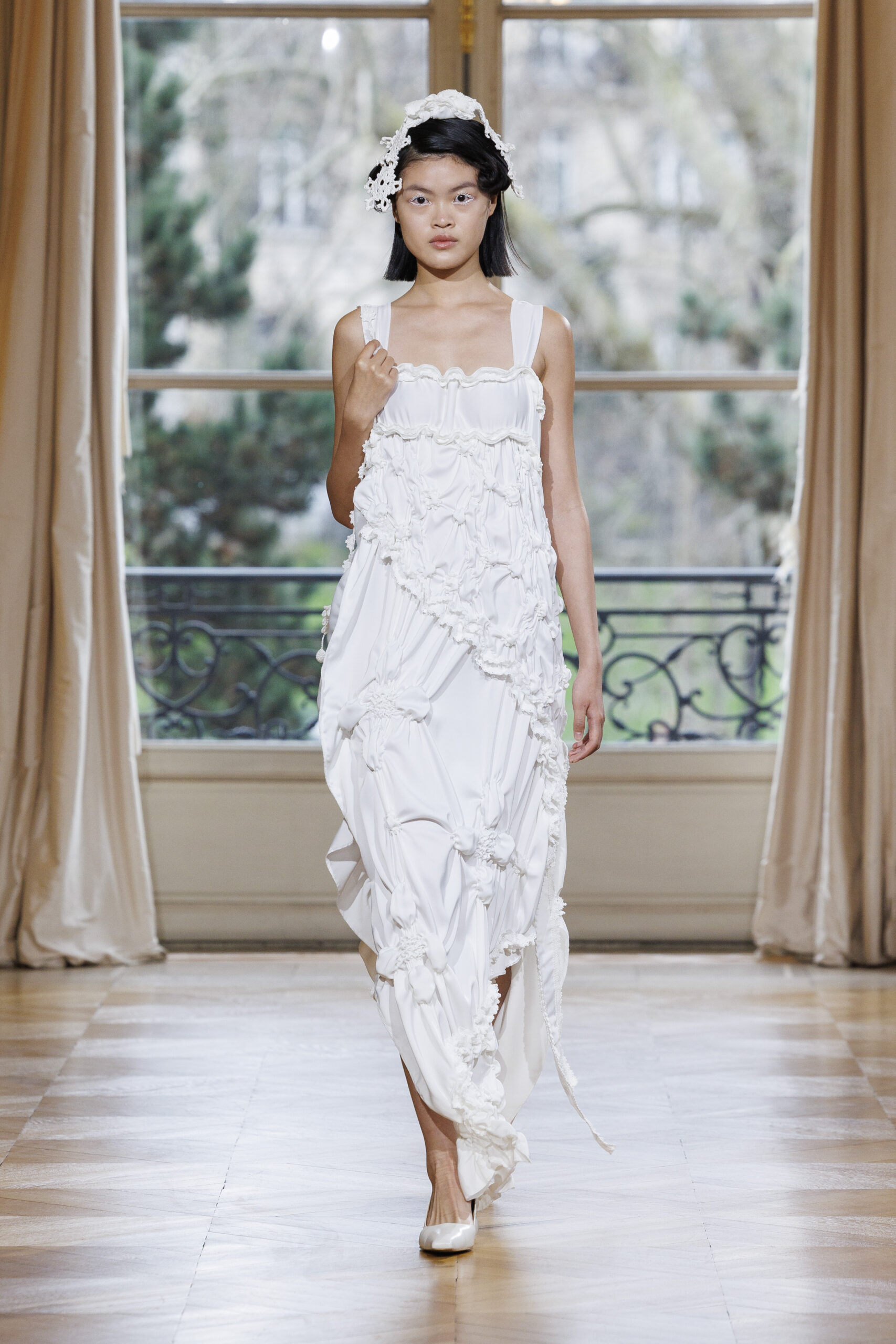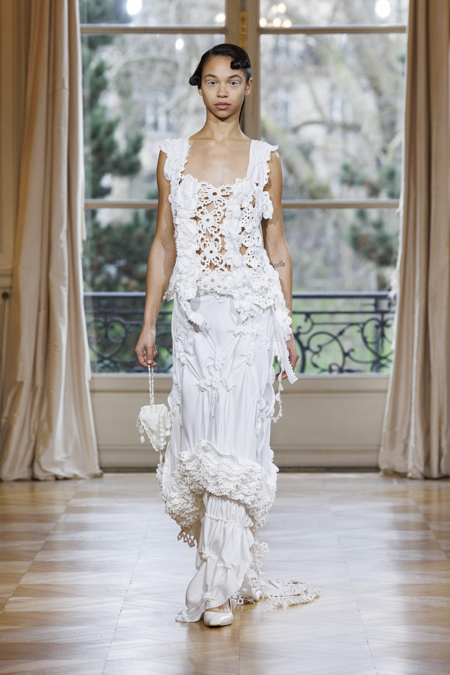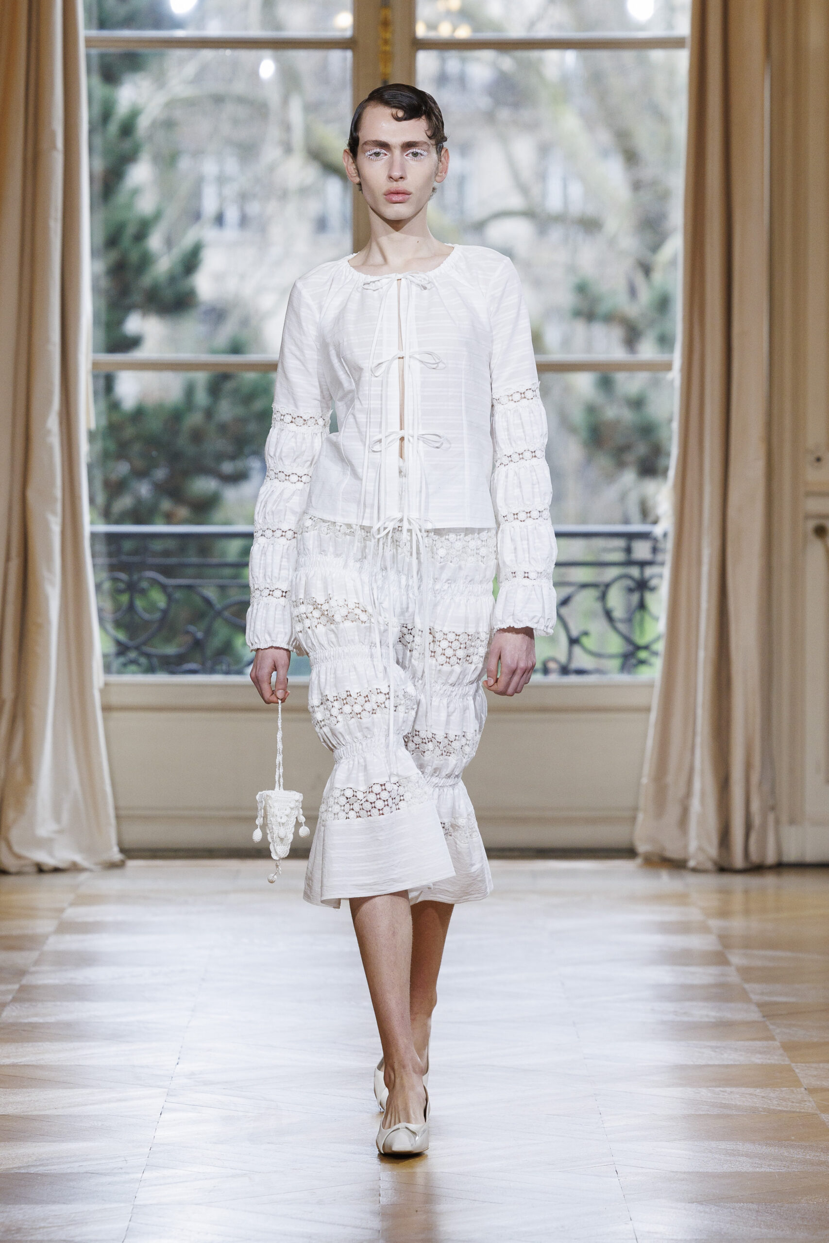 Róisín Pierce continue de prouver son engagement envers l’artisanat avec des techniques innovantes mêlant smock et crochet, ainsi que l’évolution du crochet à main irlandais. La collection intègre des matériaux durables, tels que du coton de fin de série, de l’organza recyclé, et de la dentelle crochetée irlandaise, soulignant son approche responsable de la mode.