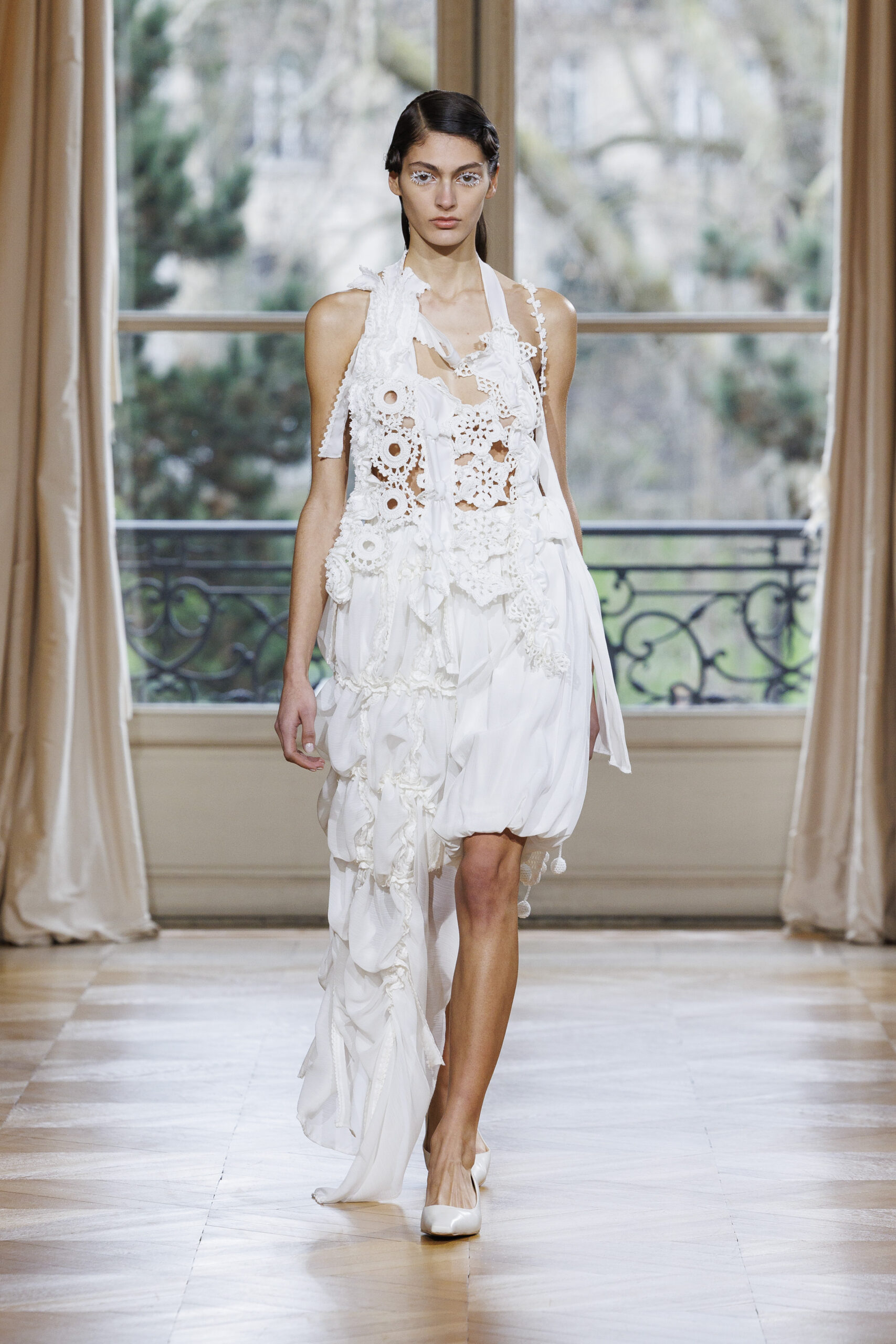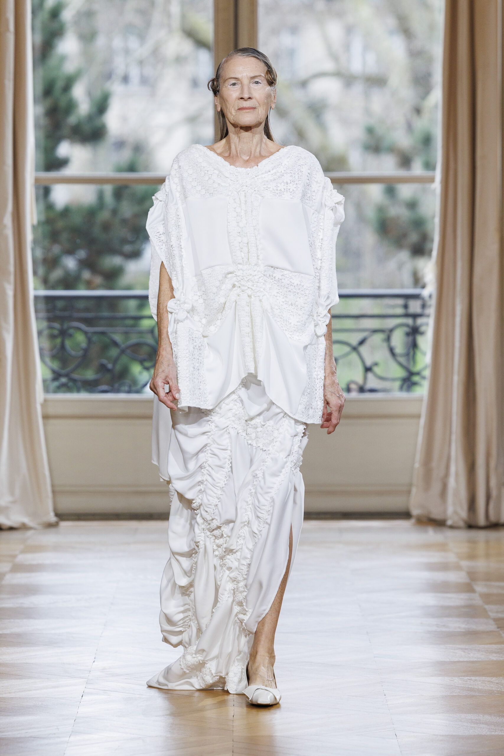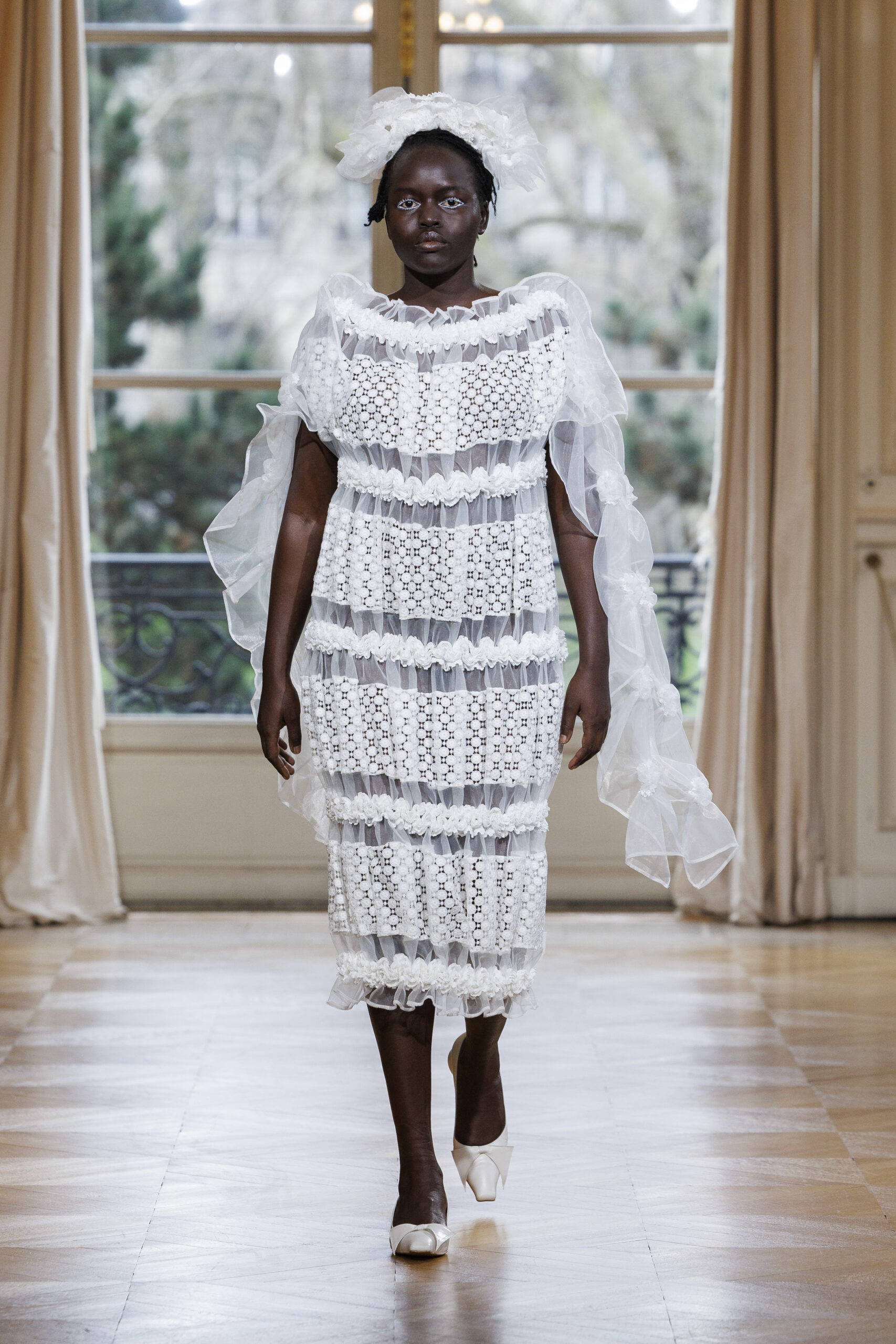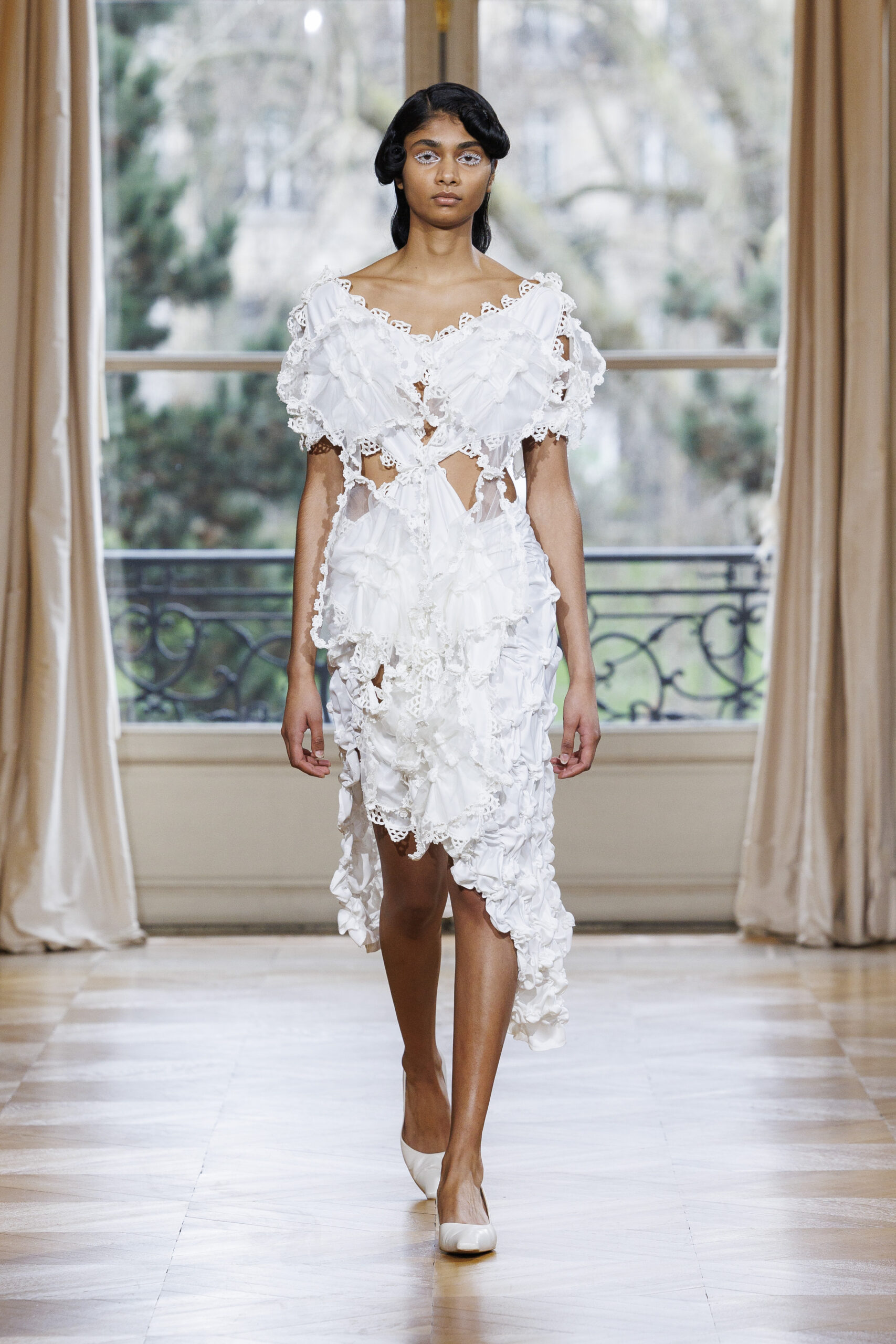 Róisín Pierce continue de prouver son engagement envers l’artisanat avec des techniques innovantes mêlant smock et crochet, ainsi que l’évolution du crochet à main irlandais. La collection intègre des matériaux durables, tels que du coton de fin de série, de l’organza recyclé, et de la dentelle crochetée irlandaise, soulignant son approche responsable de la mode.