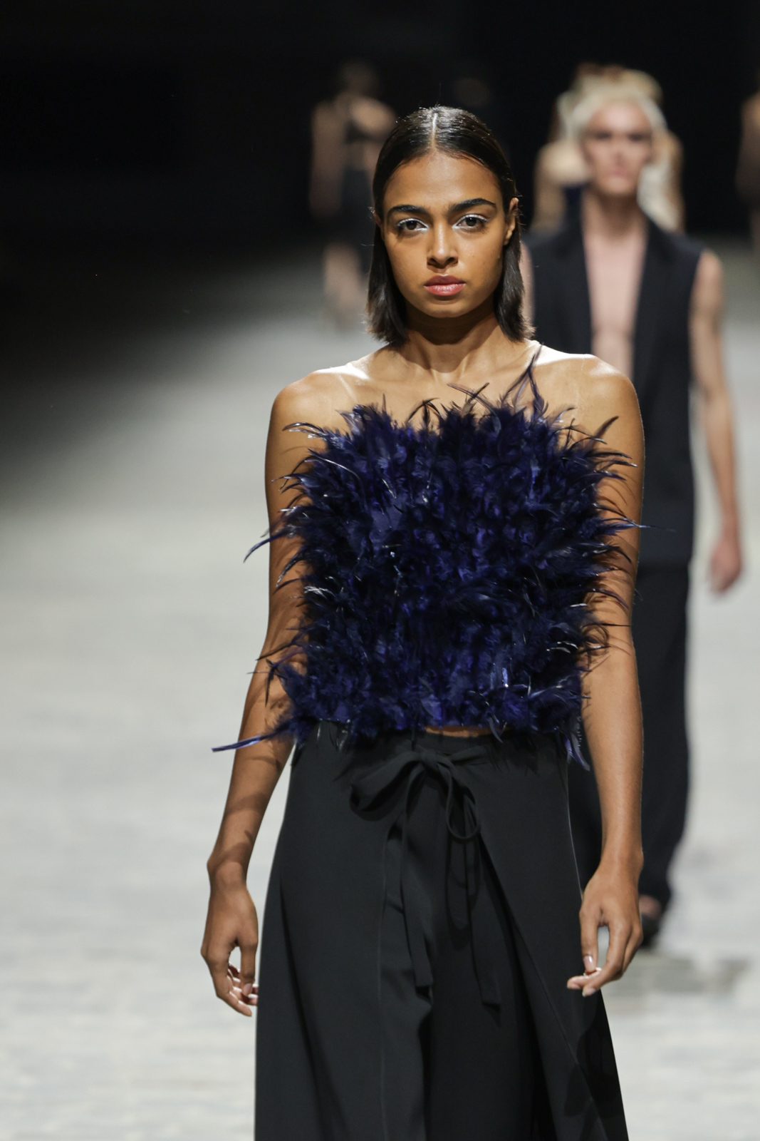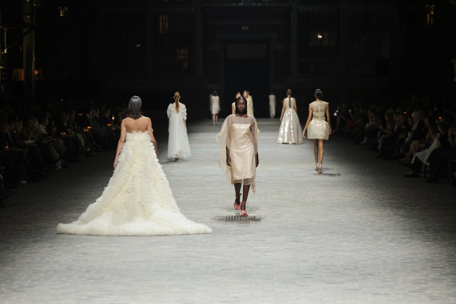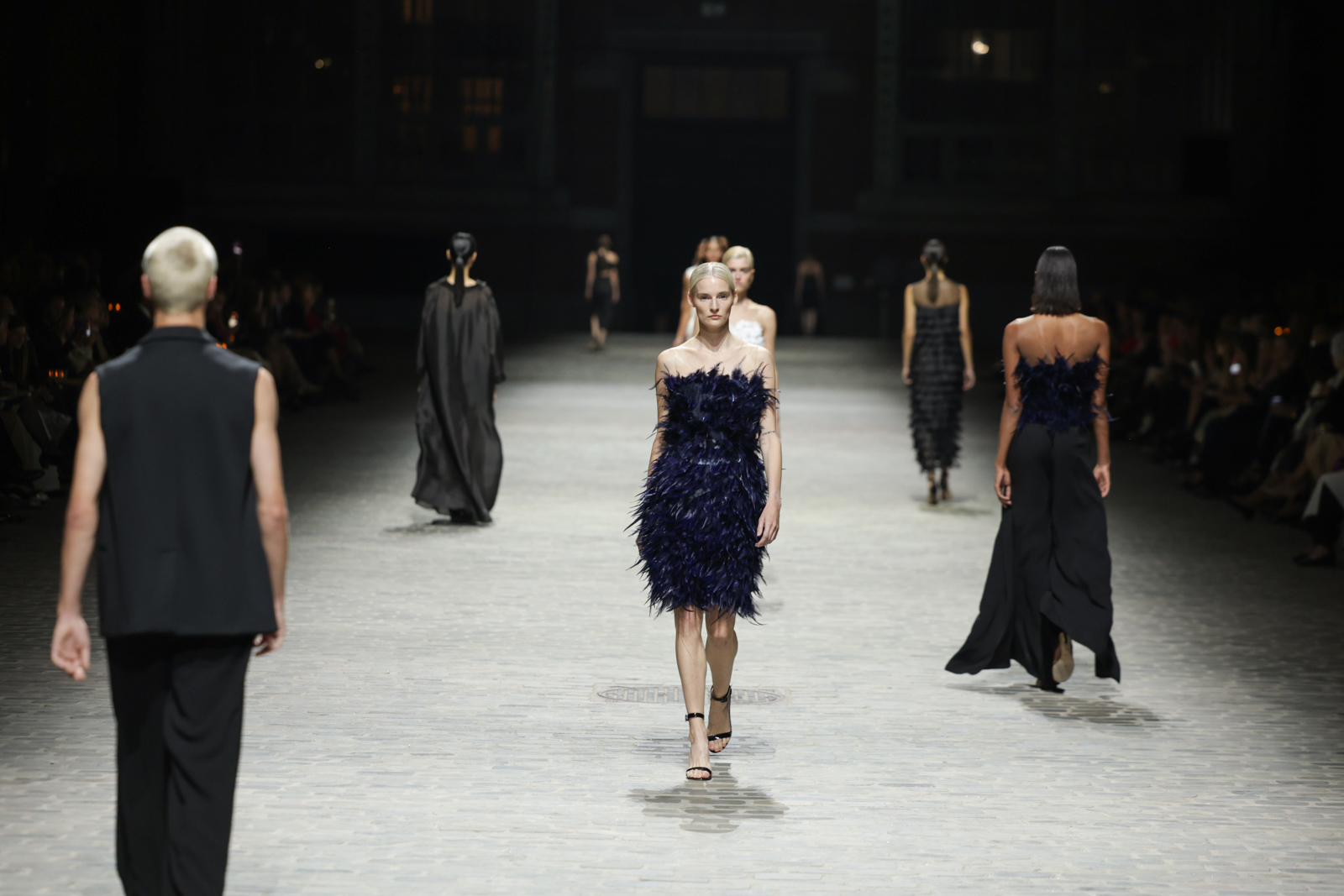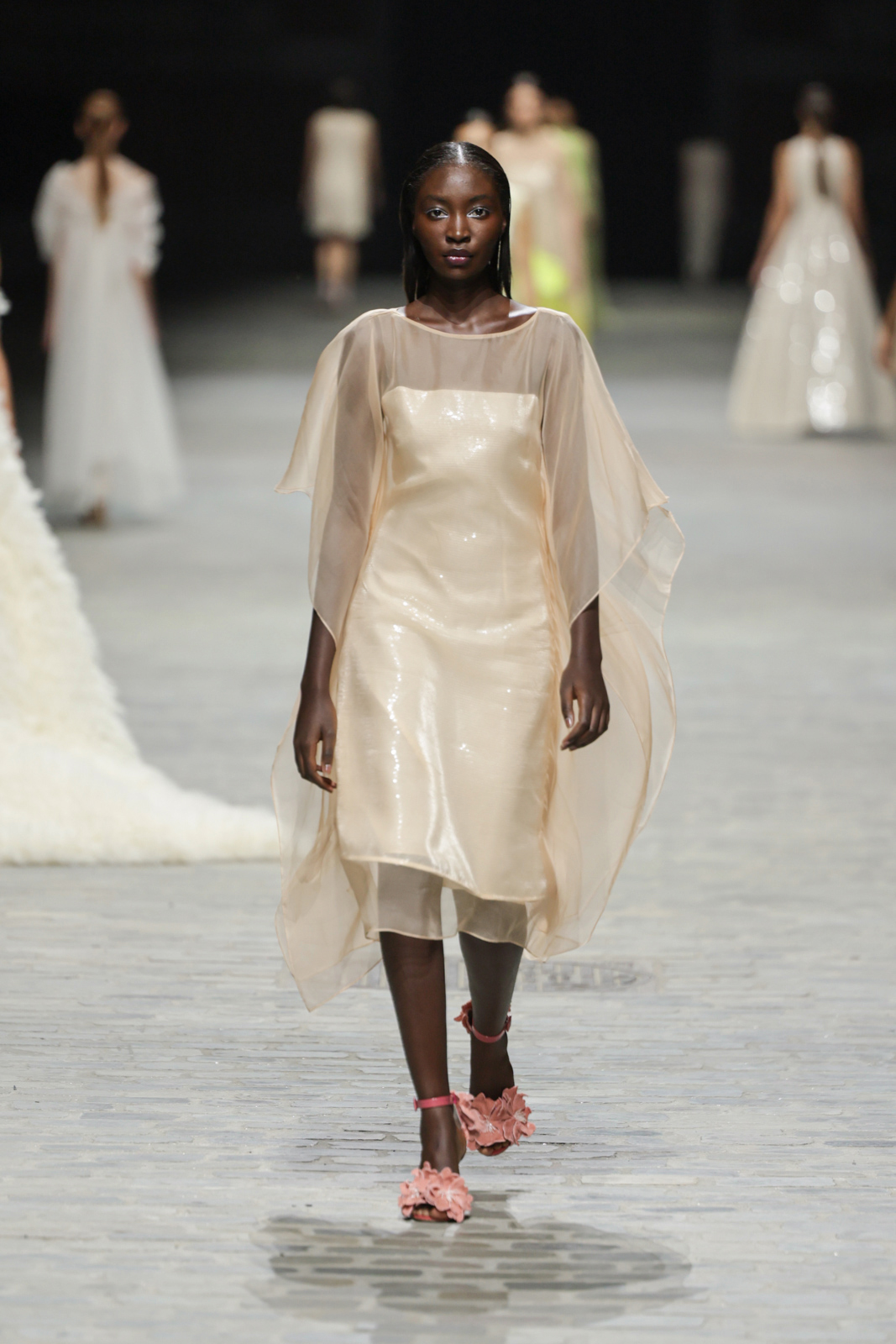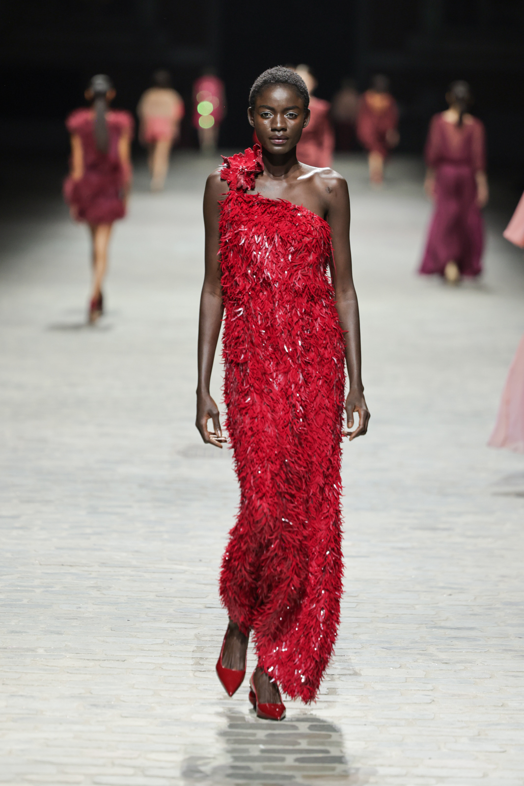 L’attention aux détails est manifeste dans le travail des plumes, des perlages, et des coiffes pailletées, enrichissant chaque création d’une touche de fantaisie couture. Les jeux de transparence, les volumes structurés et les silhouettes évasées à effet crinoline viennent sublimer la féminité, tandis que les pièces en maille luxueuse et les pantalons de mousseline offrent un contrepoint contemporain à cette célébration du savoir-faire tailleur.