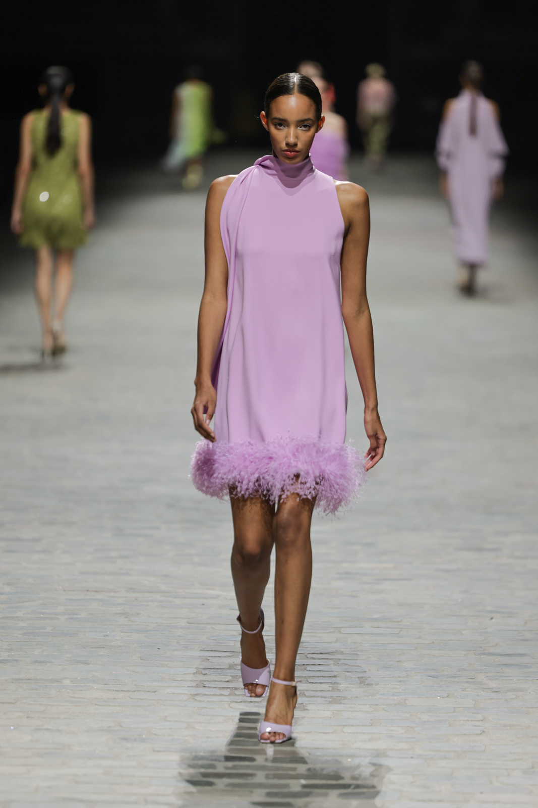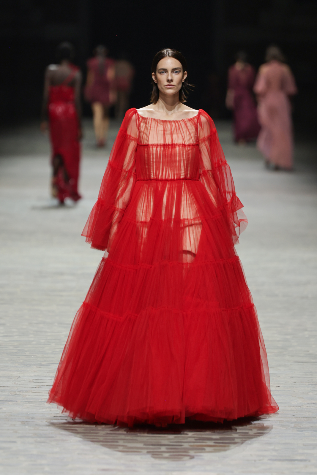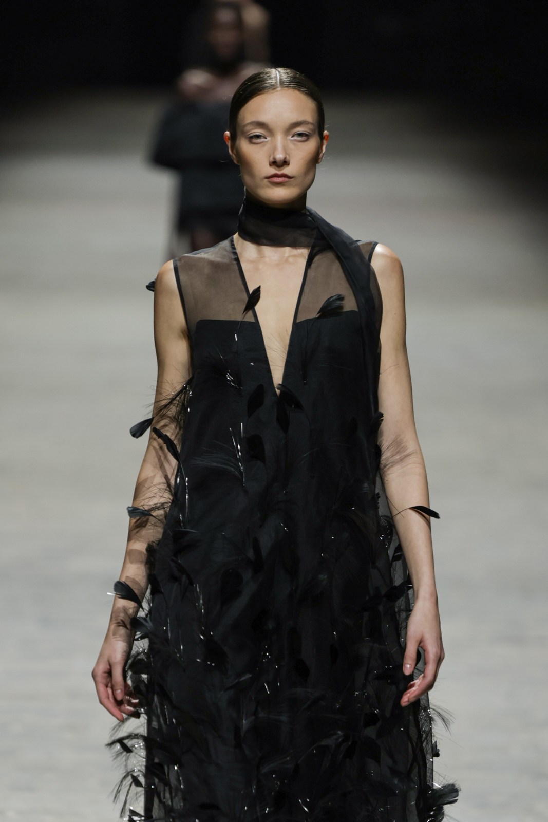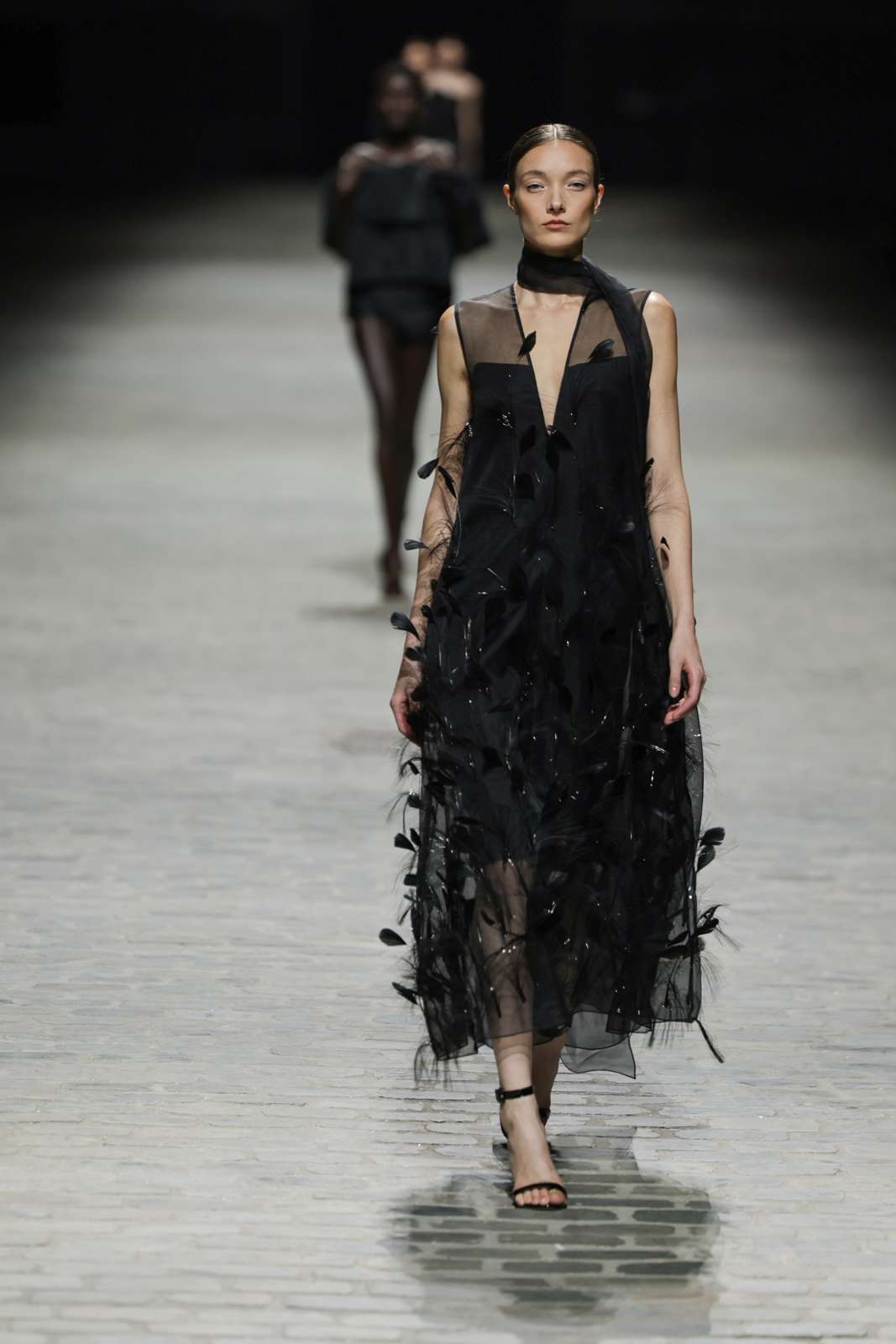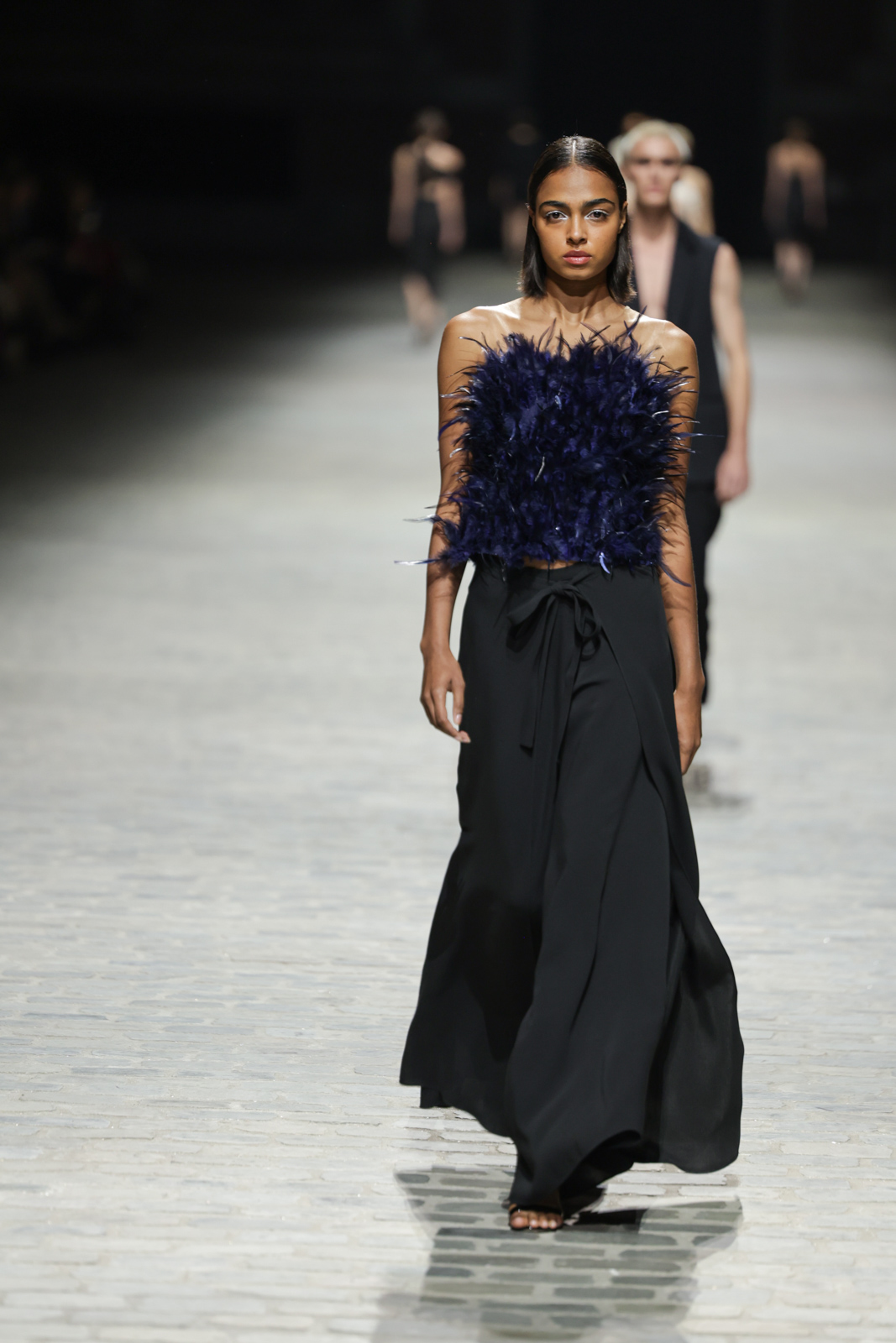 L’attention aux détails est manifeste dans le travail des plumes, des perlages, et des coiffes pailletées, enrichissant chaque création d’une touche de fantaisie couture. Les jeux de transparence, les volumes structurés et les silhouettes évasées à effet crinoline viennent sublimer la féminité, tandis que les pièces en maille luxueuse et les pantalons de mousseline offrent un contrepoint contemporain à cette célébration du savoir-faire tailleur.