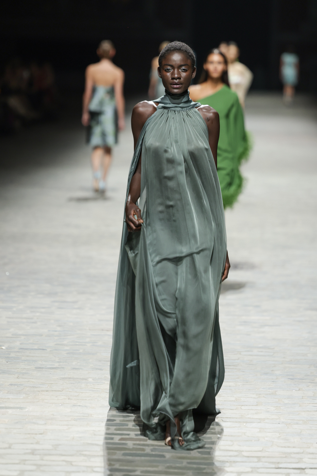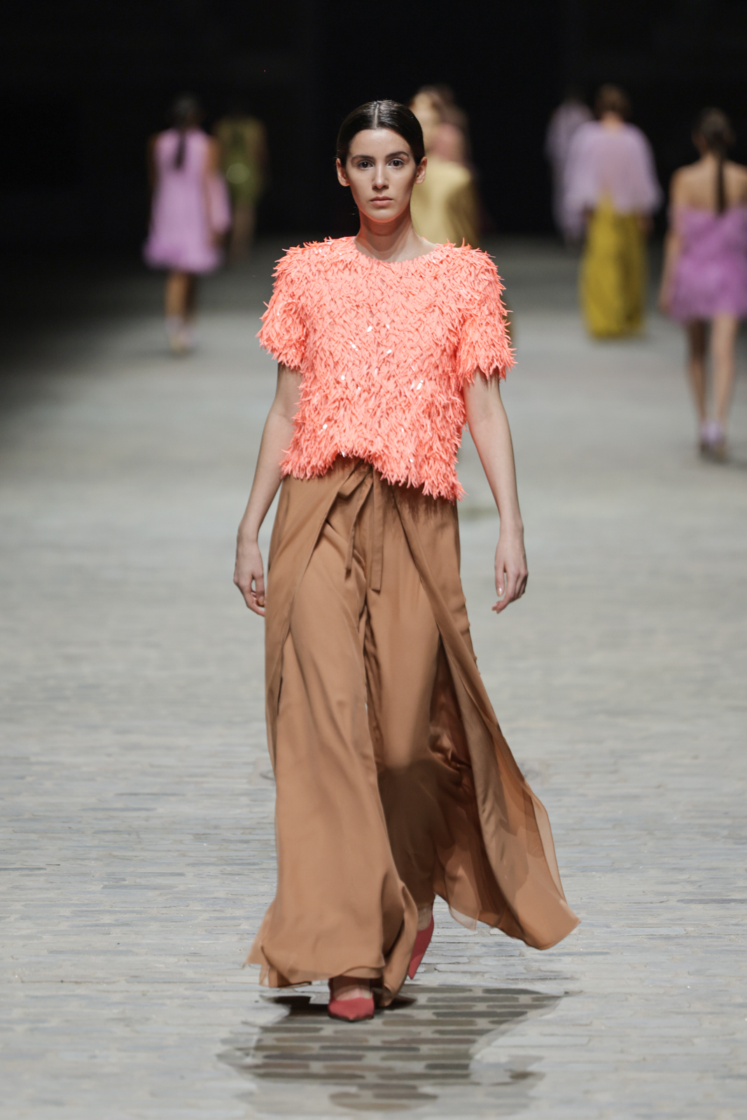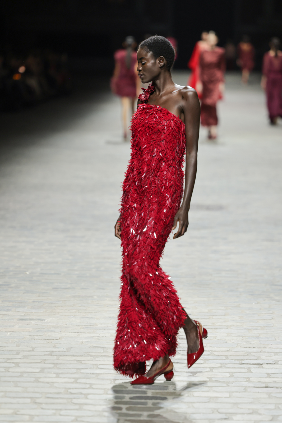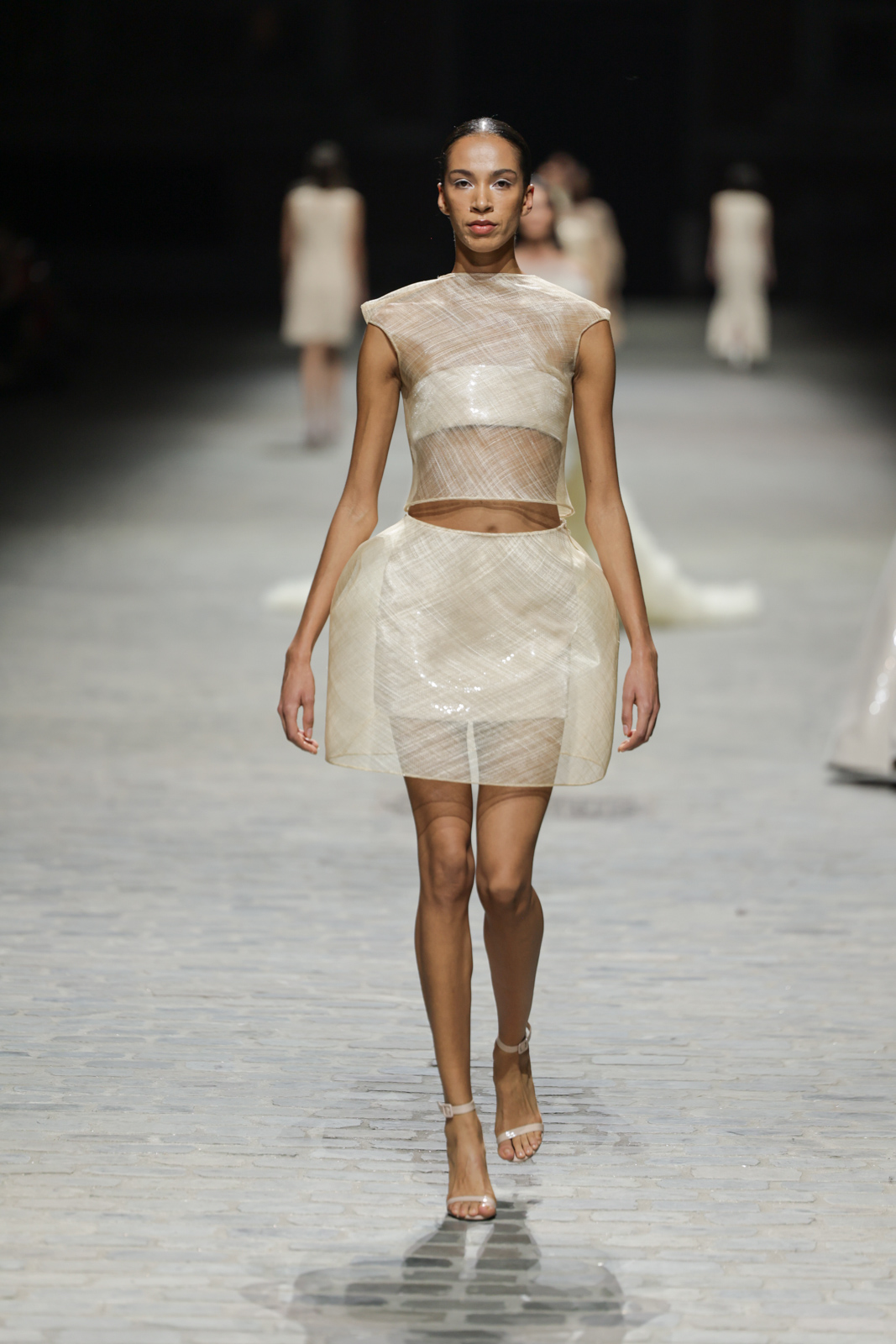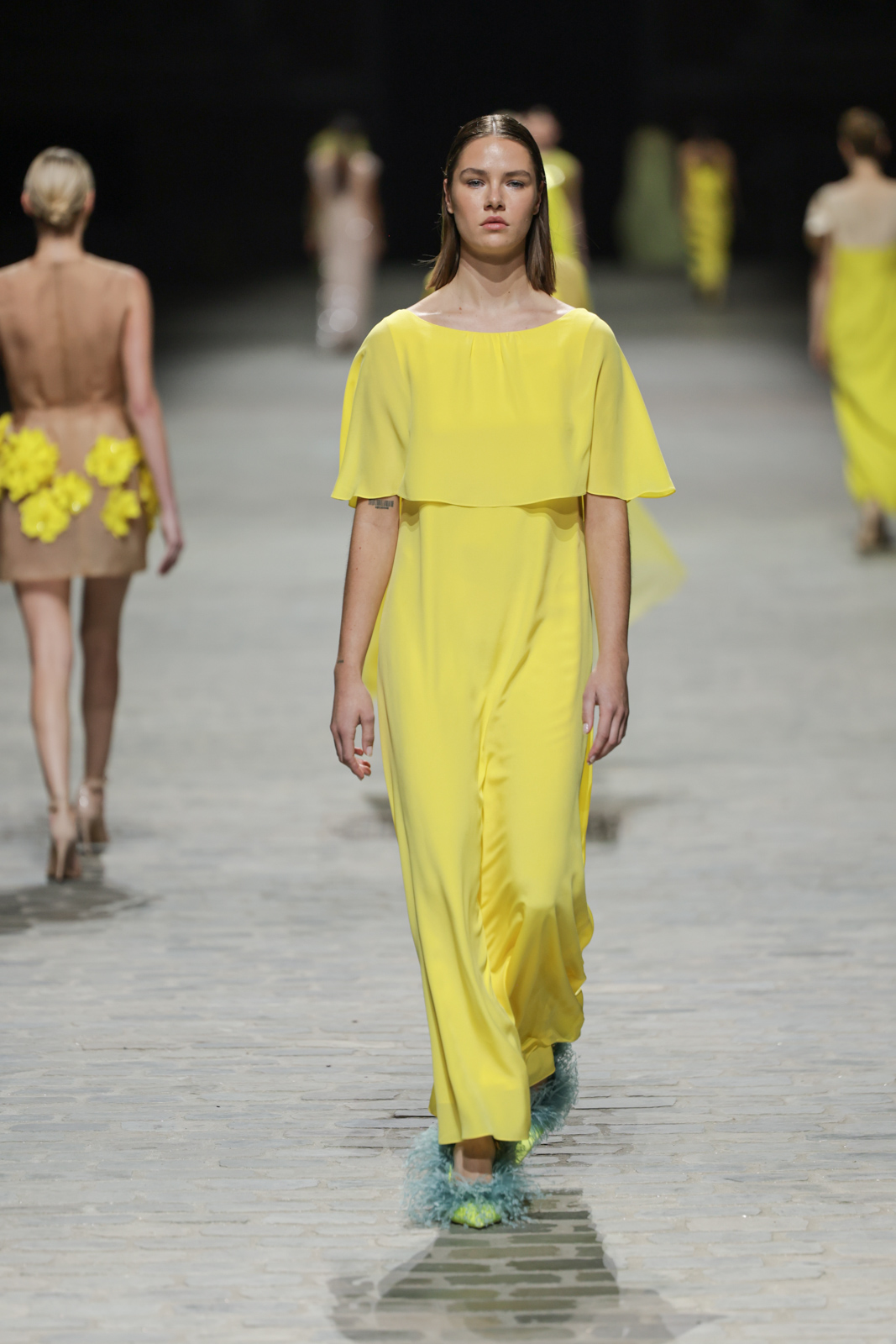 L’attention aux détails est manifeste dans le travail des plumes, des perlages, et des coiffes pailletées, enrichissant chaque création d’une touche de fantaisie couture. Les jeux de transparence, les volumes structurés et les silhouettes évasées à effet crinoline viennent sublimer la féminité, tandis que les pièces en maille luxueuse et les pantalons de mousseline offrent un contrepoint contemporain à cette célébration du savoir-faire tailleur.