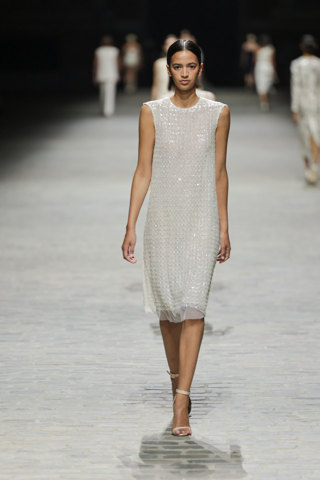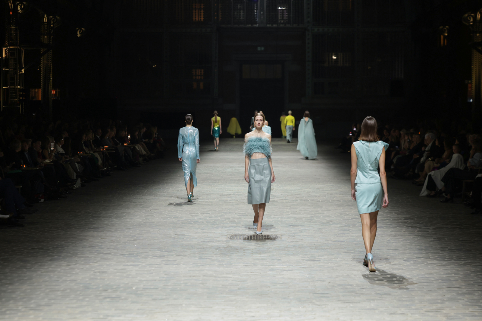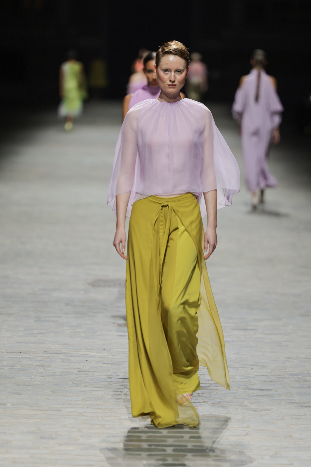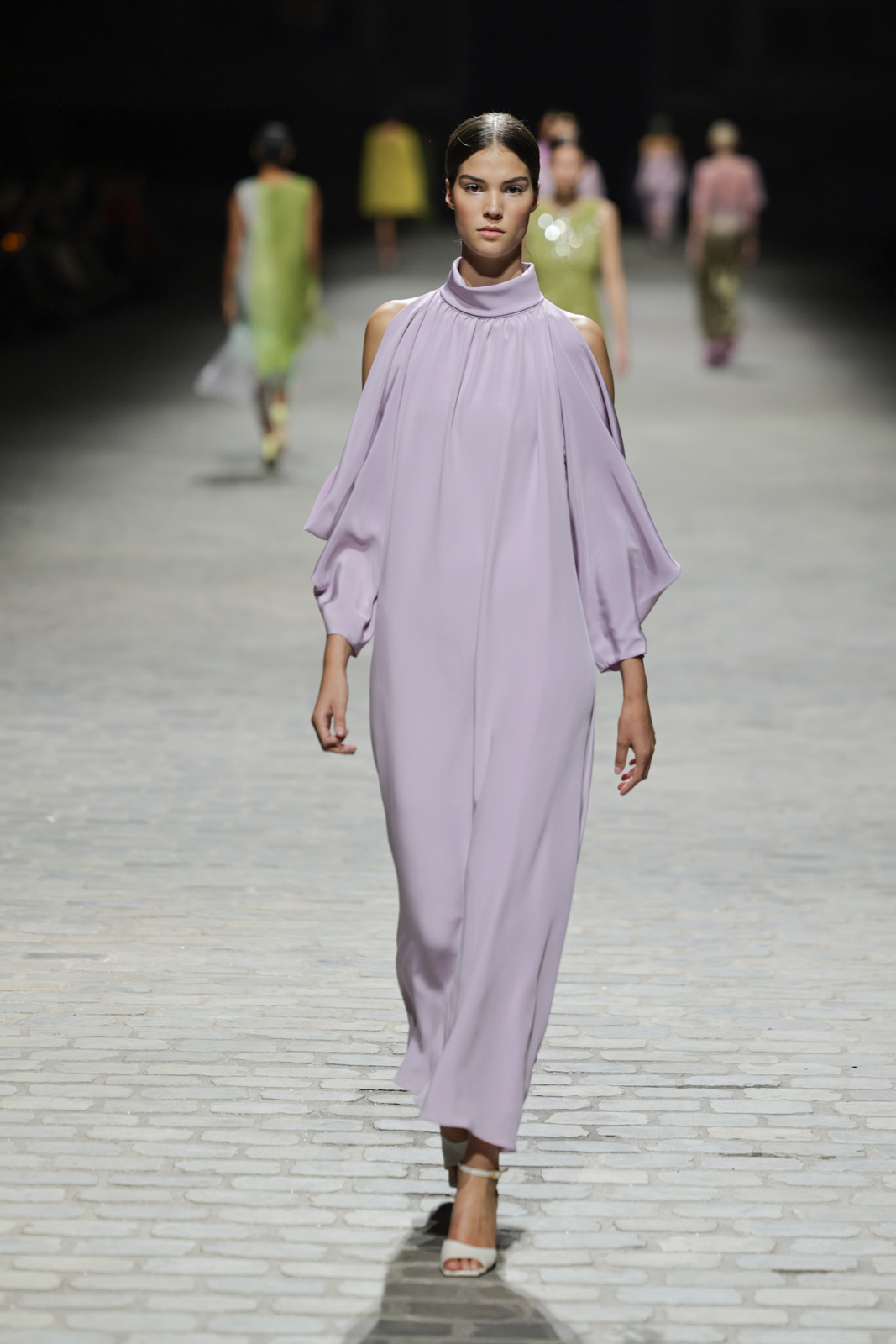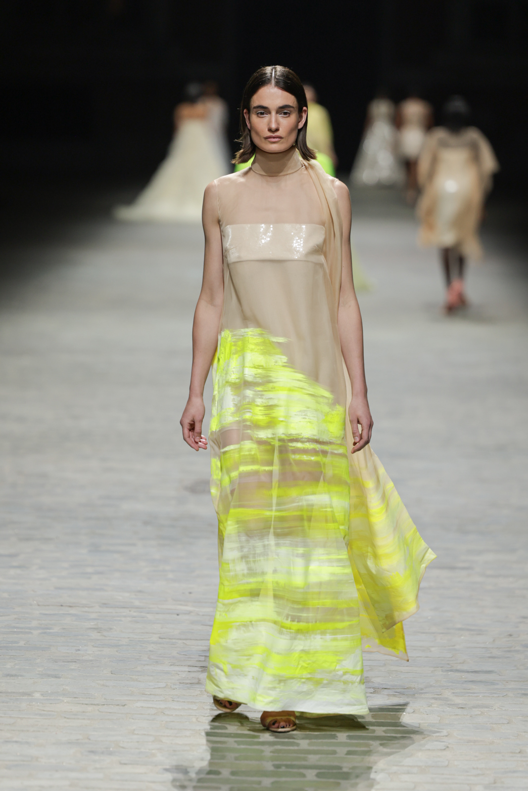 L’attention aux détails est manifeste dans le travail des plumes, des perlages, et des coiffes pailletées, enrichissant chaque création d’une touche de fantaisie couture. Les jeux de transparence, les volumes structurés et les silhouettes évasées à effet crinoline viennent sublimer la féminité, tandis que les pièces en maille luxueuse et les pantalons de mousseline offrent un contrepoint contemporain à cette célébration du savoir-faire tailleur.