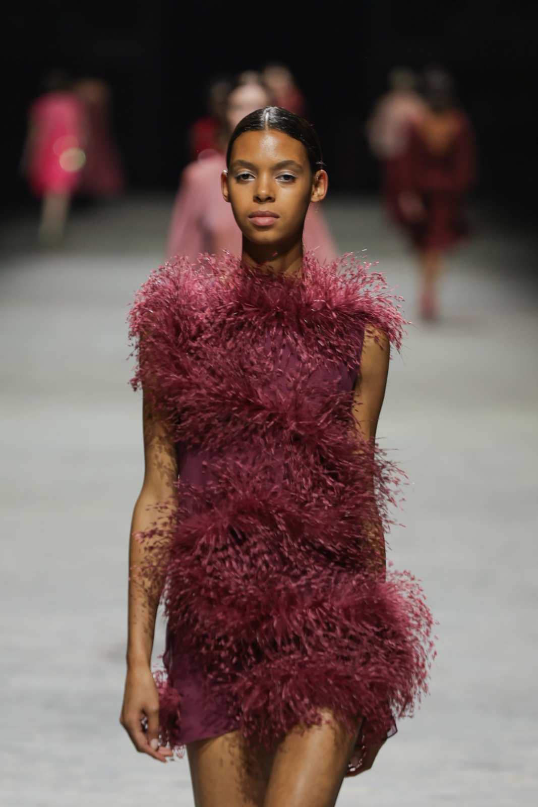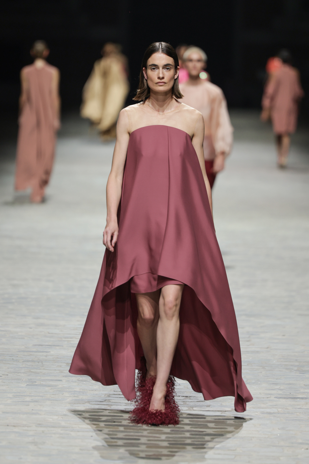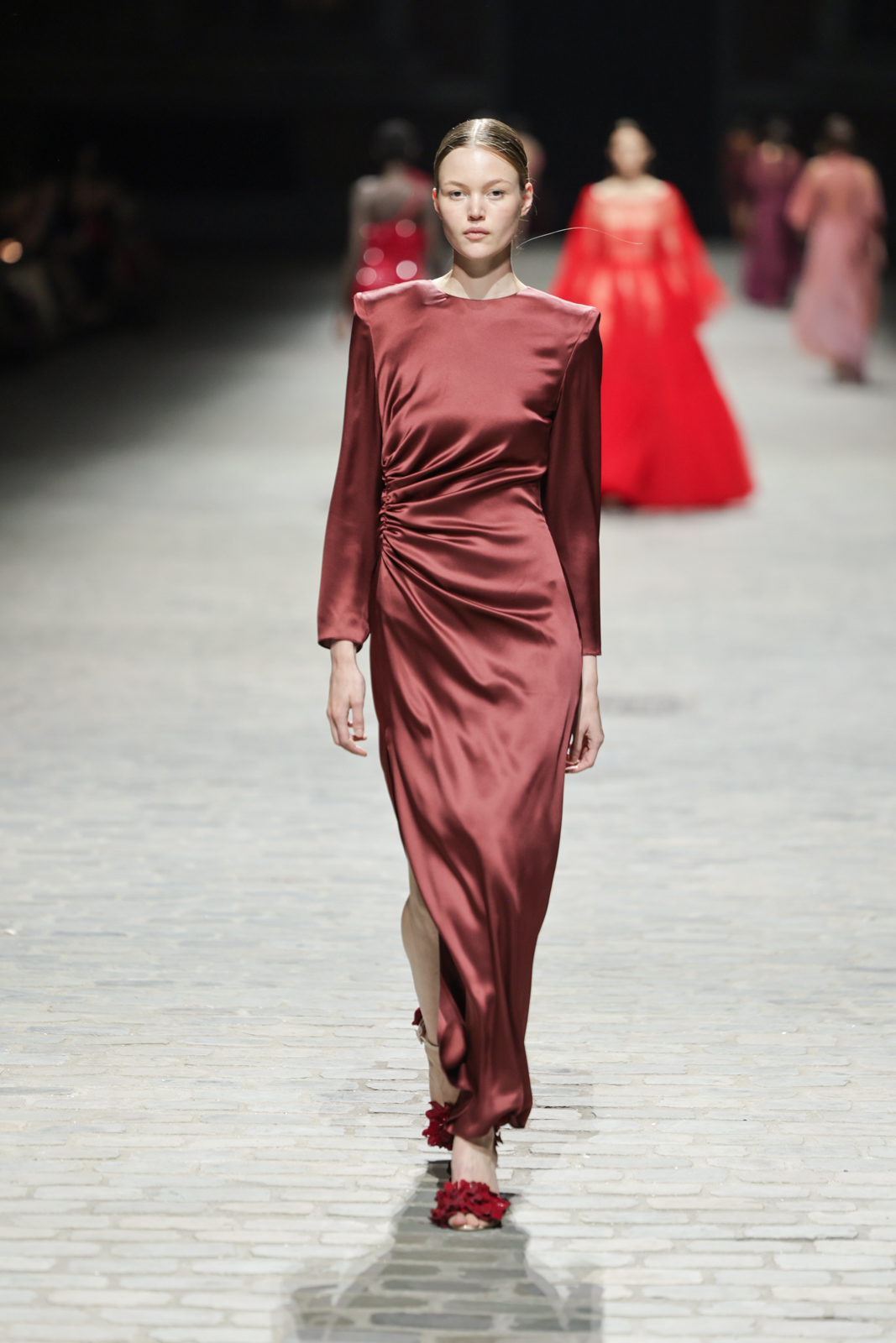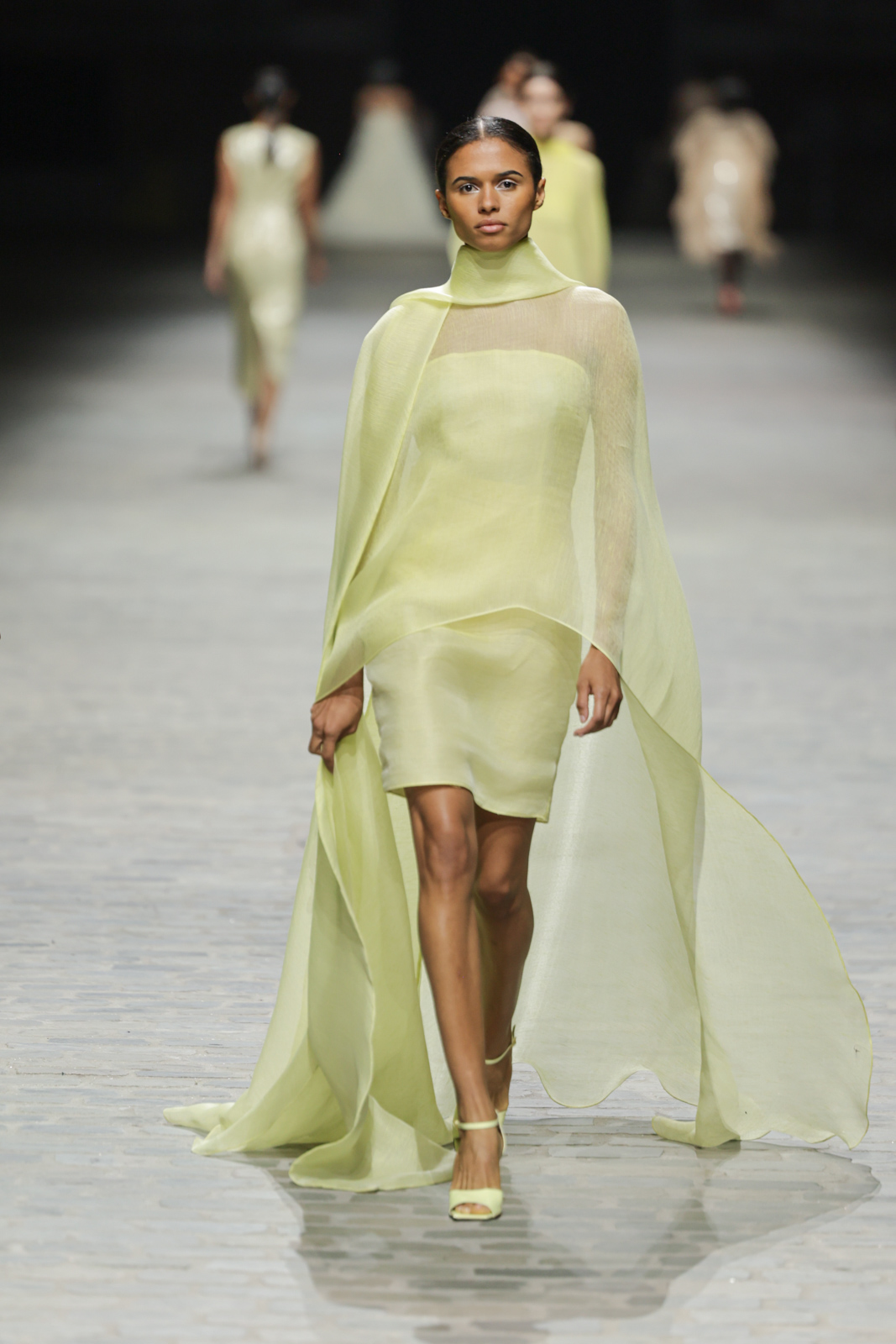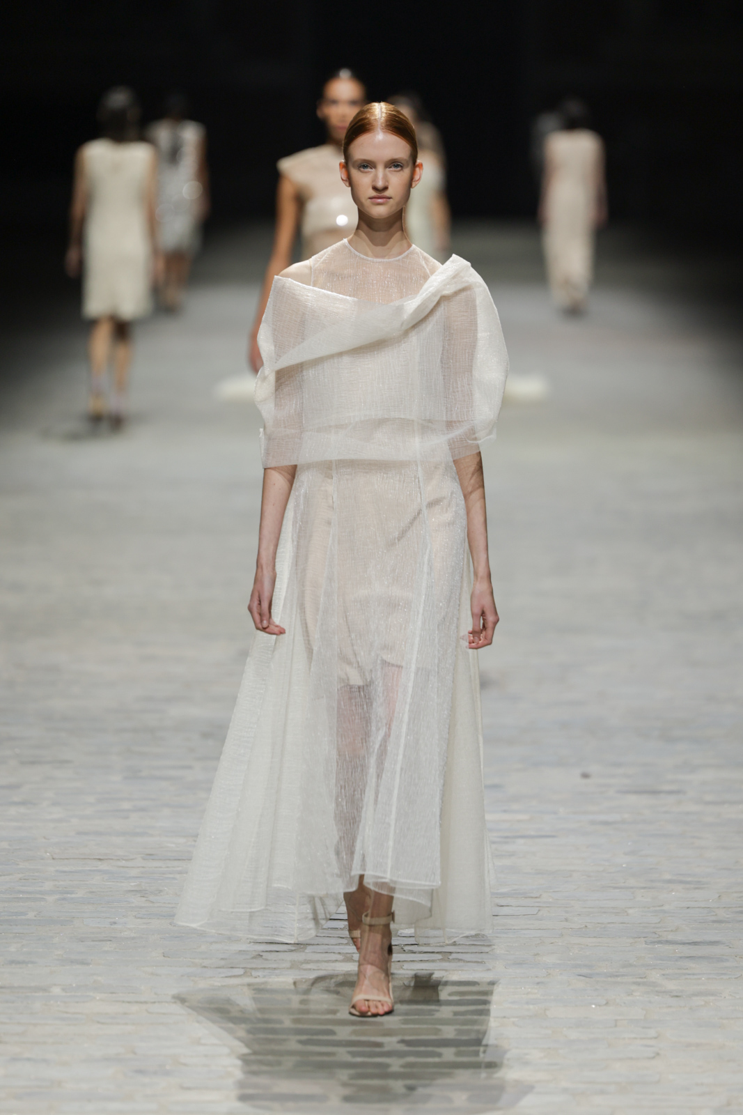 L’attention aux détails est manifeste dans le travail des plumes, des perlages, et des coiffes pailletées, enrichissant chaque création d’une touche de fantaisie couture. Les jeux de transparence, les volumes structurés et les silhouettes évasées à effet crinoline viennent sublimer la féminité, tandis que les pièces en maille luxueuse et les pantalons de mousseline offrent un contrepoint contemporain à cette célébration du savoir-faire tailleur.