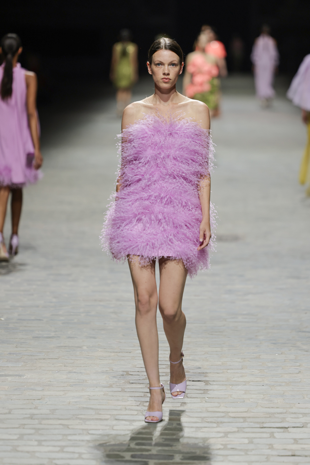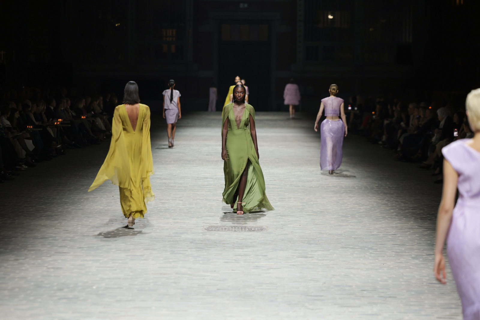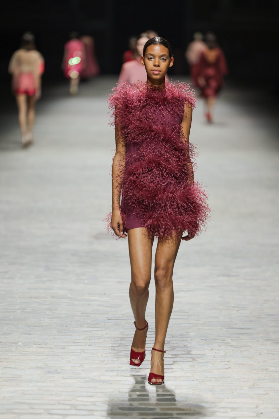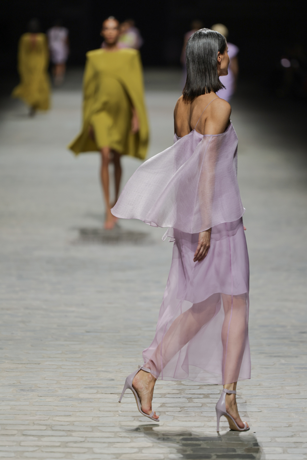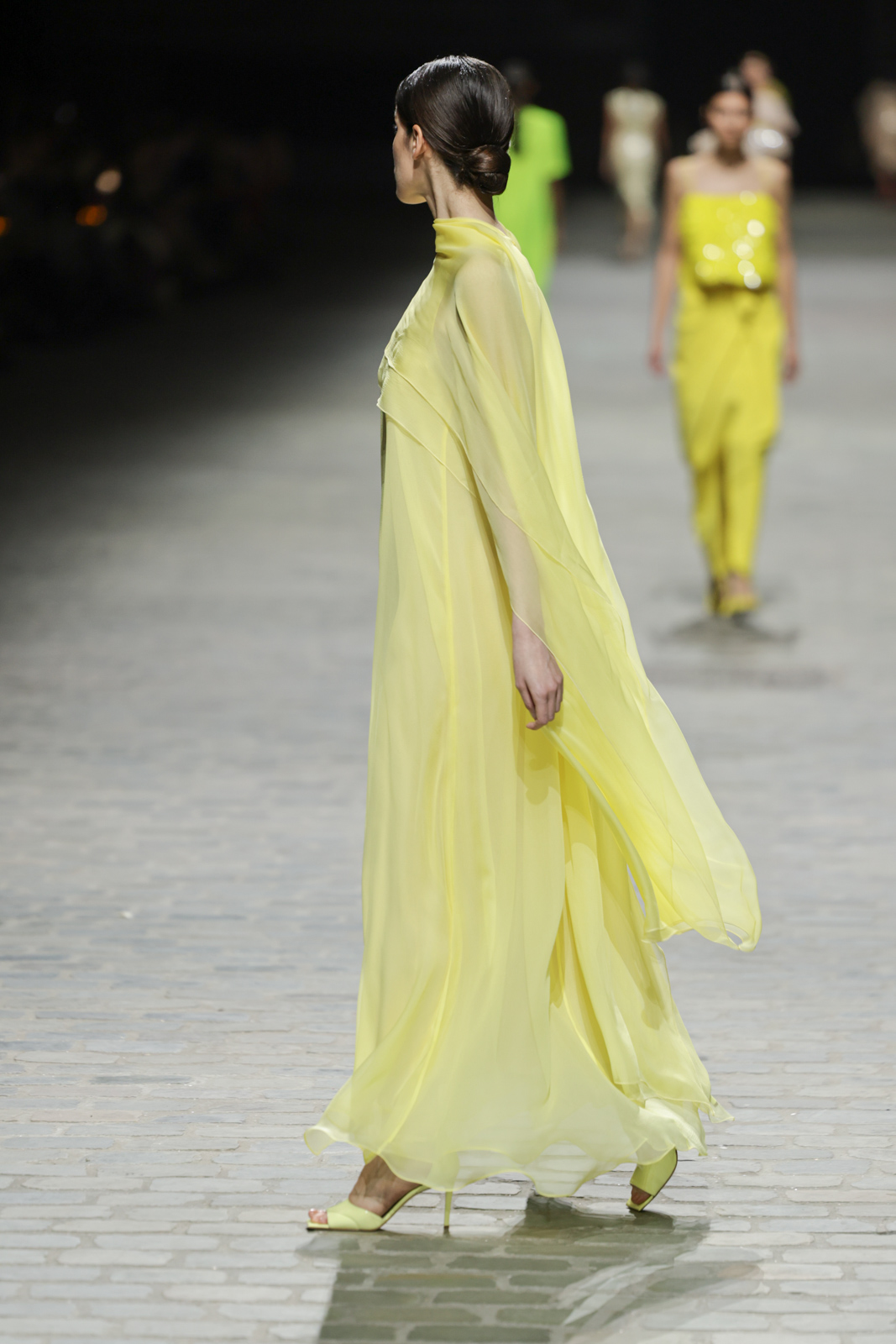 L’attention aux détails est manifeste dans le travail des plumes, des perlages, et des coiffes pailletées, enrichissant chaque création d’une touche de fantaisie couture. Les jeux de transparence, les volumes structurés et les silhouettes évasées à effet crinoline viennent sublimer la féminité, tandis que les pièces en maille luxueuse et les pantalons de mousseline offrent un contrepoint contemporain à cette célébration du savoir-faire tailleur.