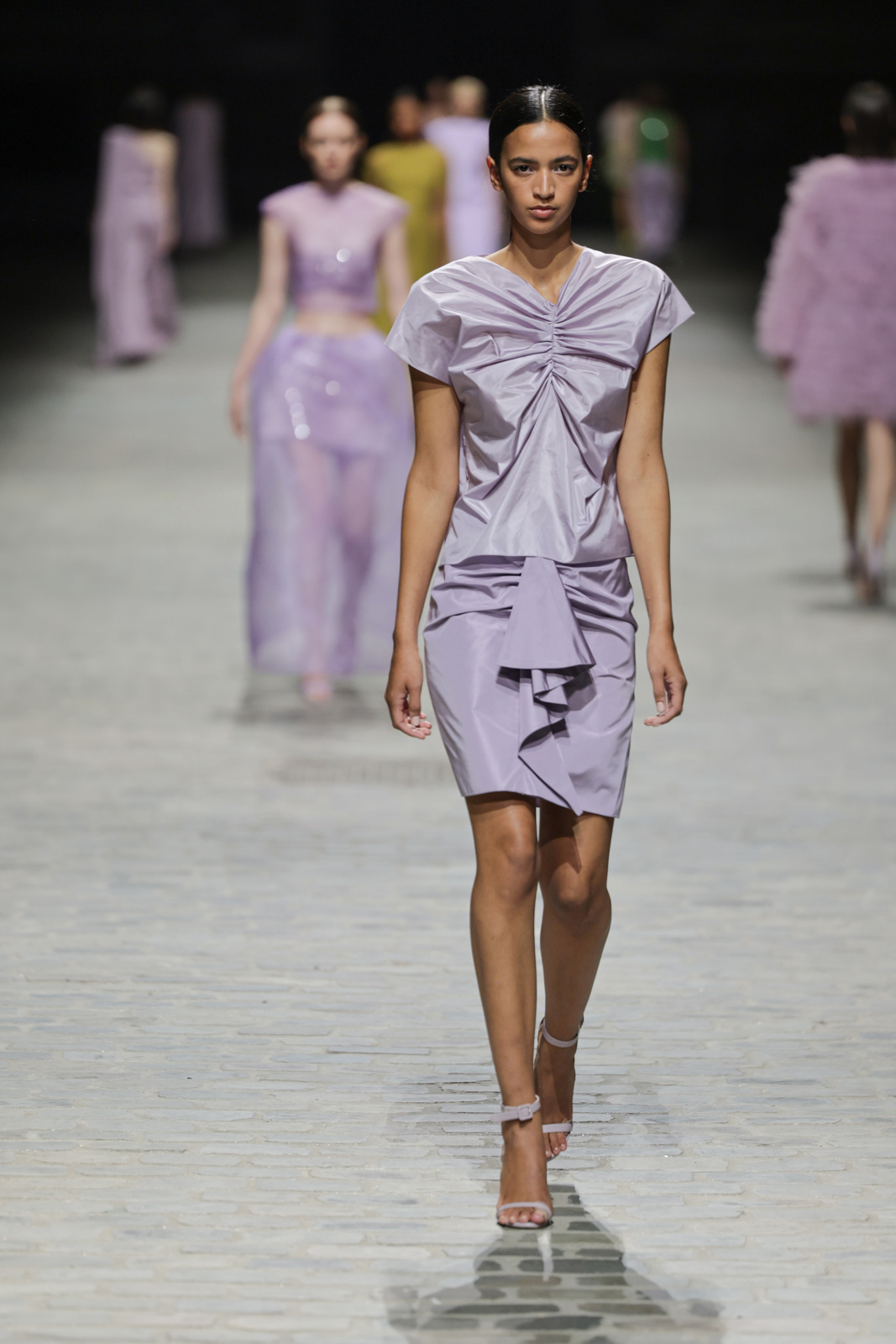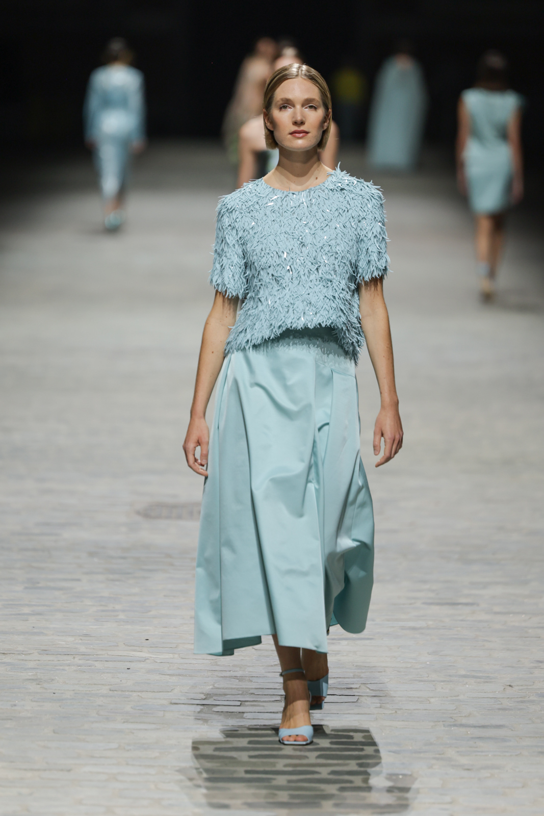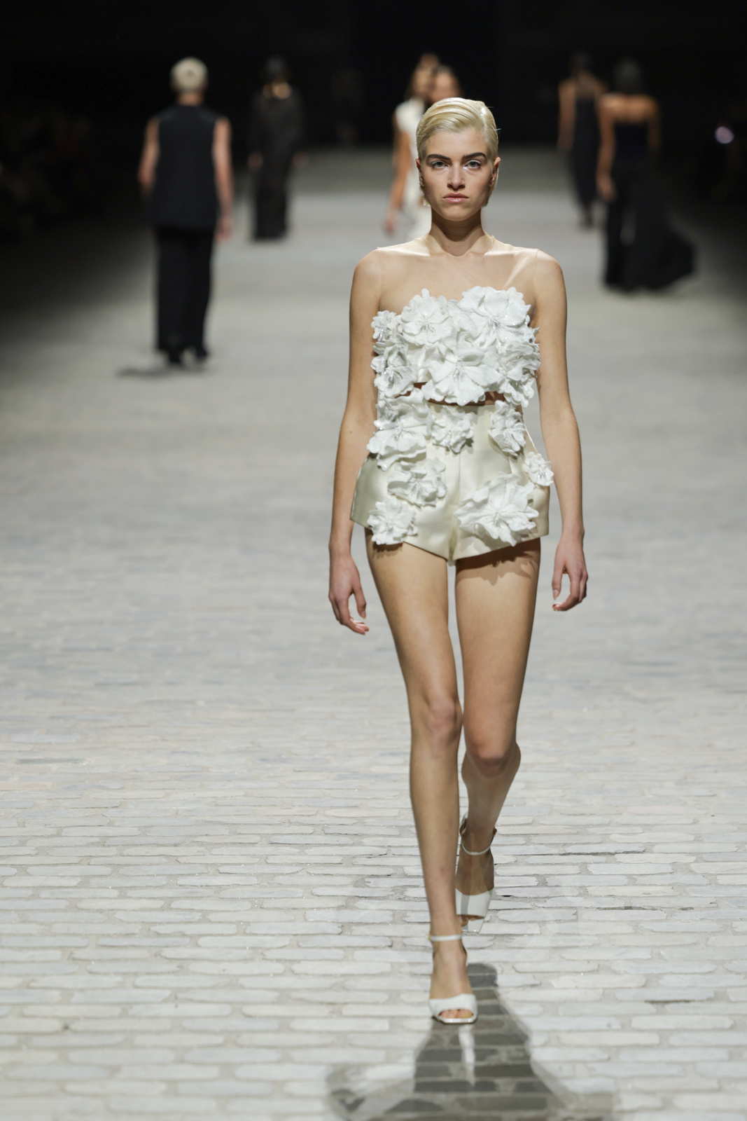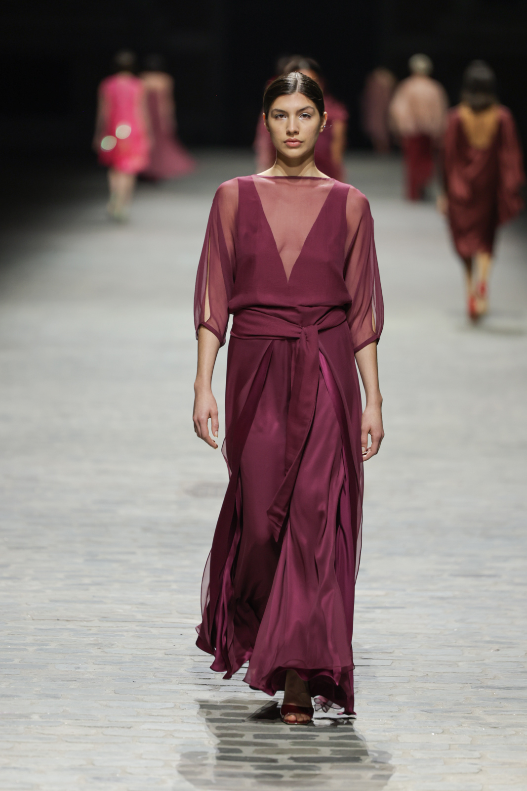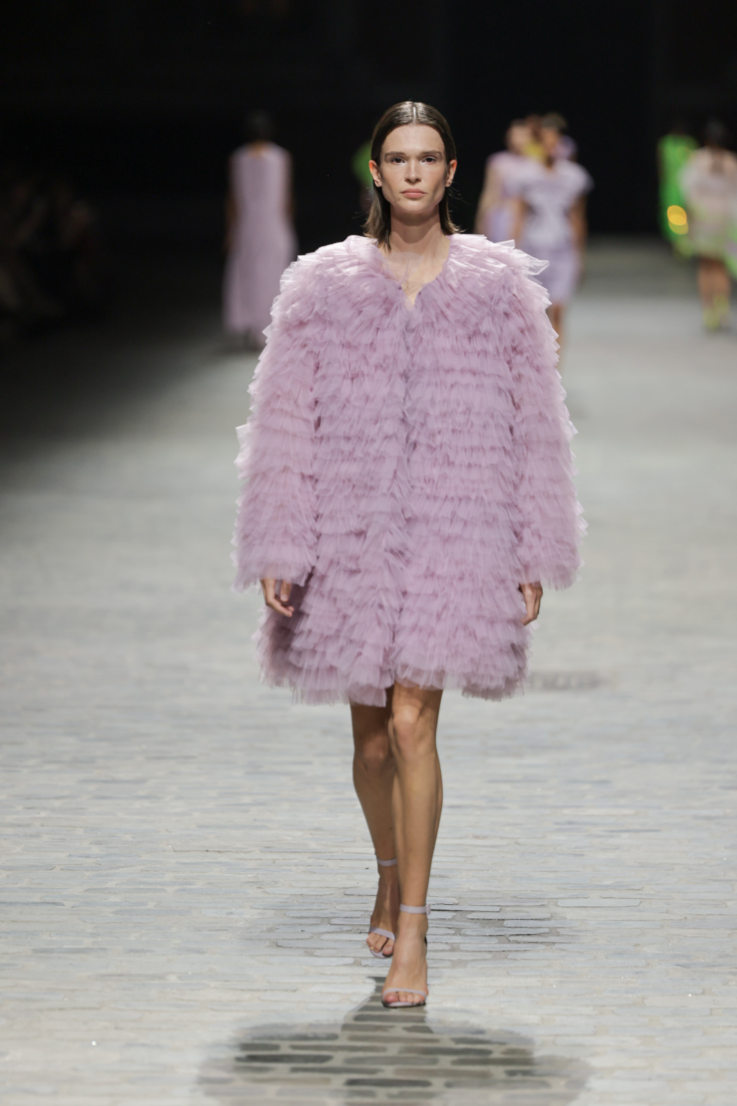 L’attention aux détails est manifeste dans le travail des plumes, des perlages, et des coiffes pailletées, enrichissant chaque création d’une touche de fantaisie couture. Les jeux de transparence, les volumes structurés et les silhouettes évasées à effet crinoline viennent sublimer la féminité, tandis que les pièces en maille luxueuse et les pantalons de mousseline offrent un contrepoint contemporain à cette célébration du savoir-faire tailleur.
