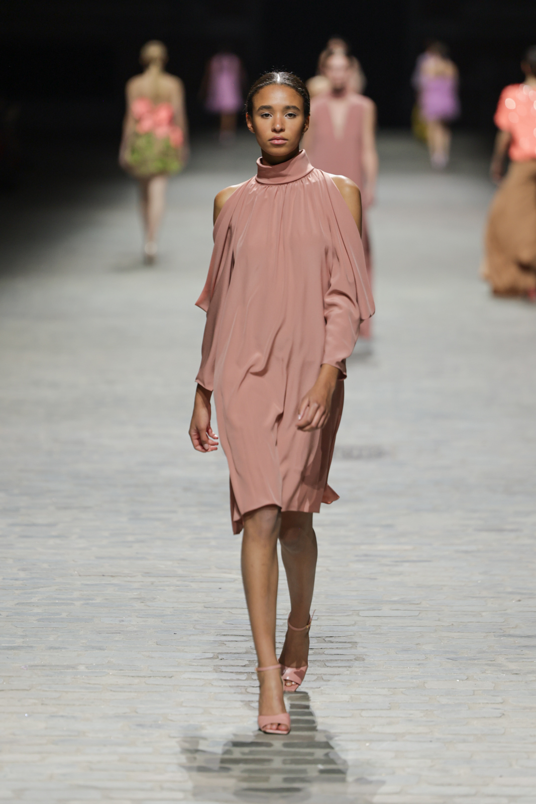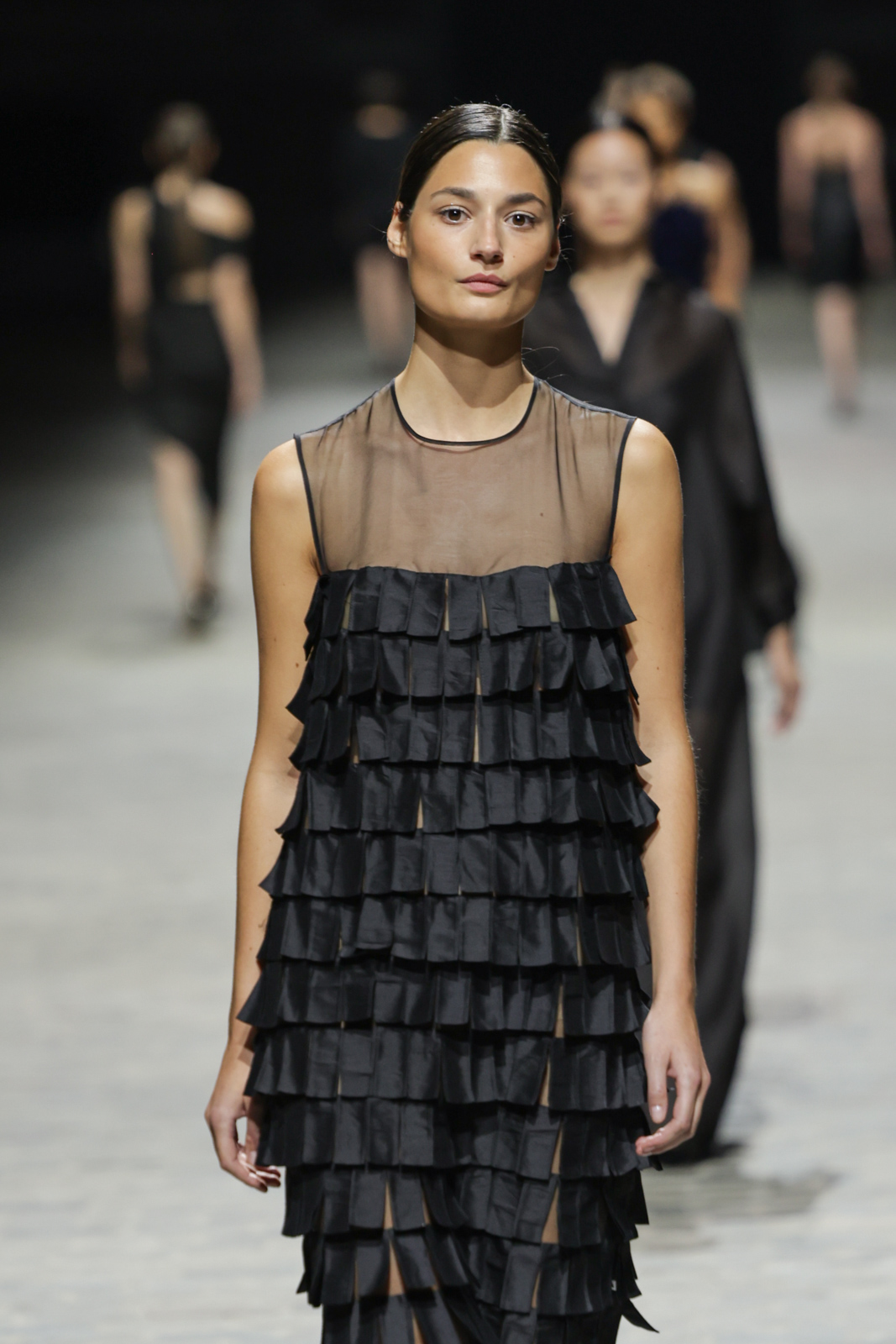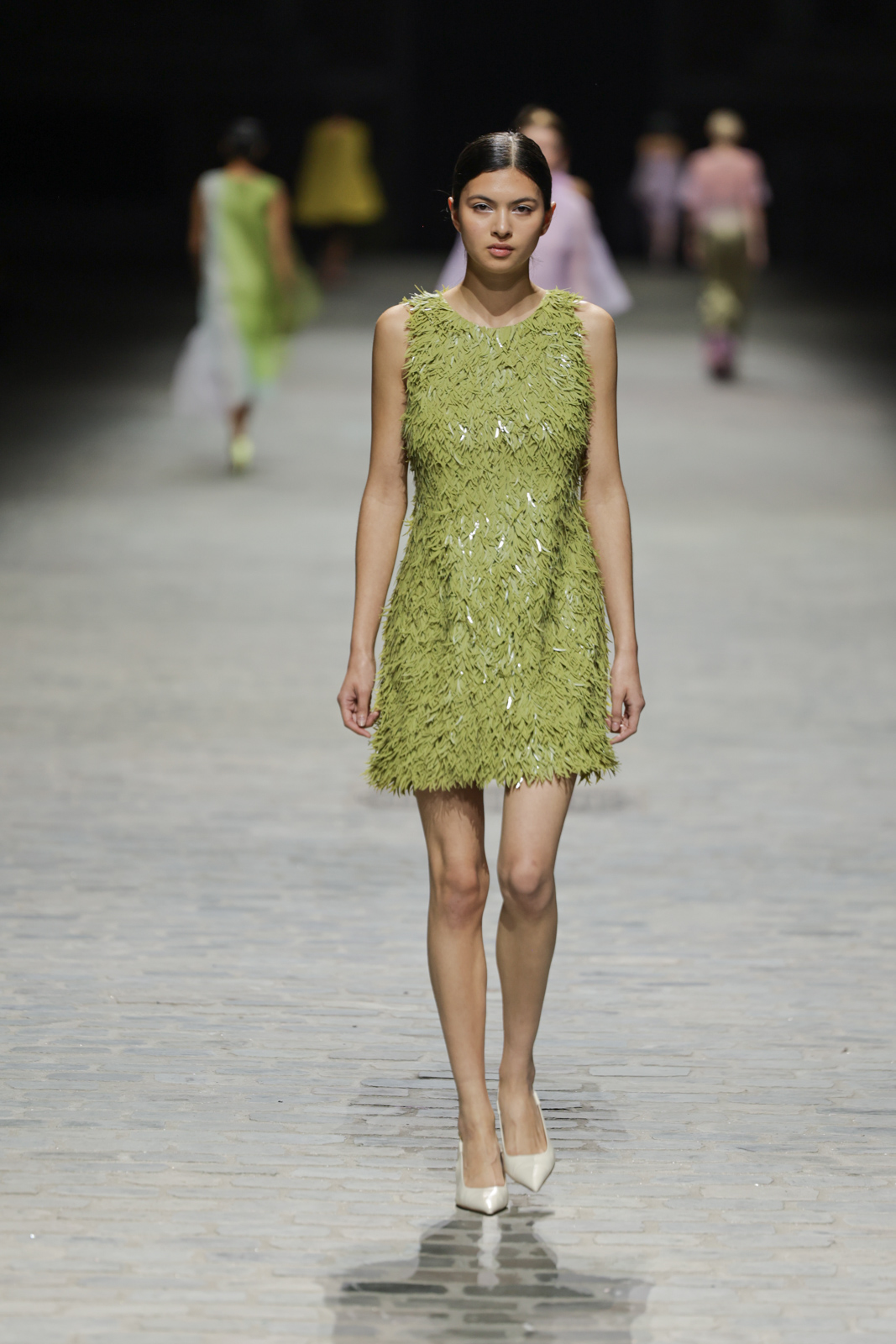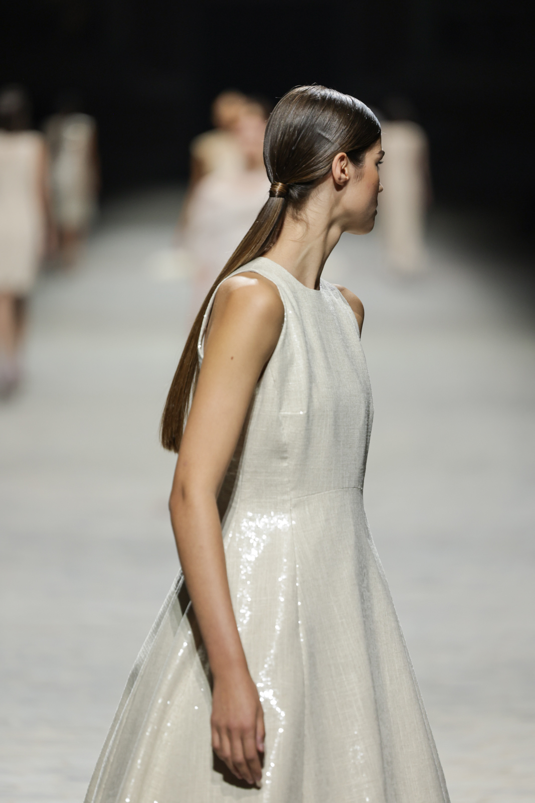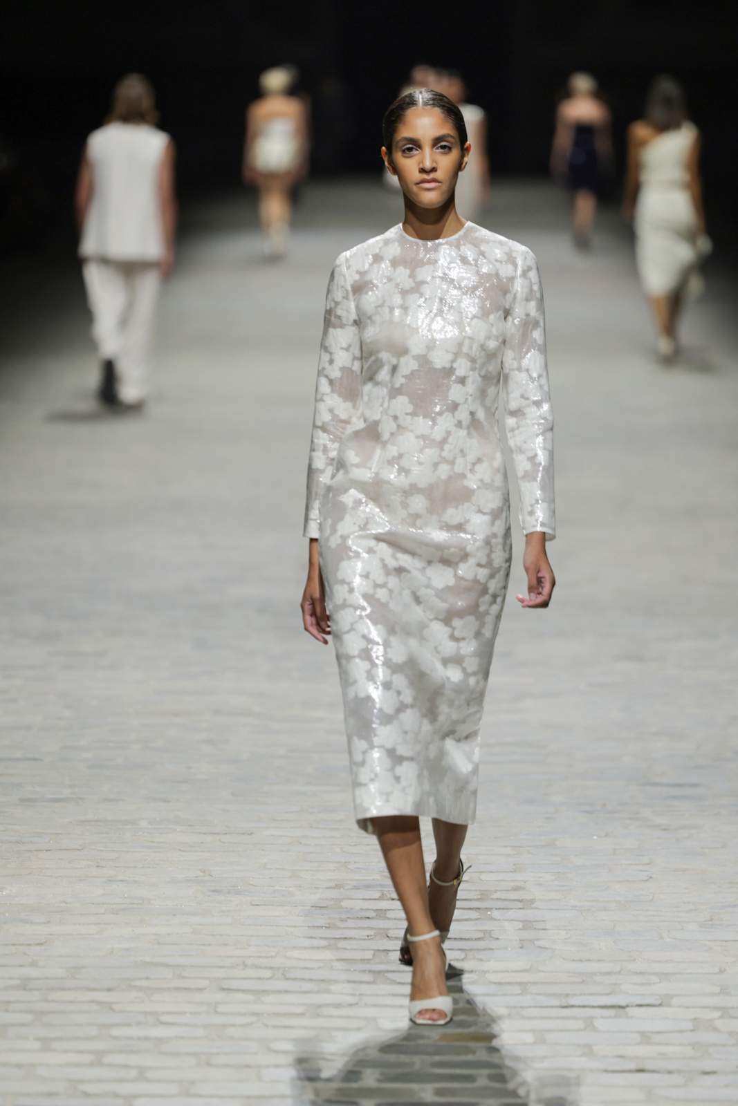 L’attention aux détails est manifeste dans le travail des plumes, des perlages, et des coiffes pailletées, enrichissant chaque création d’une touche de fantaisie couture. Les jeux de transparence, les volumes structurés et les silhouettes évasées à effet crinoline viennent sublimer la féminité, tandis que les pièces en maille luxueuse et les pantalons de mousseline offrent un contrepoint contemporain à cette célébration du savoir-faire tailleur.