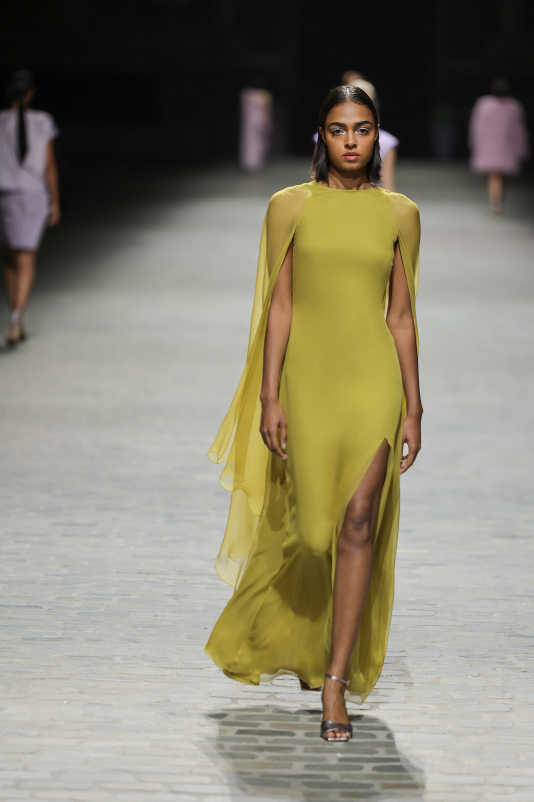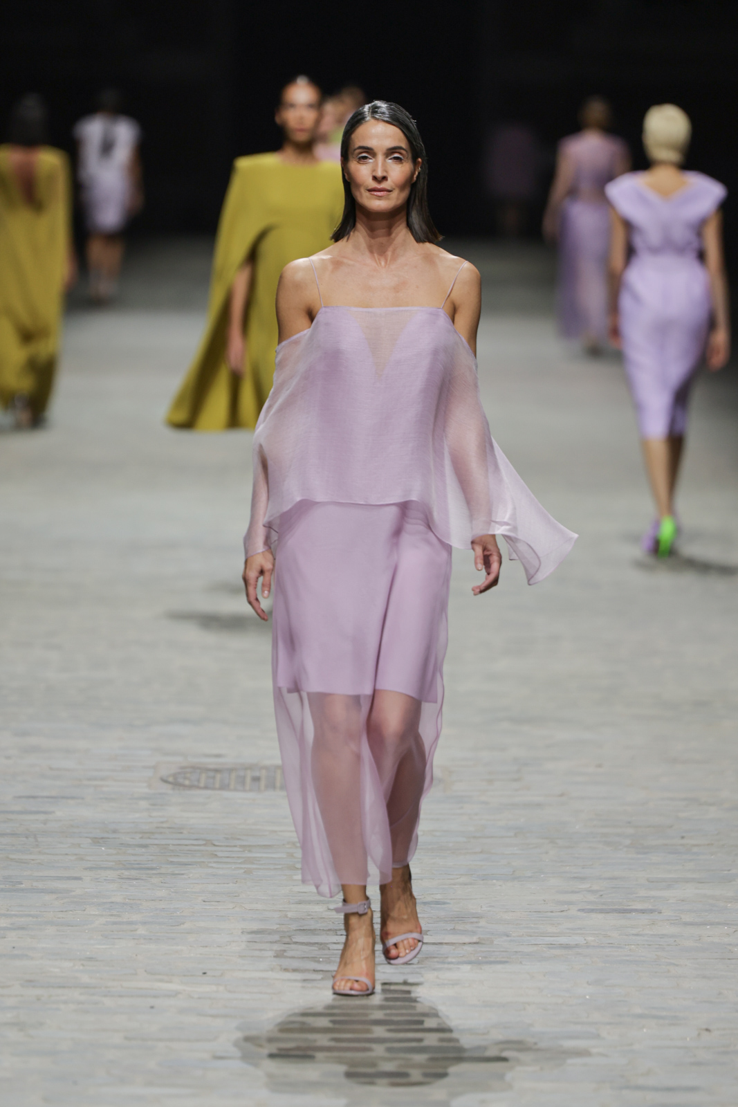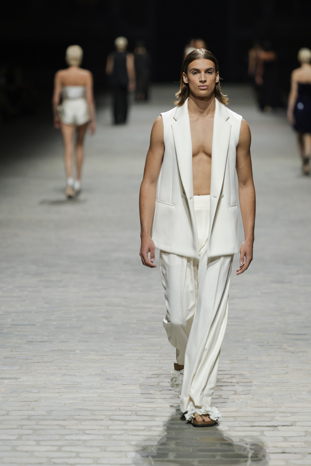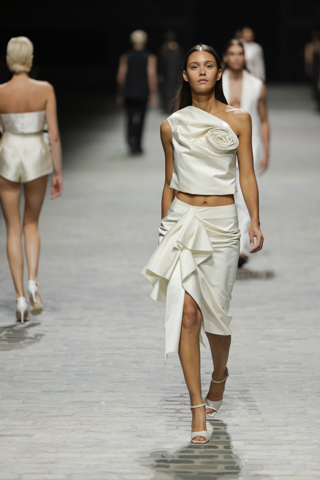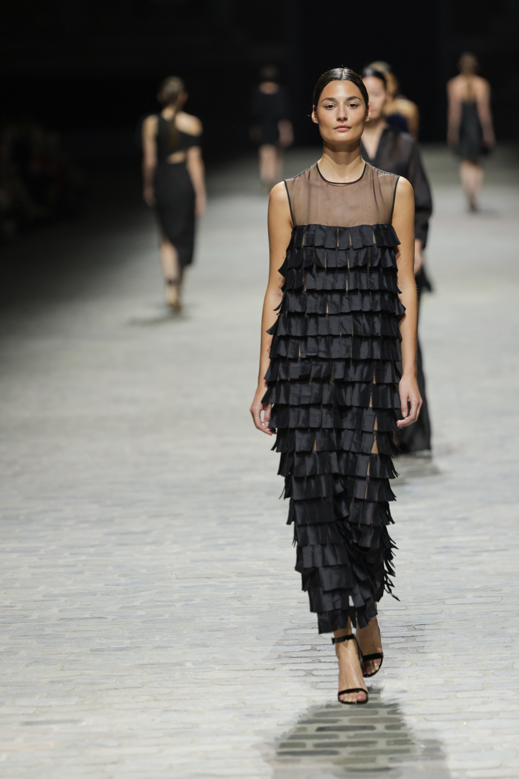 L’attention aux détails est manifeste dans le travail des plumes, des perlages, et des coiffes pailletées, enrichissant chaque création d’une touche de fantaisie couture. Les jeux de transparence, les volumes structurés et les silhouettes évasées à effet crinoline viennent sublimer la féminité, tandis que les pièces en maille luxueuse et les pantalons de mousseline offrent un contrepoint contemporain à cette célébration du savoir-faire tailleur.