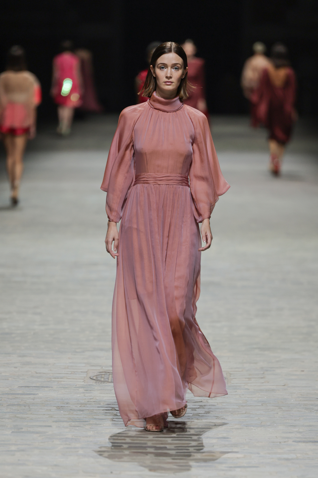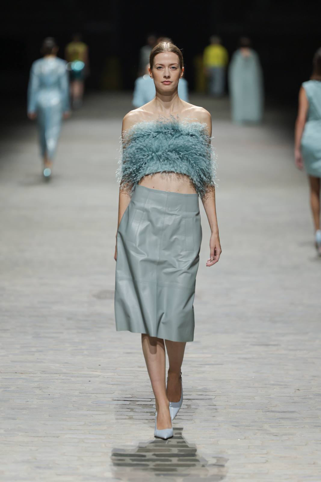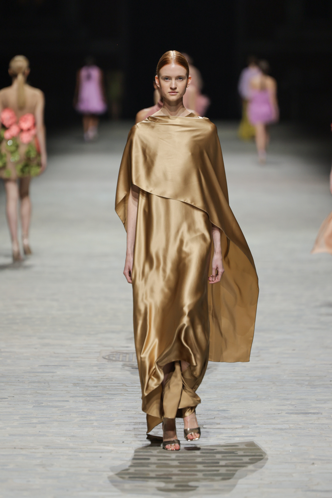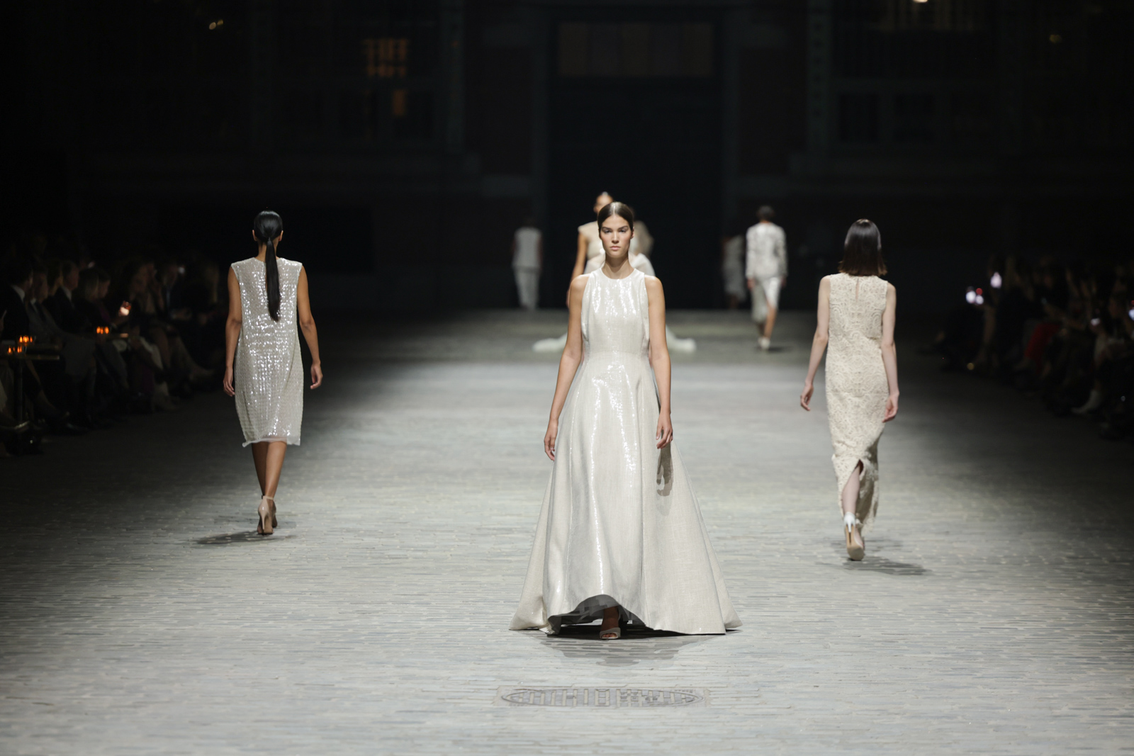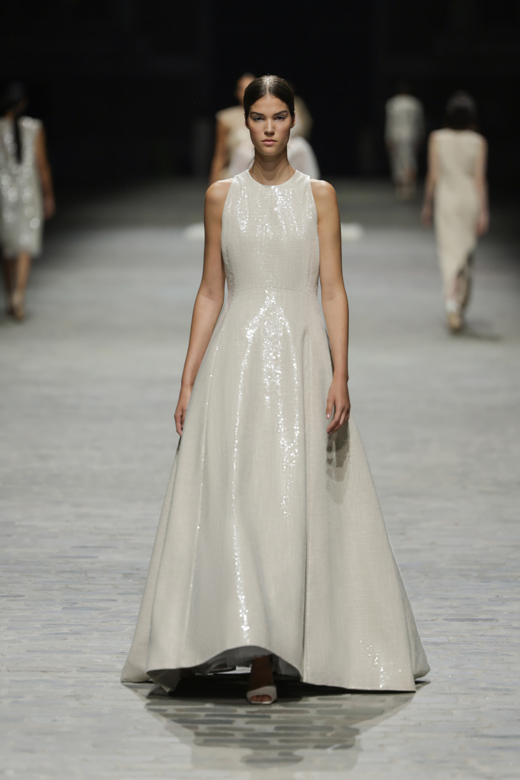 L’attention aux détails est manifeste dans le travail des plumes, des perlages, et des coiffes pailletées, enrichissant chaque création d’une touche de fantaisie couture. Les jeux de transparence, les volumes structurés et les silhouettes évasées à effet crinoline viennent sublimer la féminité, tandis que les pièces en maille luxueuse et les pantalons de mousseline offrent un contrepoint contemporain à cette célébration du savoir-faire tailleur.