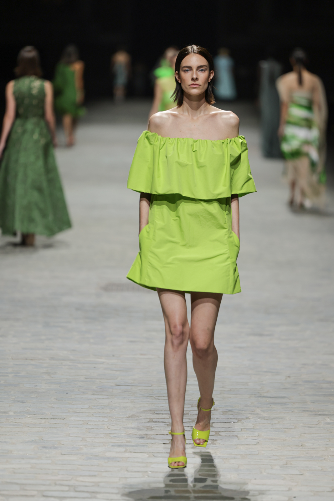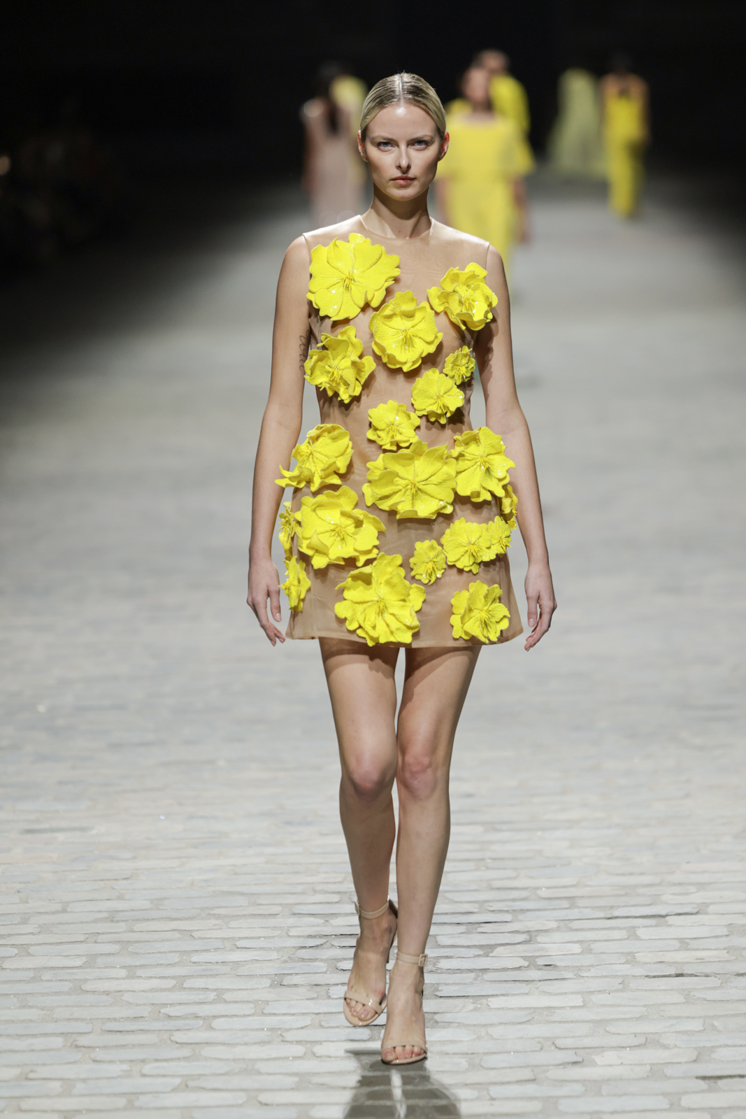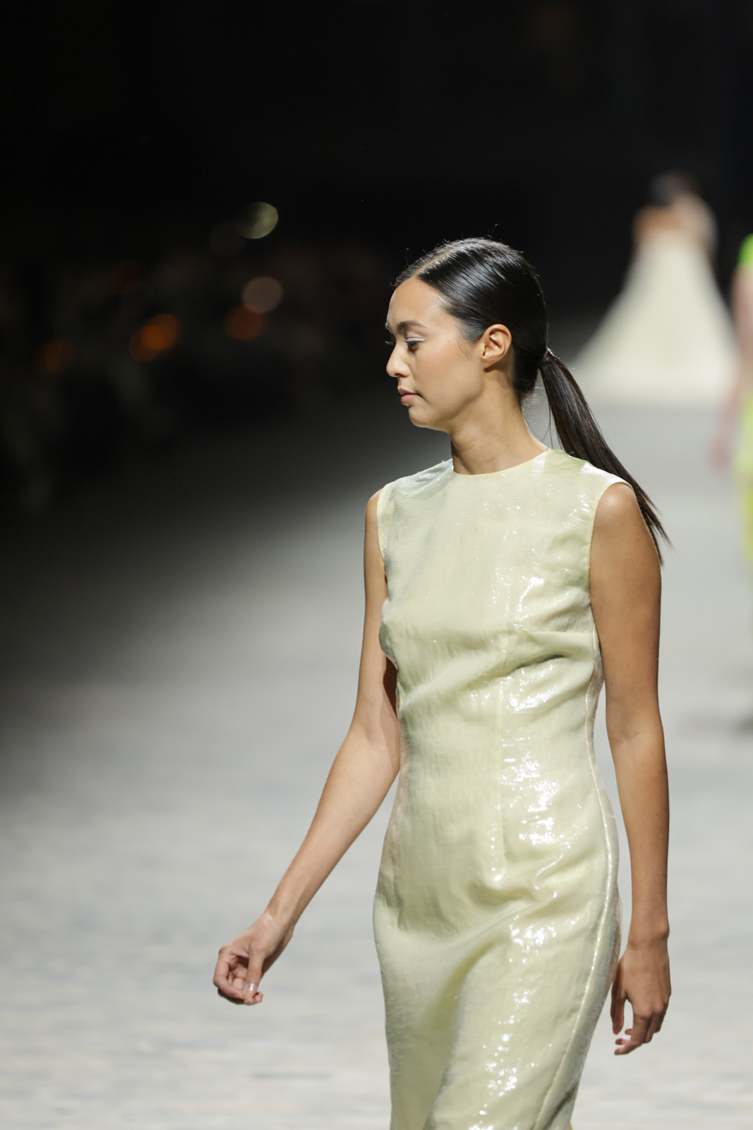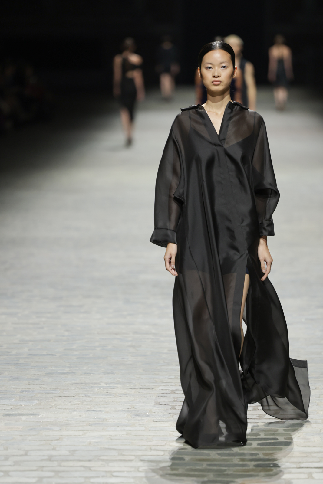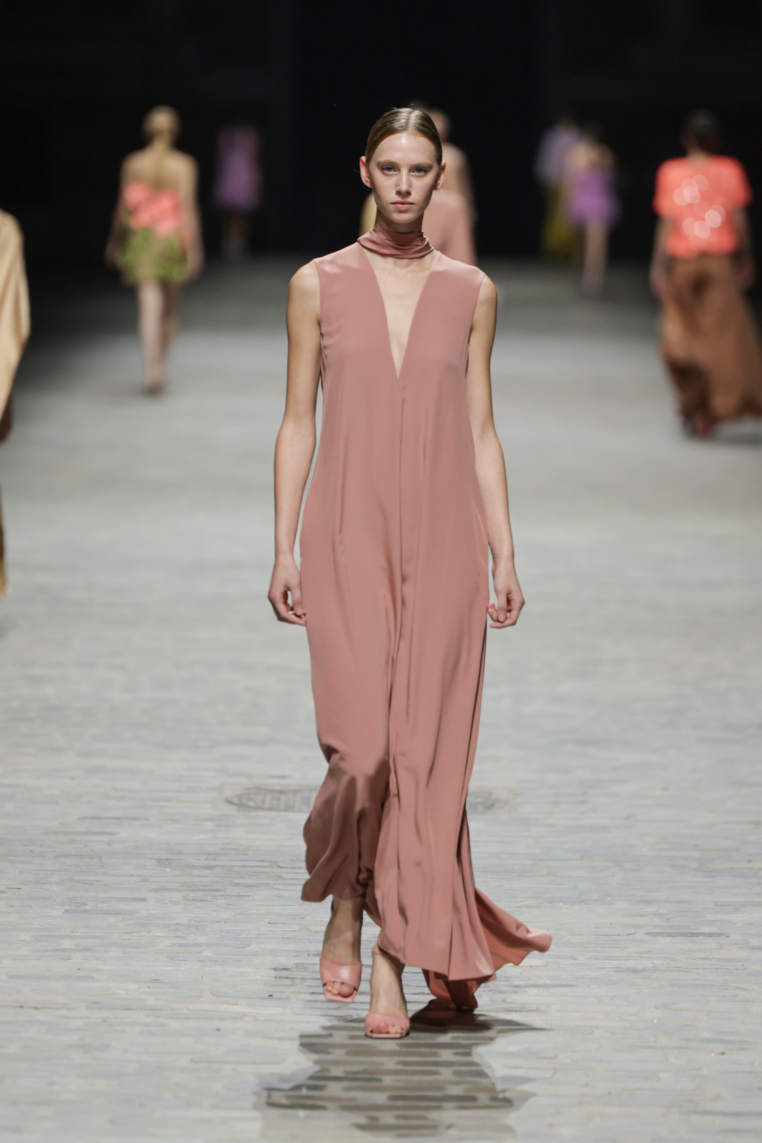 L’attention aux détails est manifeste dans le travail des plumes, des perlages, et des coiffes pailletées, enrichissant chaque création d’une touche de fantaisie couture. Les jeux de transparence, les volumes structurés et les silhouettes évasées à effet crinoline viennent sublimer la féminité, tandis que les pièces en maille luxueuse et les pantalons de mousseline offrent un contrepoint contemporain à cette célébration du savoir-faire tailleur.