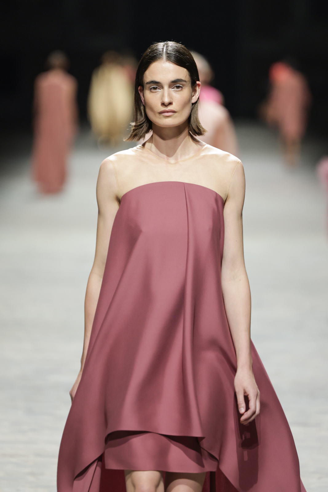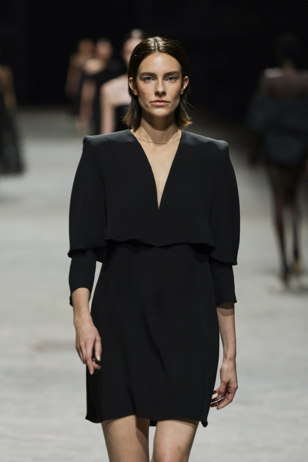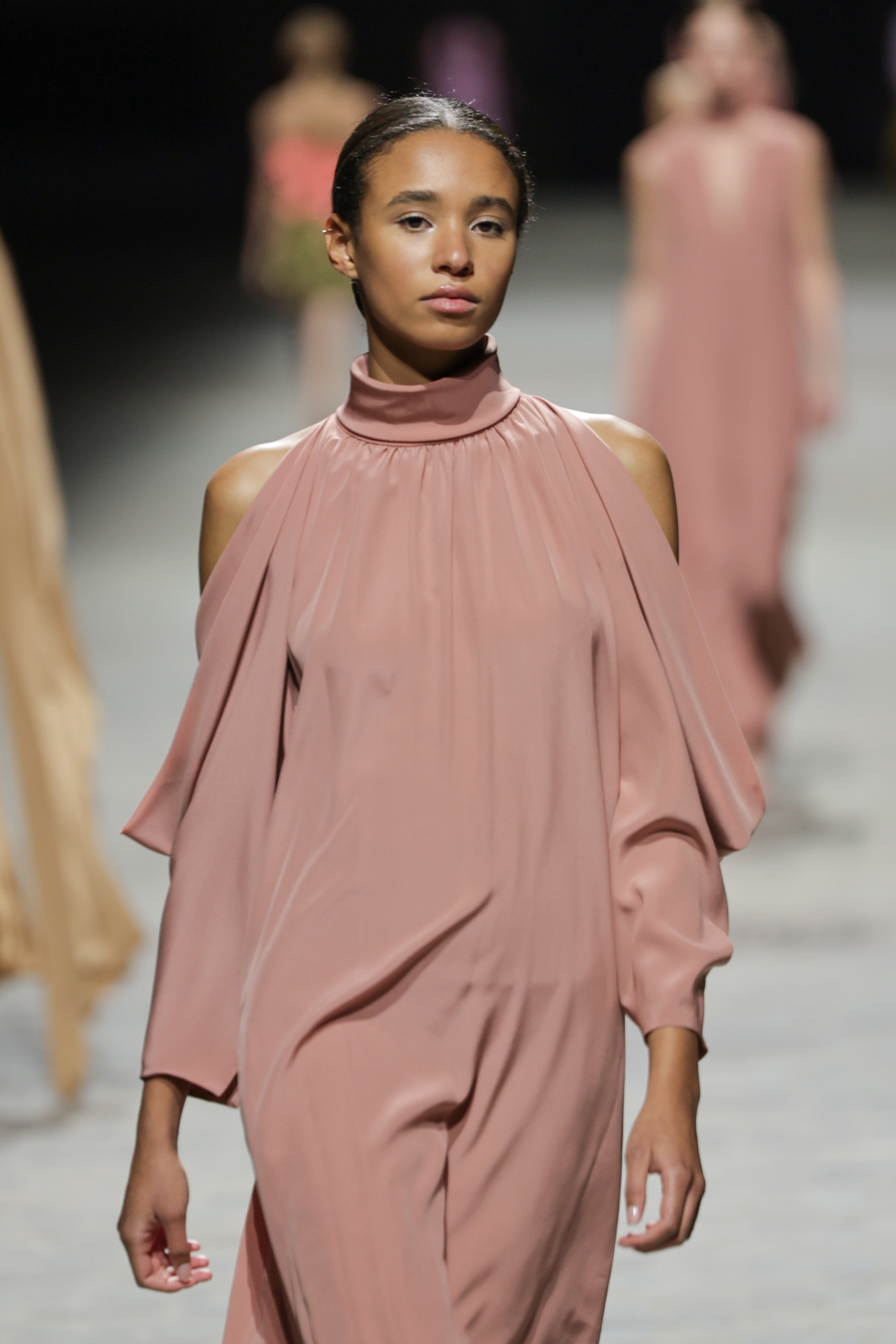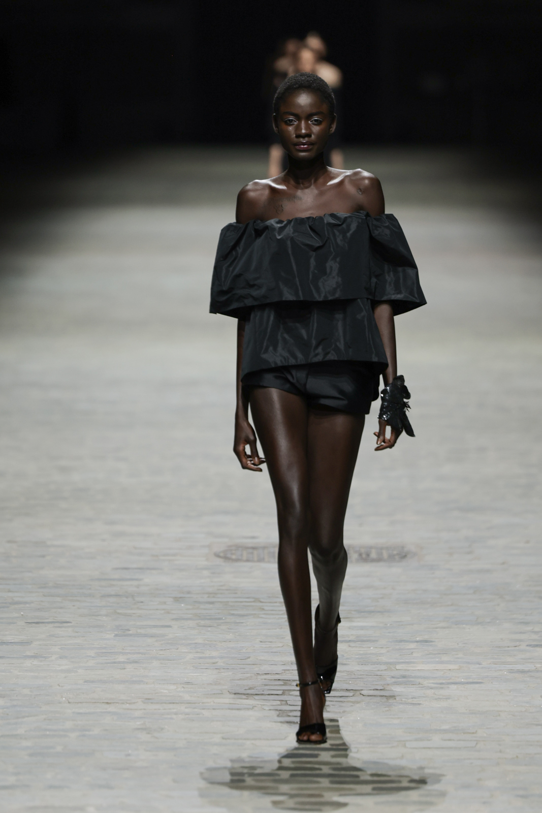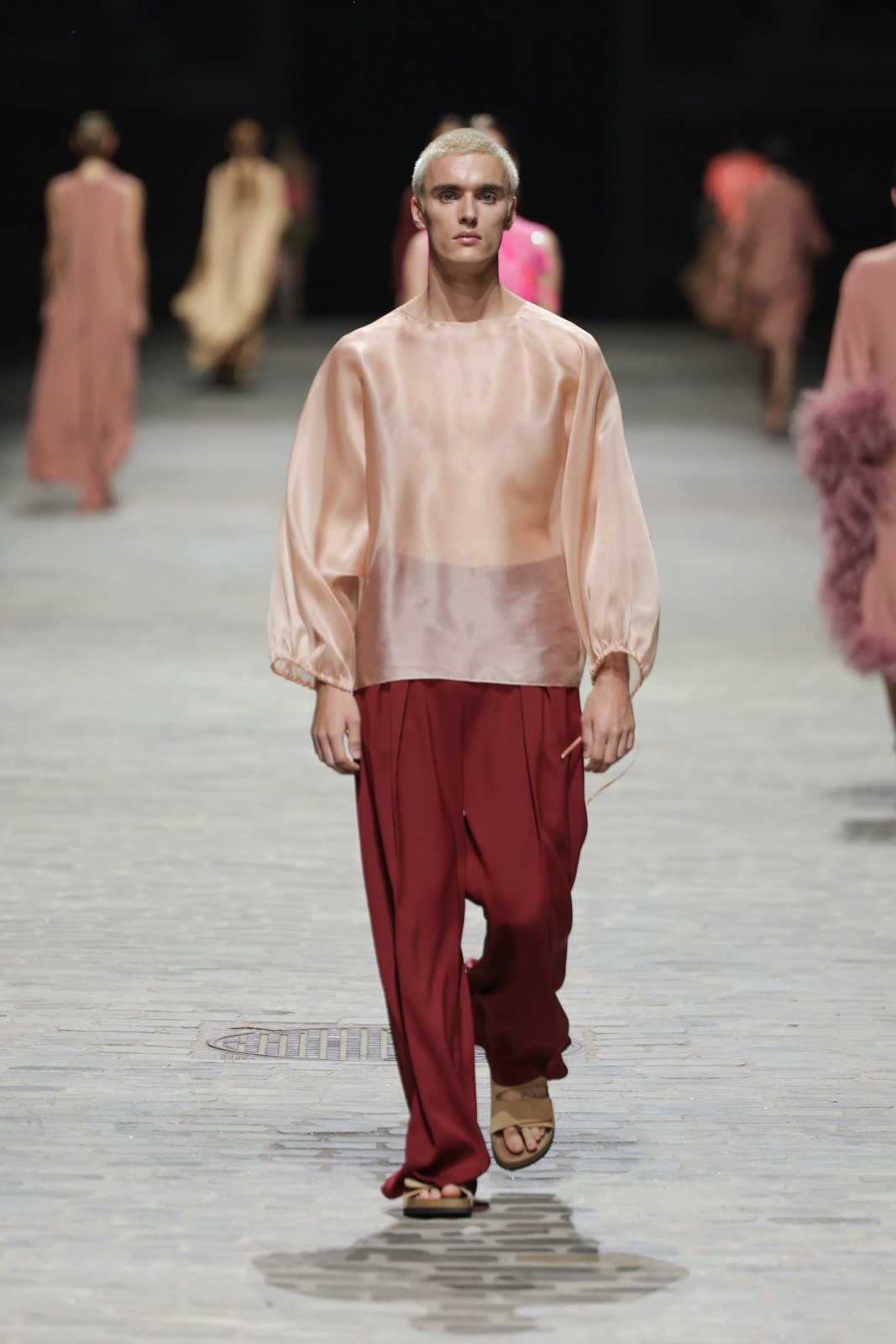 L’attention aux détails est manifeste dans le travail des plumes, des perlages, et des coiffes pailletées, enrichissant chaque création d’une touche de fantaisie couture. Les jeux de transparence, les volumes structurés et les silhouettes évasées à effet crinoline viennent sublimer la féminité, tandis que les pièces en maille luxueuse et les pantalons de mousseline offrent un contrepoint contemporain à cette célébration du savoir-faire tailleur.