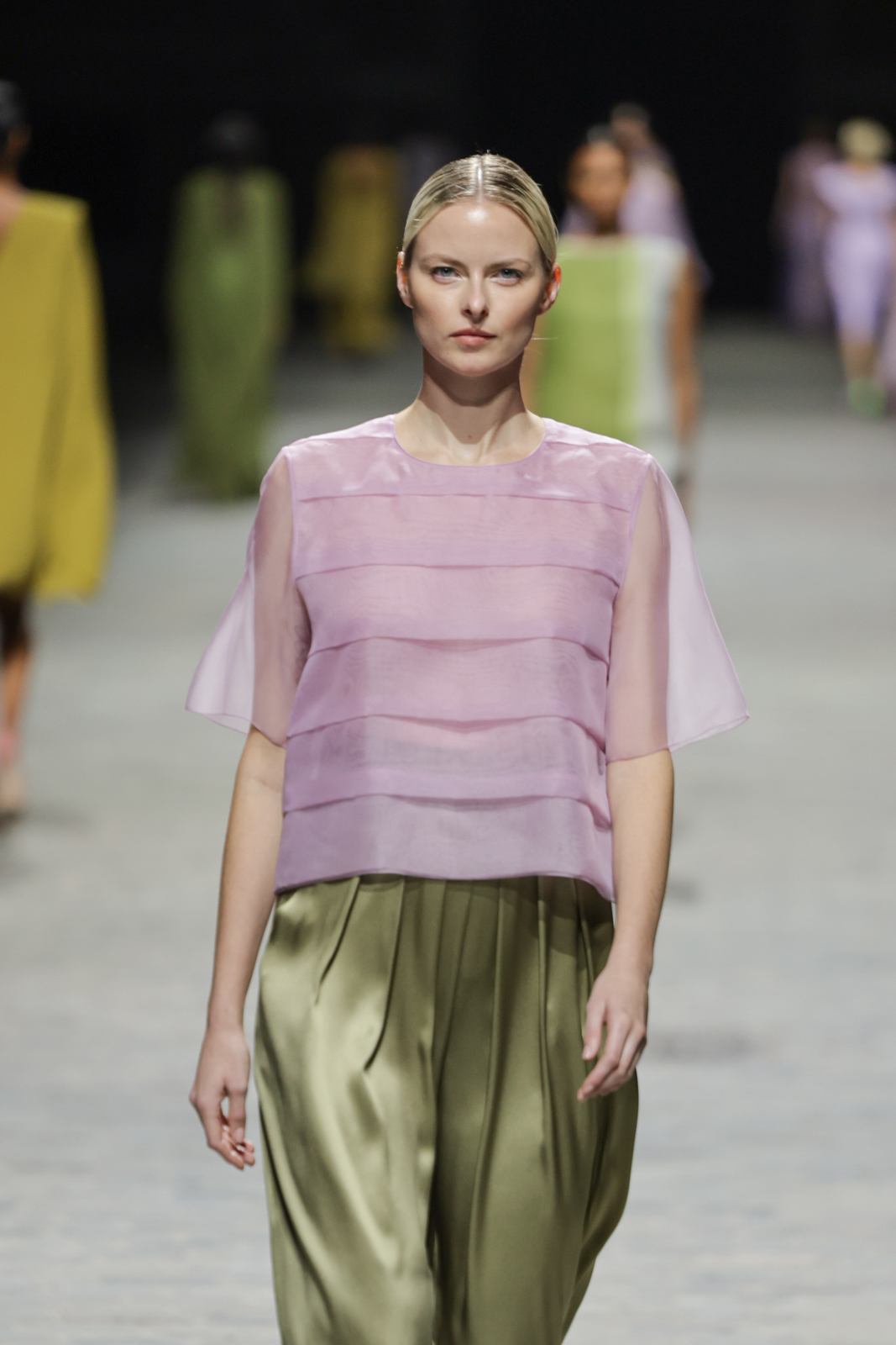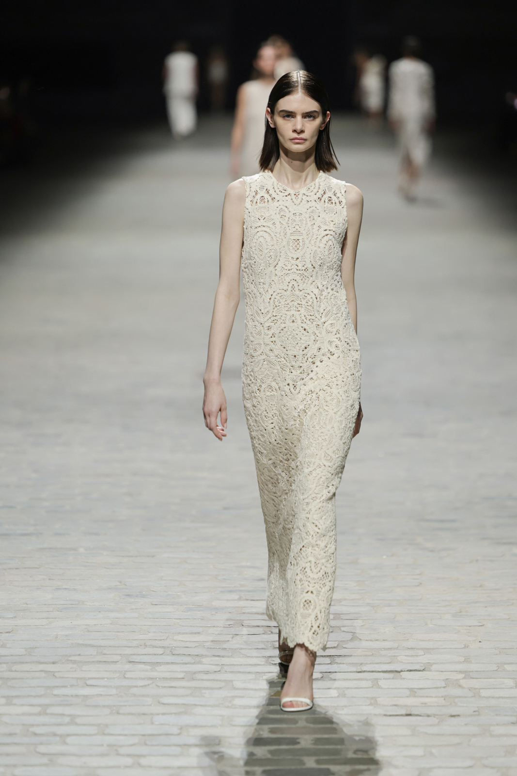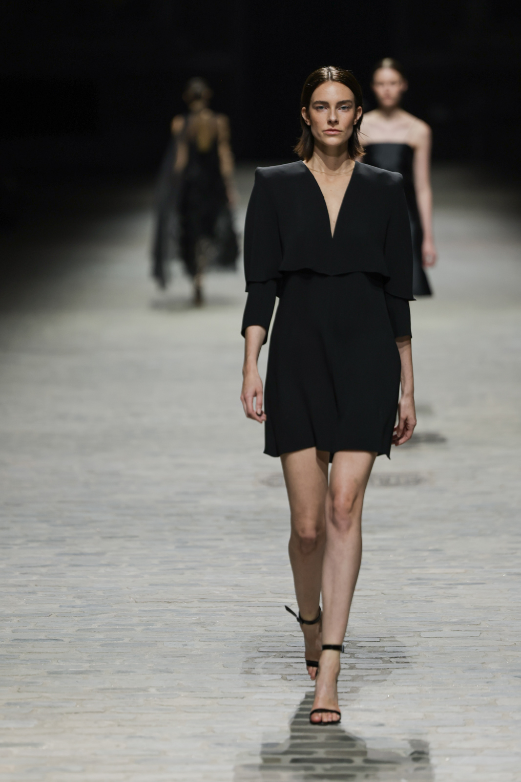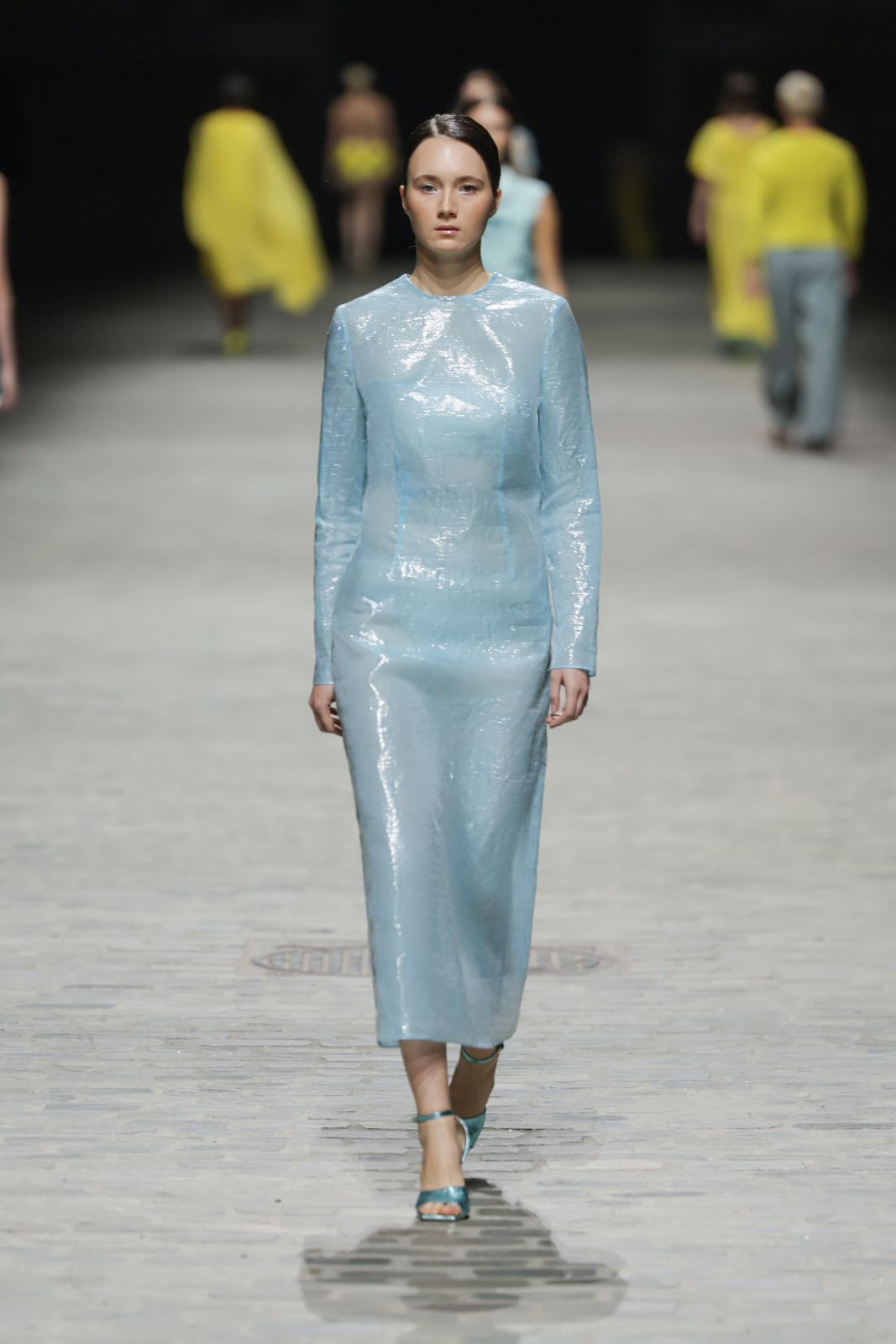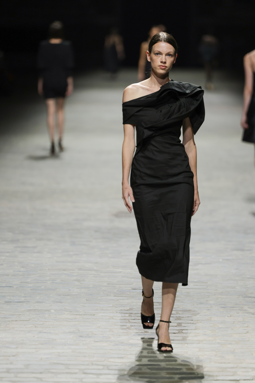 L’attention aux détails est manifeste dans le travail des plumes, des perlages, et des coiffes pailletées, enrichissant chaque création d’une touche de fantaisie couture. Les jeux de transparence, les volumes structurés et les silhouettes évasées à effet crinoline viennent sublimer la féminité, tandis que les pièces en maille luxueuse et les pantalons de mousseline offrent un contrepoint contemporain à cette célébration du savoir-faire tailleur.