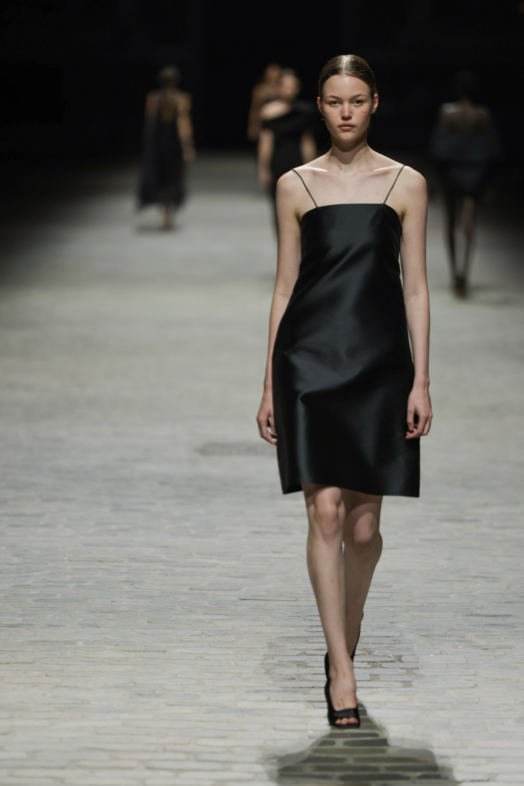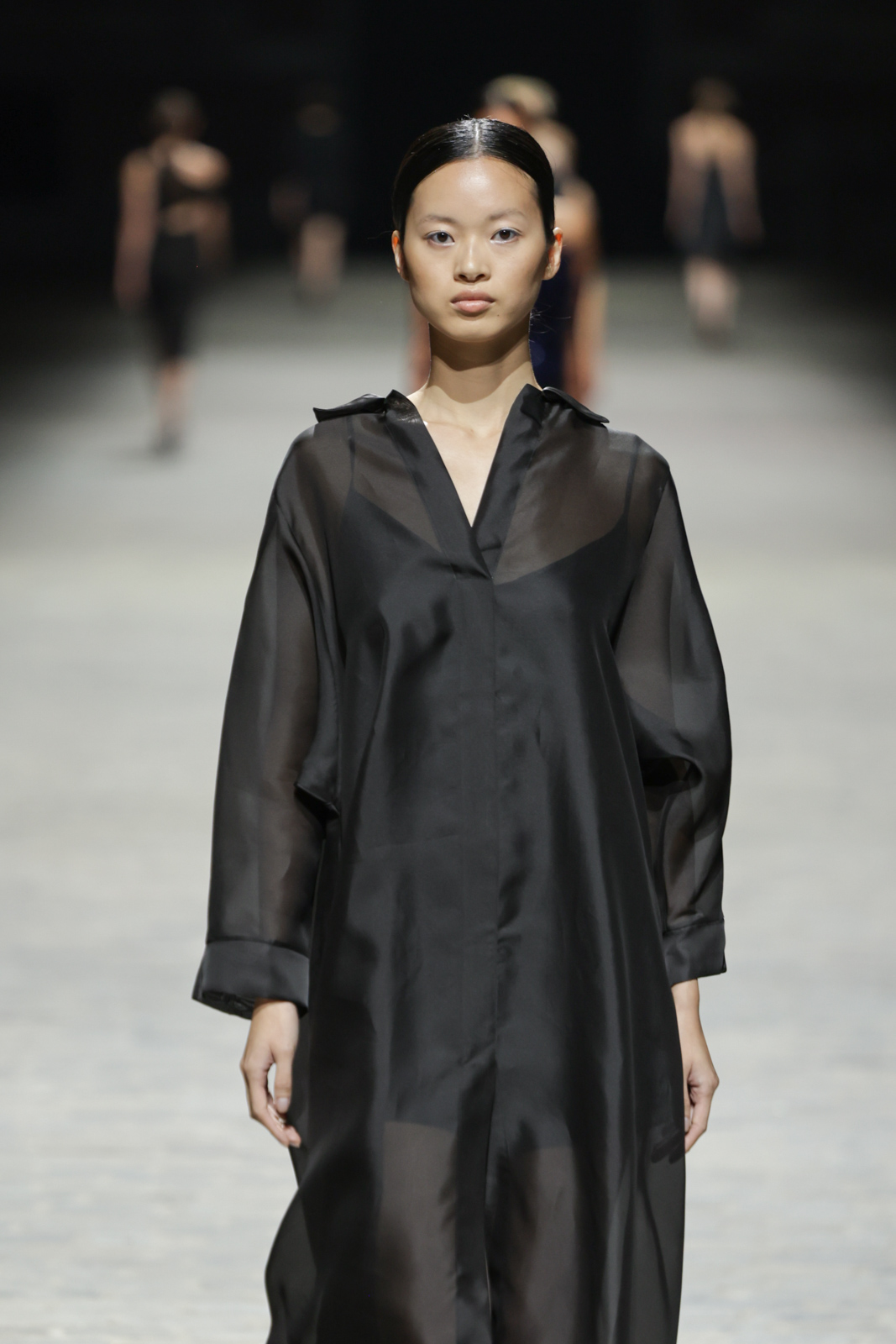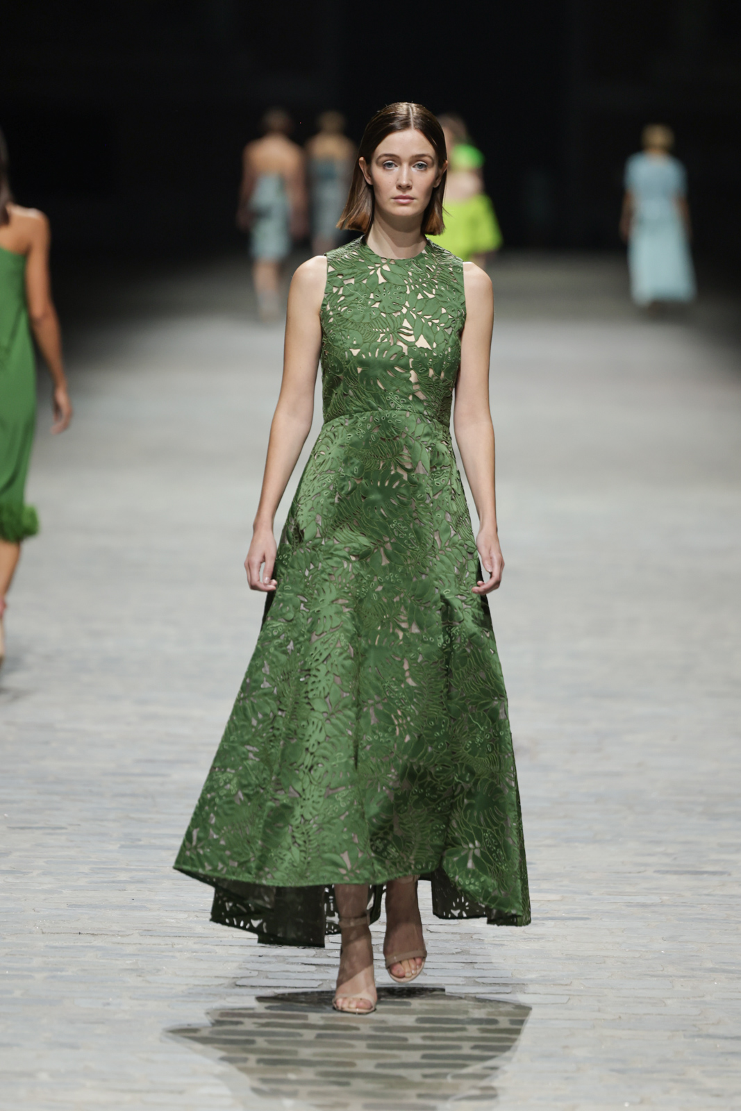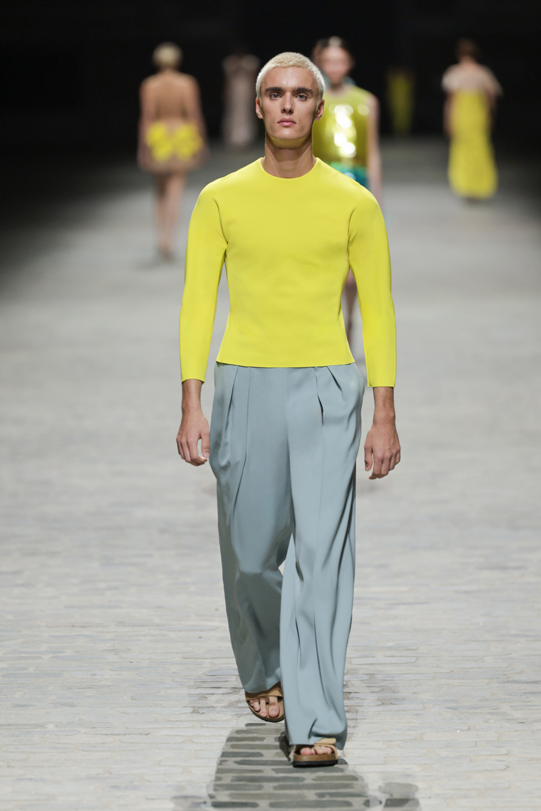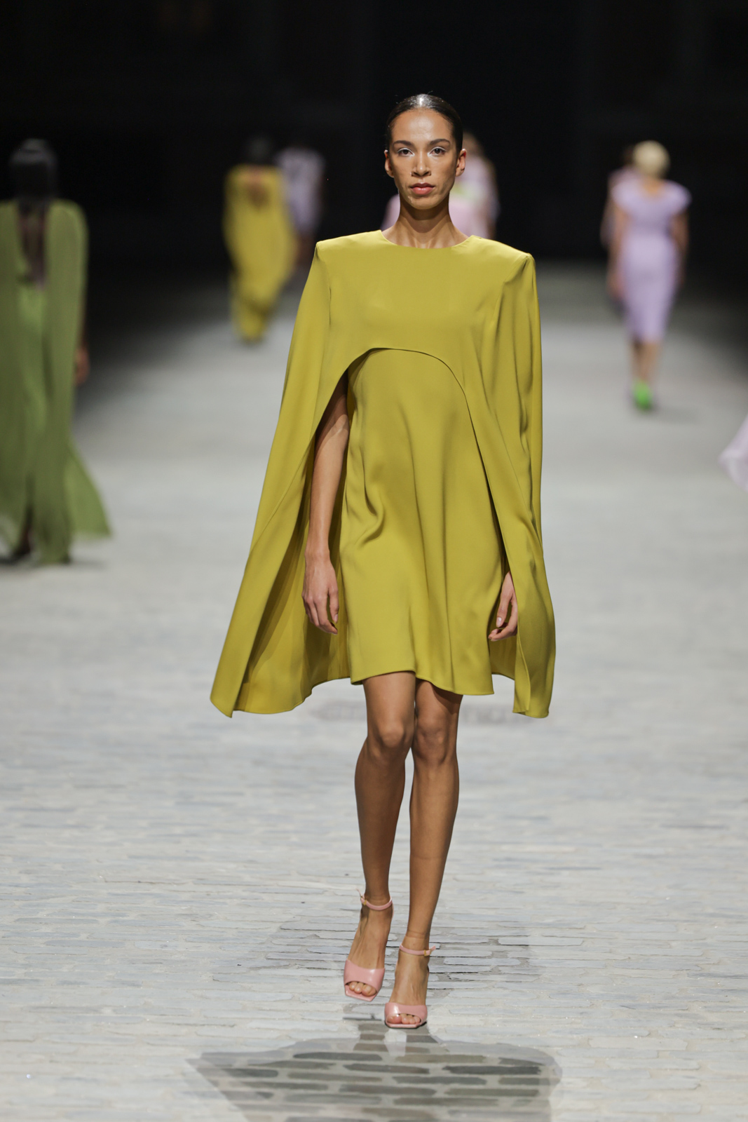 L’attention aux détails est manifeste dans le travail des plumes, des perlages, et des coiffes pailletées, enrichissant chaque création d’une touche de fantaisie couture. Les jeux de transparence, les volumes structurés et les silhouettes évasées à effet crinoline viennent sublimer la féminité, tandis que les pièces en maille luxueuse et les pantalons de mousseline offrent un contrepoint contemporain à cette célébration du savoir-faire tailleur.