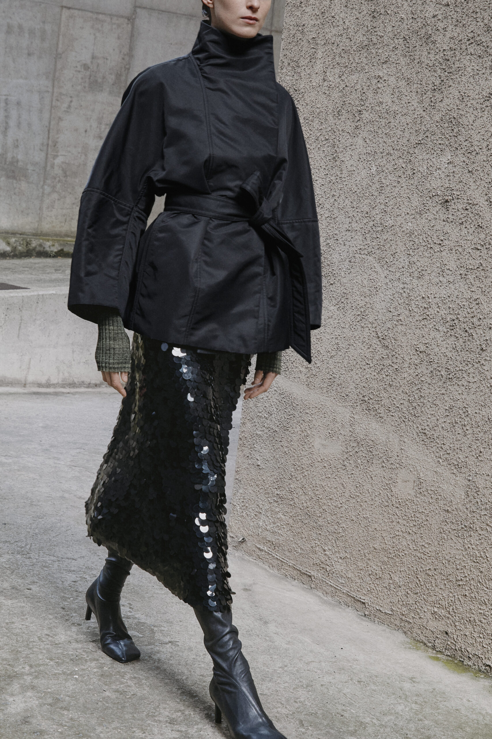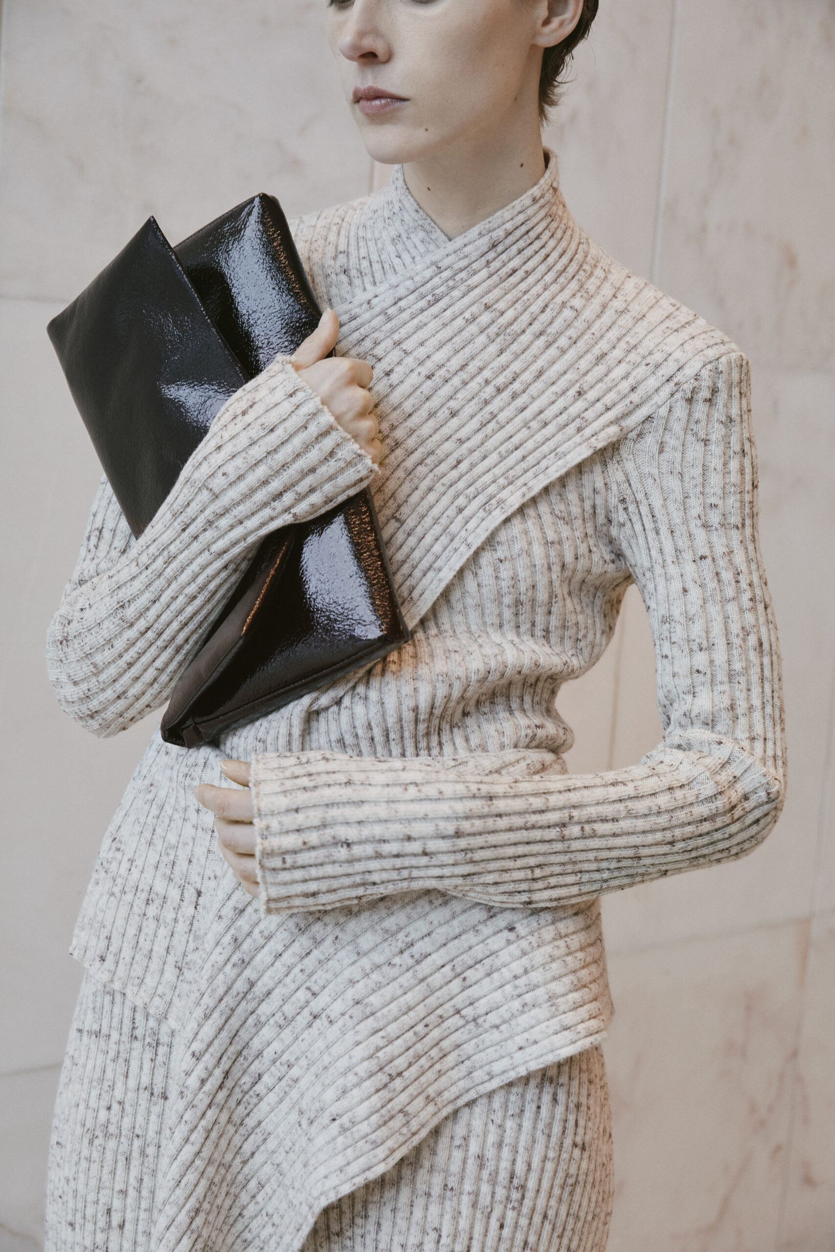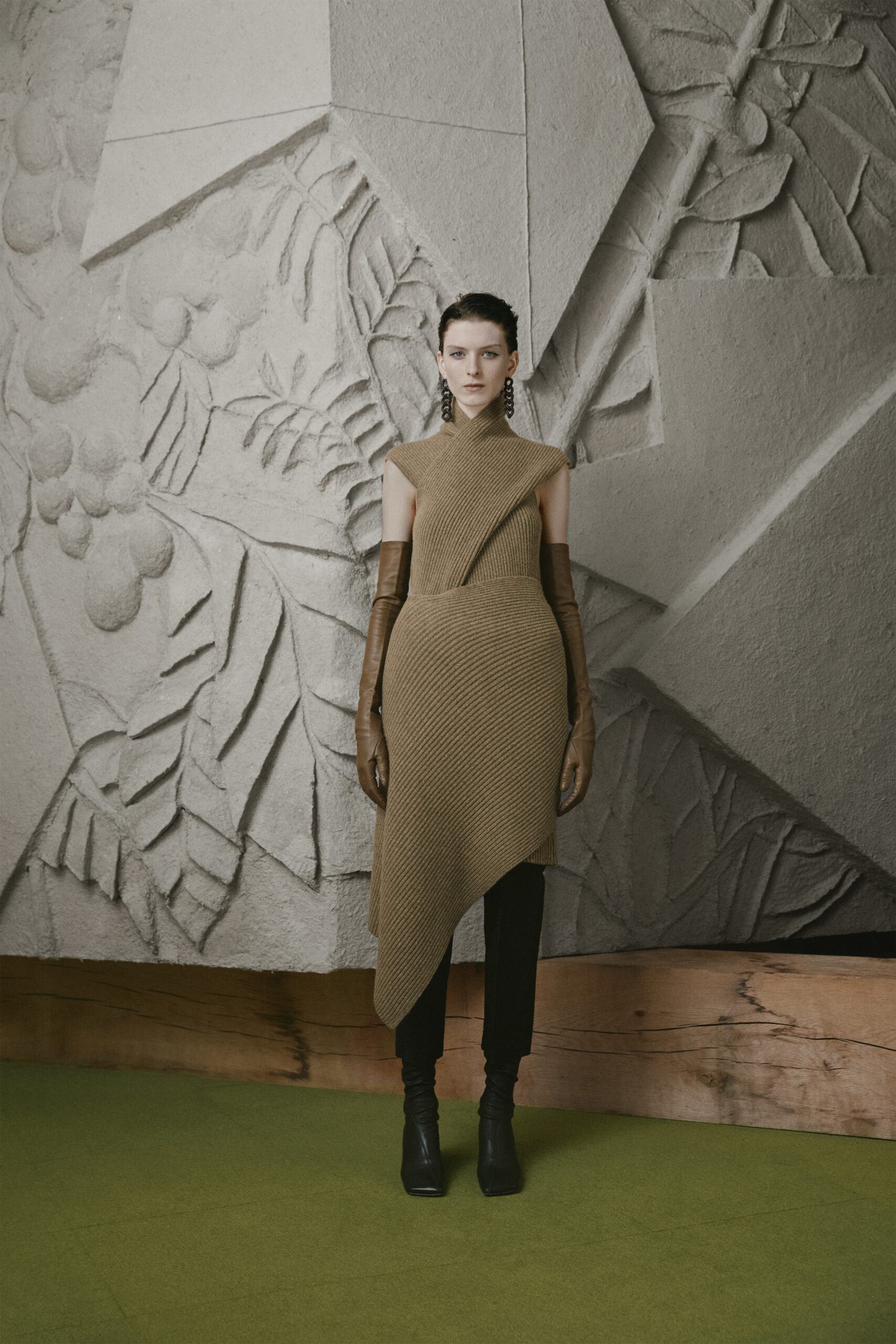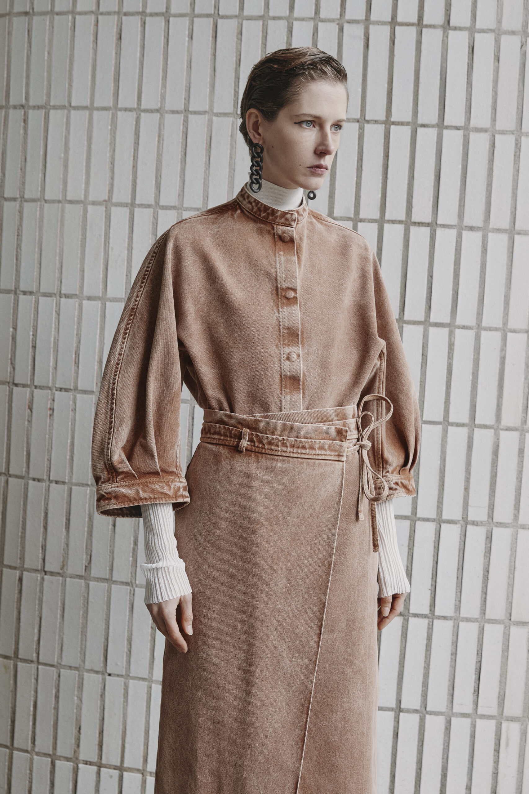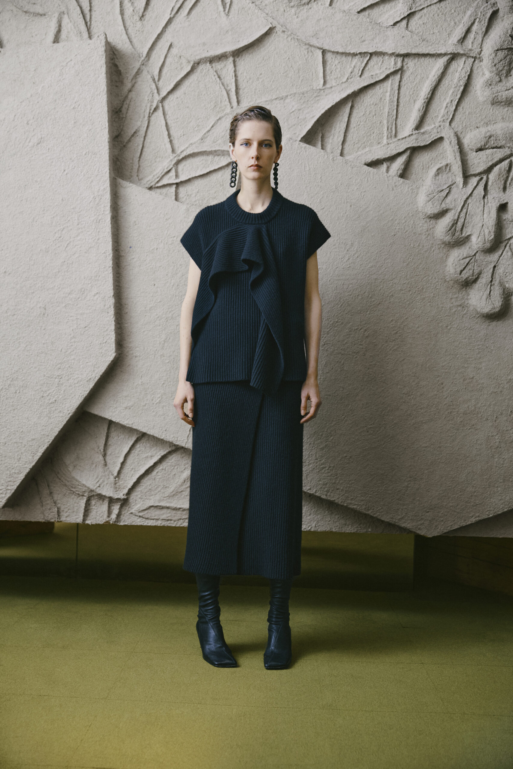 L’innovation se poursuit avec le tricot de cette saison, caractérisé par un jeu de drapés et de superpositions. Les matériaux, choisis pour leur écho à la nature – tels que la soie charmeuse, le lin, la suri alpaca, la laine enduite, le mélange de yak et de cachemire – offrent profondeur et confort, soulignant l’engagement du créateur envers une mode à la fois réfléchie et accessible.