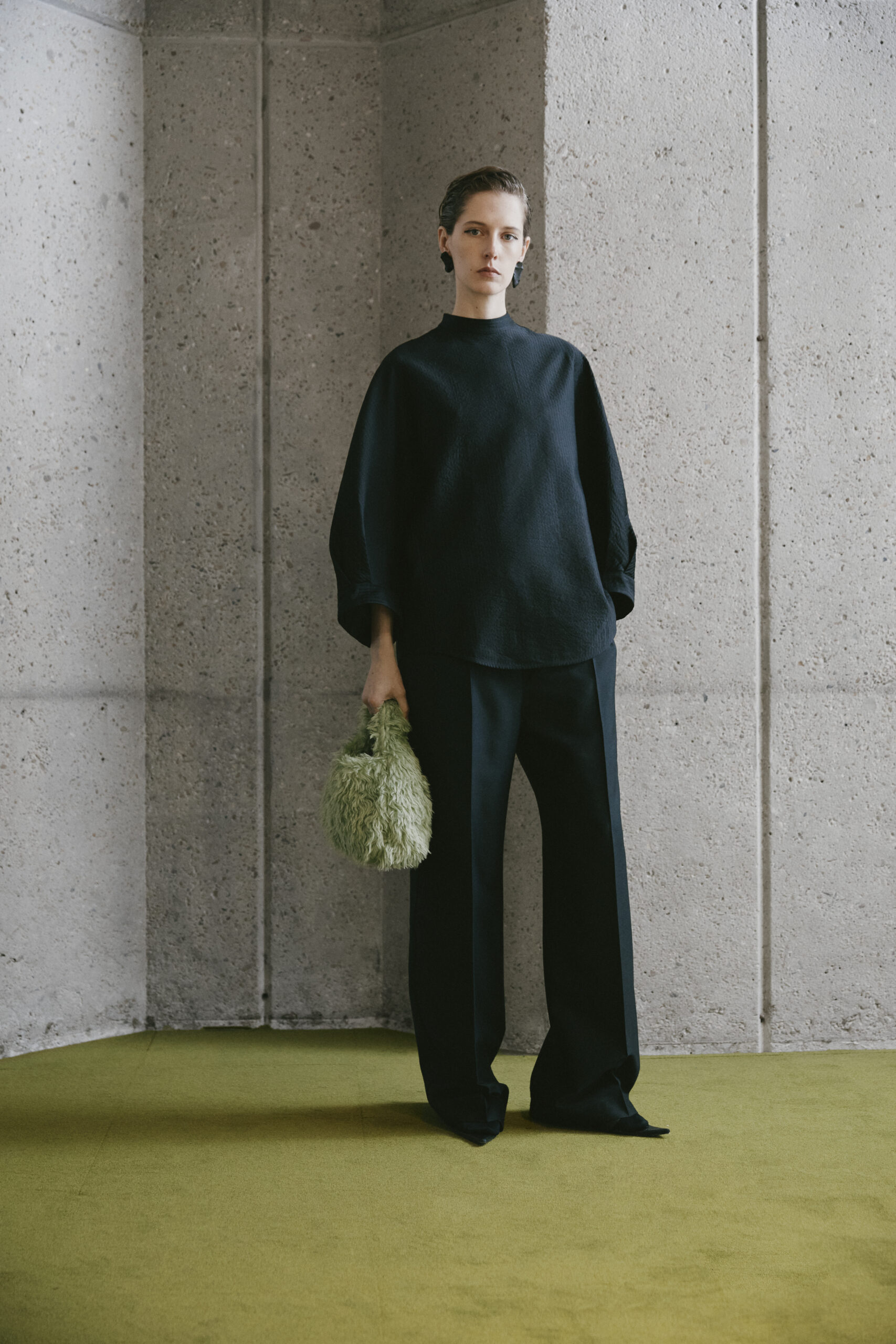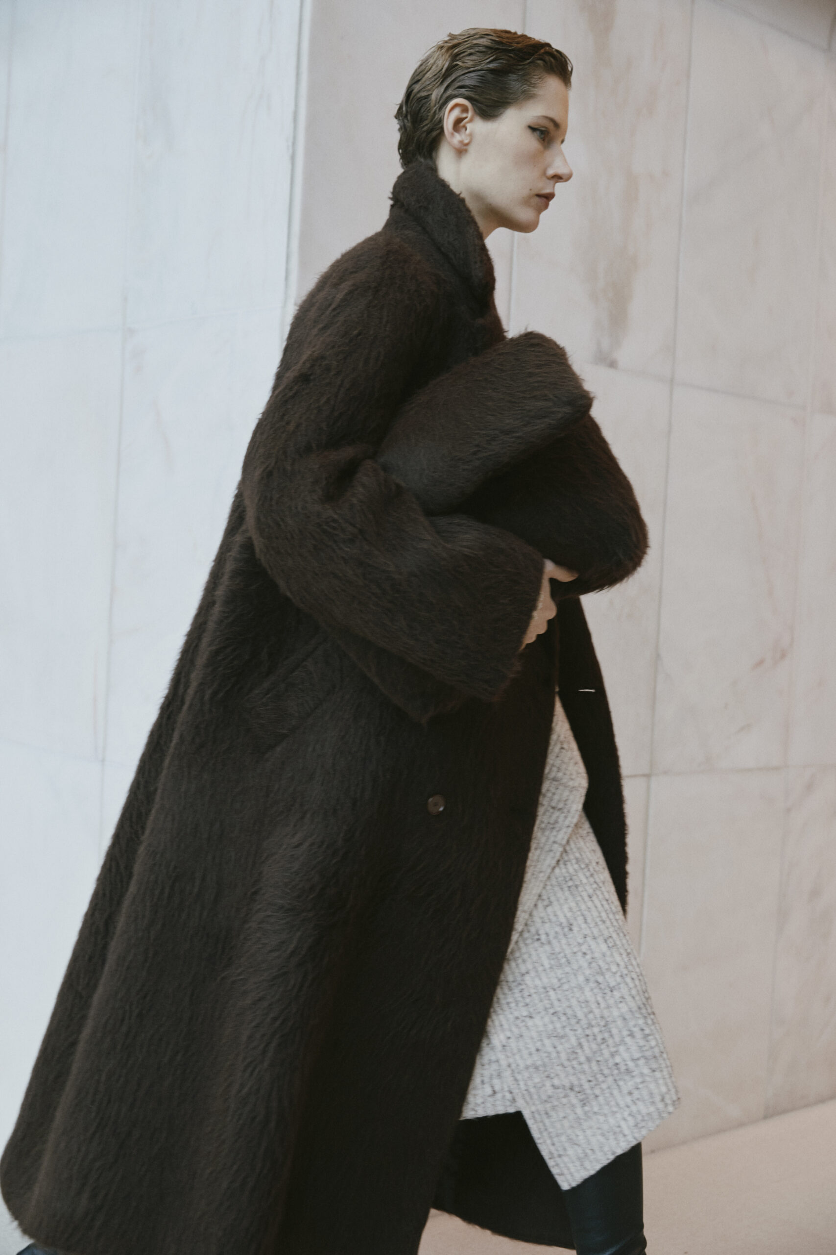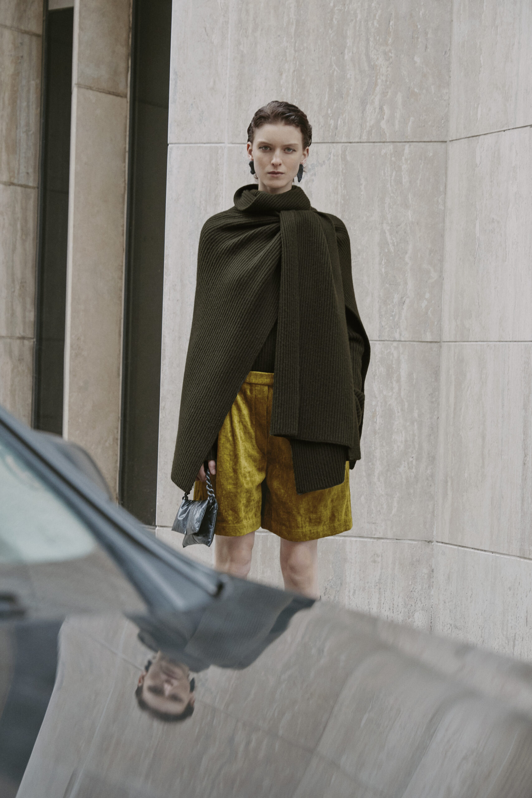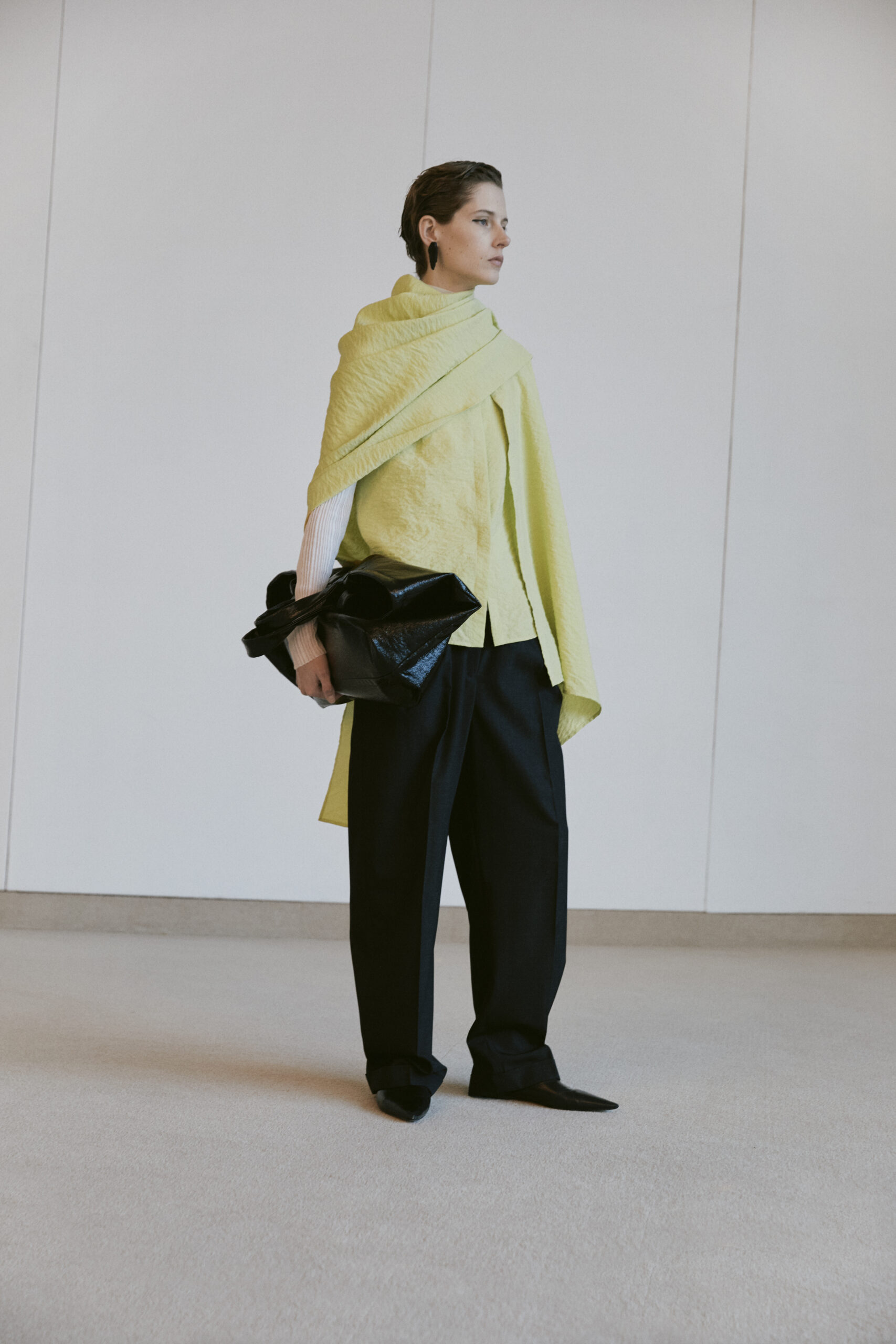 L’innovation se poursuit avec le tricot de cette saison, caractérisé par un jeu de drapés et de superpositions. Les matériaux, choisis pour leur écho à la nature – tels que la soie charmeuse, le lin, la suri alpaca, la laine enduite, le mélange de yak et de cachemire – offrent profondeur et confort, soulignant l’engagement du créateur envers une mode à la fois réfléchie et accessible.