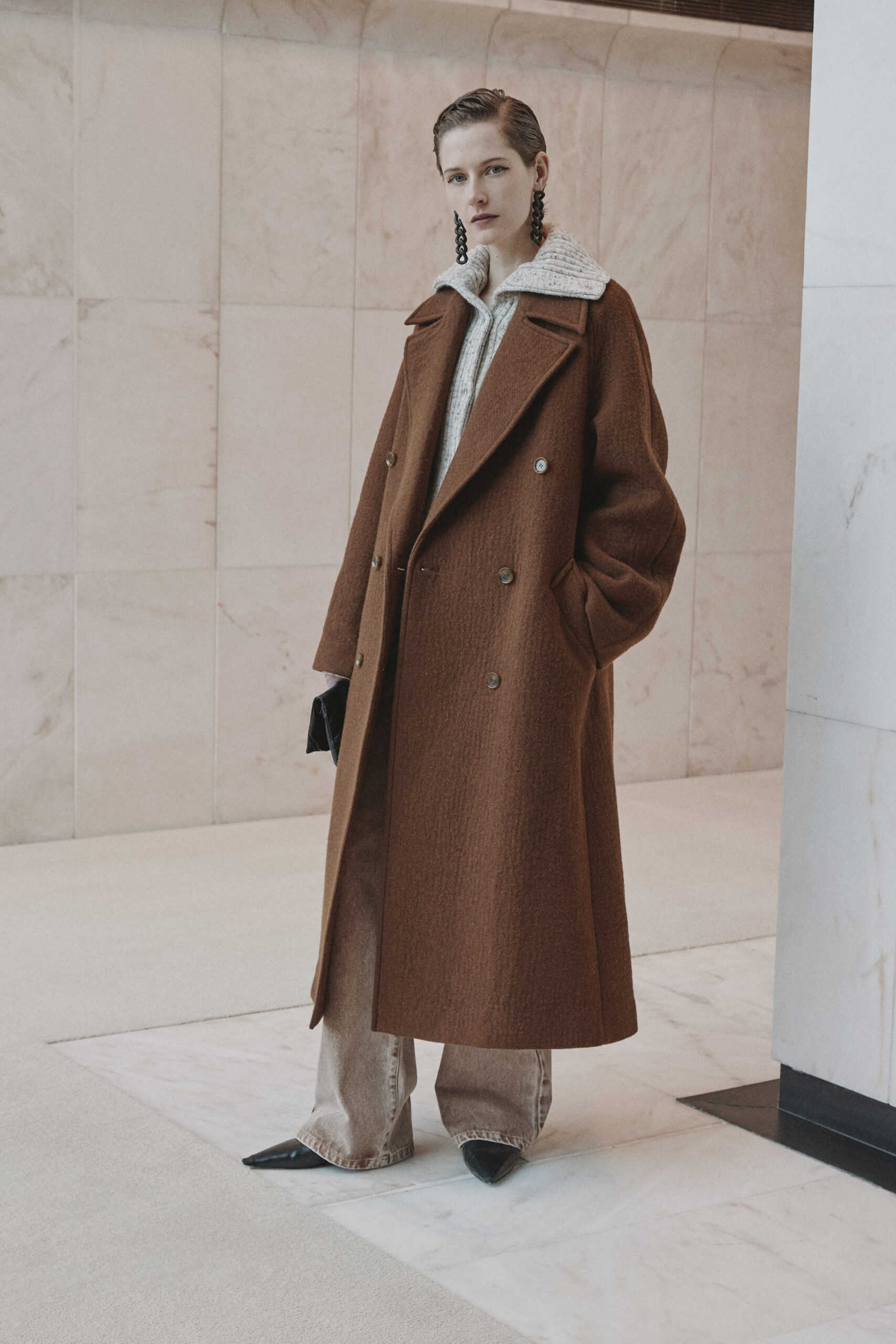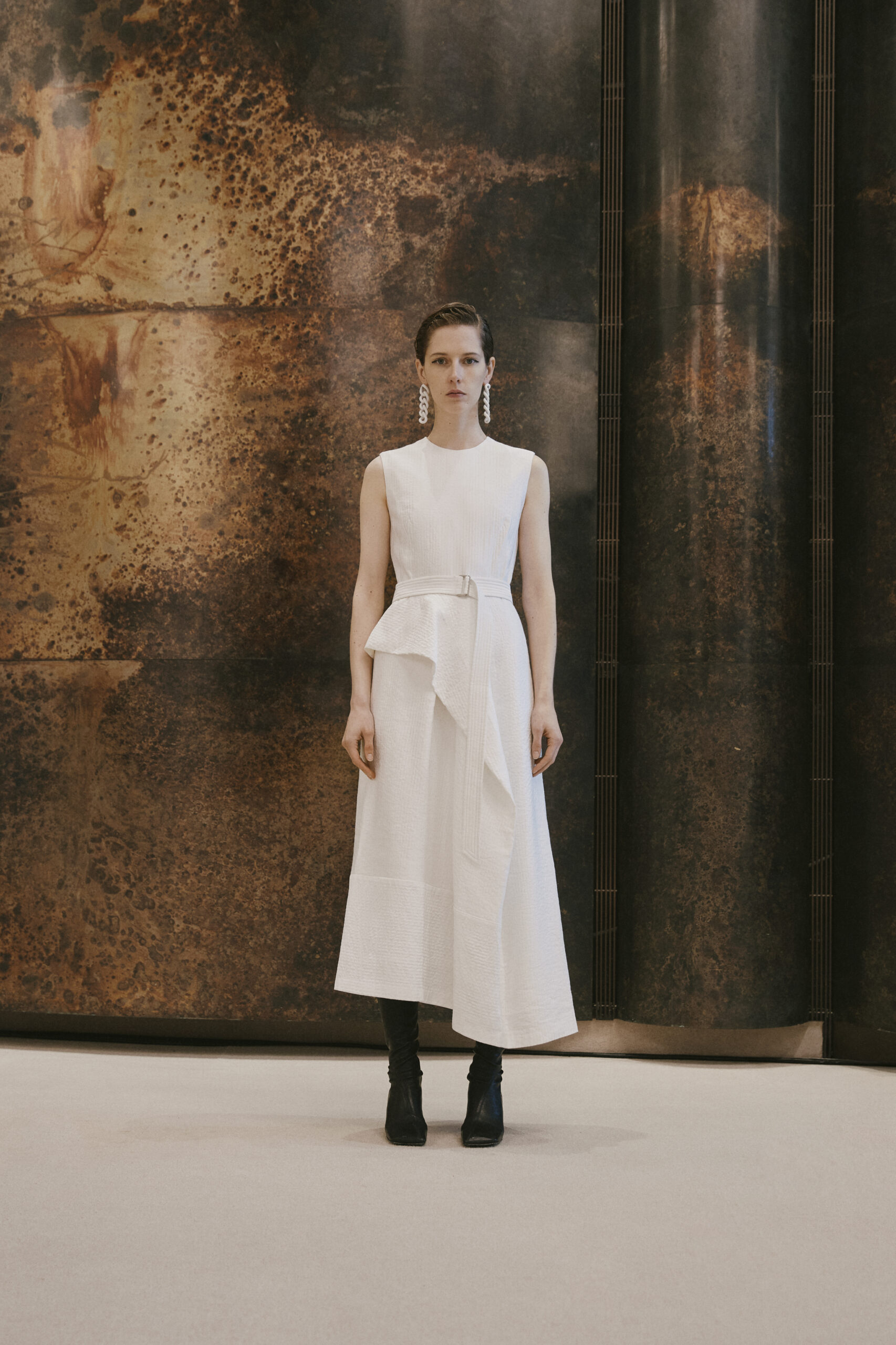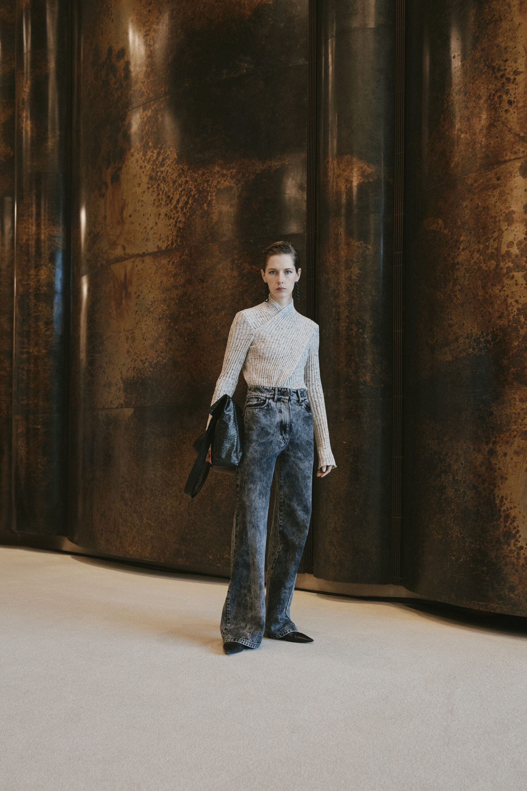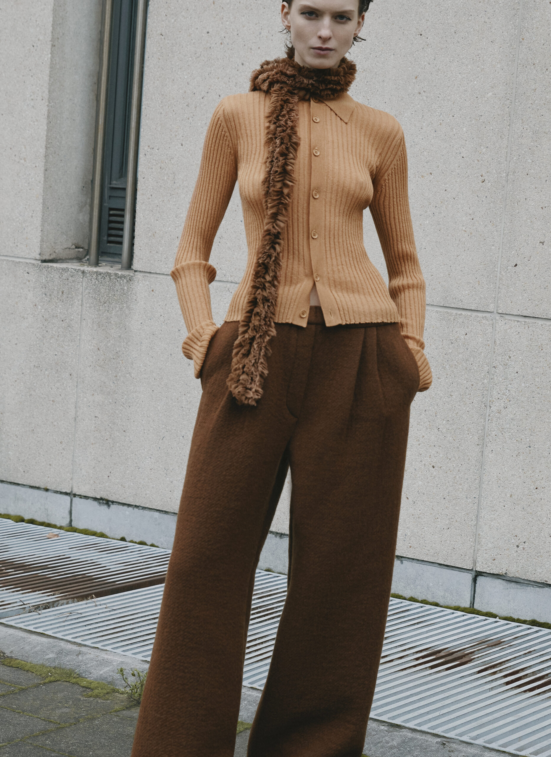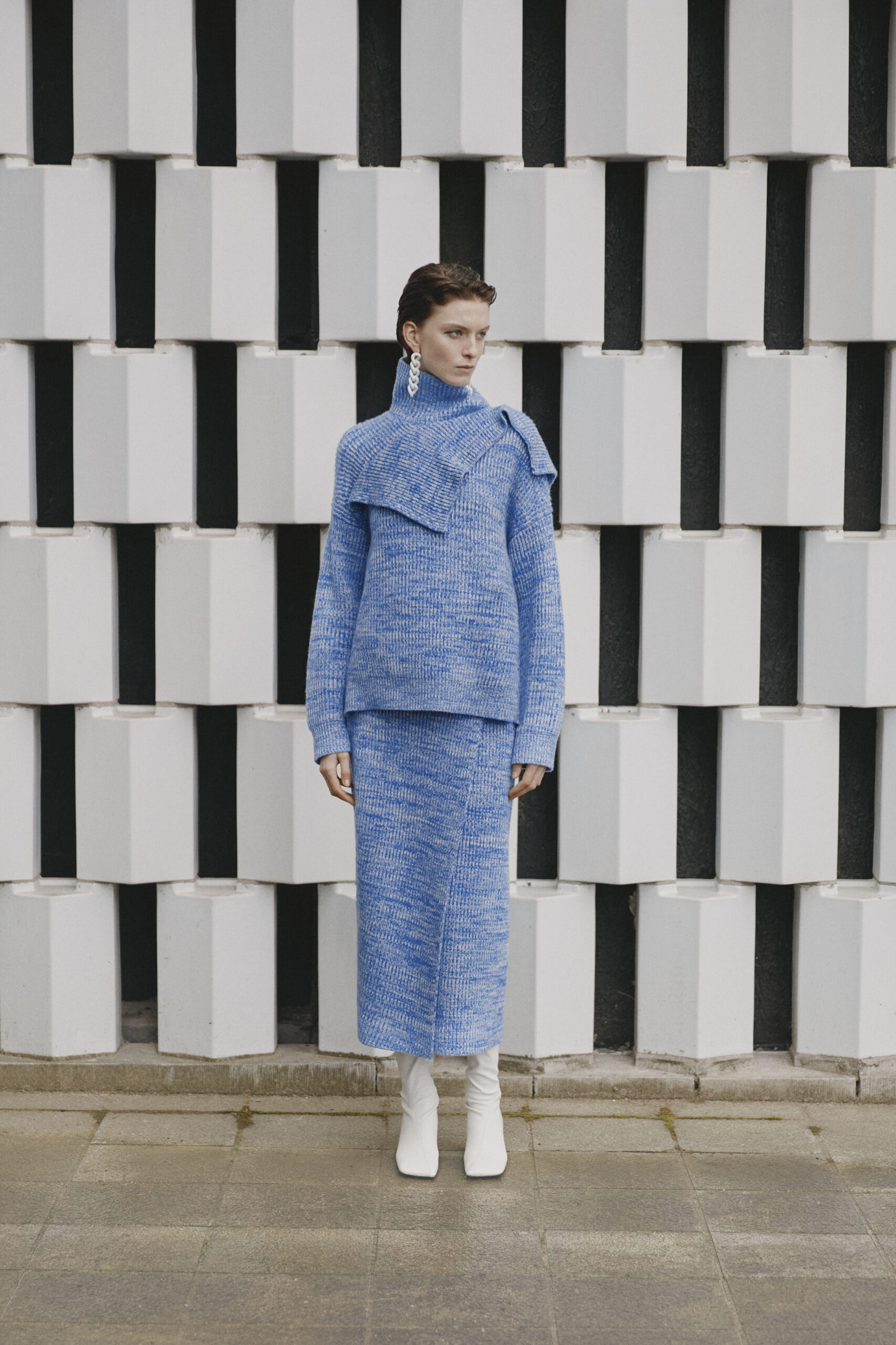 L’innovation se poursuit avec le tricot de cette saison, caractérisé par un jeu de drapés et de superpositions. Les matériaux, choisis pour leur écho à la nature – tels que la soie charmeuse, le lin, la suri alpaca, la laine enduite, le mélange de yak et de cachemire – offrent profondeur et confort, soulignant l’engagement du créateur envers une mode à la fois réfléchie et accessible.