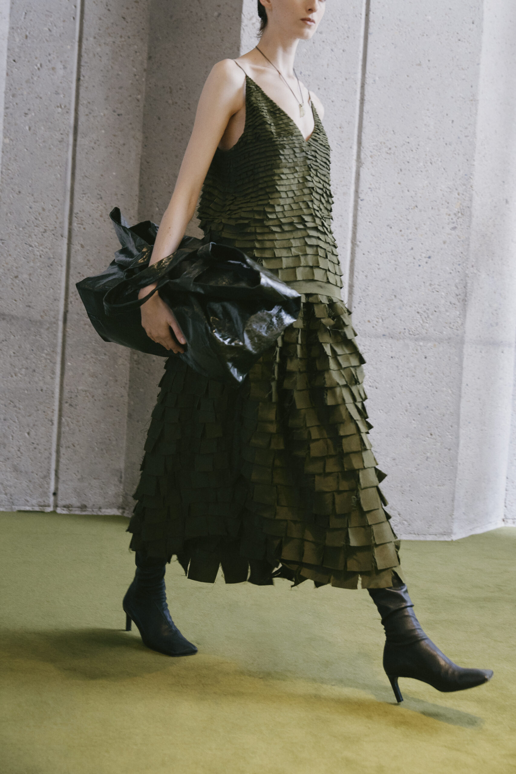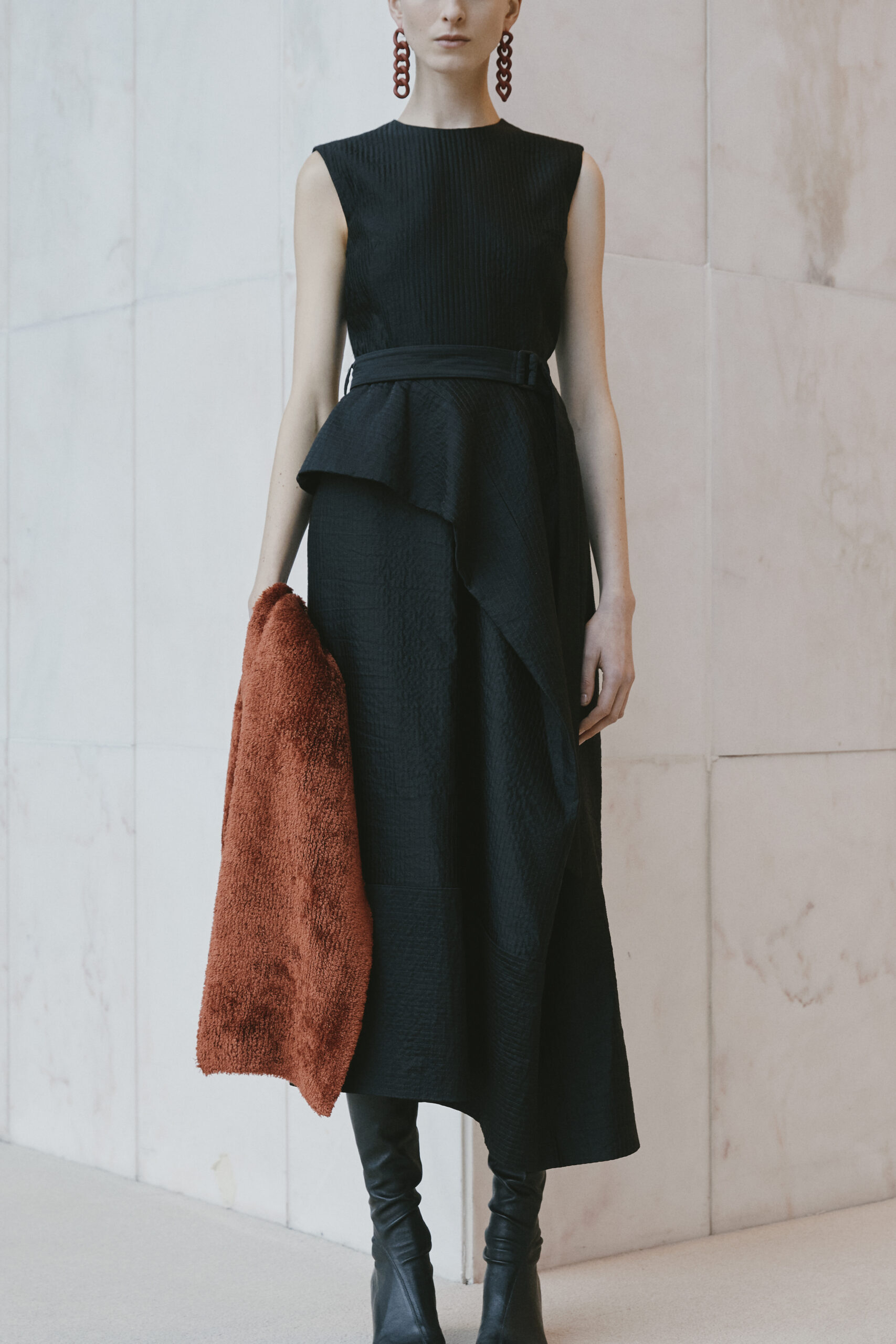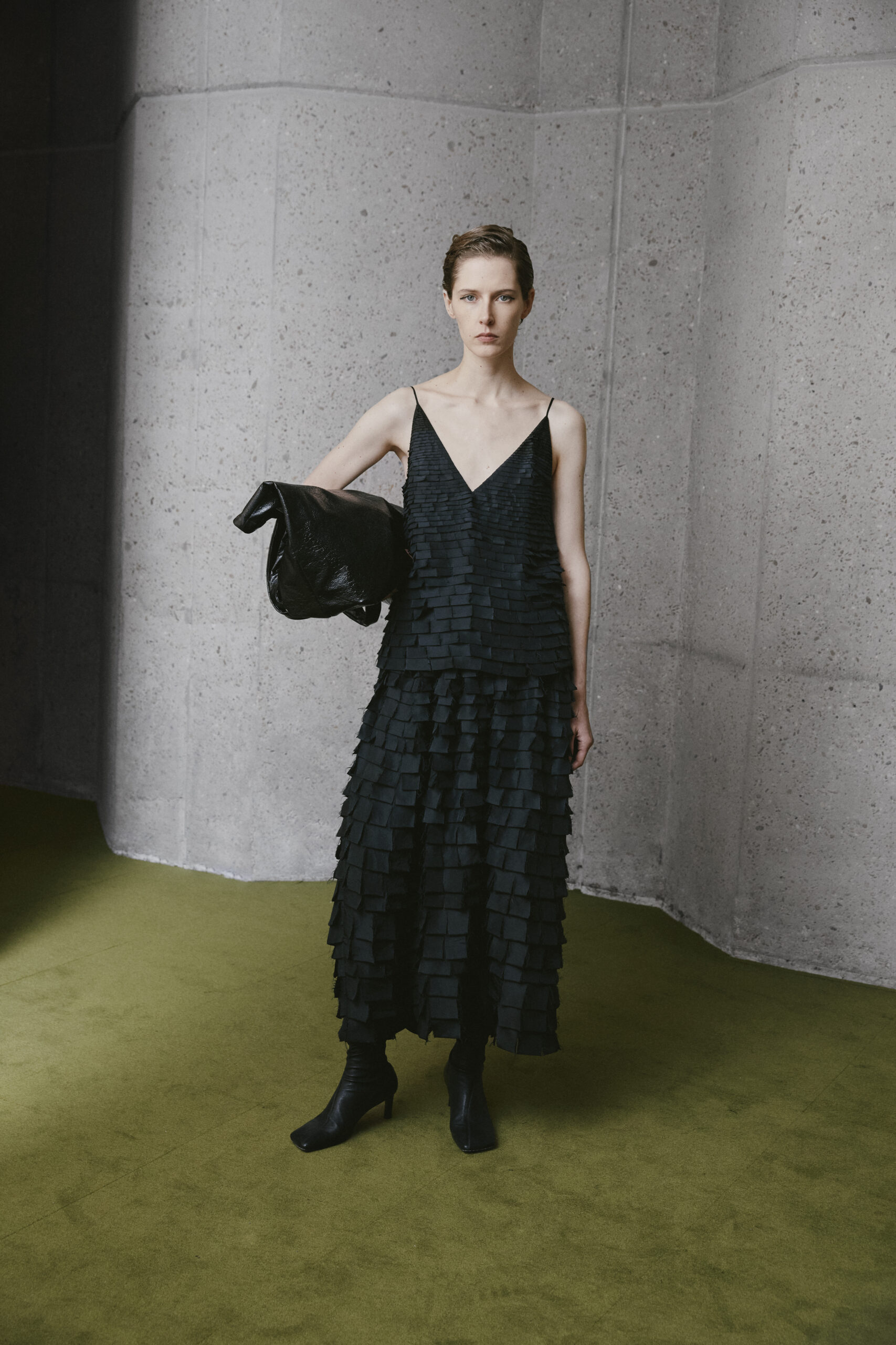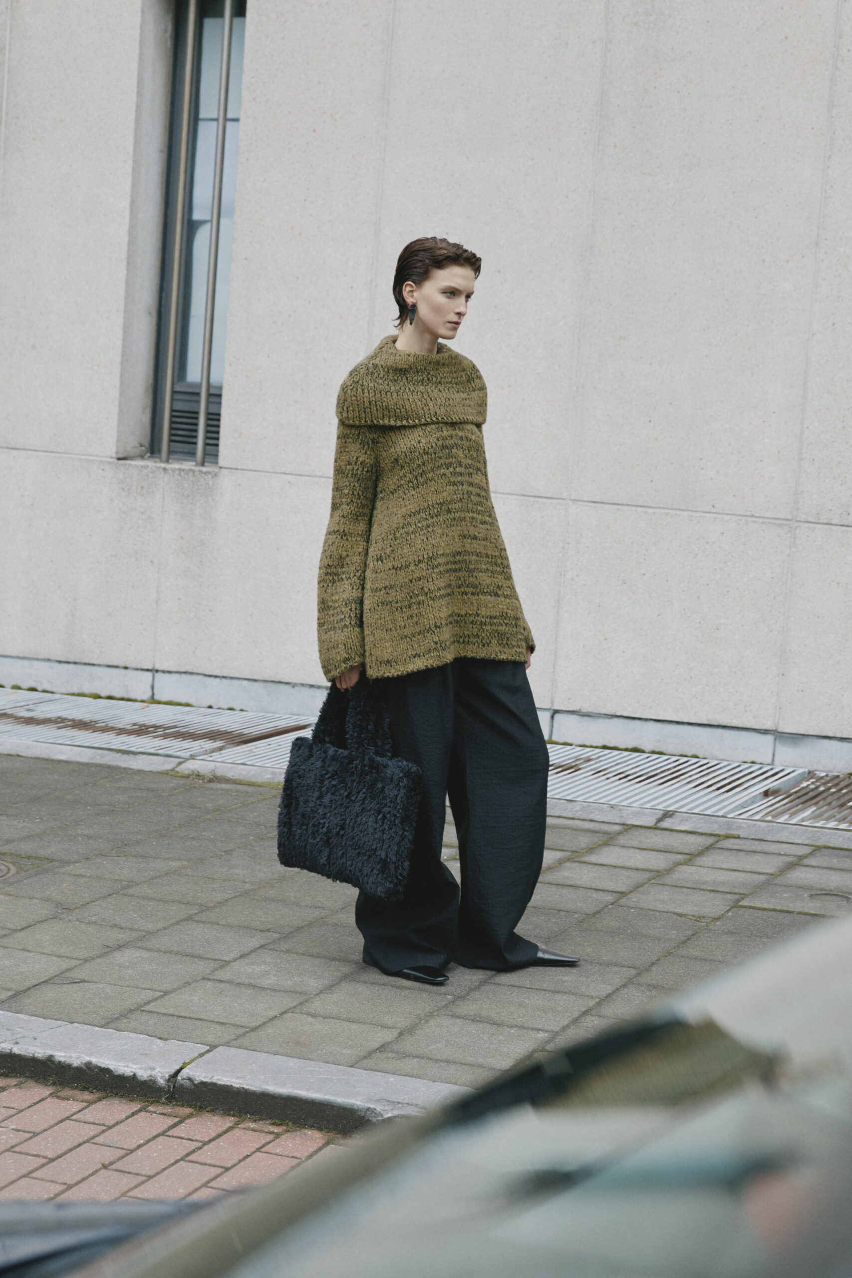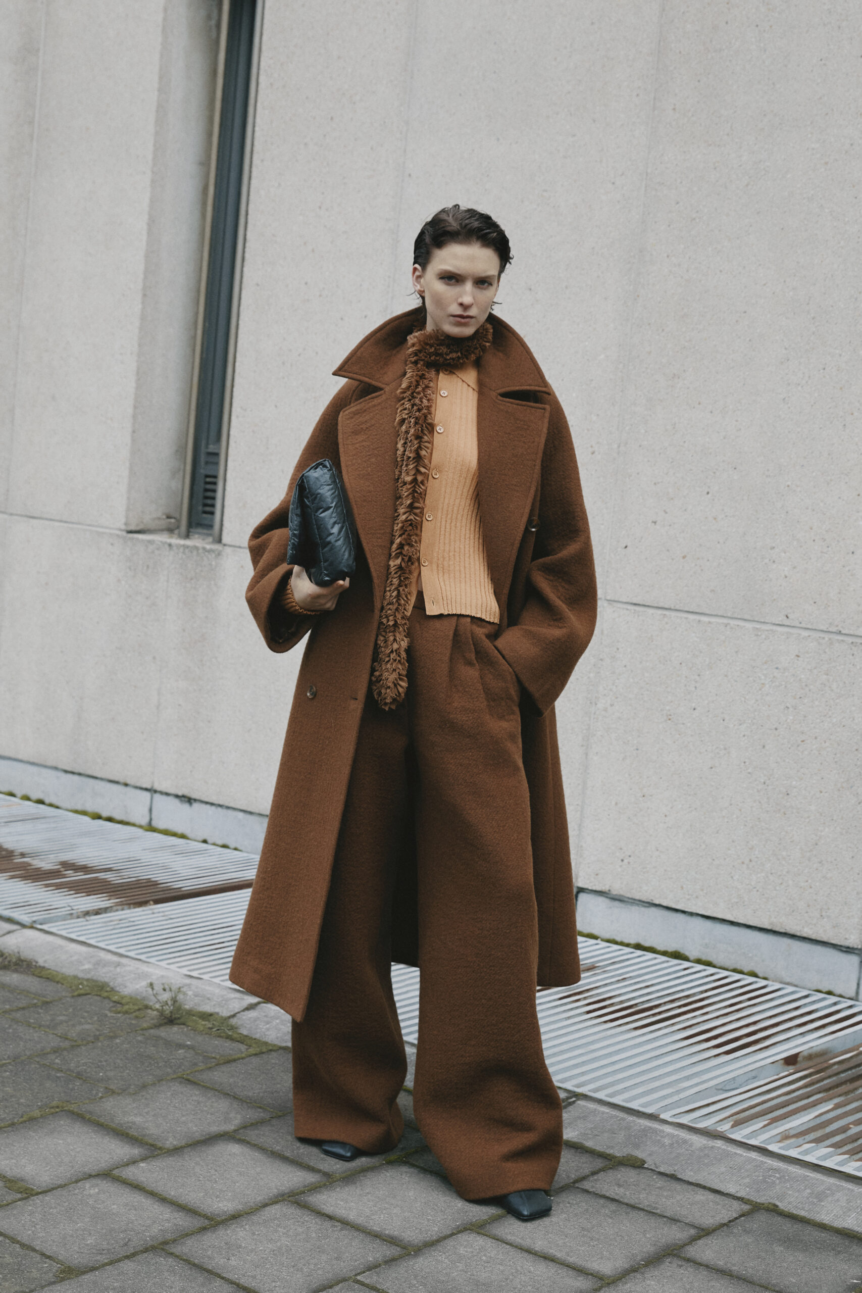 L’innovation se poursuit avec le tricot de cette saison, caractérisé par un jeu de drapés et de superpositions. Les matériaux, choisis pour leur écho à la nature – tels que la soie charmeuse, le lin, la suri alpaca, la laine enduite, le mélange de yak et de cachemire – offrent profondeur et confort, soulignant l’engagement du créateur envers une mode à la fois réfléchie et accessible.