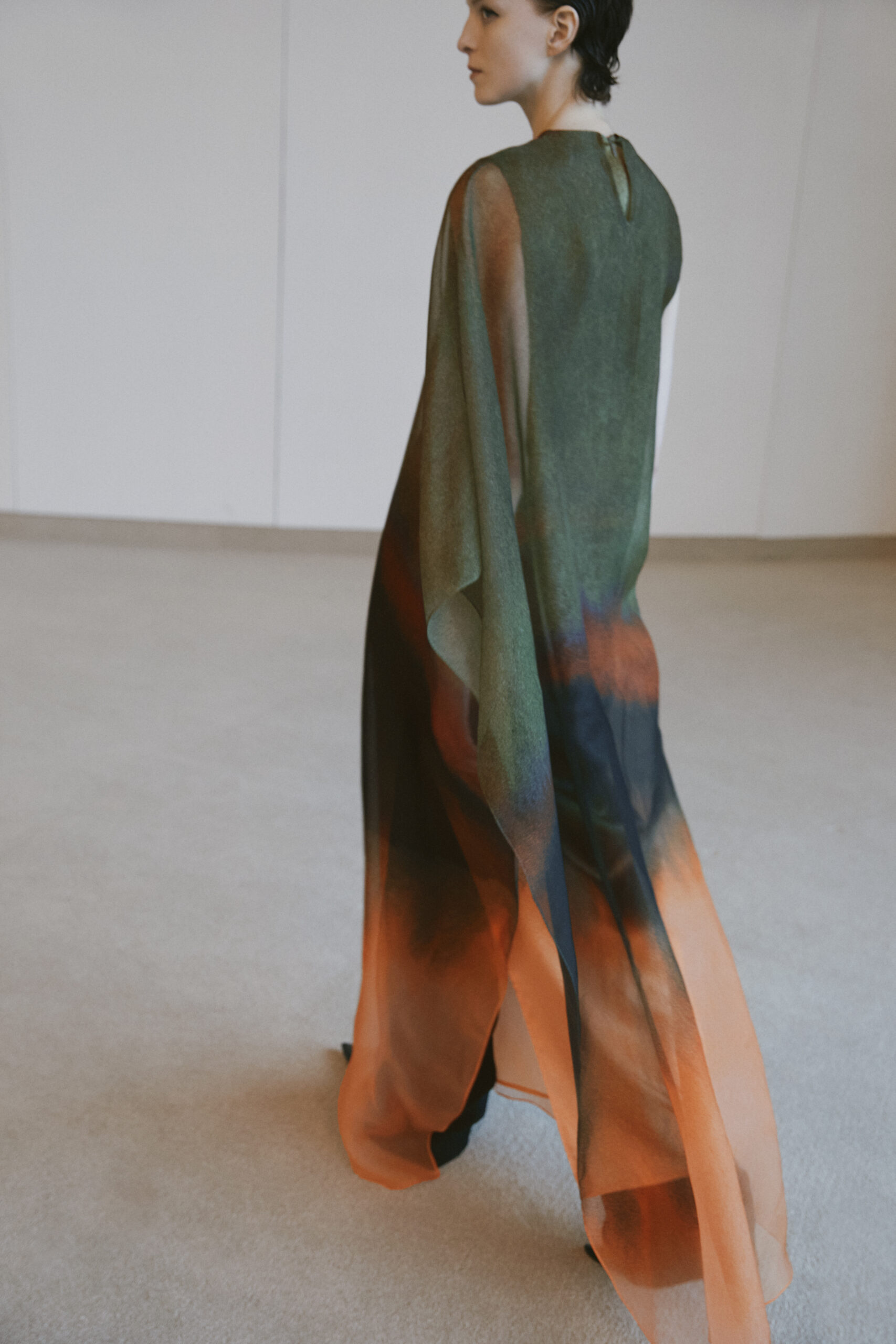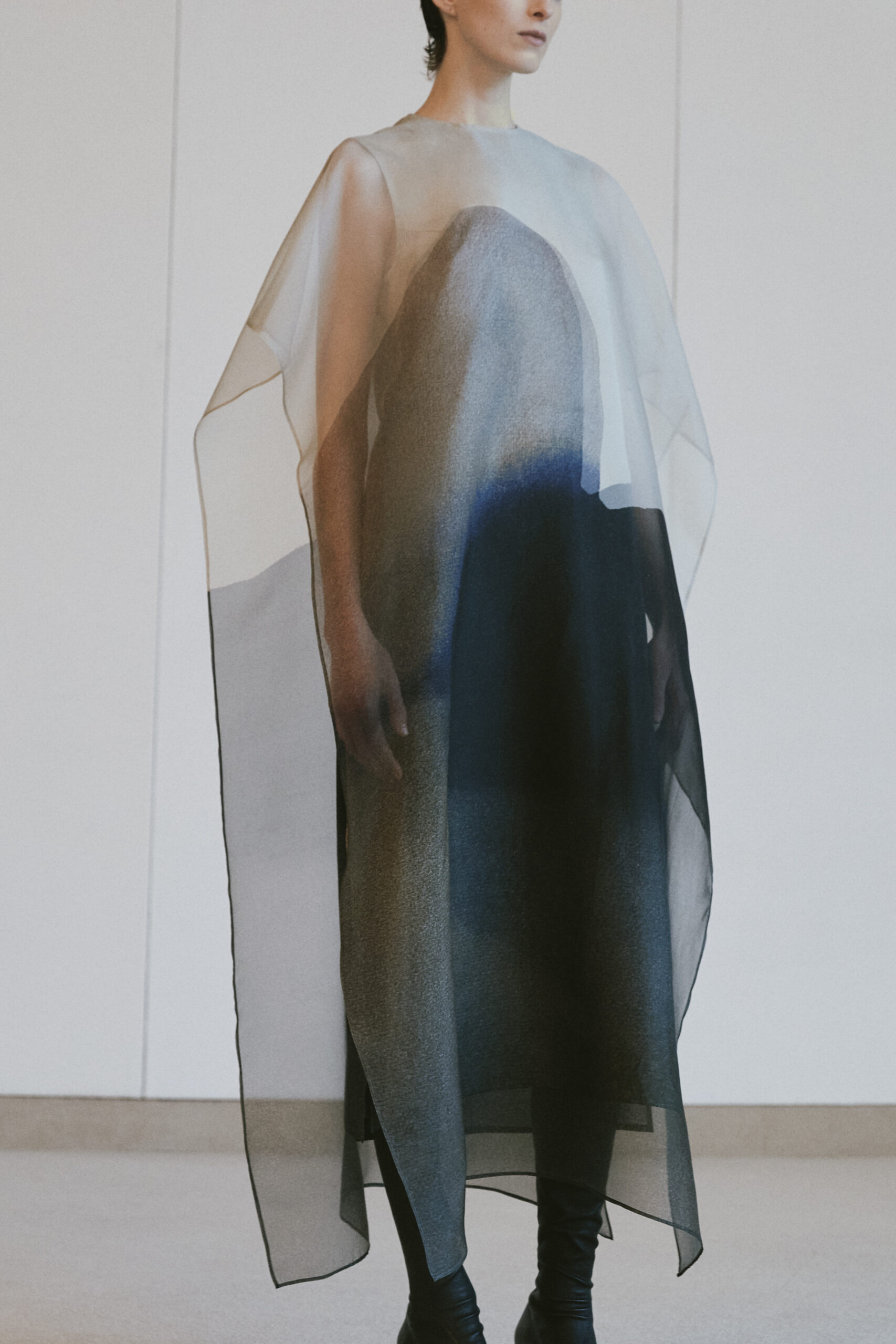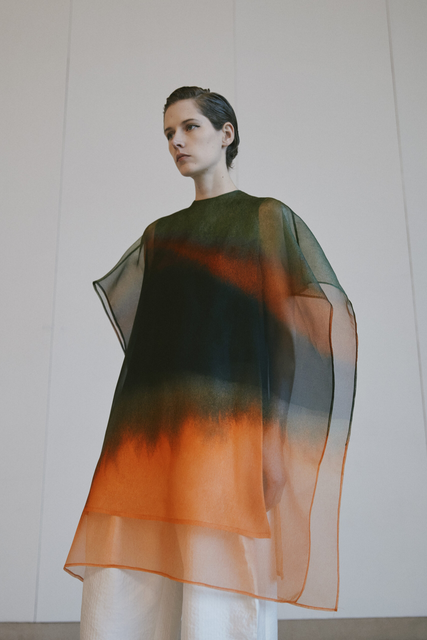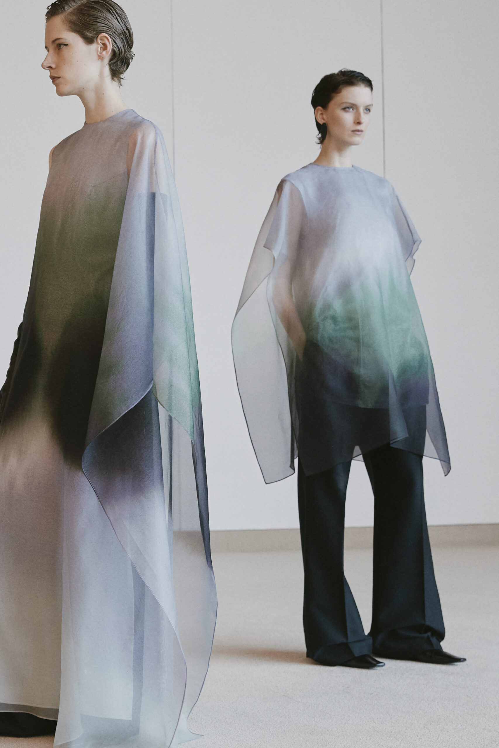 Cette saison, en collaboration avec l’artiste française Magali Cazo, connue pour ses récits abstraits et ses illustrations éthérées, Christian Wijnants nous invite à explorer des dimensions fantastiques à travers des imprimés captivants. Ces œuvres d’art se matérialisent sur des robes en organza, jouant sur la légèreté et la couleur pour créer un effet de mouvement émotionnel saisissant.