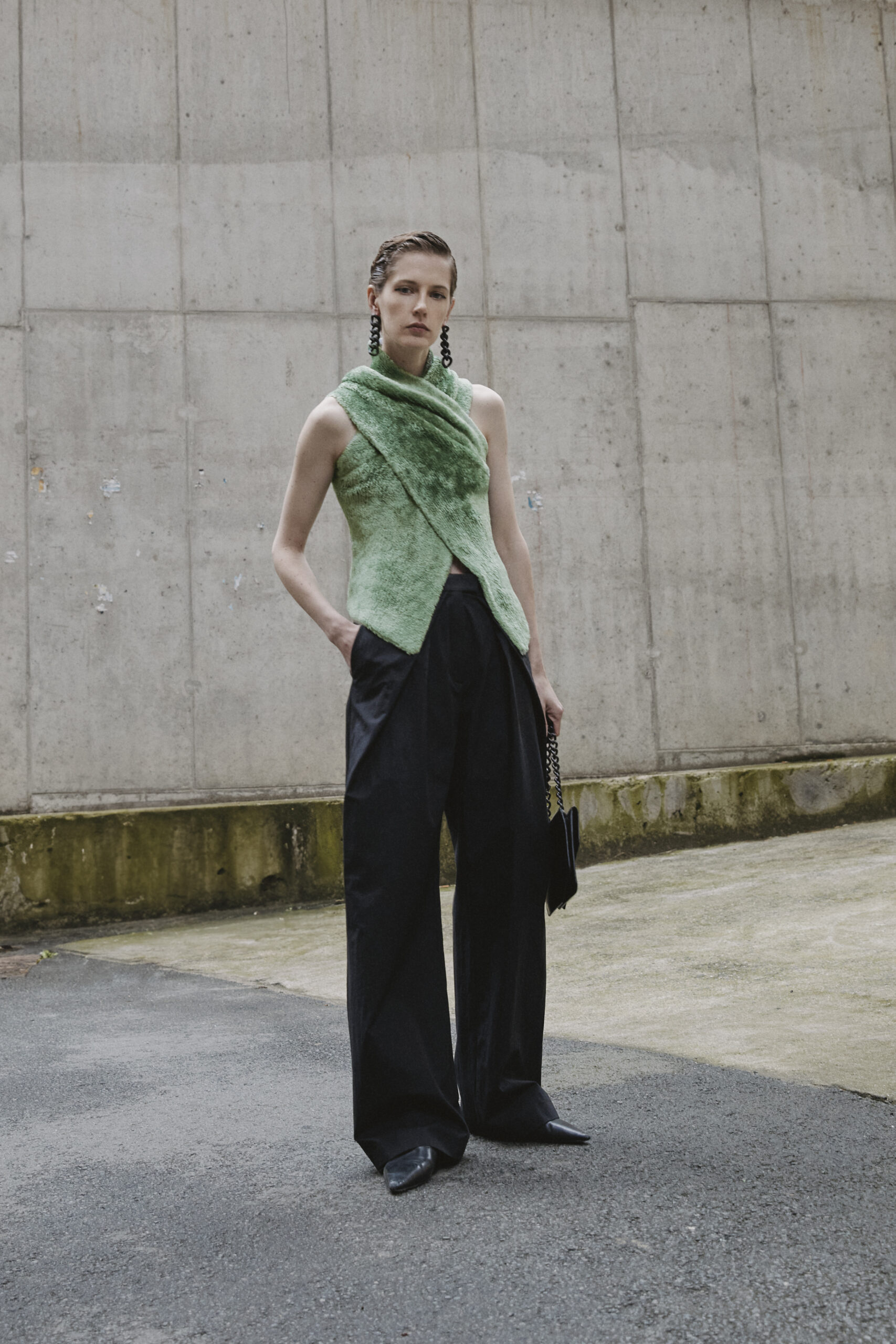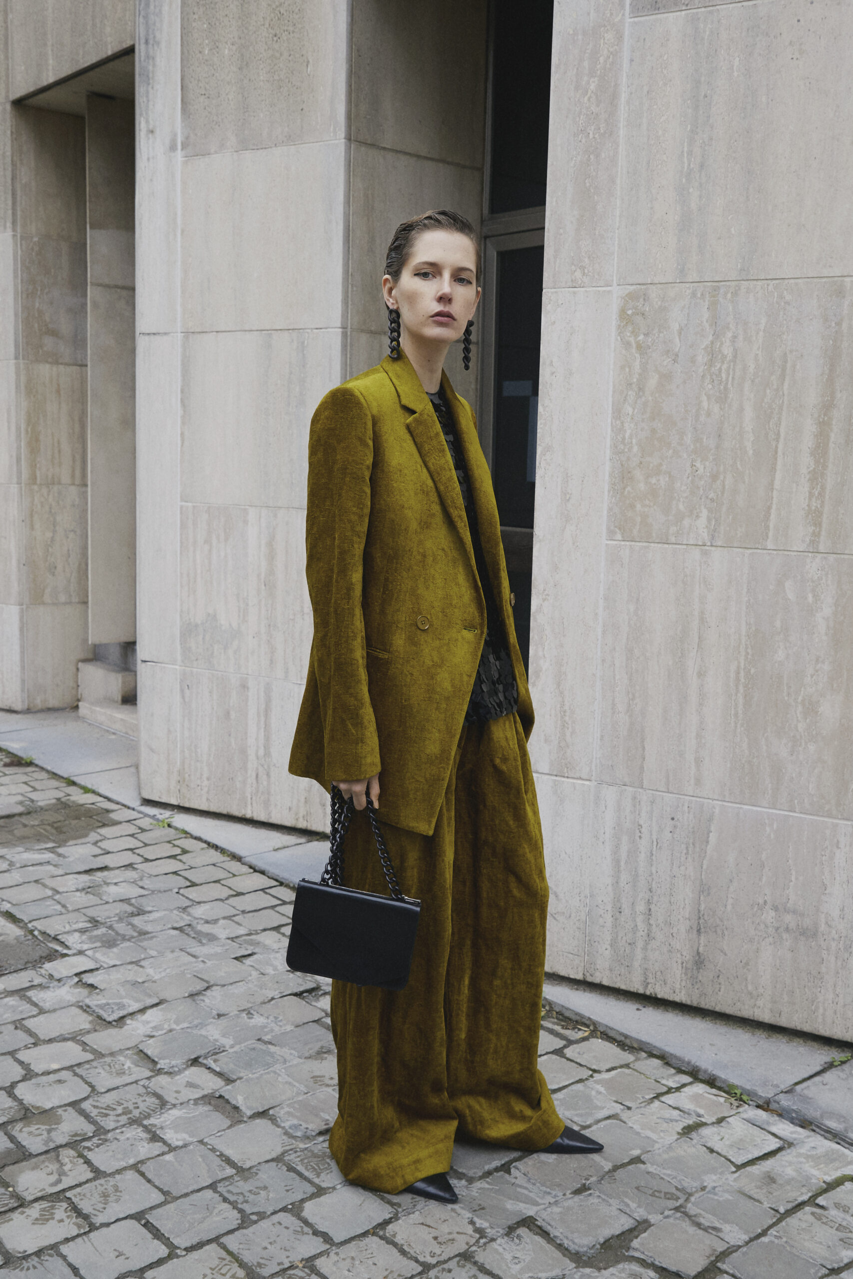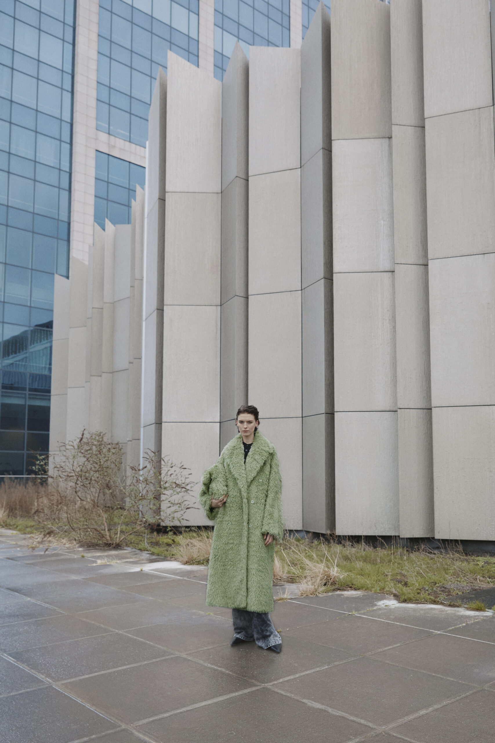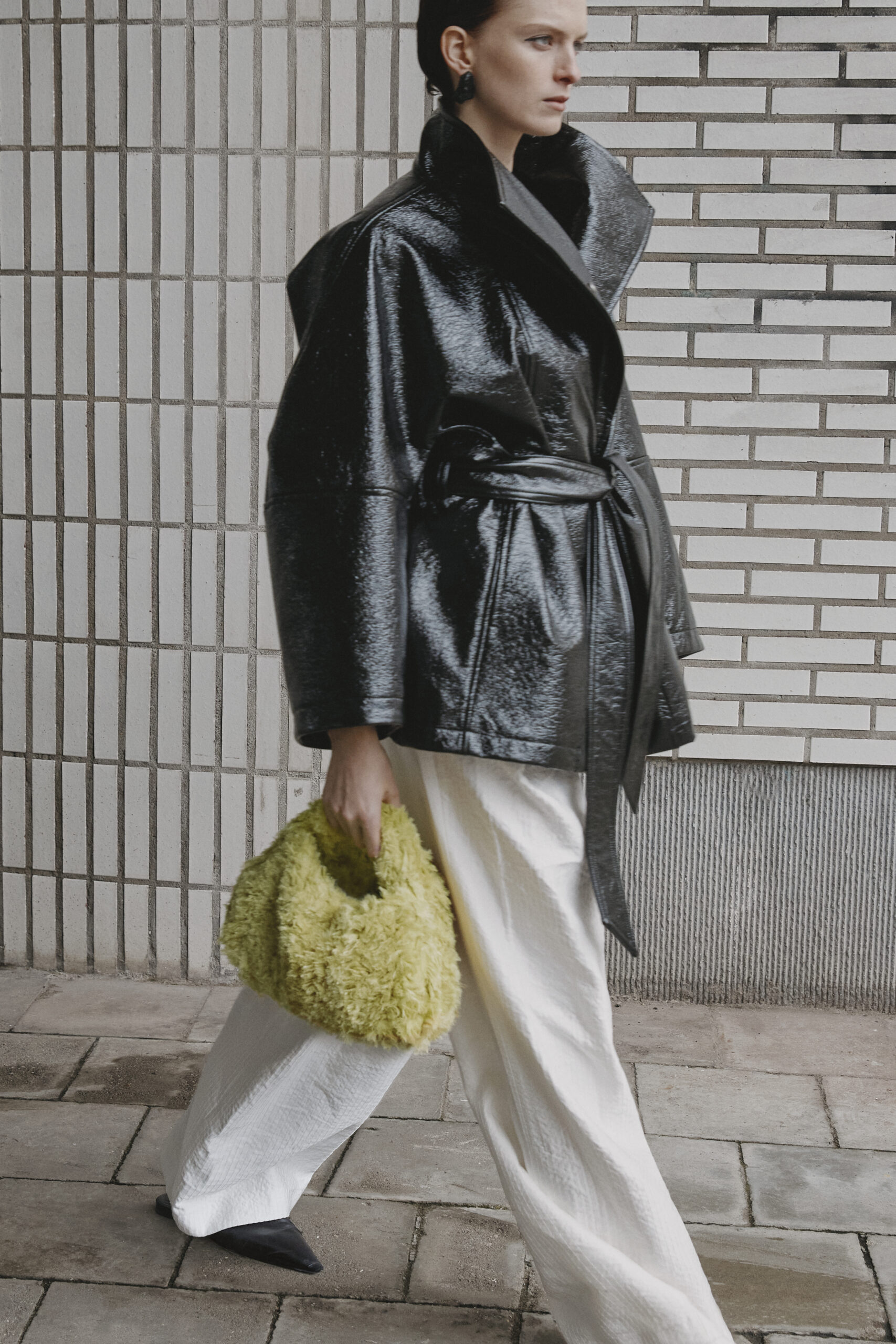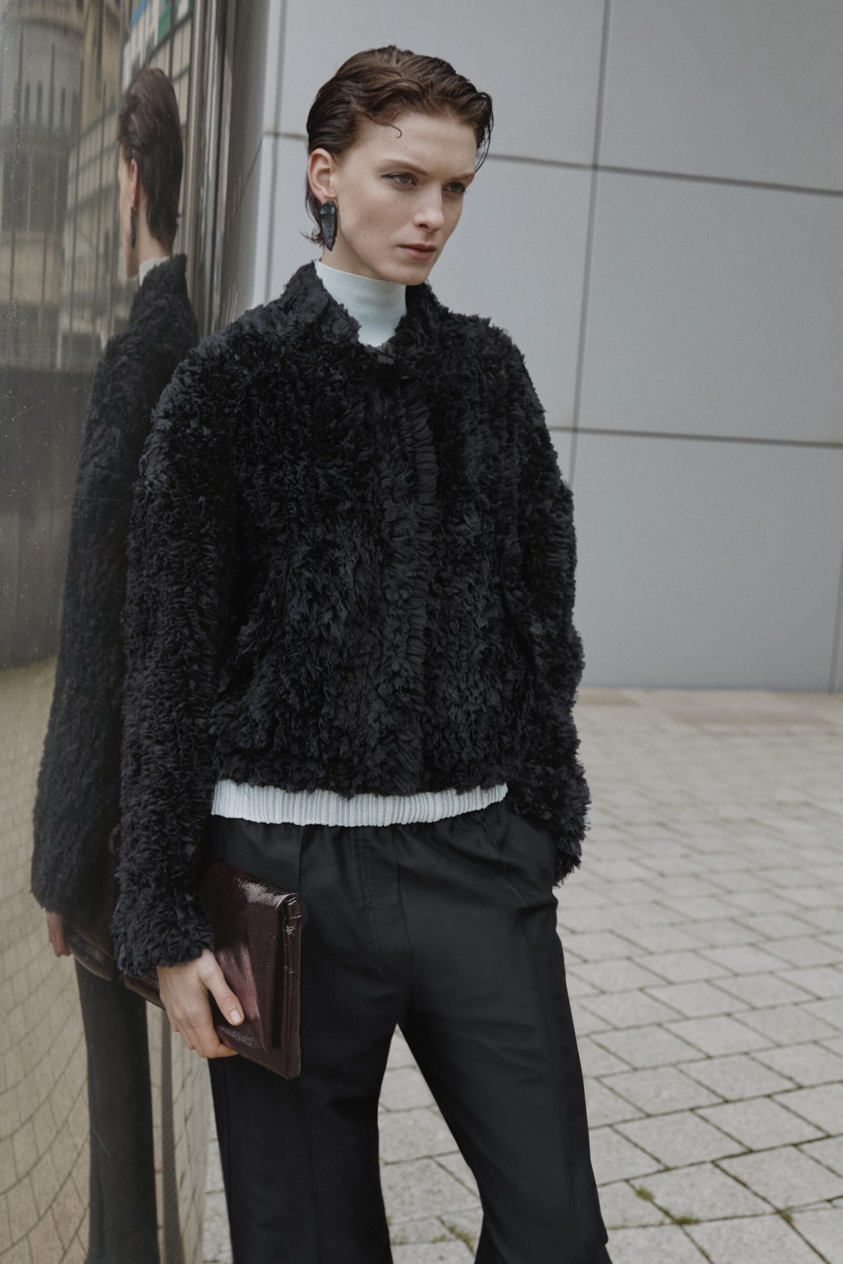 La collection se distingue par ses manteaux en Alpaca chocolat (Suri Alpaca/fausse fourrure naturelle) et en fausse fourrure Pistachio (synthétique), qui fusionnent les références du passé et du futur. S’ajoutent à ces pièces des ensembles de sequins, des hauts en soie découpés à la main, et un bomber à volants, témoignant de l’audace stylistique de Wijnants.