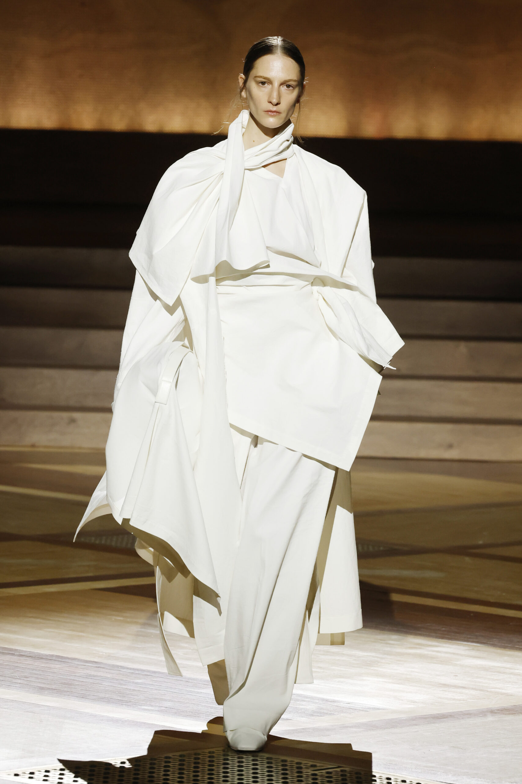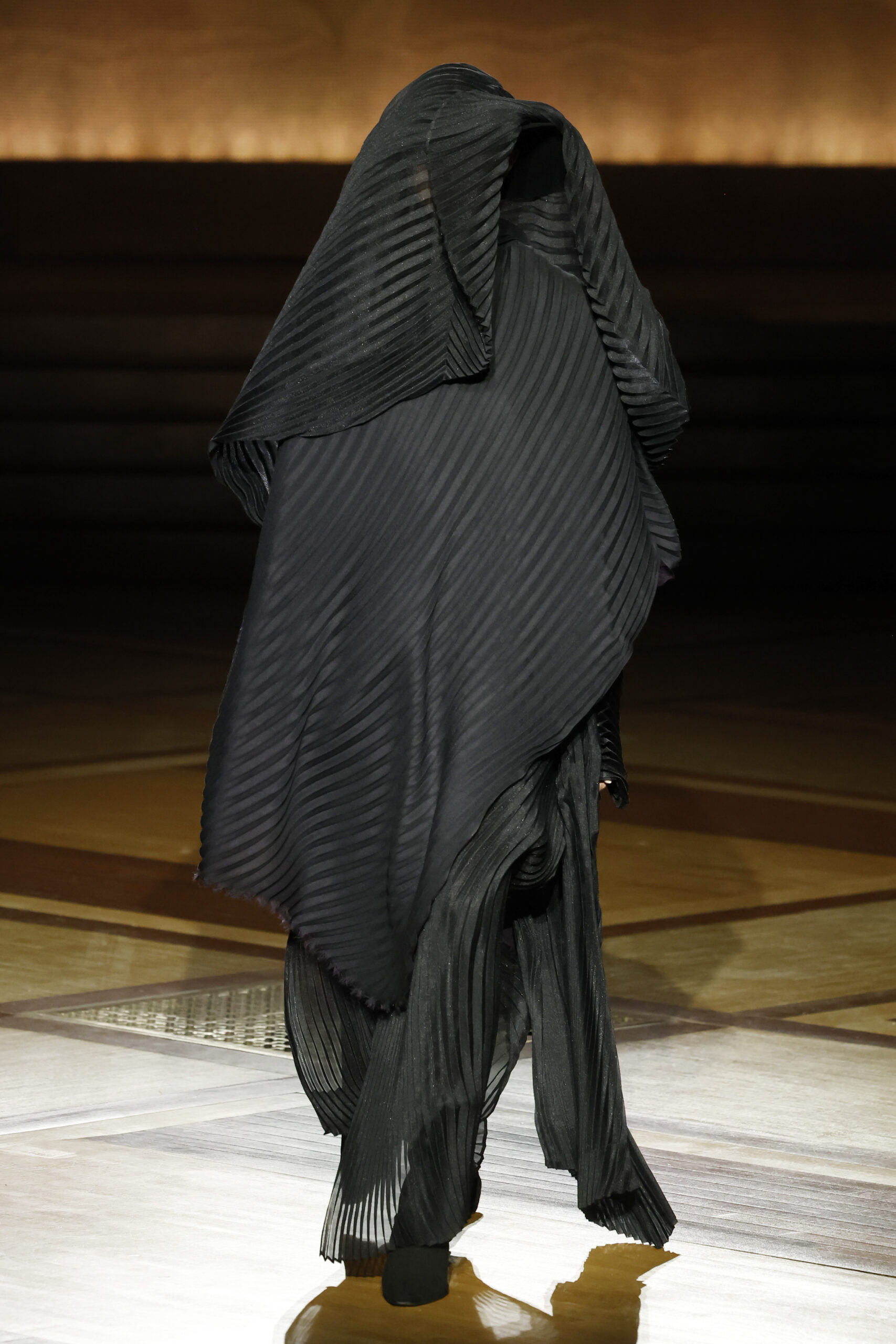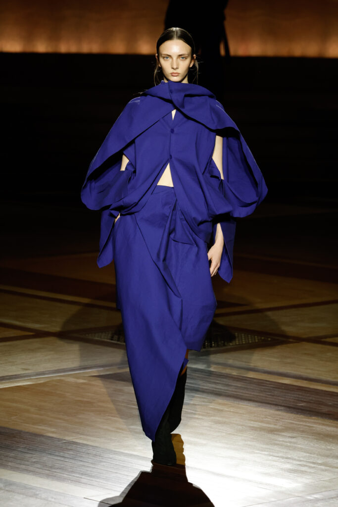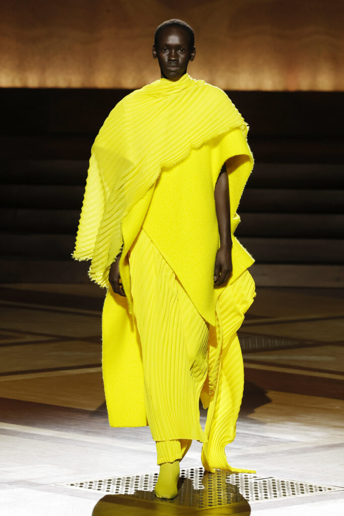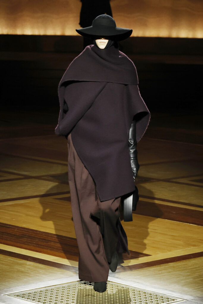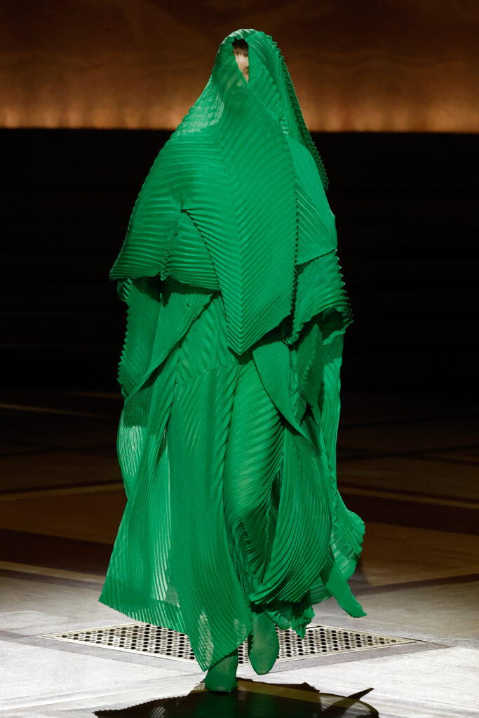 Présentée le 1er mars 2024 au musée de l’histoire de l’immigration du Palais de la Porte Dorée à Paris, la collection ISSEY MIYAKE Automne Hiver 2024/25, « What Has Always Been », explore l’origine de revêtir le corps humain avec une pièce de tissu. Cette collection s’inspire de ce geste intrinsèque, antérieur à la fabrication intentionnelle de vêtements, qui conduit à la découverte du drapé, de la superposition, du pliage et de la torsion, des formes asymétriques, ainsi que du « ma » (l’espace non rempli) entre le corps et le vêtement.