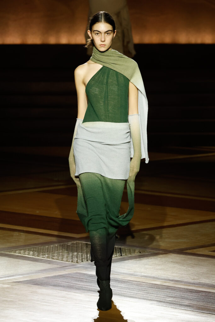 Les silhouettes sculpturales de la série ENVISION sont réalisées avec une simple pièce de tissu. Le matériau, tissé avec des fibres de washi, est un développement de celui utilisé pour la collection Printemps Été 2024. Les silhouettes sont réalisées d’après l’étude de formes créées en enveloppant simplement le corps d’un morceau de tissu. Mêlant les fibres de washi à des fibres extensibles, ce tissu léger apporte au vêtement une sensation de douceur, tout en conservant son volume en se drapant naturellement autour du corps.