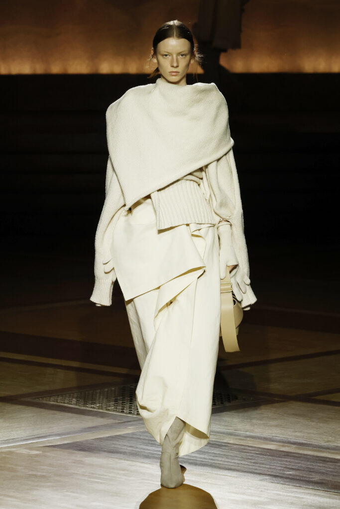 La série ENCLOTHE WASHI AND WOOL présente un drapé élégant et sophistiqué, inspiré par l’idée d’une simple pièce de tissu enroulée autour du corps. Tissé avec des fibres naturelles (washi et laine) et des fibres extensibles, le matériau utilisé pour ces silhouettes volumineuses dévoile une texture douce et chaleureuse, proche de celle du velouté de la peau.