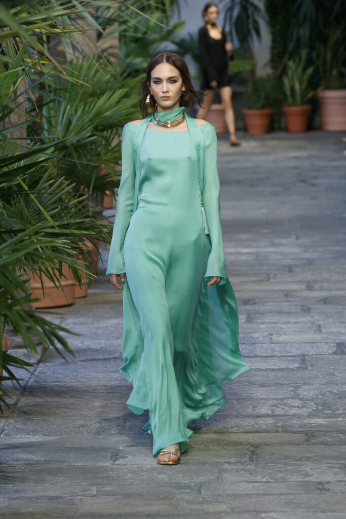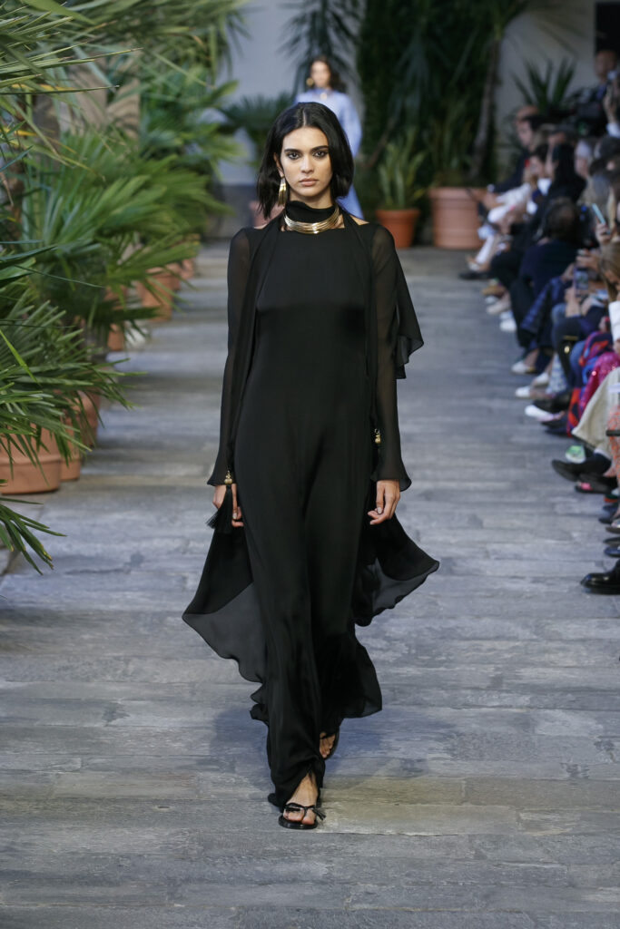 La collection prend un tournant dramatique pour la vie nocturne, avec des robes délicates et diaphanes dégageant une vibe bohème séduisante. Des robes colonnes en georgette ivoire et marron tabac se mêlent à des capes noires transparentes et frangées, à des tops à manches bouffantes romantiques et à des pièces inspirées de la lingerie.