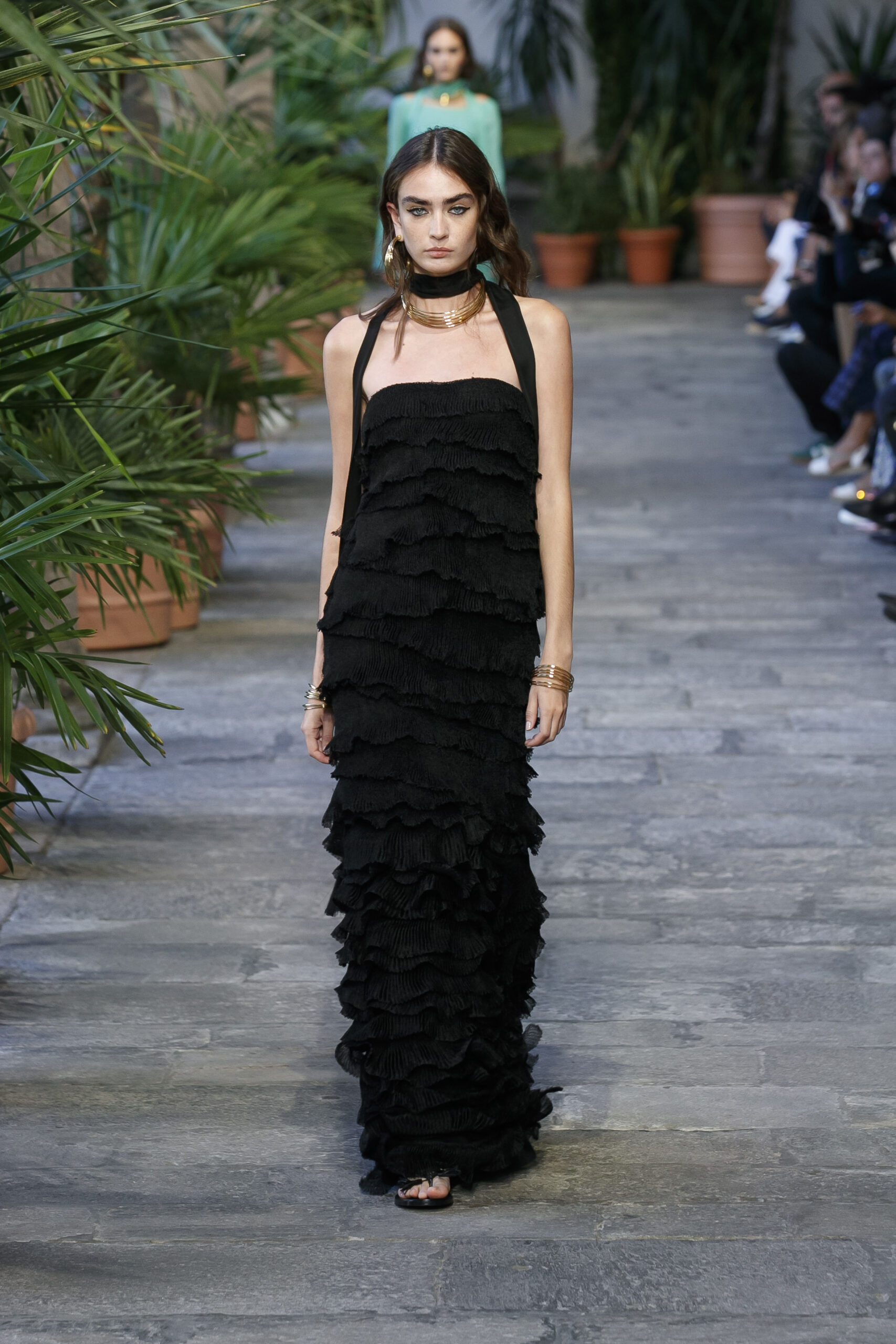 La collection prend un tournant dramatique pour la vie nocturne, avec des robes délicates et diaphanes dégageant une vibe bohème séduisante. Des robes colonnes en georgette ivoire et marron tabac se mêlent à des capes noires transparentes et frangées, à des tops à manches bouffantes romantiques et à des pièces inspirées de la lingerie.