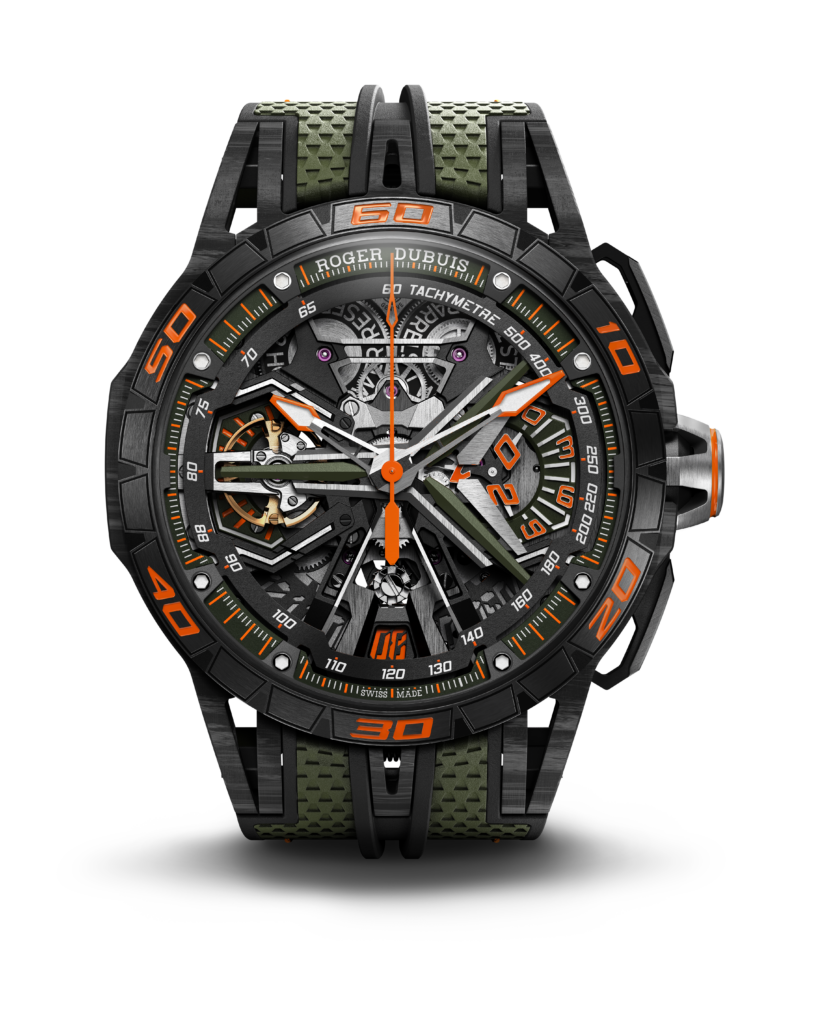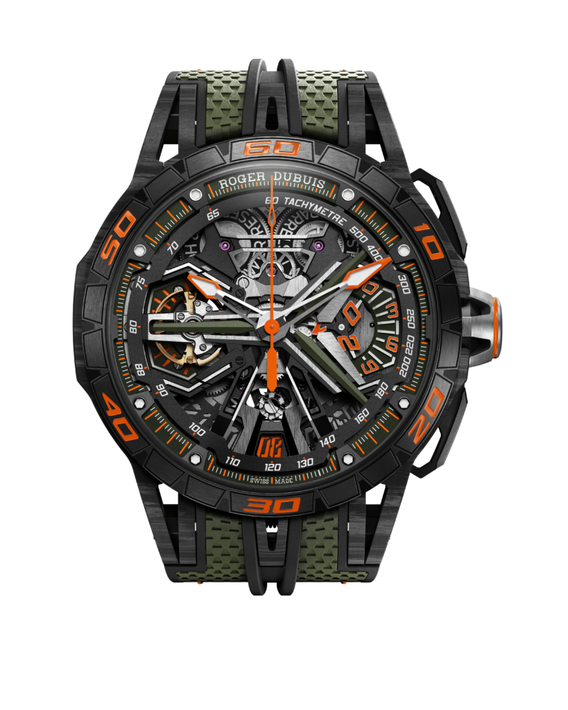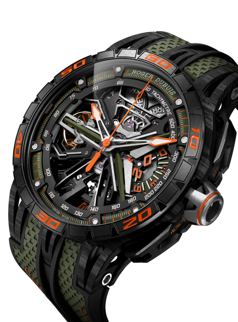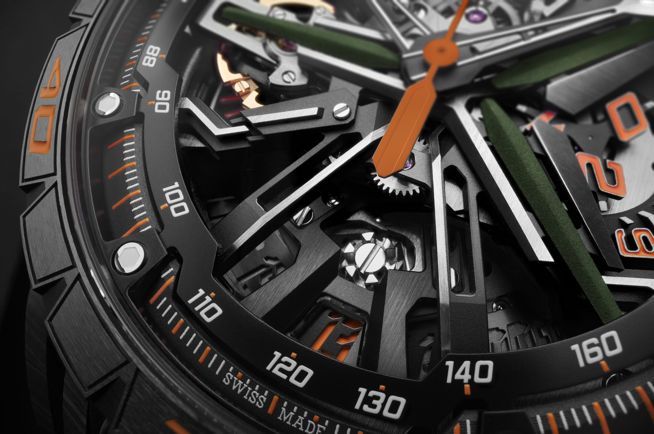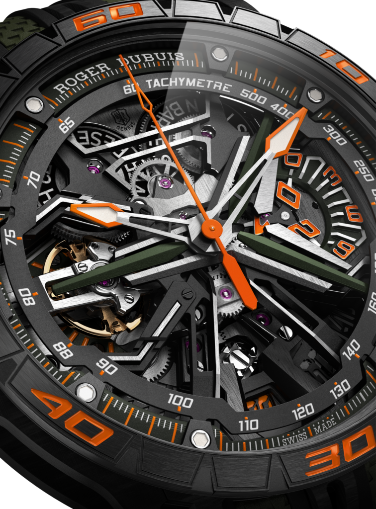 La montre est une célébration de l’esthétique et de la performance. Le design extérieur, inspiré de la vitesse et des supercars, est souligné par des nuances d’orange et de vert. Le boîtier de 45 mm, doté de poussoirs squelettés et d’une lunette en céramique, rend hommage à la construction moderne des supercars.