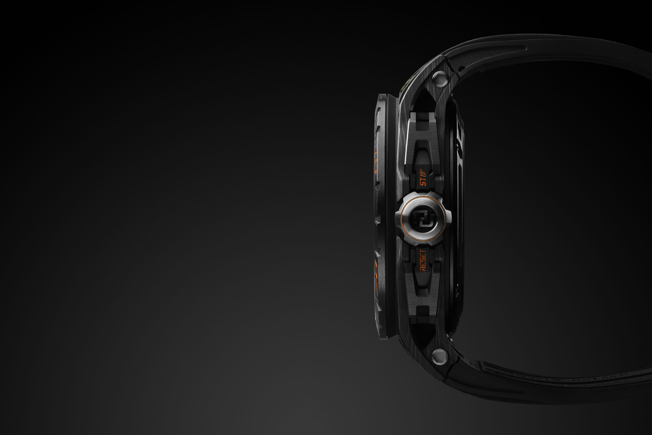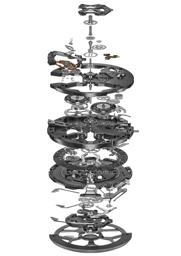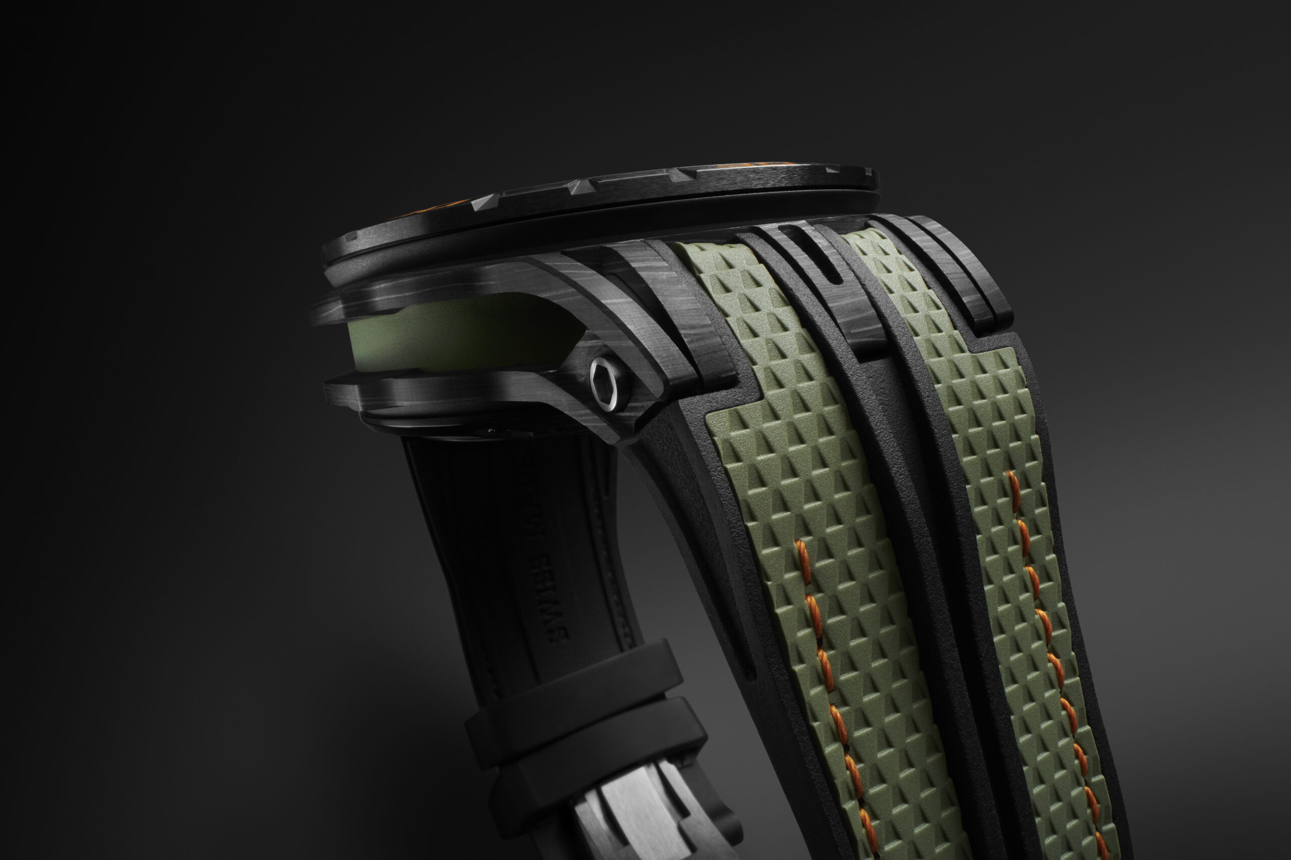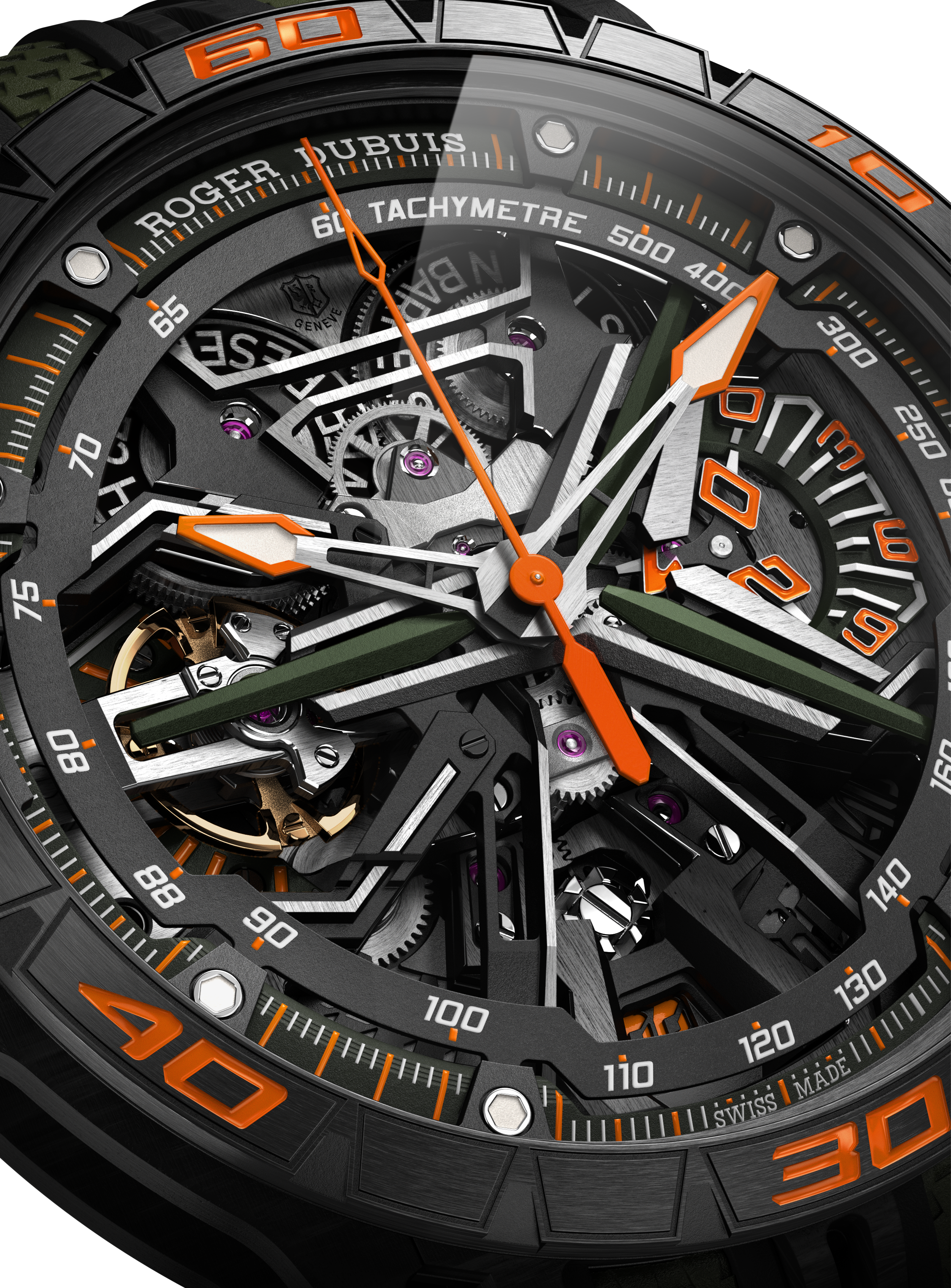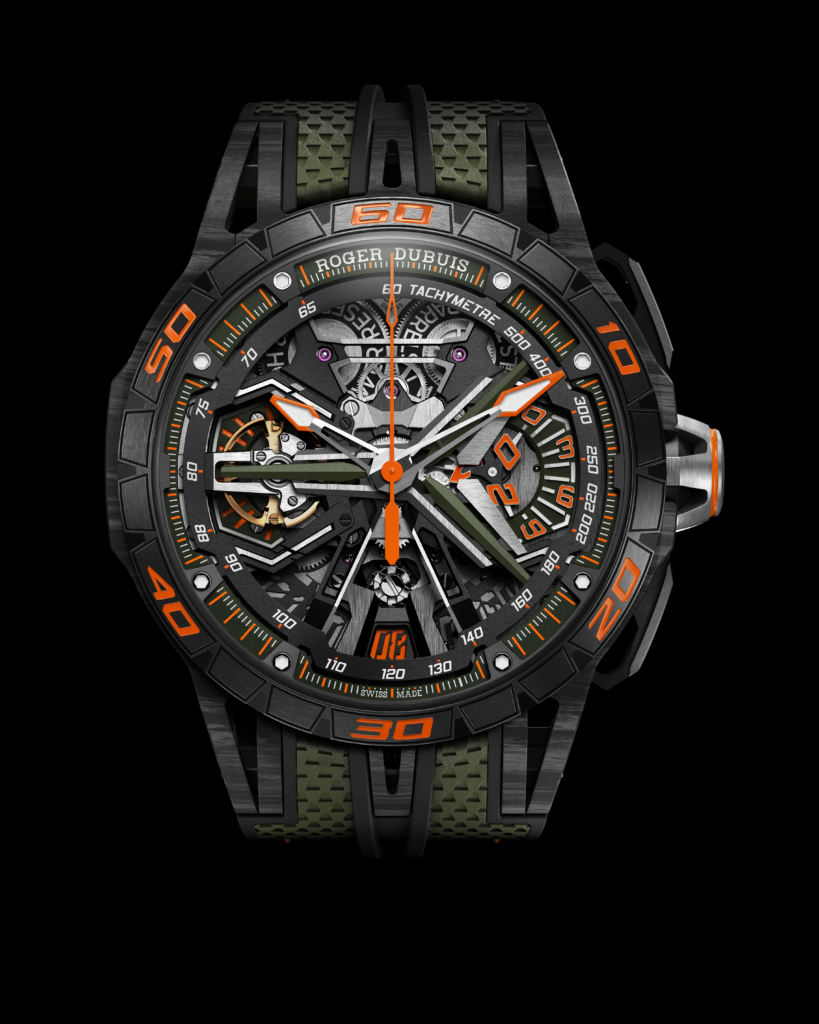 La montre est une célébration de l’esthétique et de la performance. Le design extérieur, inspiré de la vitesse et des supercars, est souligné par des nuances d’orange et de vert. Le boîtier de 45 mm, doté de poussoirs squelettés et d’une lunette en céramique, rend hommage à la construction moderne des supercars.