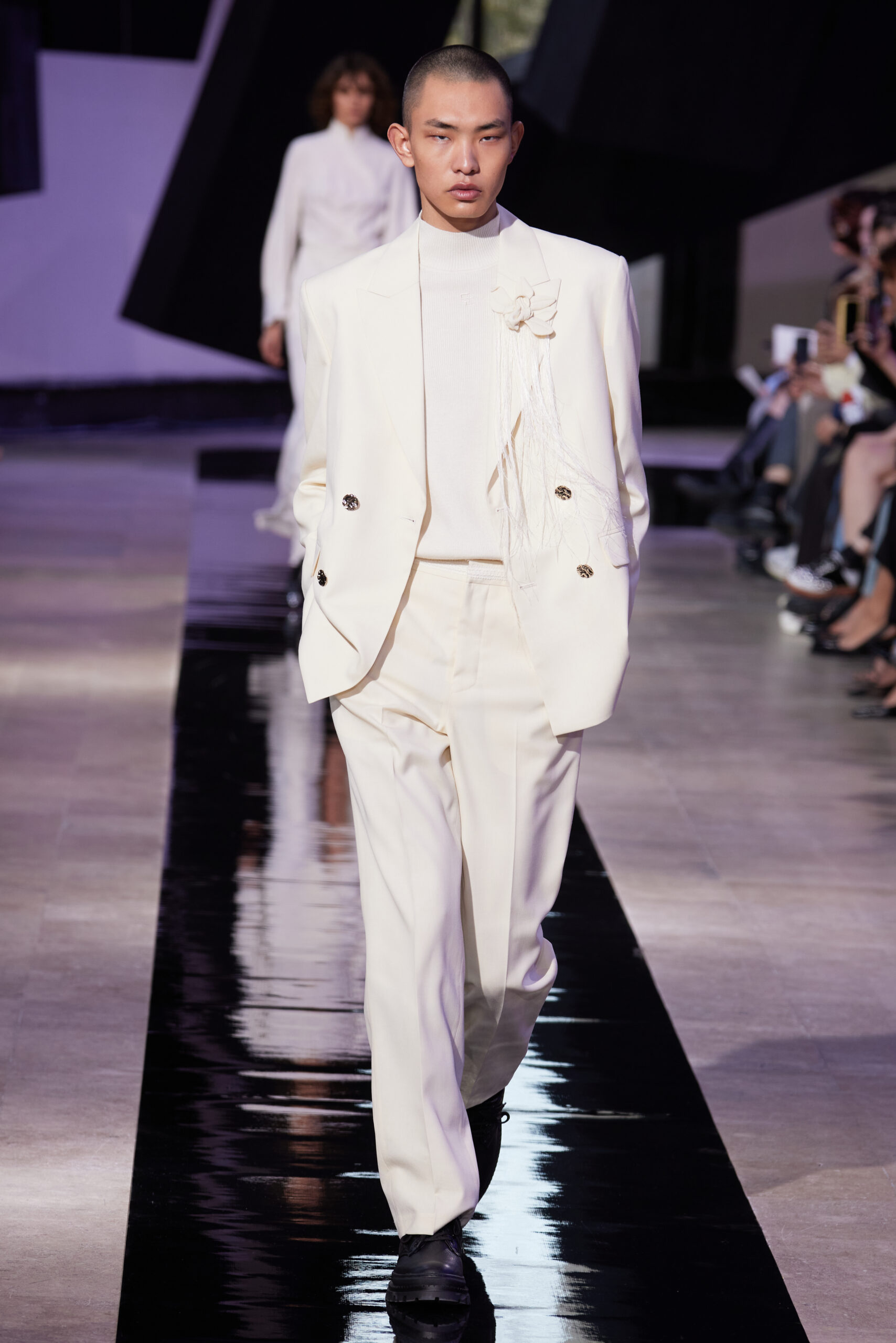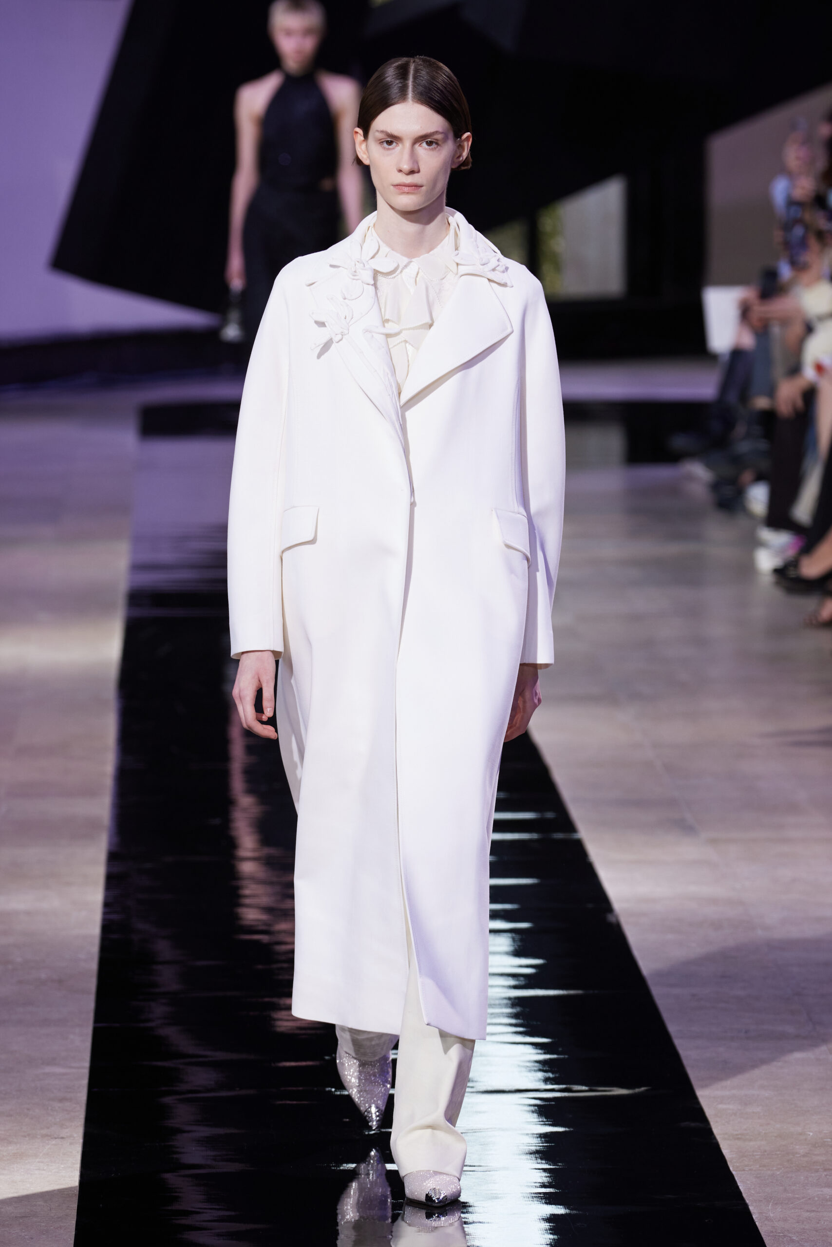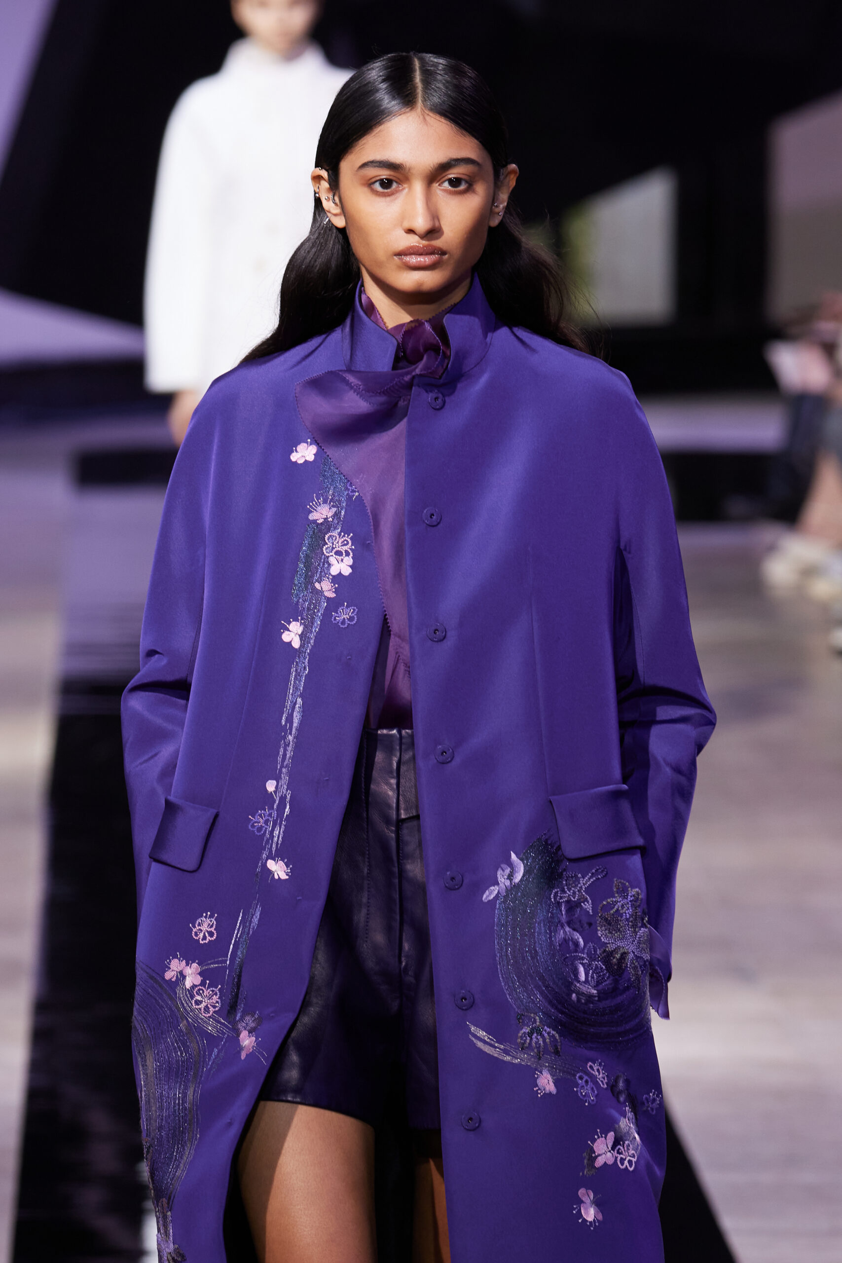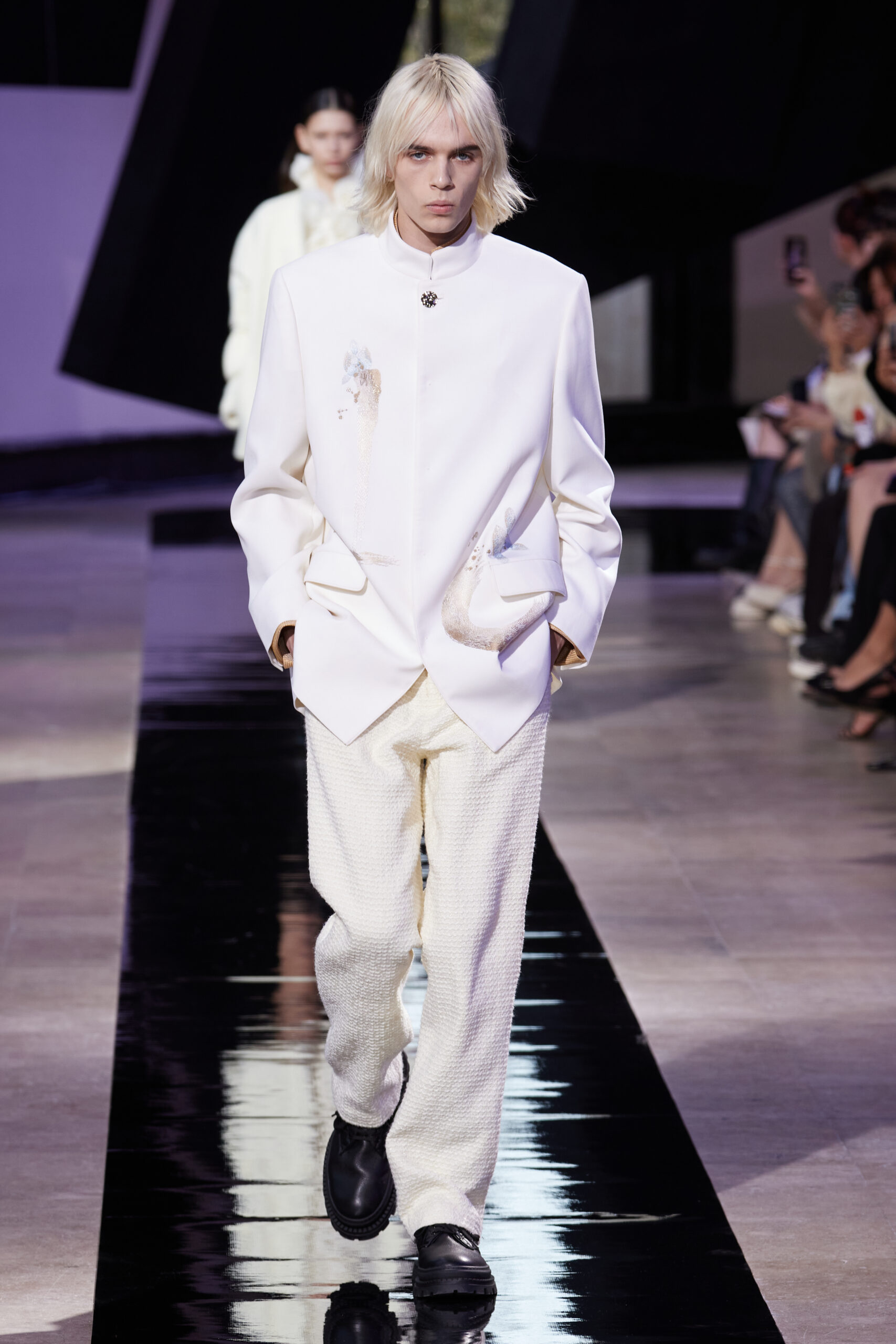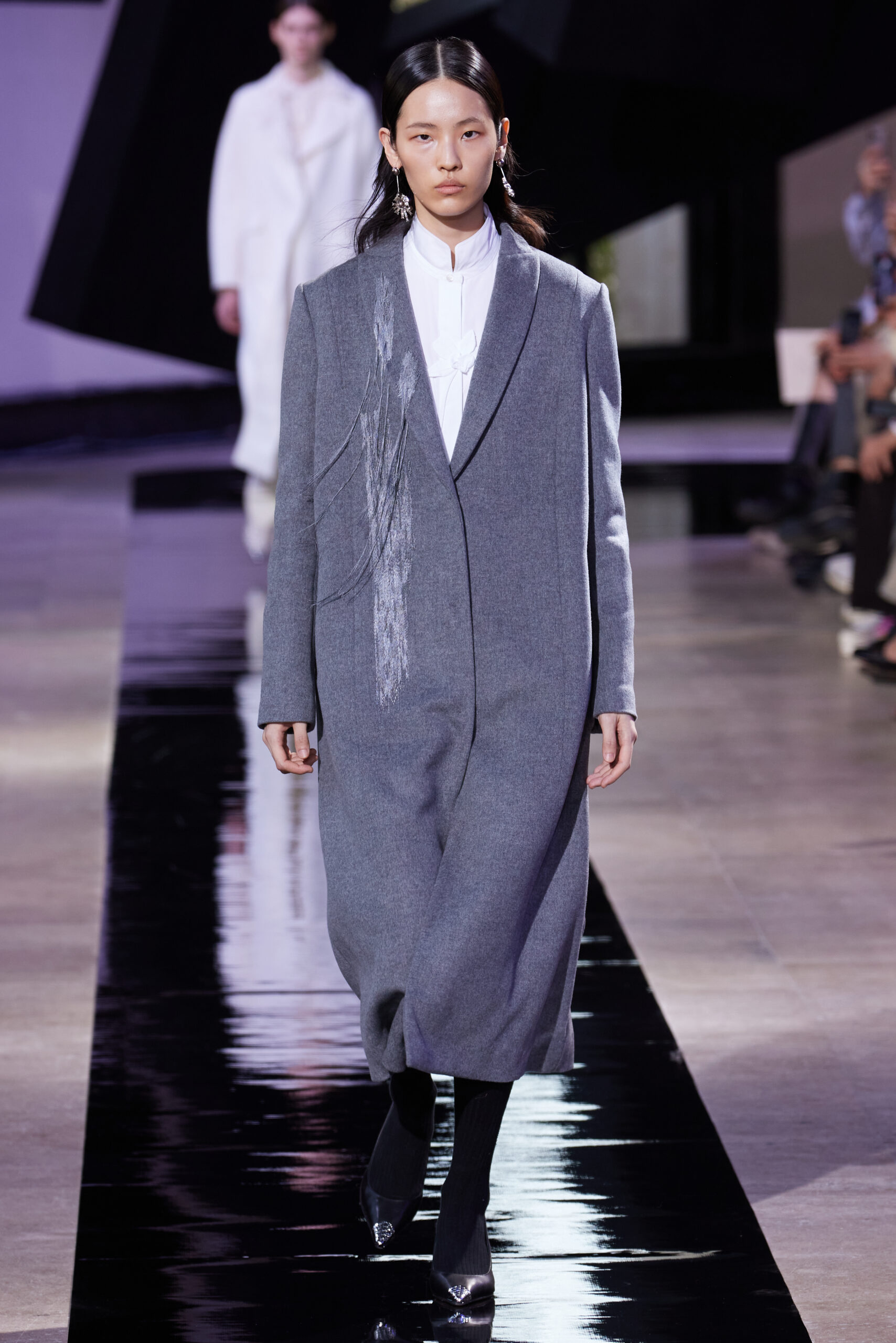 Les accessoires, notamment les emblématiques « talons virgules » de SHIATZY CHEN, font leur grand retour, agrémentés cette saison d’ornements floraux et assortis de sacs dotés de poignées en jade, ornées d’orchidées d’encre, créant une harmonie de nuances et de textures.