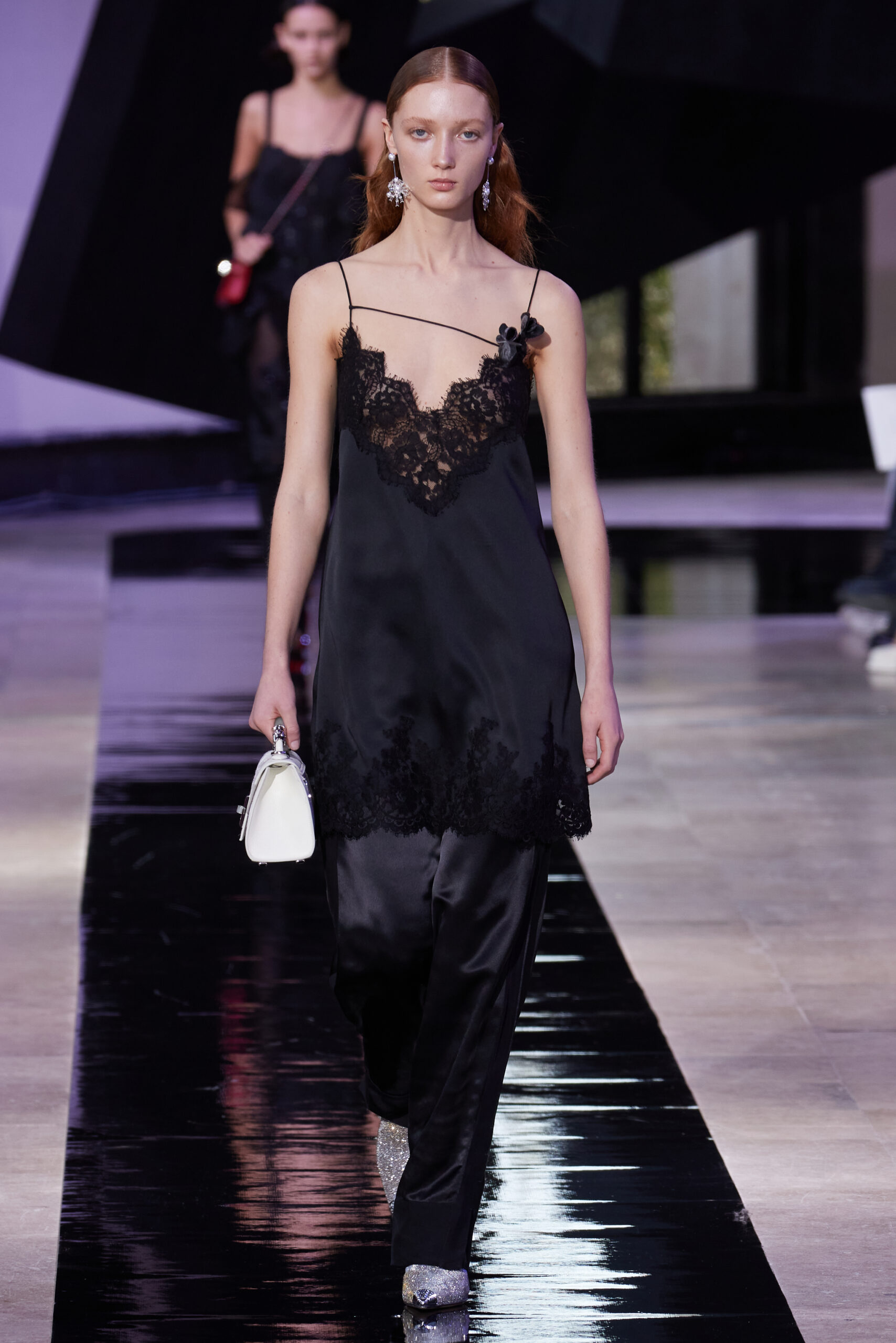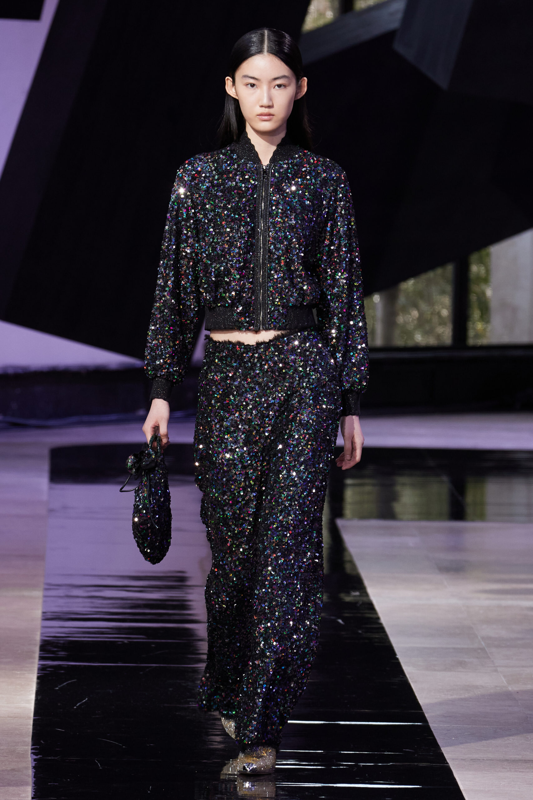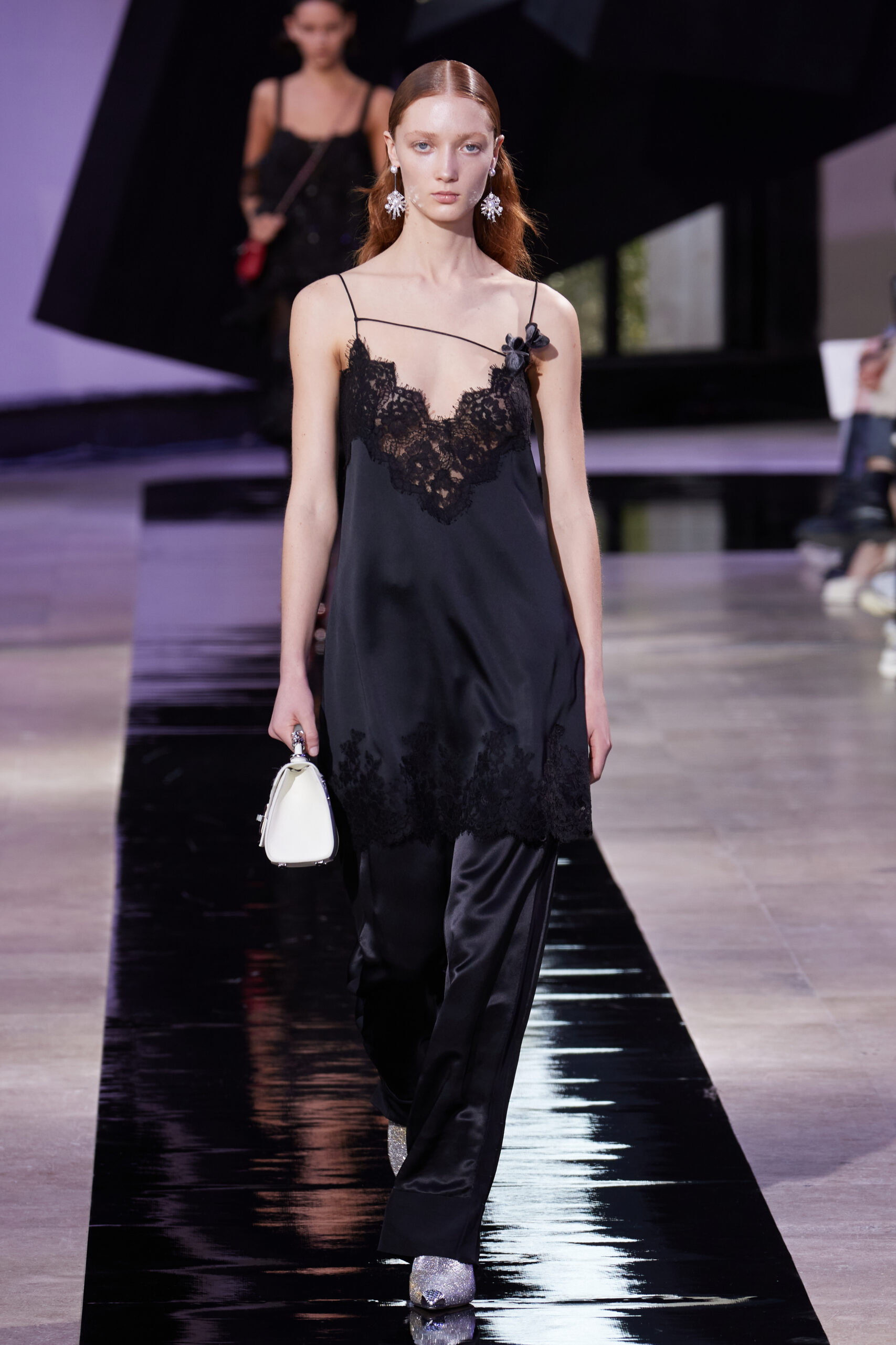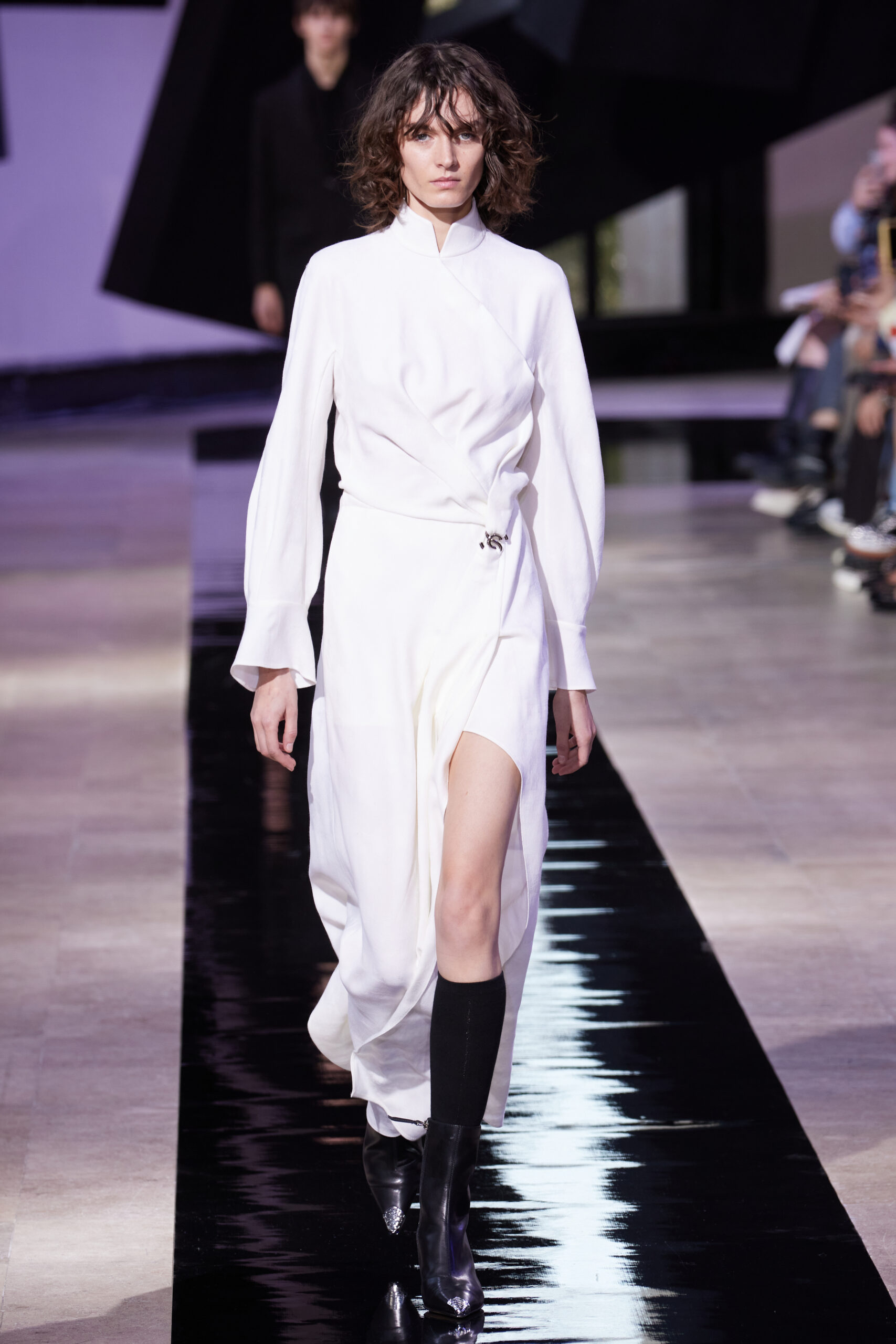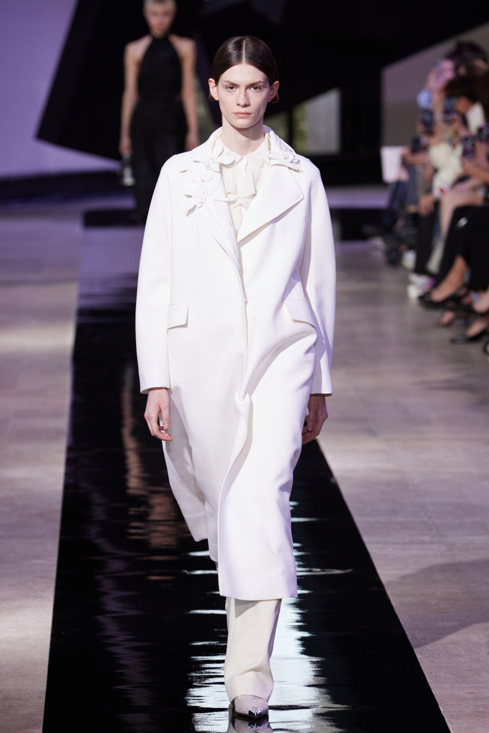 Les accessoires, notamment les emblématiques « talons virgules » de SHIATZY CHEN, font leur grand retour, agrémentés cette saison d’ornements floraux et assortis de sacs dotés de poignées en jade, ornées d’orchidées d’encre, créant une harmonie de nuances et de textures.