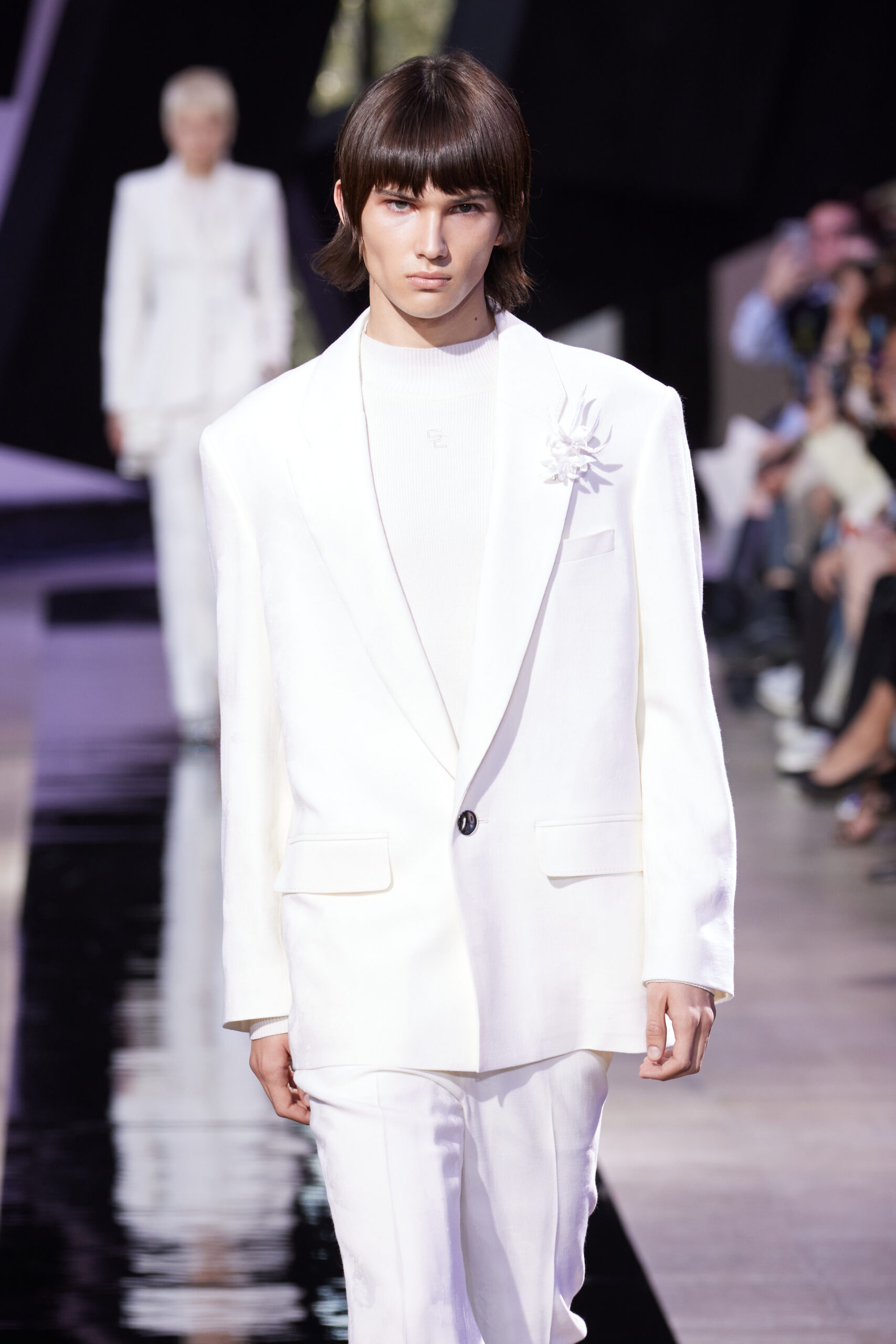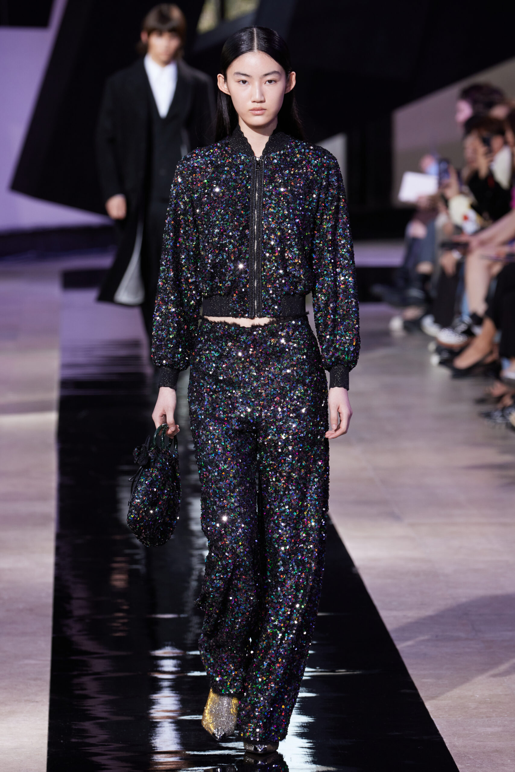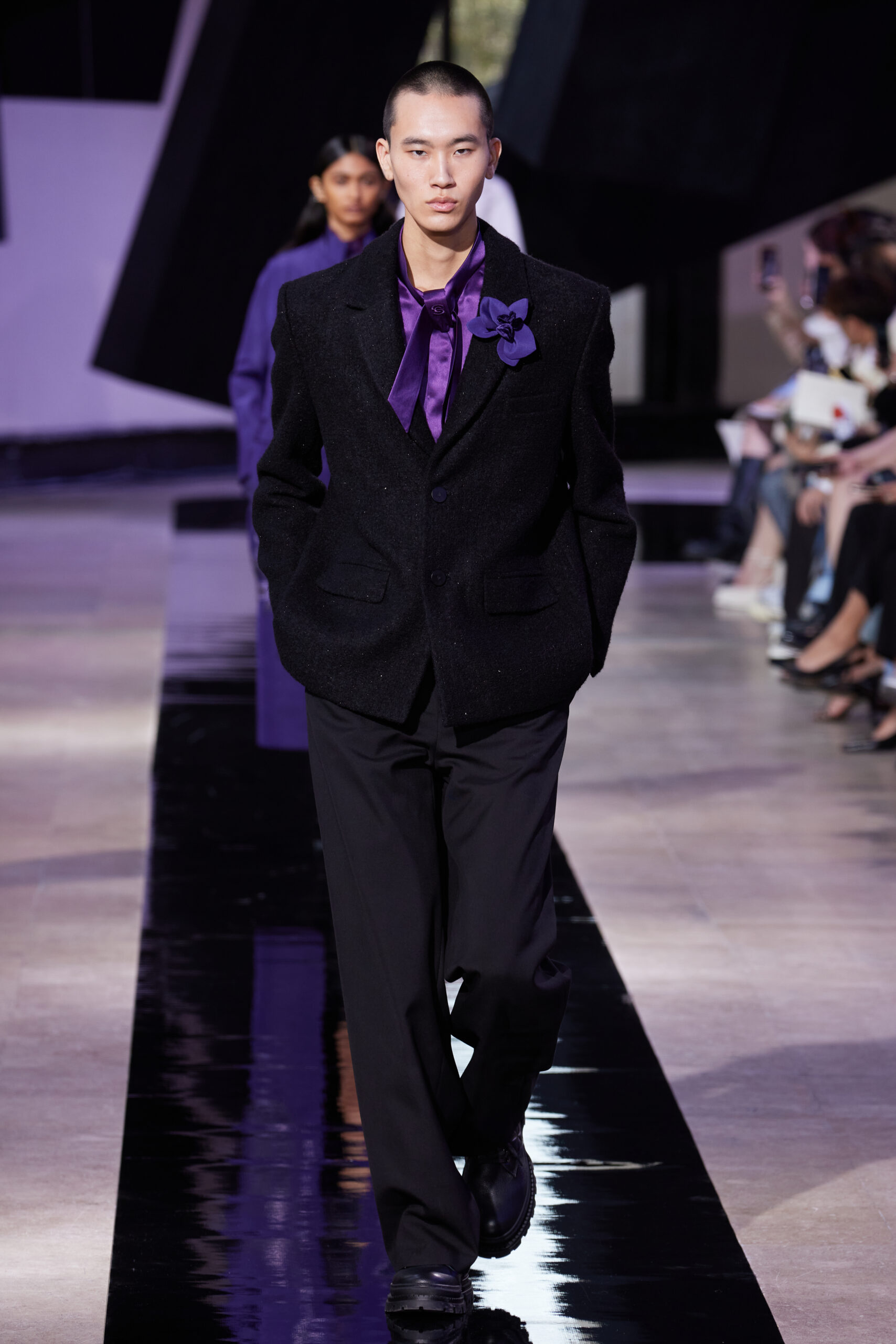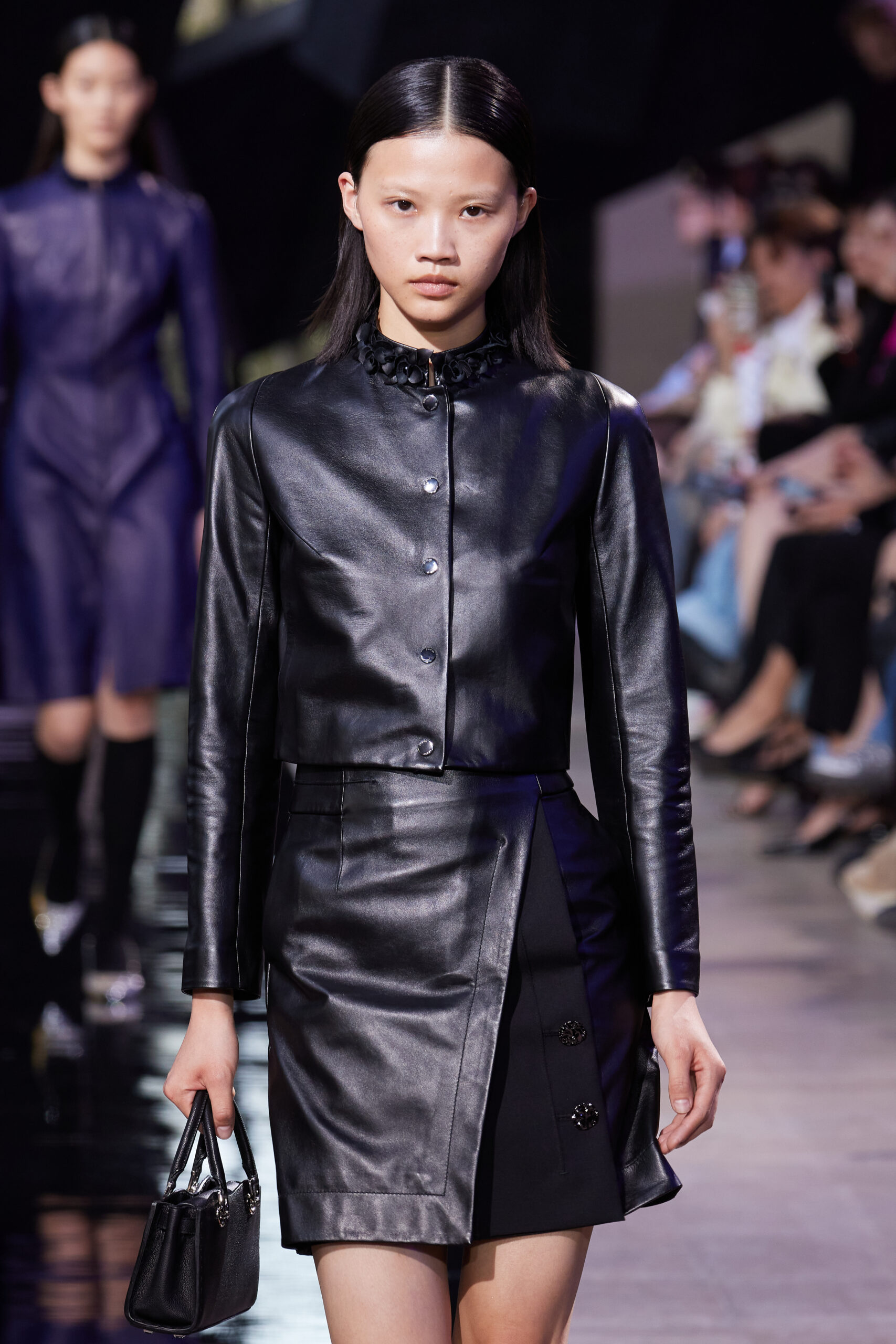 Les accessoires, notamment les emblématiques « talons virgules » de SHIATZY CHEN, font leur grand retour, agrémentés cette saison d’ornements floraux et assortis de sacs dotés de poignées en jade, ornées d’orchidées d’encre, créant une harmonie de nuances et de textures.