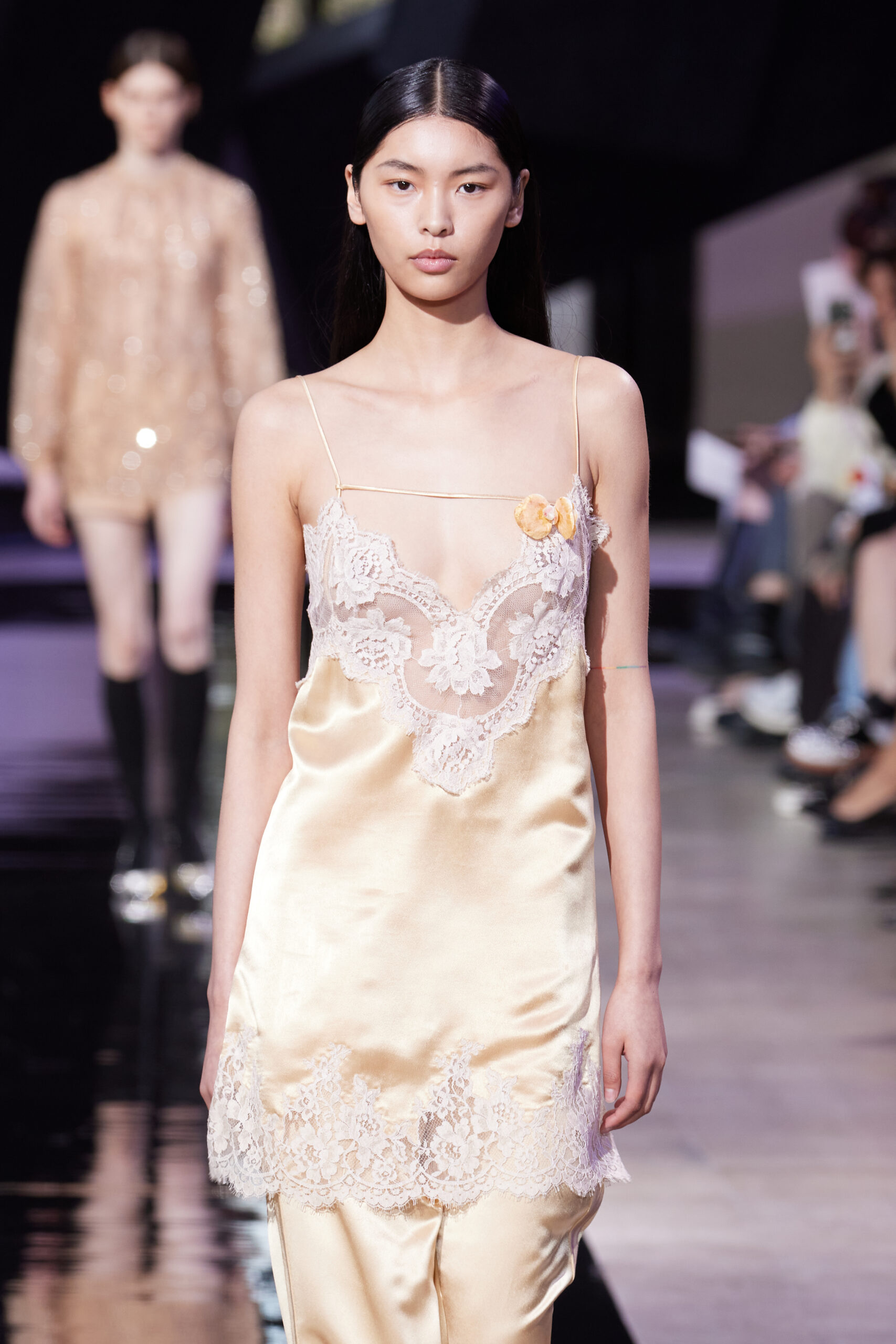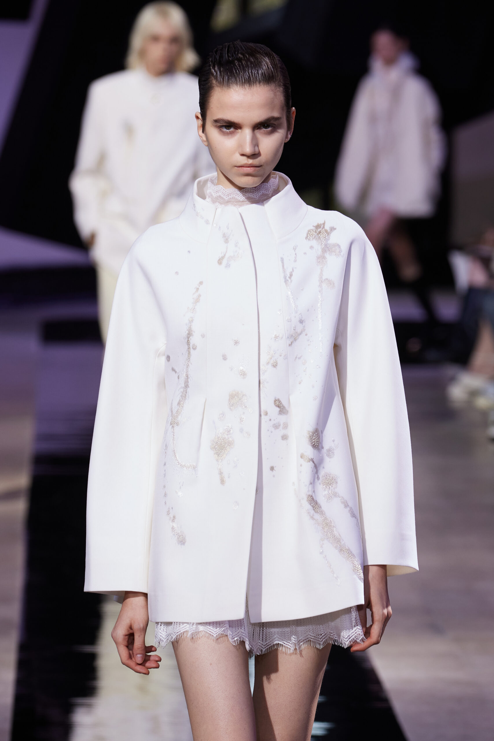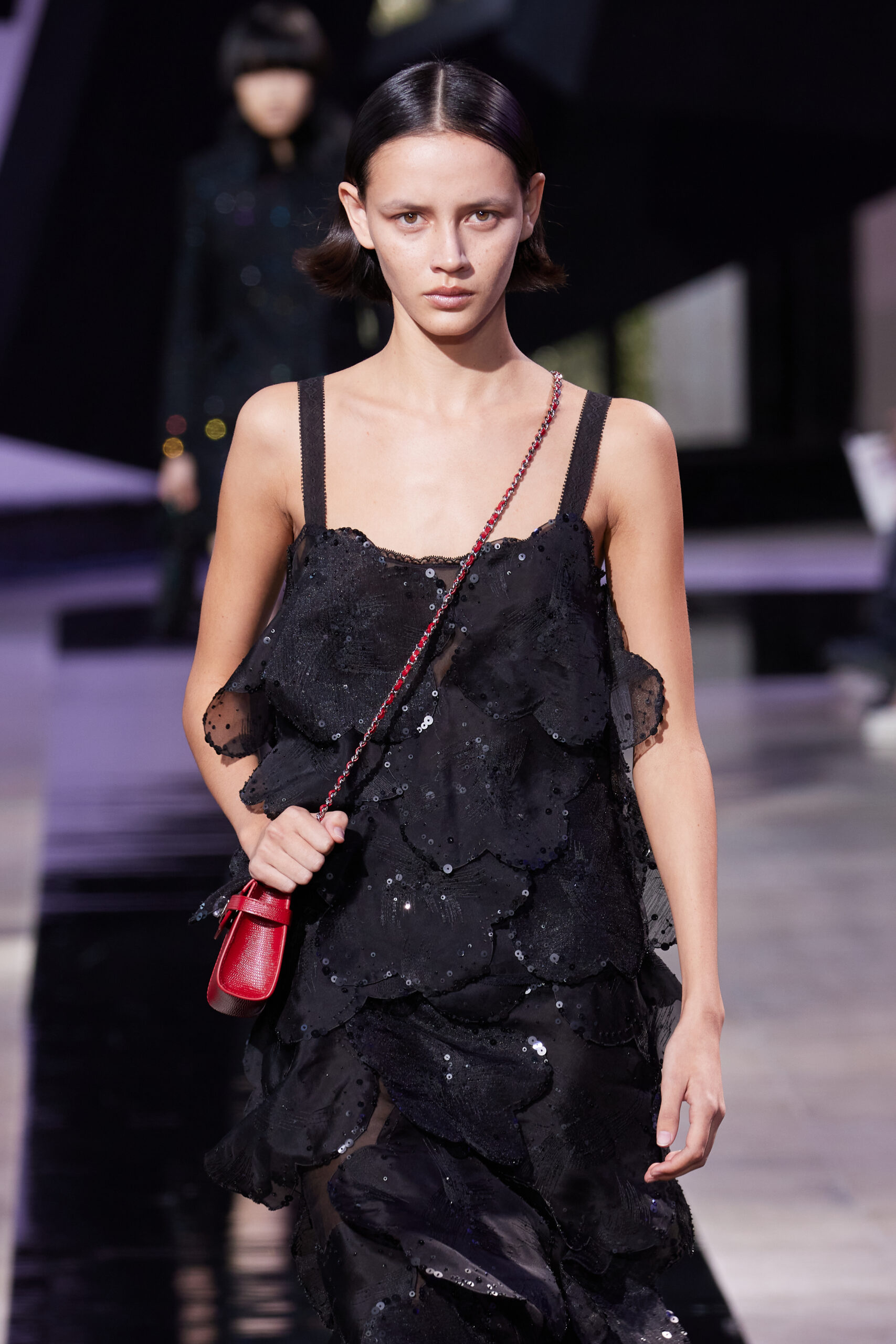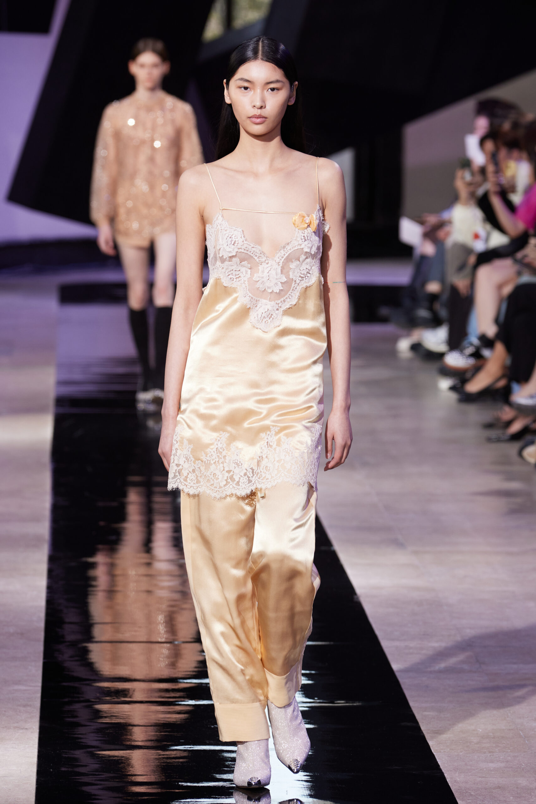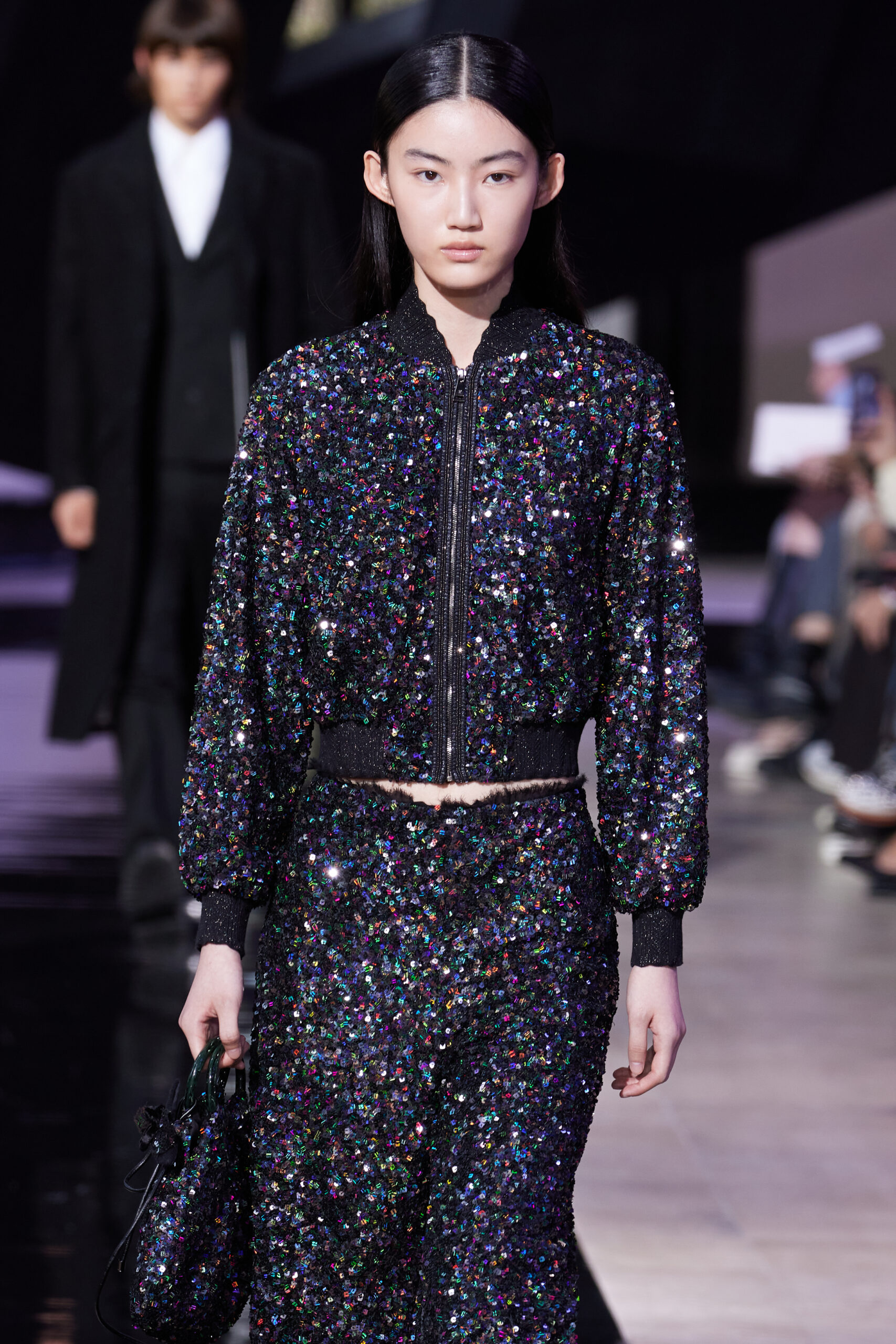 Les accessoires, notamment les emblématiques « talons virgules » de SHIATZY CHEN, font leur grand retour, agrémentés cette saison d’ornements floraux et assortis de sacs dotés de poignées en jade, ornées d’orchidées d’encre, créant une harmonie de nuances et de textures.