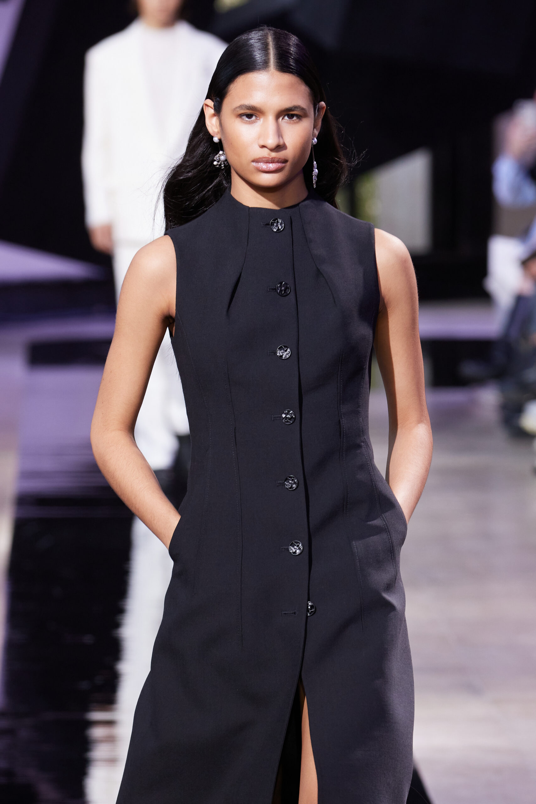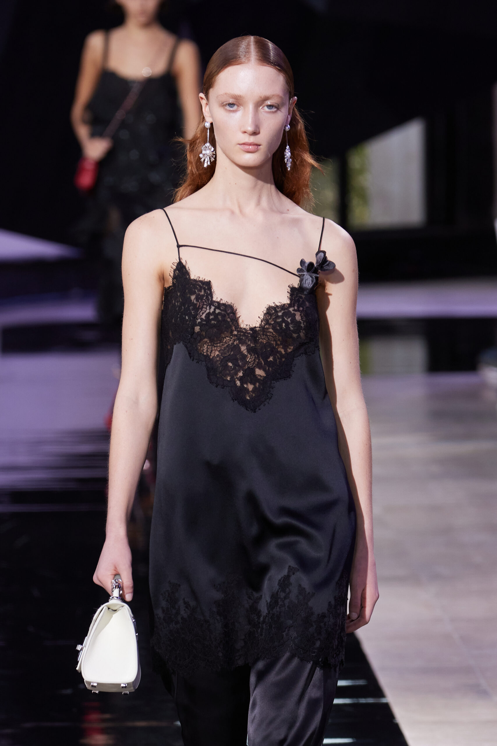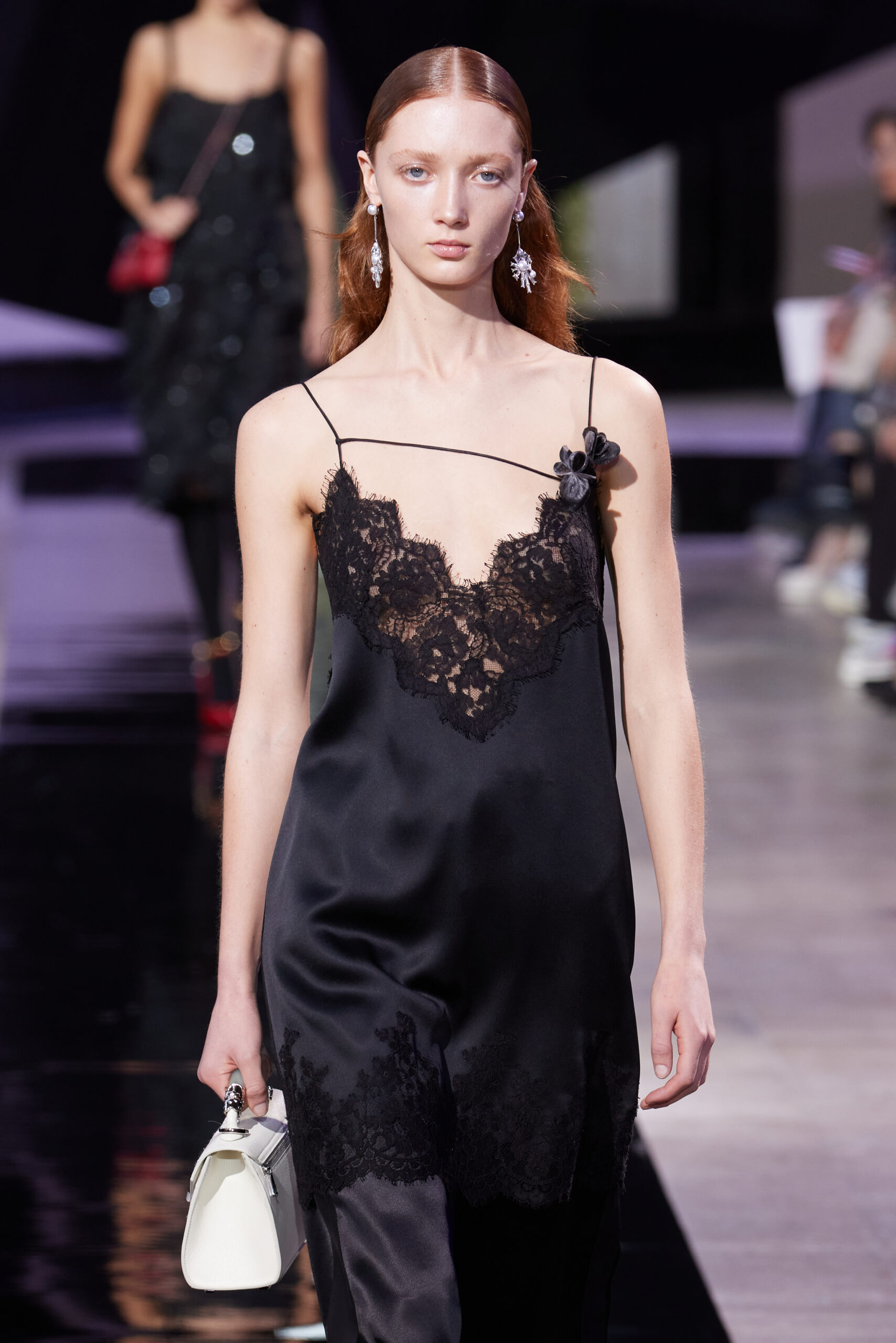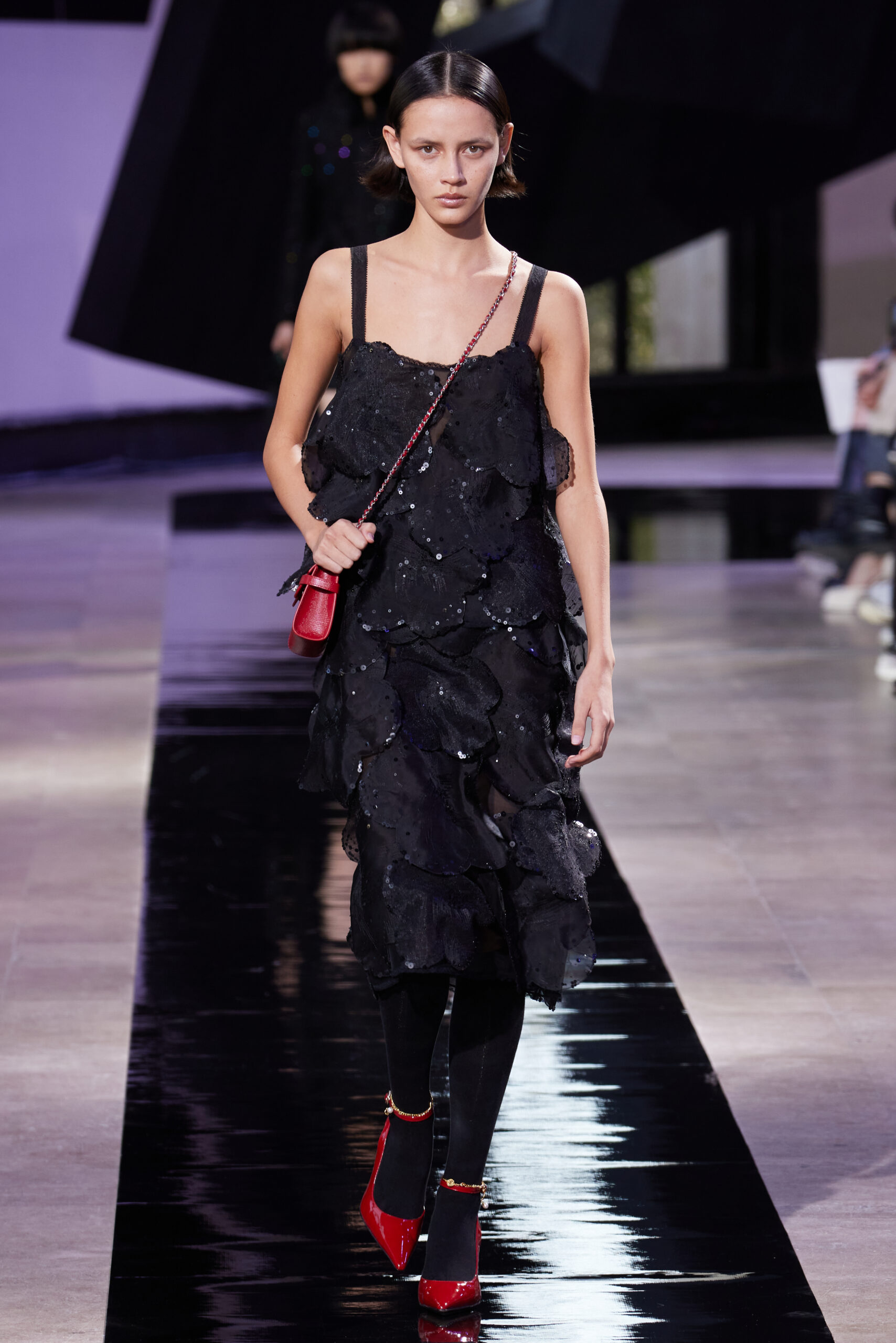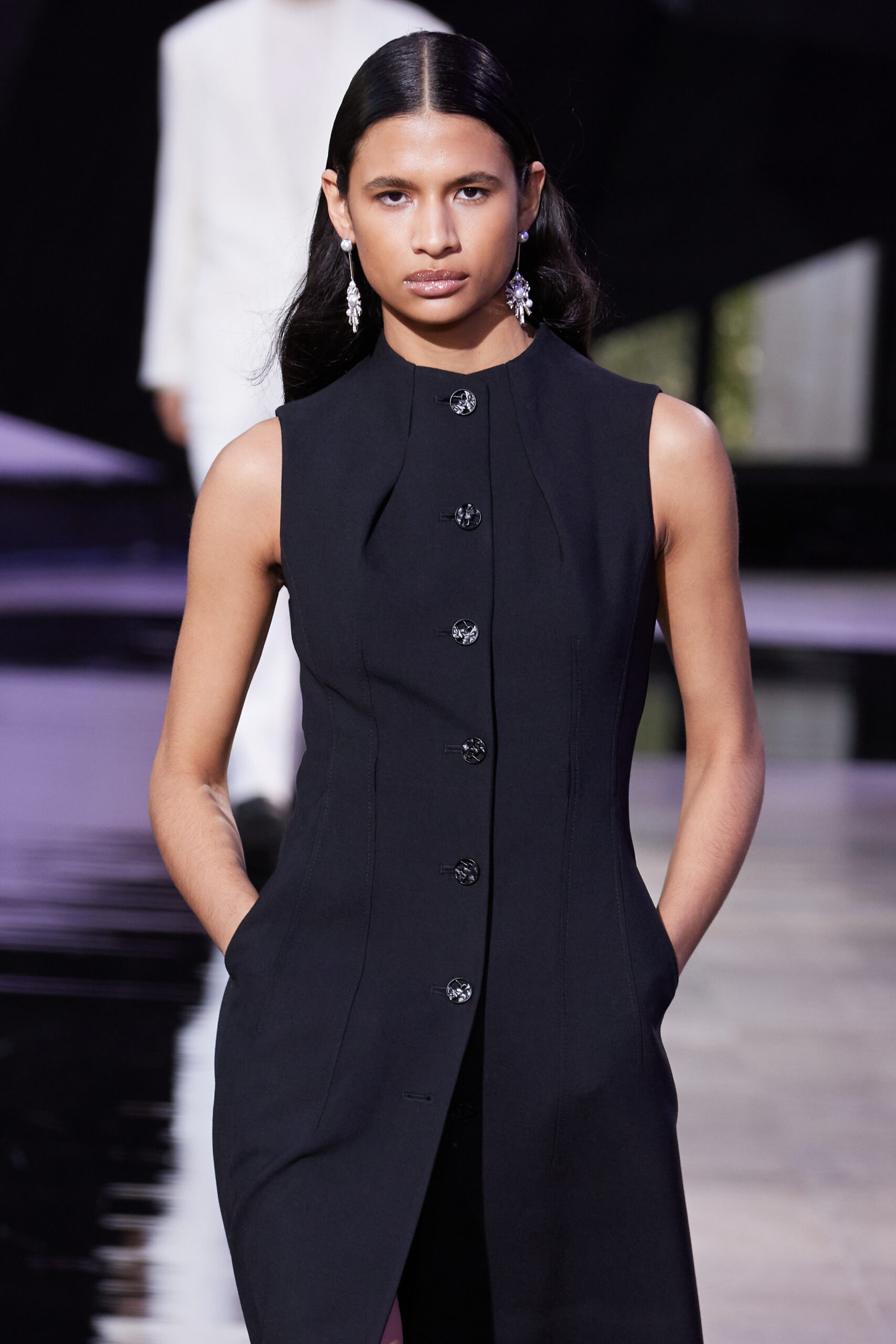 Les accessoires, notamment les emblématiques « talons virgules » de SHIATZY CHEN, font leur grand retour, agrémentés cette saison d’ornements floraux et assortis de sacs dotés de poignées en jade, ornées d’orchidées d’encre, créant une harmonie de nuances et de textures.